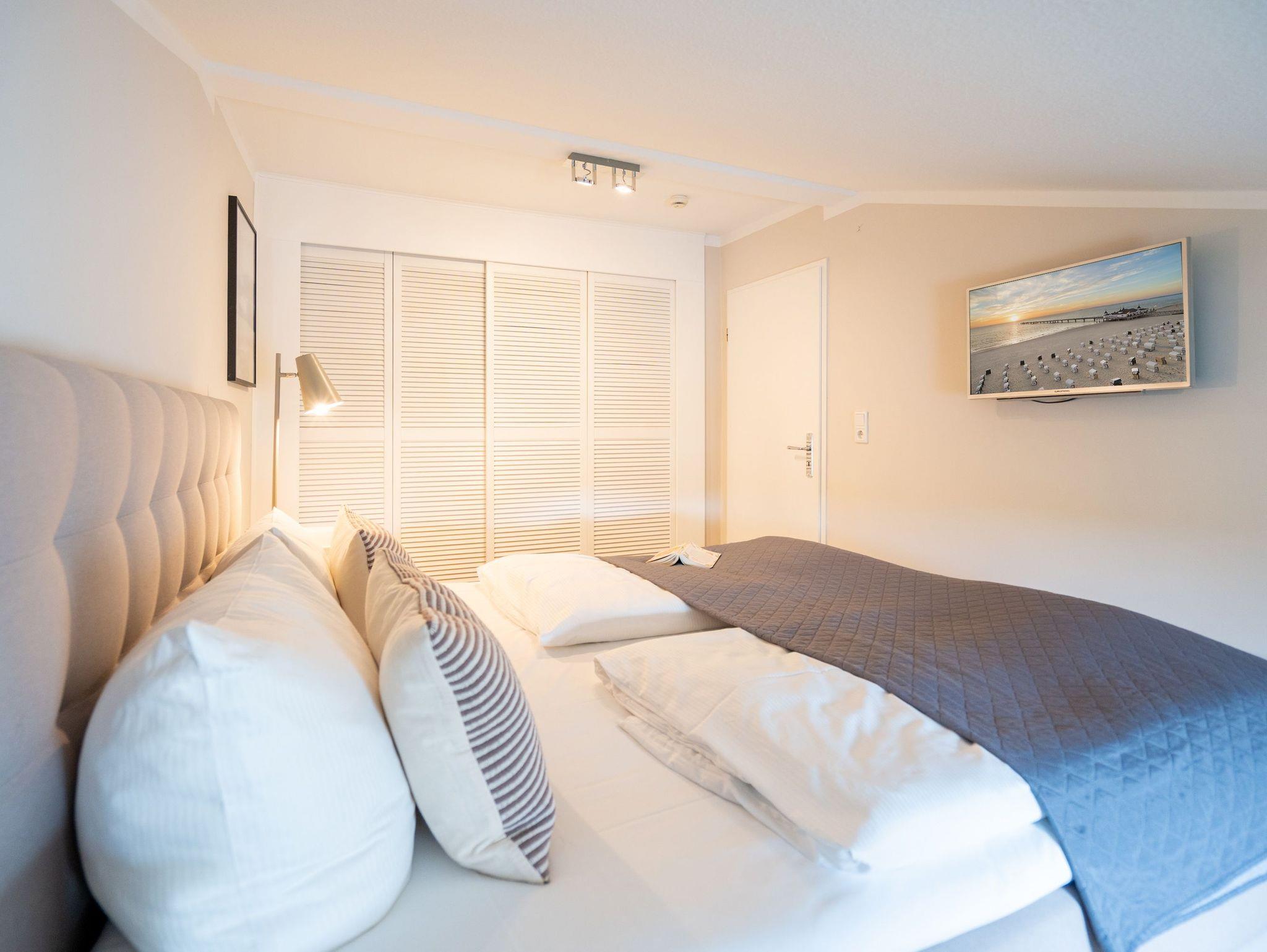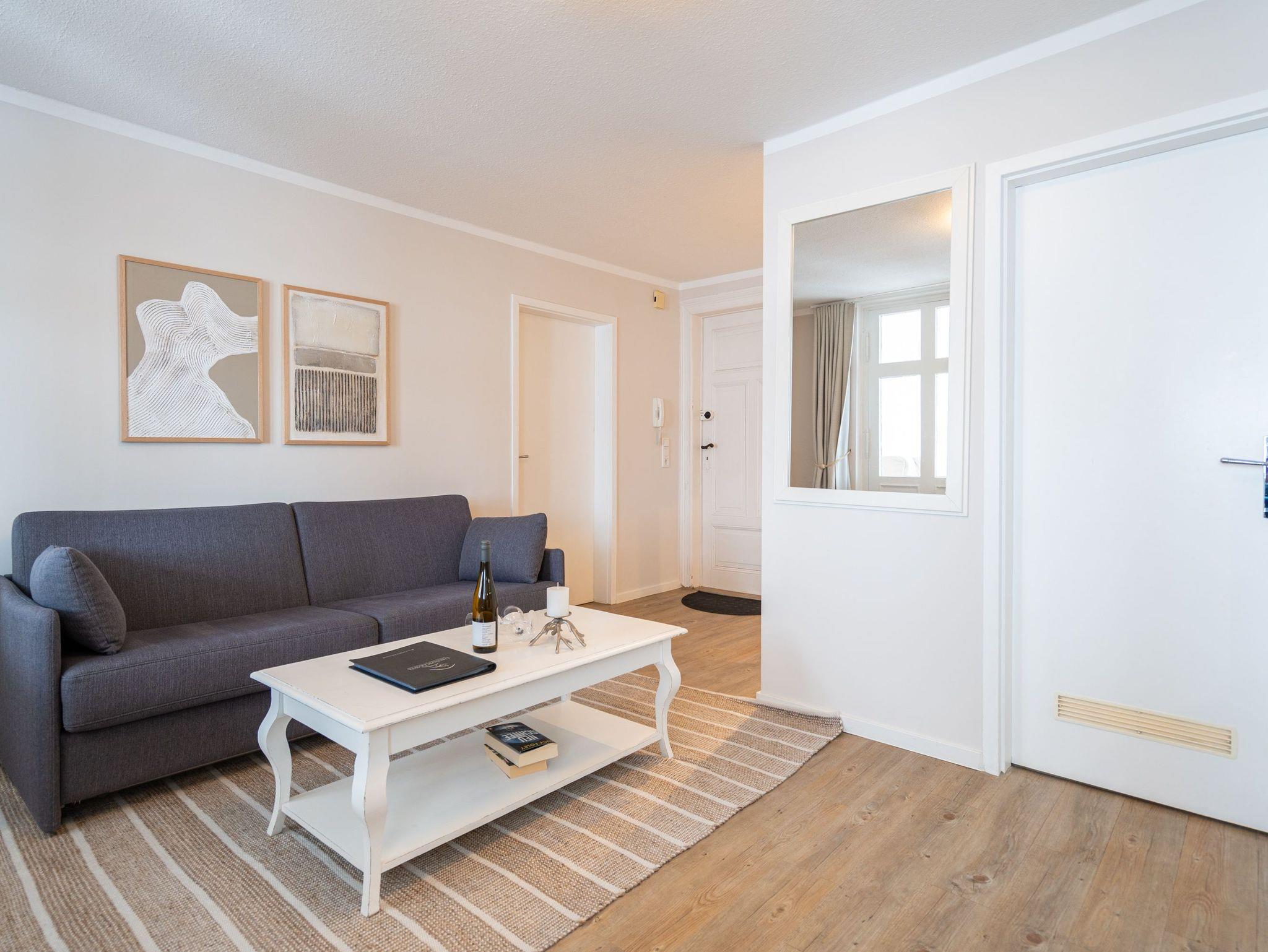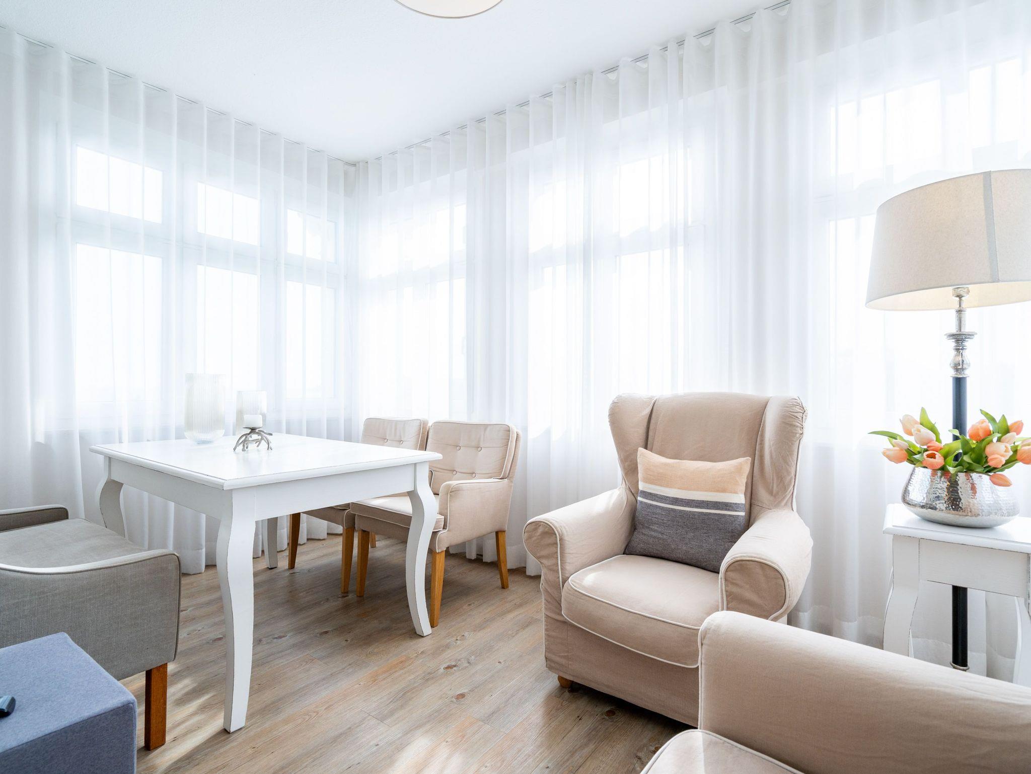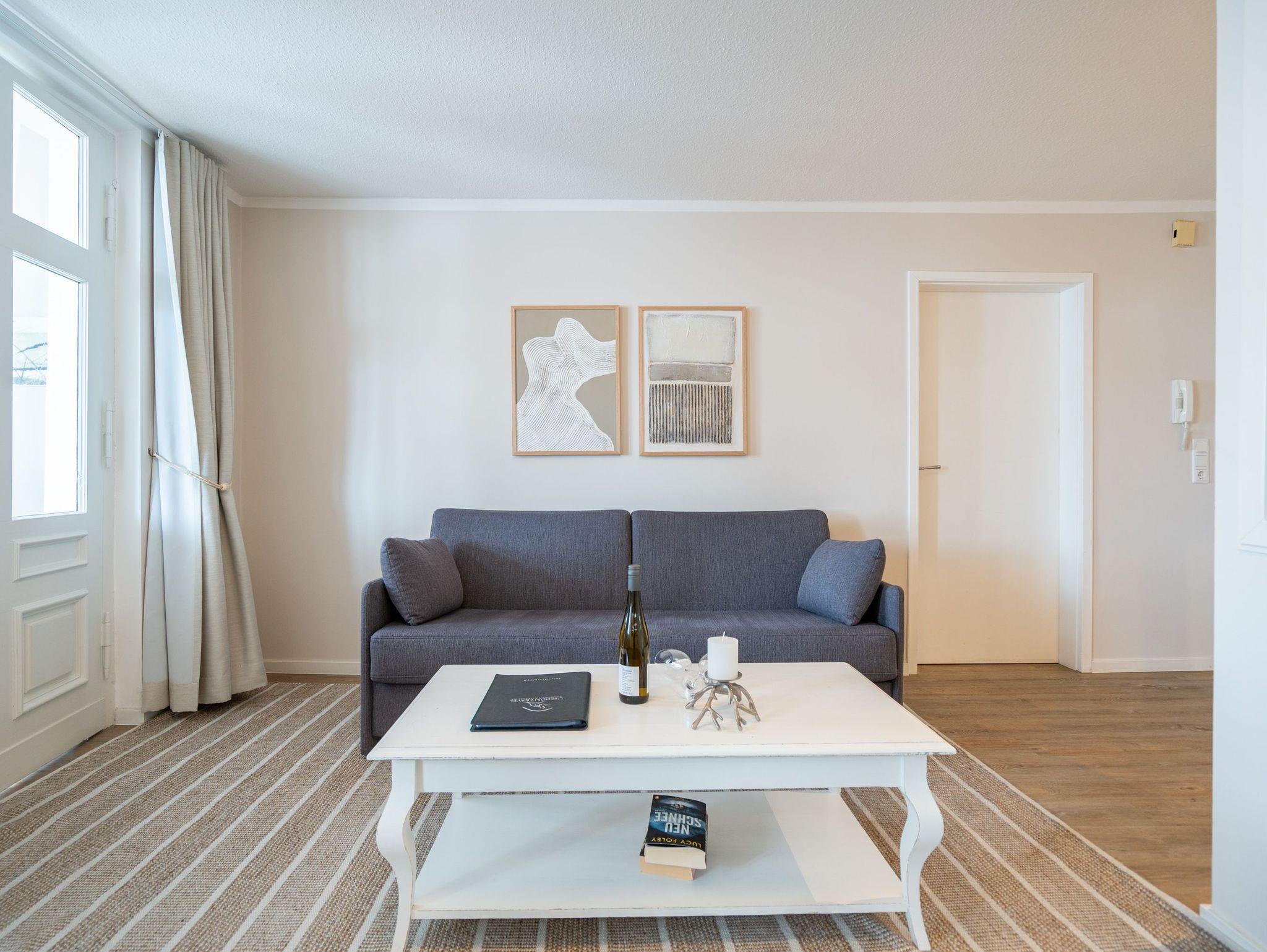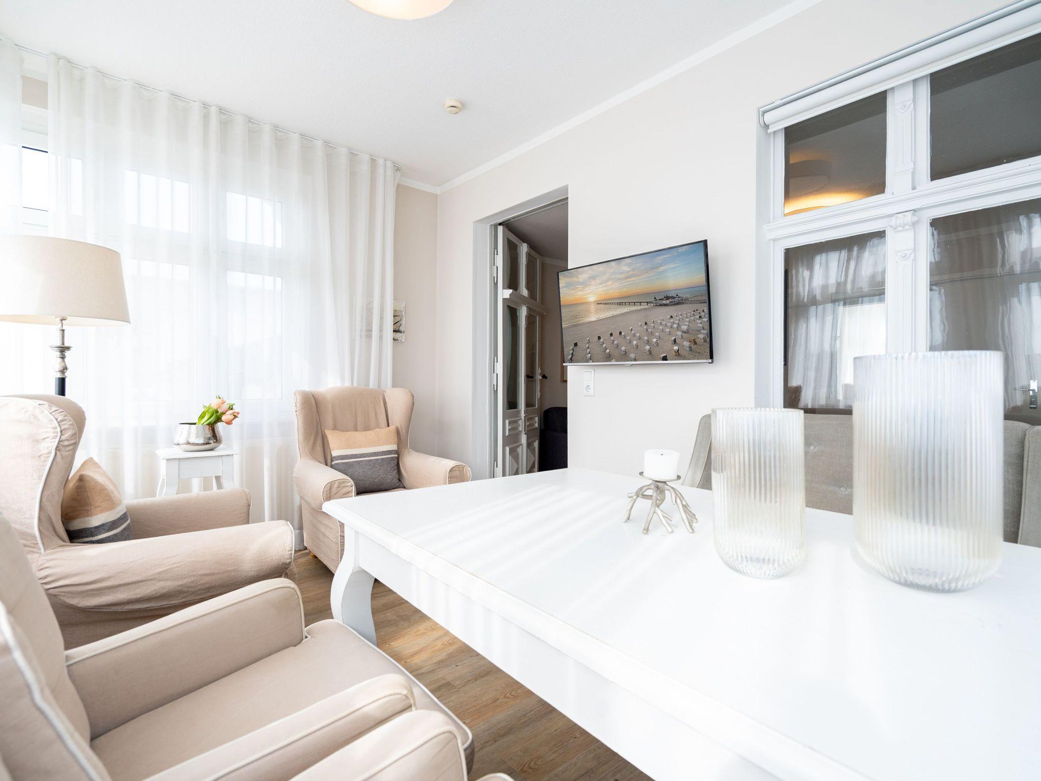 Ein toller Meerblick und eine wunderschön gestaltete 2-Raum-Ferienwohnung (44 qm) versprechen Urlaubsfreude in der Villa Albertine für 2-4 Personen inkl. 1 Kleinkind (bis 3 Jahre im Kinderreisebett). Nach dem Eingangsbereich empfängt Sie ein gemütlicher Wohnbereich mit Schlafsofa (als Aufbettungsmöglichkeit für die 3. Person), Flat-TV und komplett ausgestatteter Küchenzeile. In der verglasten Veranda genießt man den Blick auf die Ostsee, ein schöner Essplatz und zwei gemütliche Ohrensessel laden zum Lesen, TV schauen oder Entspannen ein. Im Schlafzimmer sorgt ein bequemes Doppelboxspringbett (1,80m x 2,00m ) für Schlafkomfort, auch ein Kinderreisebett findet hier Platz. Ergänzt wird das Appartement durch ein Badezimmer mit Dusche und WC. Ein Pkw-Stellplatz Nr. 13 befindet sich in der Tiefgarage direkt auf dem Grundstück.