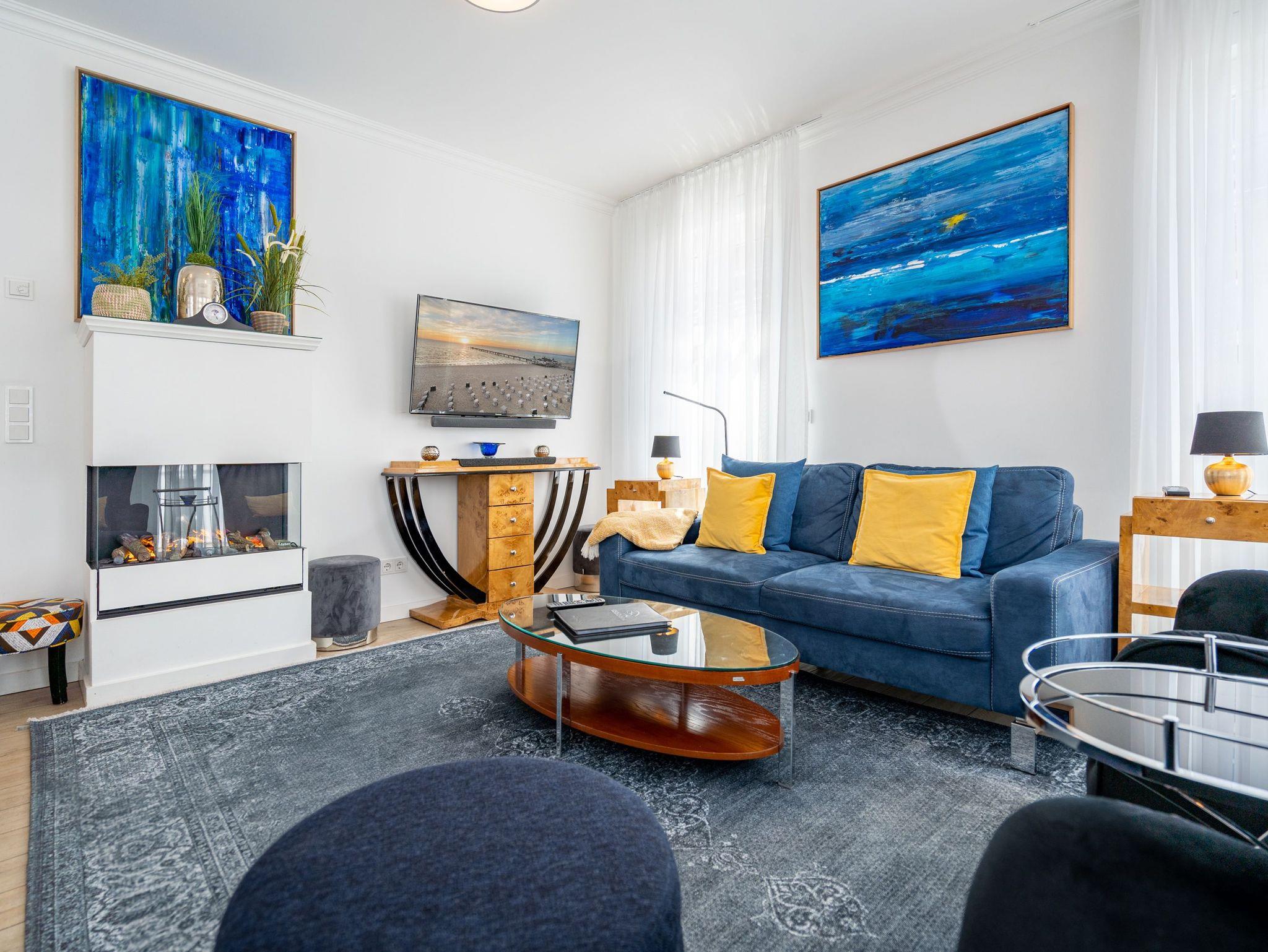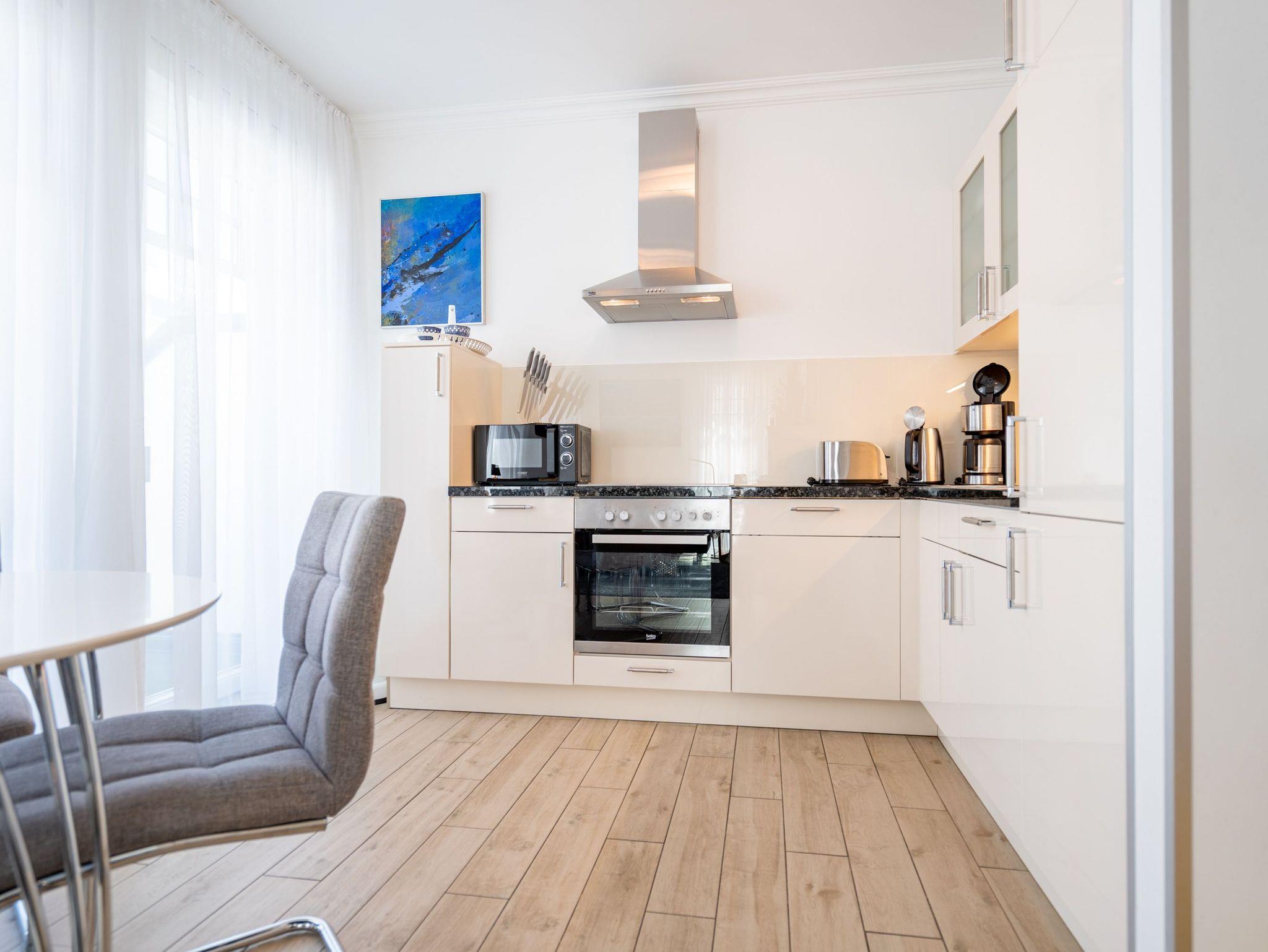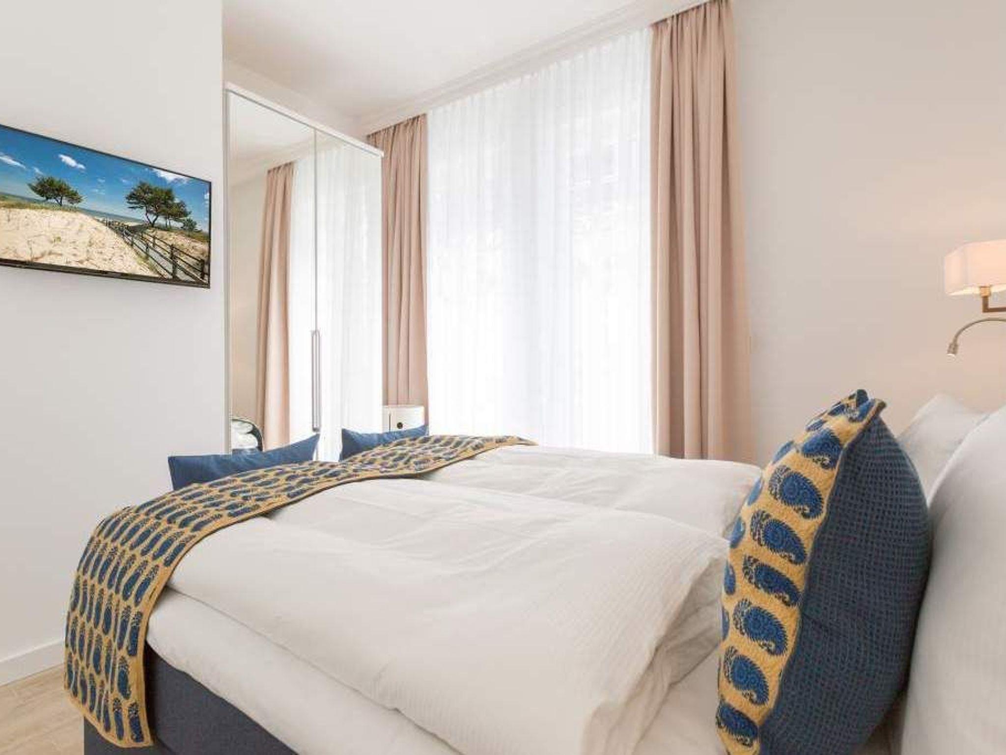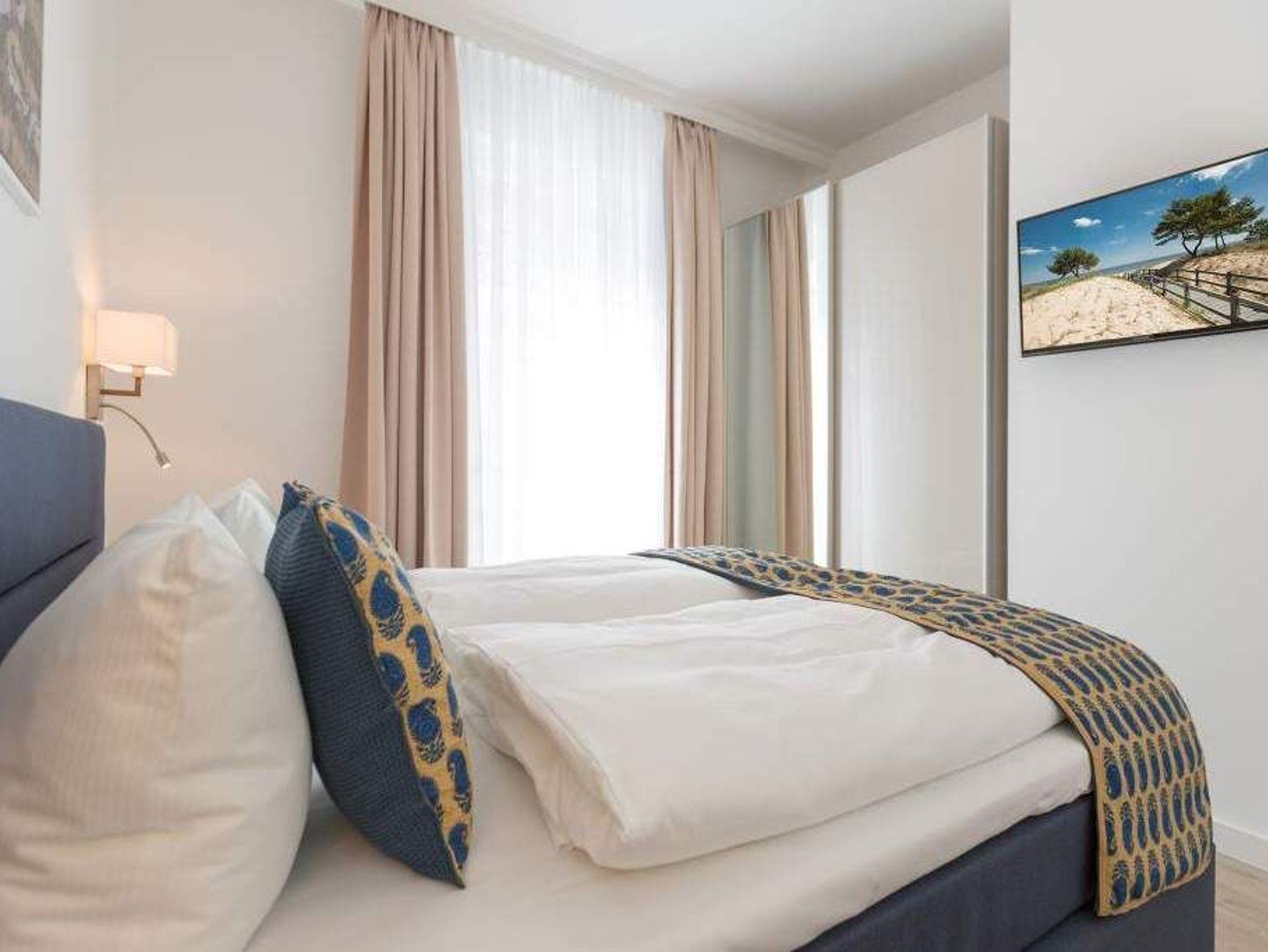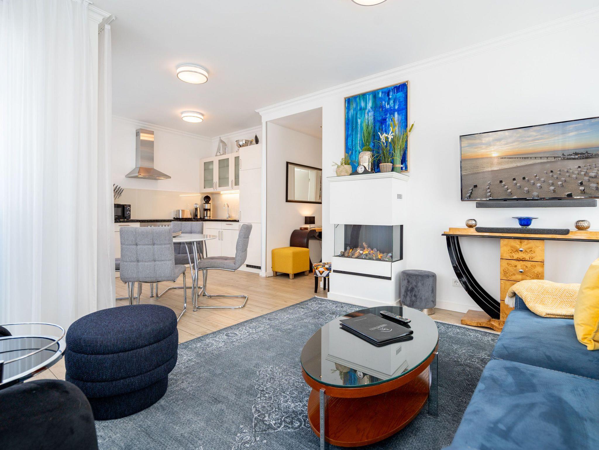 Auf 67 Quadratmetern erwartet Sie in diesem lichten und wunderschön eingerichteten Appartement ein exklusives Urlaubsdomizil. Drei Zimmer in modernem Design ? hier können Sie mit bis zu vier Personen eine unvergesslich schöne Usedom-Auszeit erleben. In den zweiten Stock gelangen Sie über den Fahrstuhl. Treten Sie ein, in ein offenes und großzügiges Wohn-Esszimmer, das viel Platz zum Durchatmen und Energietanken bietet. Machen Sie es sich auf dem Wildledersofa oder in einem der stylischen Sessel bequem. Ein Smart-TV wird zum wahren Home-Kino. An ungemütlichen Tagen oder kühlen Abenden sorgt der Elektro-Kamin für wohlige Wärme. Per Knopfdruck können Sie diesen im Sommer auch ohne Wärme zum Flackern bringen. Ein echter Hingucker ist der wunderschöne Art Deco Konsolentisch. Der großer Essplatz lädt zum gemeinsamen Genuss ein. Ihre Lieblingsgerichte lassen sich in der voll ausgestatteten Küche mühelos zaubern. Bei schönem Wetter bietet sich die offene Loggia zum Essen an. Von hier aus haben Sie sogar einen seitlichen Blick auf die Ostsee. In den beiden Boxspringdoppelbetten (jeweils 1,60 m x 2,00 m) in den Schlafzimmern macht übrigens nicht nur das Schlafen Spaß. Auch das Fernsehgucken. Denn beide Schlafzimmer sind ebenfalls mit einem Flat-TV ausgestattet. Das Badezimmer ist wunderbar geräumig mit einer Regendusche, einem Waschtisch und WC ausgestattet. Absolutes Highlight im Winter ? für denjenigen, der es mag natürlich auch im Sommer ? ist ein Aufguss in der wohnungseigenen Finnischen Sauna. Es gibt ein separates Gäste-WC. Bei Anreise sind die Betten bezogen und Handtücher liegen bereit, so dass die Entspannung schon von der ersten Minute an einsetzen kann. Ihr Auto können Sie in der Tiefgarage abstellen. Dort gibt es auch einen Fahrradabstellraum und einen Hauswirtschaftsraum mit einem Waschtrockner. Für den Tag am Meer steht Ihnen als besonderes Bonbon von Mitte Mai bis September (je nach Witterung) ein Strandkorb am Strand kostenlos zur Verfügung.