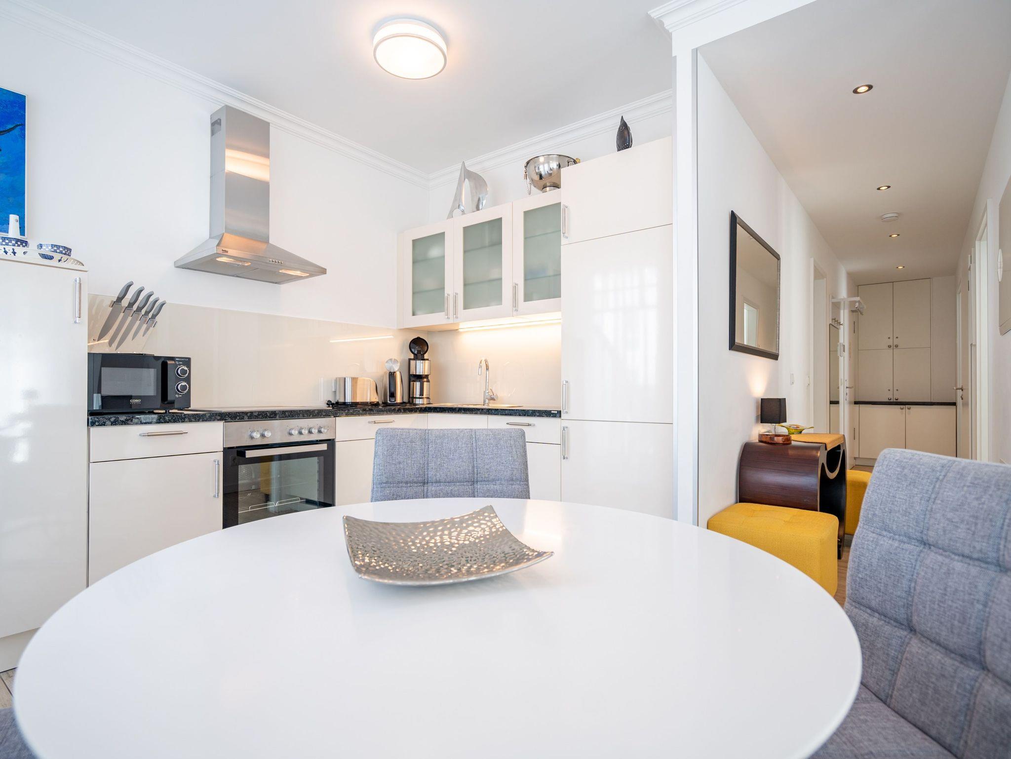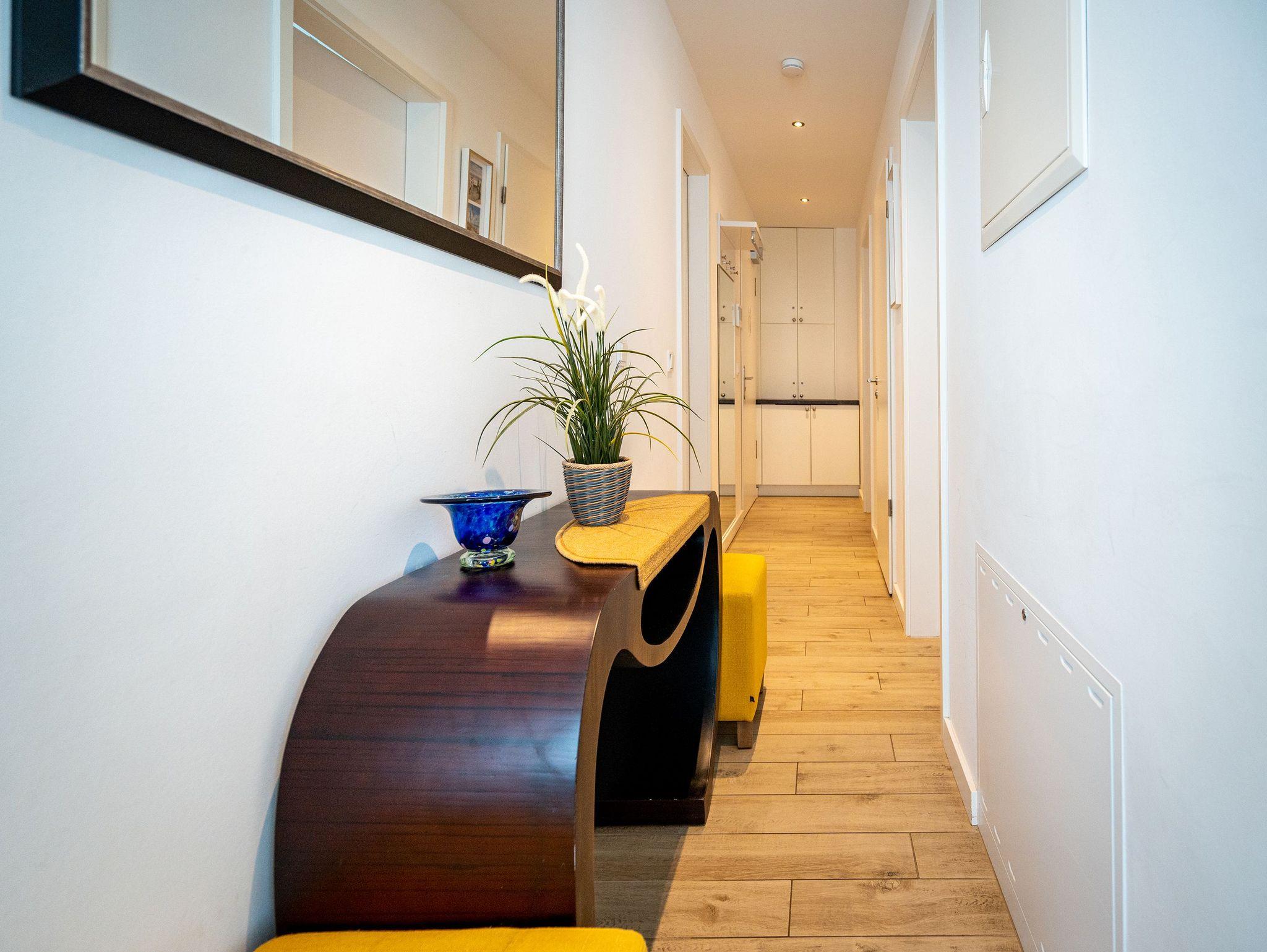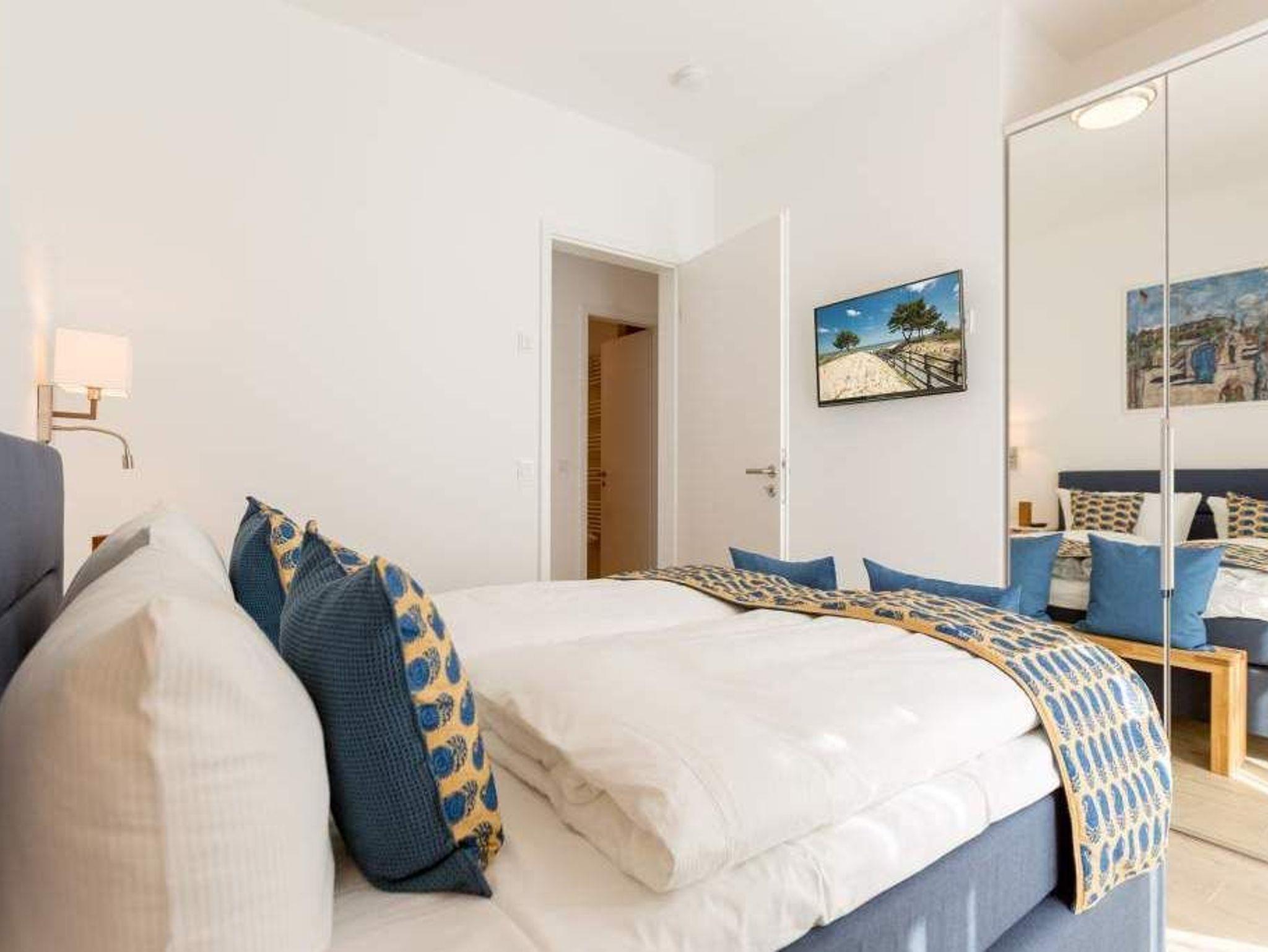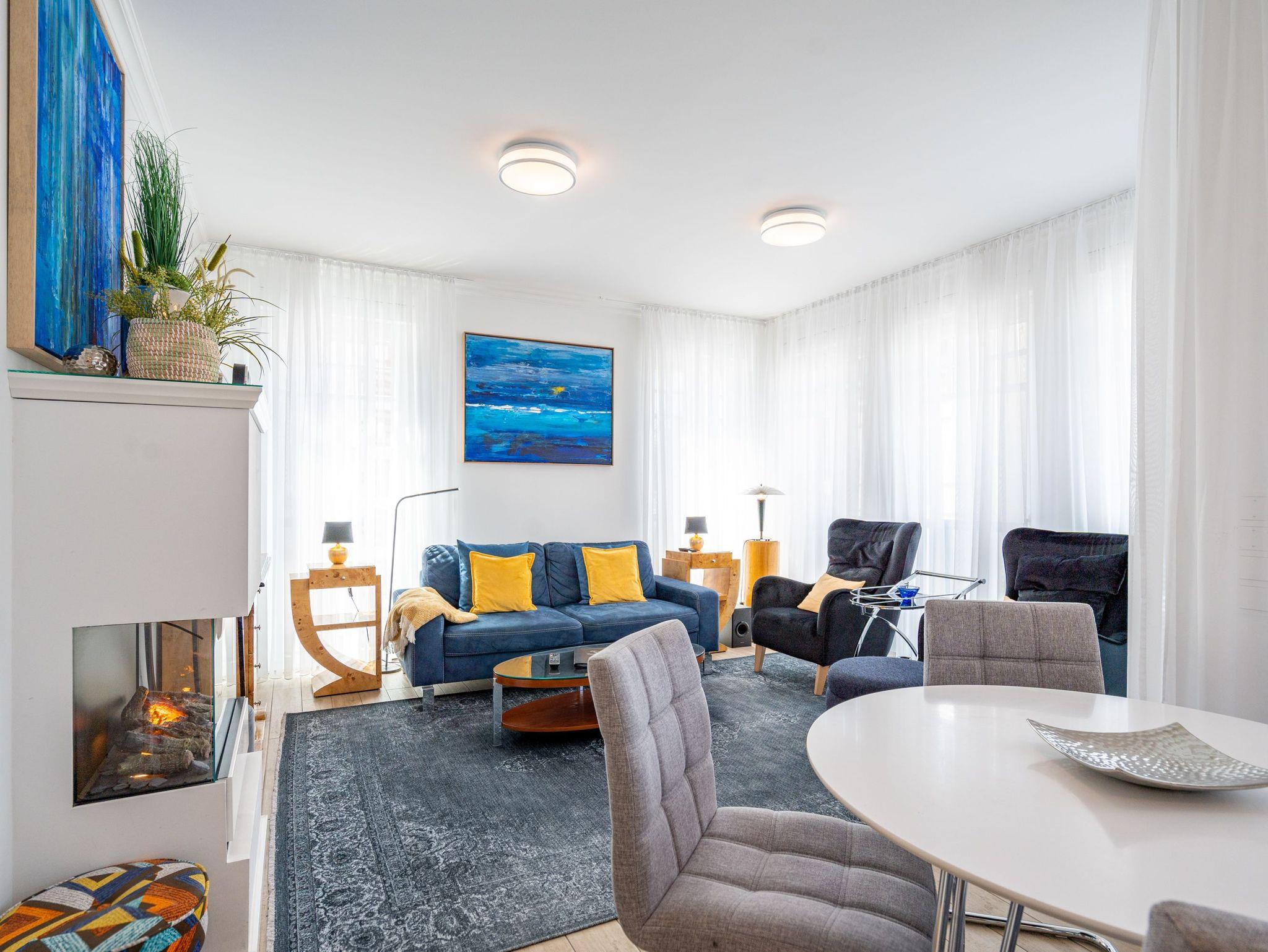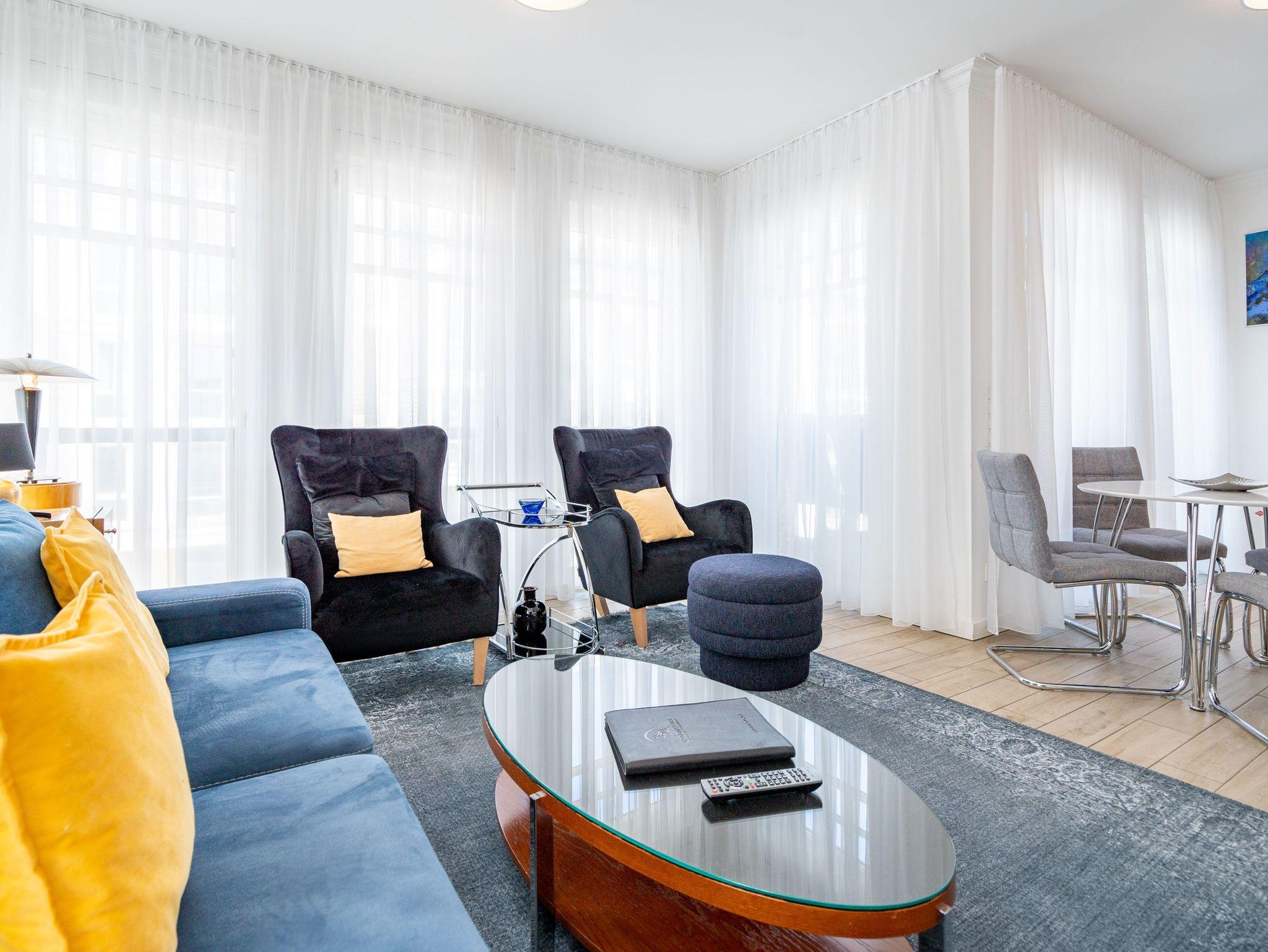Auf 67 Quadratmetern erwartet Sie in diesem lichten und wunderschön eingerichteten Appartement ein exklusives Urlaubsdomizil. Drei Zimmer in modernem Design ? hier können Sie mit bis zu vier Personen eine unvergesslich schöne Usedom-Auszeit erleben. In den zweiten Stock gelangen Sie über den Fahrstuhl. Treten Sie ein, in ein offenes und großzügiges Wohn-Esszimmer, das viel Platz zum Durchatmen und Energietanken bietet. Machen Sie es sich auf dem Wildledersofa oder in einem der stylischen Sessel bequem. Ein Smart-TV wird zum wahren Home-Kino. An ungemütlichen Tagen oder kühlen Abenden sorgt der Elektro-Kamin für wohlige Wärme. Per Knopfdruck können Sie diesen im Sommer auch ohne Wärme zum Flackern bringen. Ein echter Hingucker ist der wunderschöne Art Deco Konsolentisch. Der großer Essplatz lädt zum gemeinsamen Genuss ein. Ihre Lieblingsgerichte lassen sich in der voll ausgestatteten Küche mühelos zaubern. Bei schönem Wetter bietet sich die offene Loggia zum Essen an. Von hier aus haben Sie sogar einen seitlichen Blick auf die Ostsee. In den beiden Boxspringdoppelbetten (jeweils 1,60 m x 2,00 m) in den Schlafzimmern macht übrigens nicht nur das Schlafen Spaß. Auch das Fernsehgucken. Denn beide Schlafzimmer sind ebenfalls mit einem Flat-TV ausgestattet. Das Badezimmer ist wunderbar geräumig mit einer Regendusche, einem Waschtisch und WC ausgestattet. Absolutes Highlight im Winter ? für denjenigen, der es mag natürlich auch im Sommer ? ist ein Aufguss in der wohnungseigenen Finnischen Sauna. Es gibt ein separates Gäste-WC. Bei Anreise sind die Betten bezogen und Handtücher liegen bereit, so dass die Entspannung schon von der ersten Minute an einsetzen kann. Ihr Auto können Sie in der Tiefgarage abstellen. Dort gibt es auch einen Fahrradabstellraum und einen Hauswirtschaftsraum mit einem Waschtrockner. Für den Tag am Meer steht Ihnen als besonderes Bonbon von Mitte Mai bis September (je nach Witterung) ein Strandkorb am Strand kostenlos zur Verfügung.