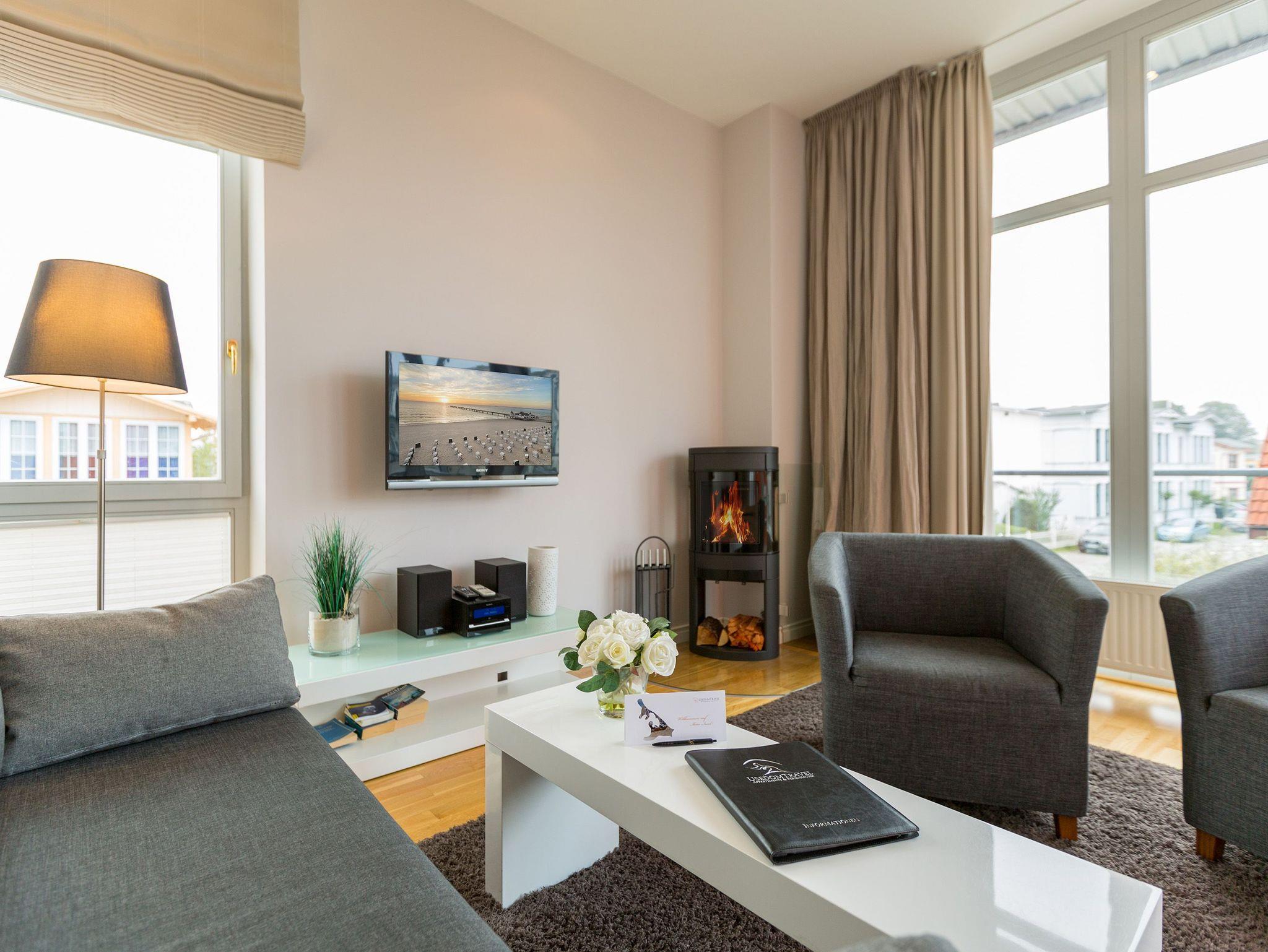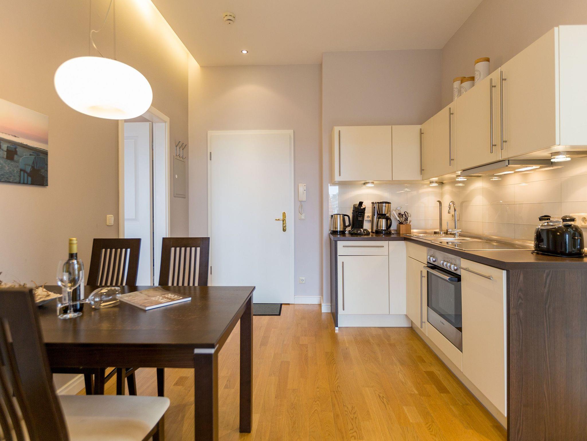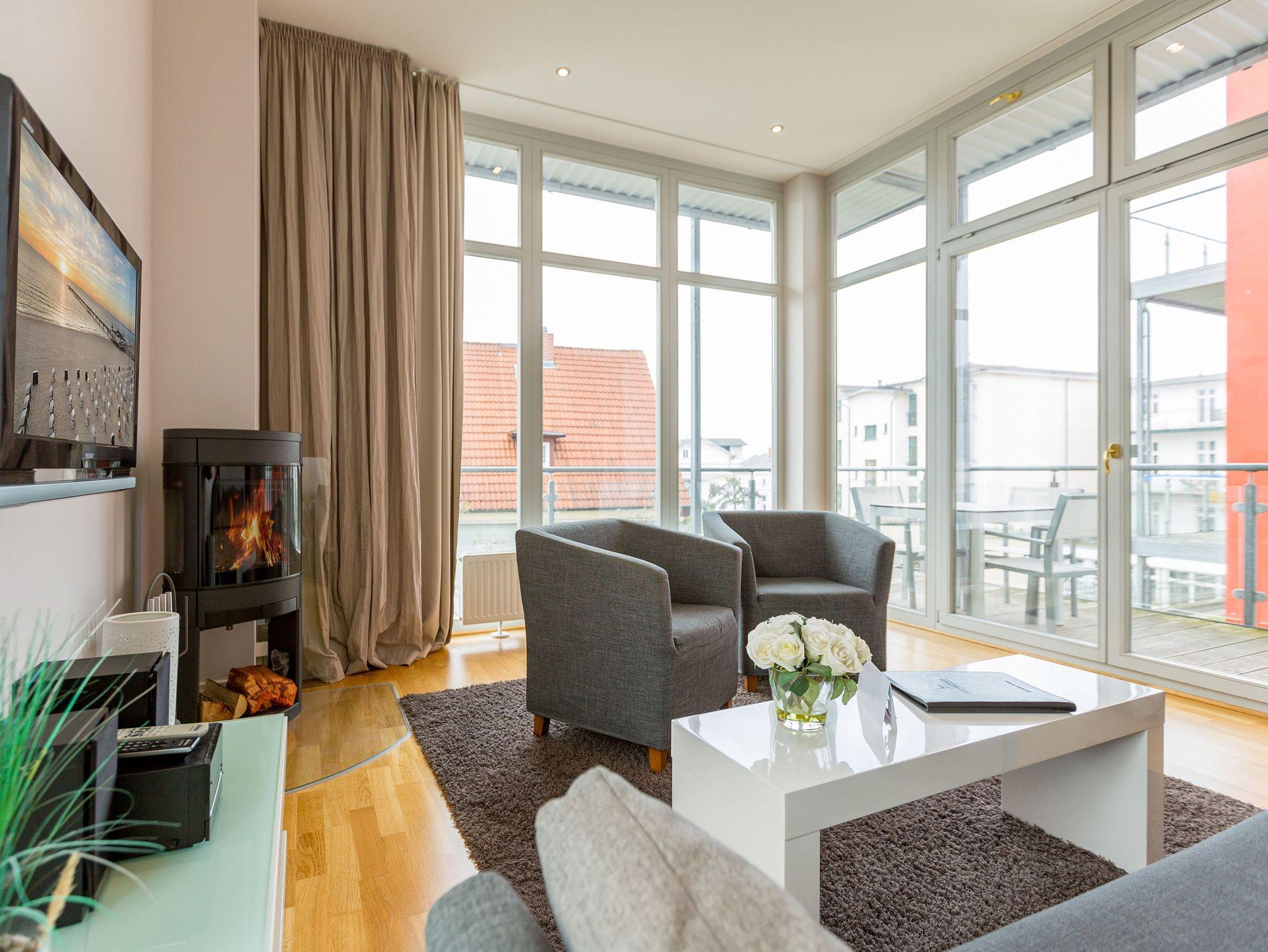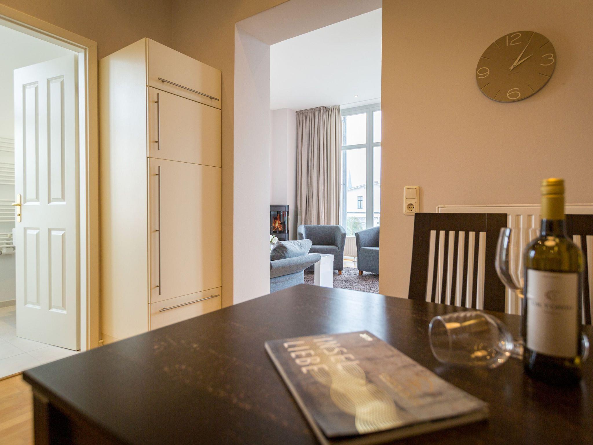 In der 1. Etage des Autorenhauses empfängt Sie die moderne 2-Raum-Ferienwohnung Heinrich Böll, das von einer Innenarchitektin gestaltet wurde. Gekonnte Möblierung, geschmackvolle Dekorationen und lässige Eleganz. - Treten Sie ein und fühlen Sie sich wohl! Das helle, lichtdurchflutete Wohnzimmer mit Kaminofen hat Zugang zum großzügigen umlaufenden Südbalkon. Hier genießt man bis in die Abendstunden die Usedomer Sonne. Die offene Küche ist natürlich komplett ausgestattet und wird durch den Essplatz vervollständigt. Das gemütliche Schlafzimmer mit Doppelbett ( 1,80m x 2m) bietet Platz für 2 Erwachsene und verfügt auch über einen Flat-TV. Ein Kind (bis 13 Jahre) kann im Wohnbereich die Schlafcouch nutzen. Ergänzt wird die Wohnung durch ein modernes Bad mit Dusche. Auf Wunsch stellen wir für unsere kleinen Gäste ein Kinderreisebett (ohne zusätzliche Matratze [&] Bettzeug) und einen Kinderhochstuhl ( gegen einen Aufpreis) zur Verfügung. Für Ihren Komfort sind die Betten bei der Anreise bezogen und Handtücher liegen bereit. Das WLAN-Netz kann kostenfrei genutzt werden. Im Keller des Hauses stehen eine Waschmaschine und ein Trockner gegen Gebühr zur Verfügung.