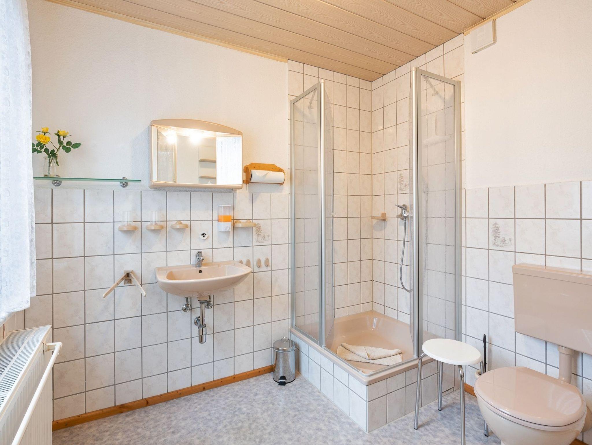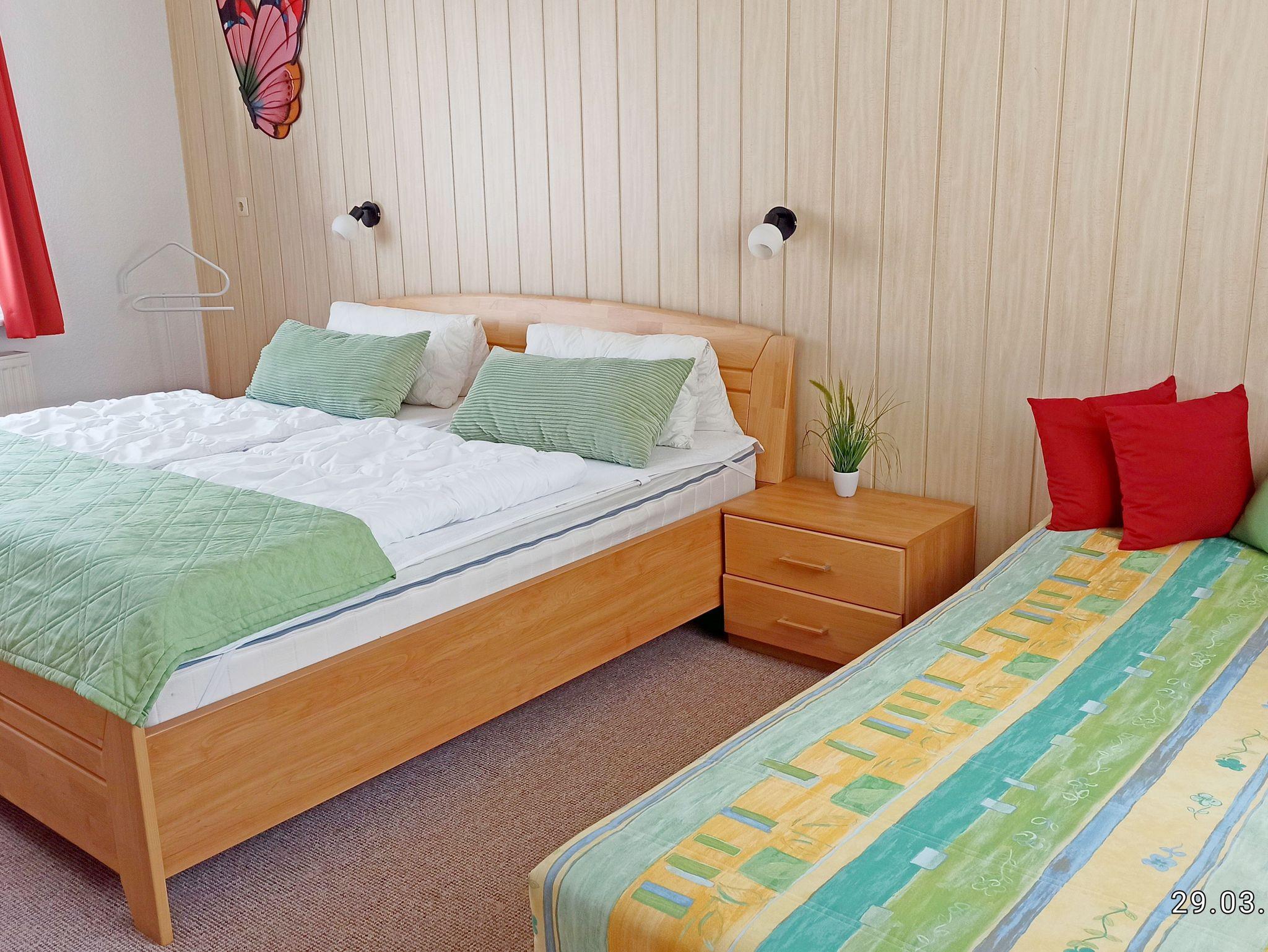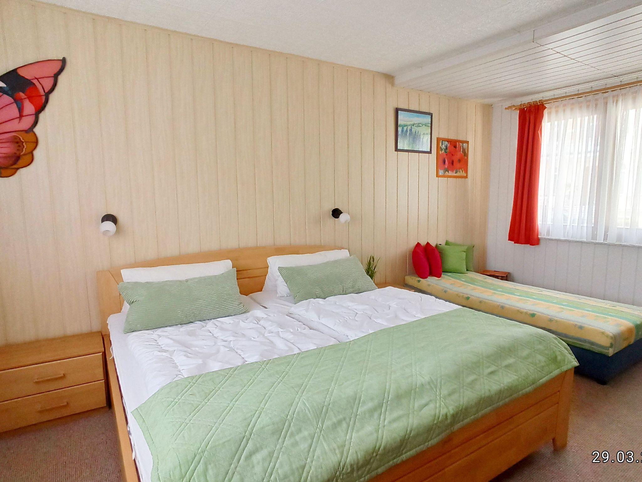 Im Schlafzimmer, welches für maximal 3 Personen ausgelegt ist, haben Sie ein Doppelbett ( 200x200 ) und eine Schlafcouch, einen großen Kleiderschrank, Leselampen über den Betten. Eine Dusche mit Absatz & WC verfügt über Tageslicht und auch ein Föhn ist vorhanden.