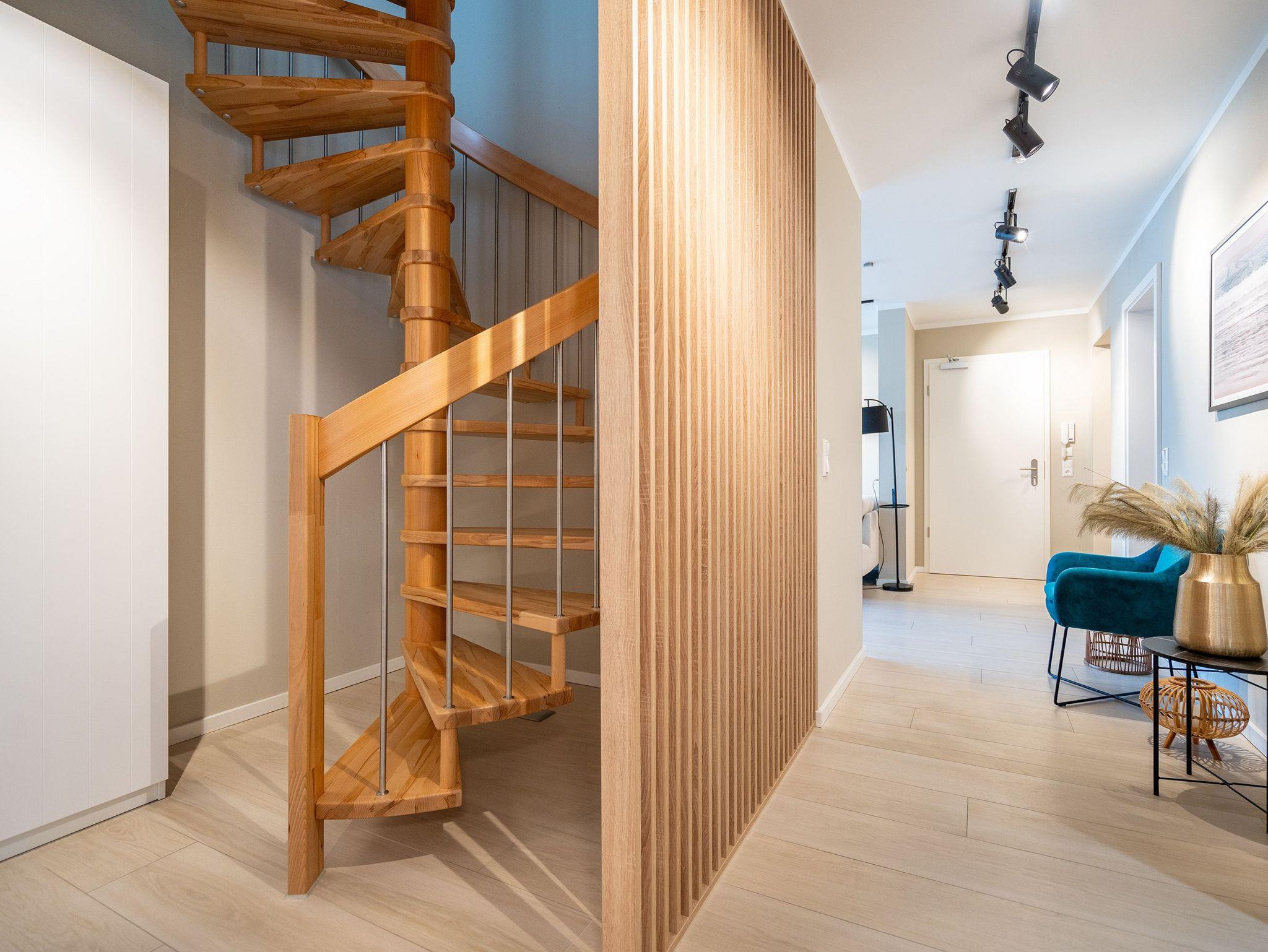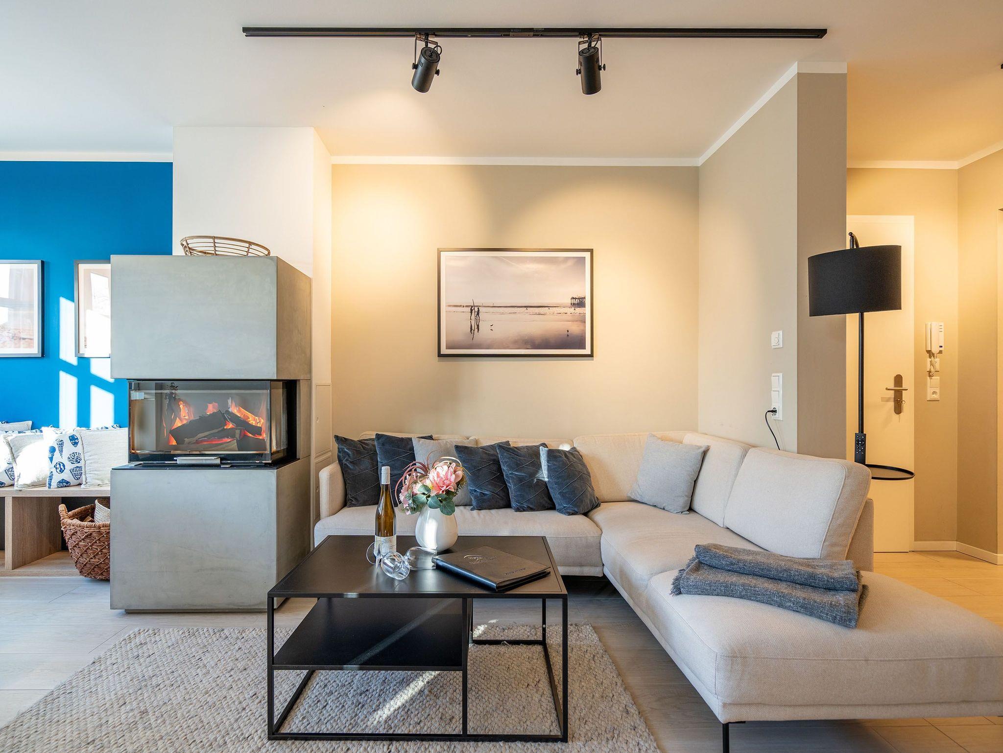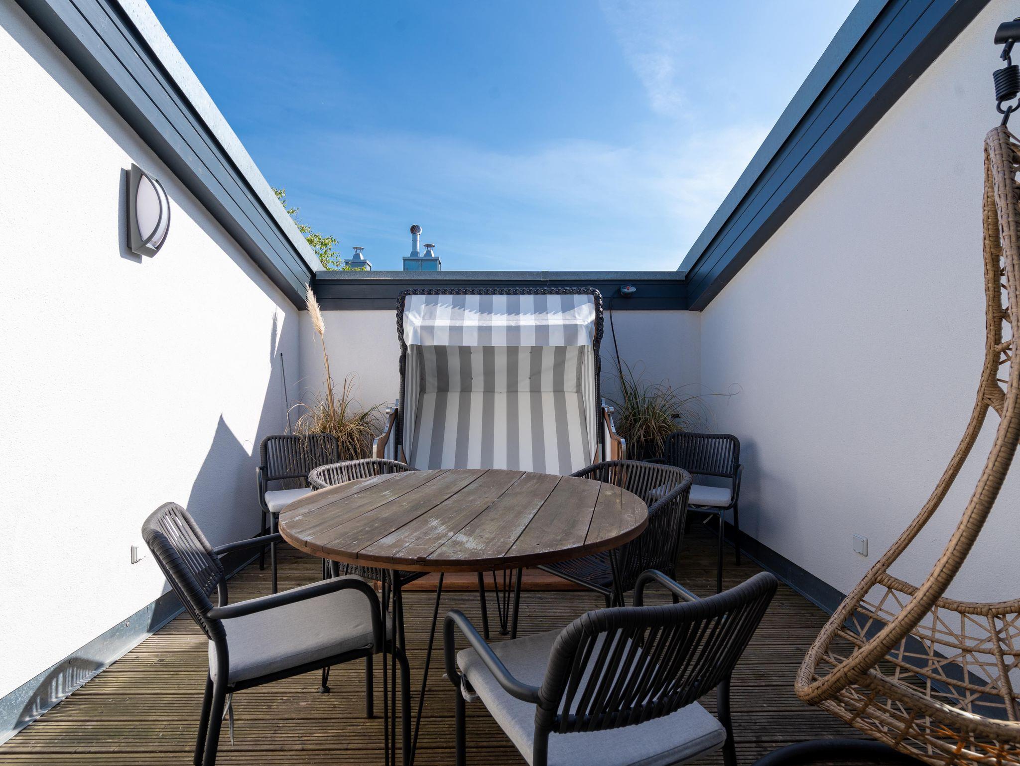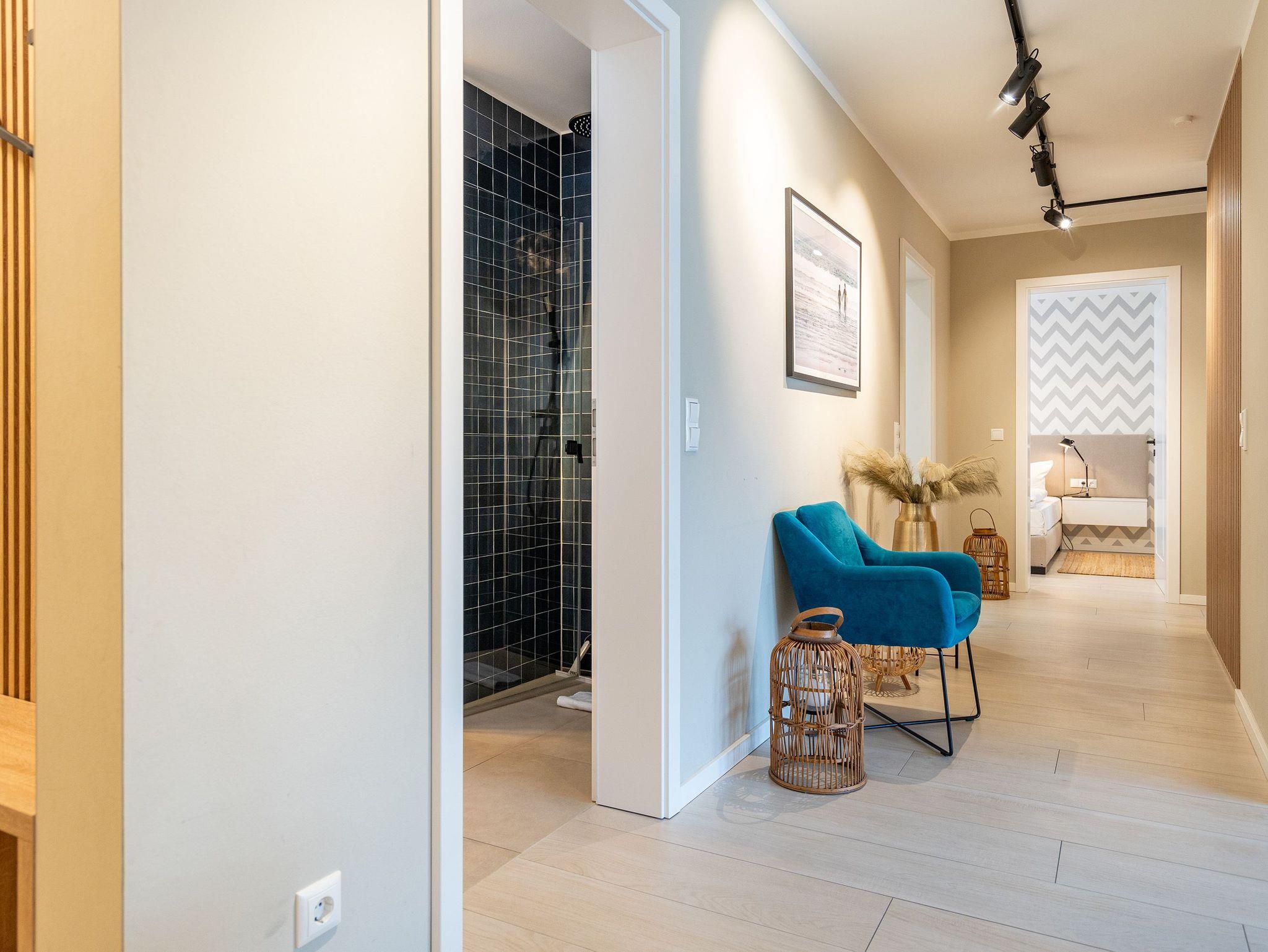Maritimes Flair und eleganter Wohnkomfort ? das Appartement Nummer 10 im ersten Obergeschoss ist ein echter Urlaubstraum. 100 Quadratmeter verteilt auf zwei Etagen sorgen für viel Platz. Ein Urlaubsparadies, aus dem man am liebsten nicht wieder ausziehen möchte. Bis zu sechs Personen können hier unterkommen. Die drei Schlafzimmer und das schöne, geräumige Wohn-Esszimmer sind ideal für einen Urlaub mit der ganzen Familie oder den Freunden. Das Wohnzimmer verfügt über eine gemütliche Sofalandschaft, einen Kamin und einen großen Flat-TV. Ein schöner Esstisch aus Holz und samtig bequeme Stühle laden zum Genießen und Verweilen ein. Jedes Accessoires, jedes Foto an der Wand versetzt hier in Ostseeauszeitstimmung. Lassen Sie sich fallen und fühlen Sie sich einfach nur wohl. Die zum Wohnzimmer hin offene Küche ist mit hochwertigen Markengeräten voll ausgestattet. Ob Induktionsherd, Spülmaschine, Mikrowelle, Kaffeemaschine, Toaster oder edles Geschirr ? es ist alles vorhanden. Auf der unteren Ebene befinden sich zudem zwei der drei Schlafzimmer. Das dritte ist eine Etage höher. Alle drei jedoch sind gleich eingerichtet, verfügen über ein komfortables Boxspringdoppelbett (1,80 m x 2,00 m), einen Einbauschrank und einen Flat-TV. Zwei Bäder mit Dusche und WC hat das Appartement. Im Masterbad mit Tageslicht wartet außerdem neben einem Doppelwaschtisch auch noch eine Finnische Sauna darauf, Ihnen nach einem frostigen Sturmspaziergang ordentlich einzuheizen. In der Garderobe befindet sich eine Waschmaschine und ein Trockner. Über eine Wendeltreppe gelangt man in die obere Etage. Hier ist das dritte Schlafzimmer untergebracht, aber auch das absolute Highlight der Wohnung: eine sonnige und abgeschirmte Dachterrasse (12 Quadratmeter groß). Ob Frühstück oder erfrischender Abendcocktail ? hier lässt sich der Sommerurlaub wunderbar entspannt angehen. Das WLAN ist kostenfrei nutzbar. Bei Anreise sind die Betten bezogen und Handtücher liegen bereit. In der Tiefgarage sind für das Appartement zwei hintereinander liegende Stellplätze reserviert. Hier gibt es auch die Möglichkeit, ein E-Auto an der Ladestation kostenpflichtig aufzuladen.