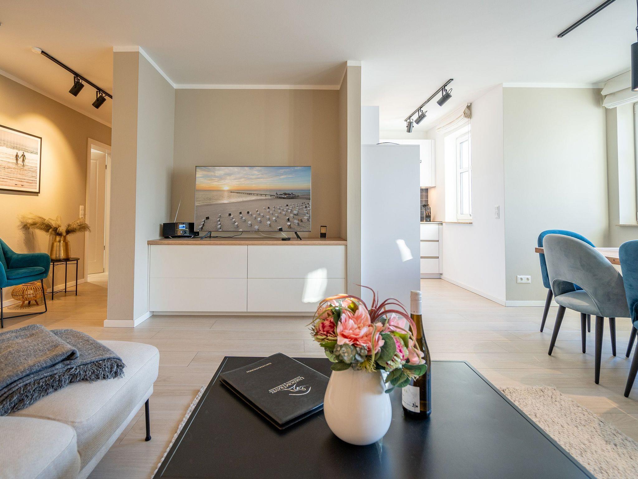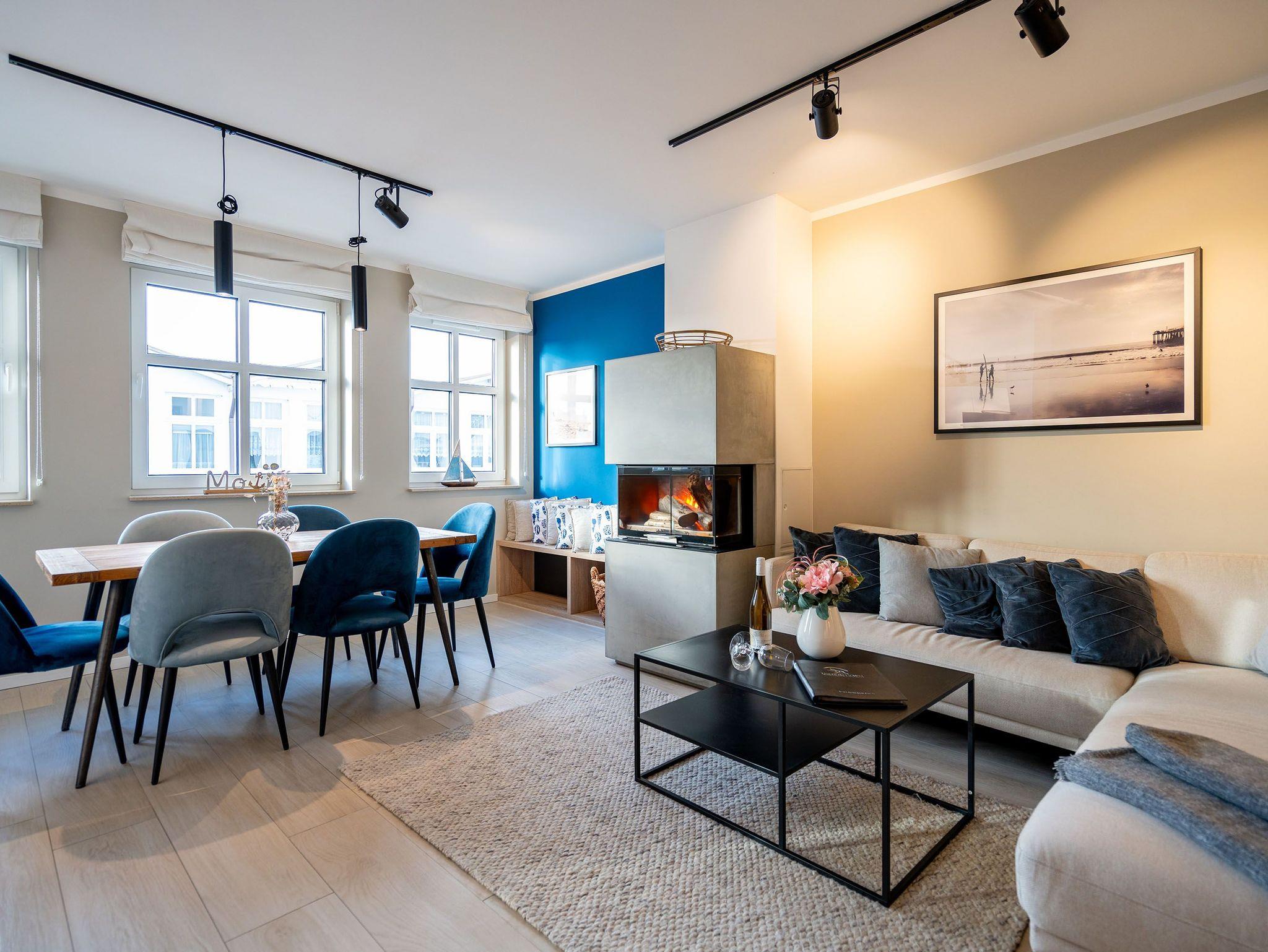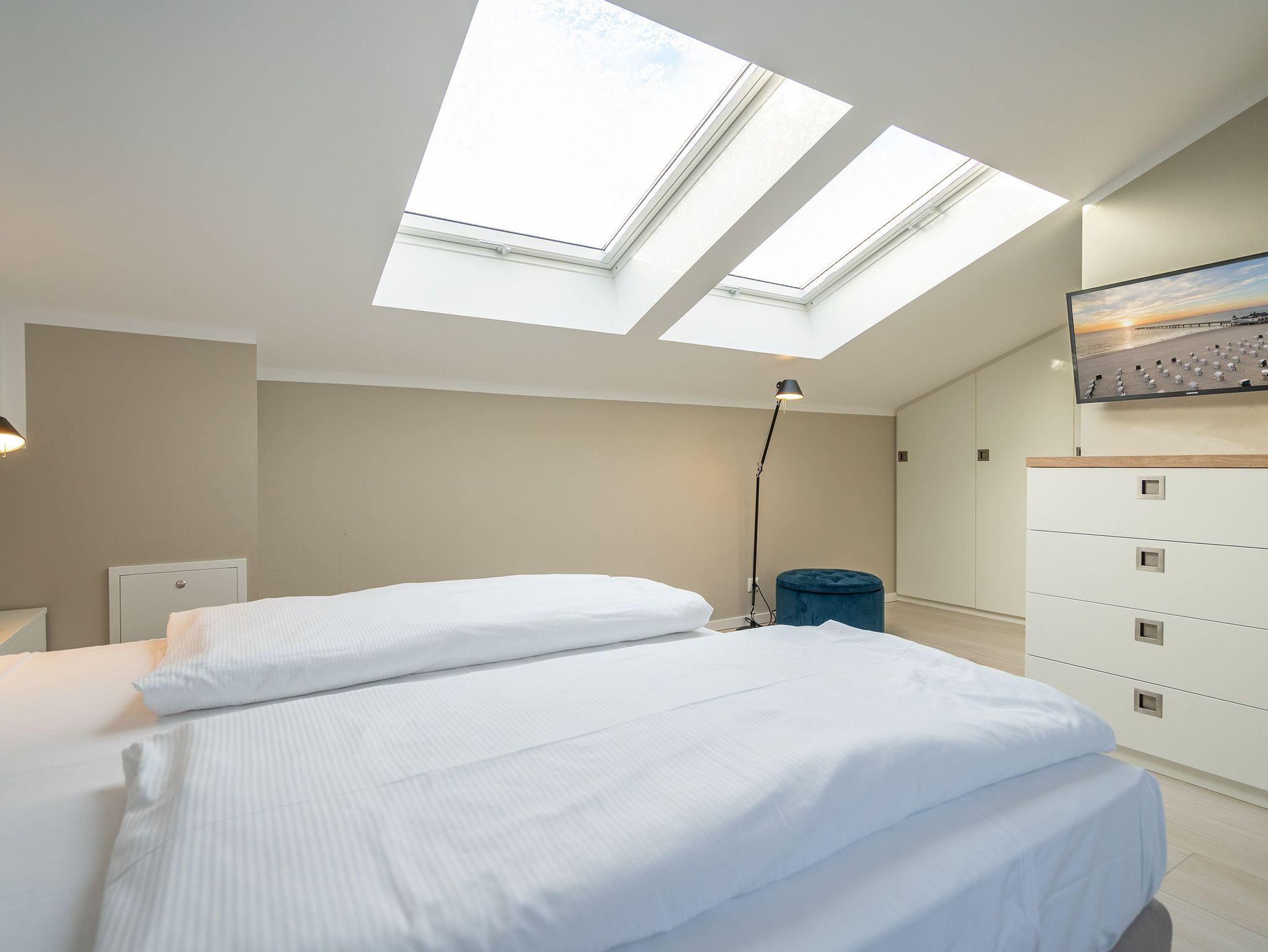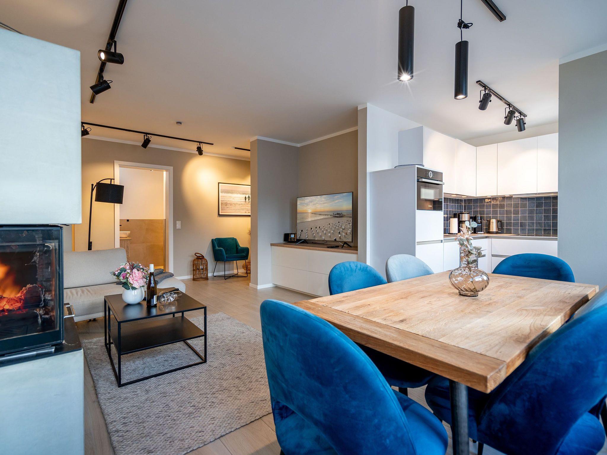 Maritimes Flair und eleganter Wohnkomfort ? das Appartement Nummer 10 im ersten Obergeschoss ist ein echter Urlaubstraum. 100 Quadratmeter verteilt auf zwei Etagen sorgen für viel Platz. Ein Urlaubsparadies, aus dem man am liebsten nicht wieder ausziehen möchte. Bis zu sechs Personen können hier unterkommen. Die drei Schlafzimmer und das schöne, geräumige Wohn-Esszimmer sind ideal für einen Urlaub mit der ganzen Familie oder den Freunden. Das Wohnzimmer verfügt über eine gemütliche Sofalandschaft, einen Kamin und einen großen Flat-TV. Ein schöner Esstisch aus Holz und samtig bequeme Stühle laden zum Genießen und Verweilen ein. Jedes Accessoires, jedes Foto an der Wand versetzt hier in Ostseeauszeitstimmung. Lassen Sie sich fallen und fühlen Sie sich einfach nur wohl. Die zum Wohnzimmer hin offene Küche ist mit hochwertigen Markengeräten voll ausgestattet. Ob Induktionsherd, Spülmaschine, Mikrowelle, Kaffeemaschine, Toaster oder edles Geschirr ? es ist alles vorhanden. Auf der unteren Ebene befinden sich zudem zwei der drei Schlafzimmer. Das dritte ist eine Etage höher. Alle drei jedoch sind gleich eingerichtet, verfügen über ein komfortables Boxspringdoppelbett (1,80 m x 2,00 m), einen Einbauschrank und einen Flat-TV. Zwei Bäder mit Dusche und WC hat das Appartement. Im Masterbad mit Tageslicht wartet außerdem neben einem Doppelwaschtisch auch noch eine Finnische Sauna darauf, Ihnen nach einem frostigen Sturmspaziergang ordentlich einzuheizen. In der Garderobe befindet sich eine Waschmaschine und ein Trockner. Über eine Wendeltreppe gelangt man in die obere Etage. Hier ist das dritte Schlafzimmer untergebracht, aber auch das absolute Highlight der Wohnung: eine sonnige und abgeschirmte Dachterrasse (12 Quadratmeter groß). Ob Frühstück oder erfrischender Abendcocktail ? hier lässt sich der Sommerurlaub wunderbar entspannt angehen. Das WLAN ist kostenfrei nutzbar. Bei Anreise sind die Betten bezogen und Handtücher liegen bereit. In der Tiefgarage sind für das Appartement zwei hintereinander liegende Stellplätze reserviert. Hier gibt es auch die Möglichkeit, ein E-Auto an der Ladestation kostenpflichtig aufzuladen.
