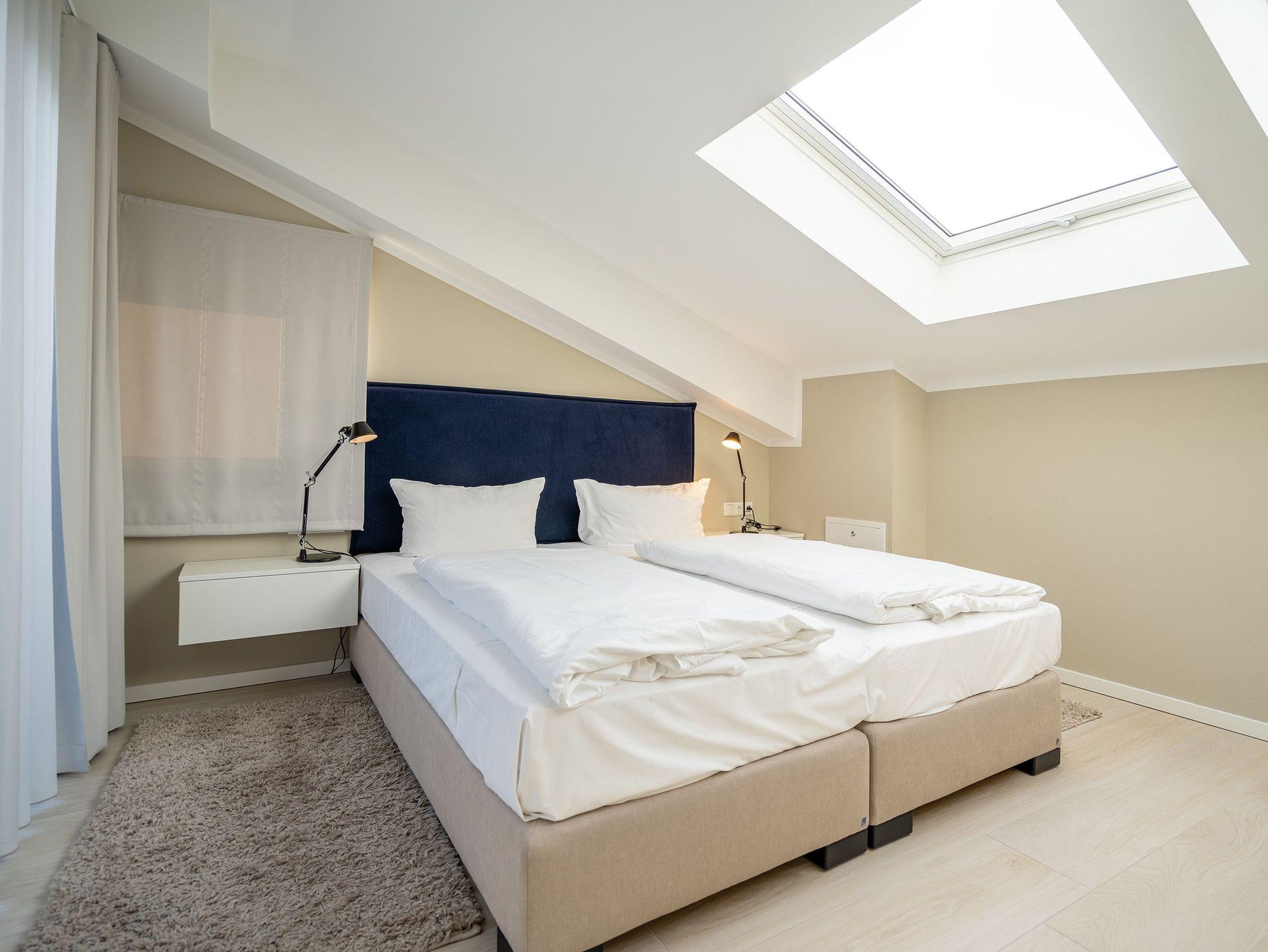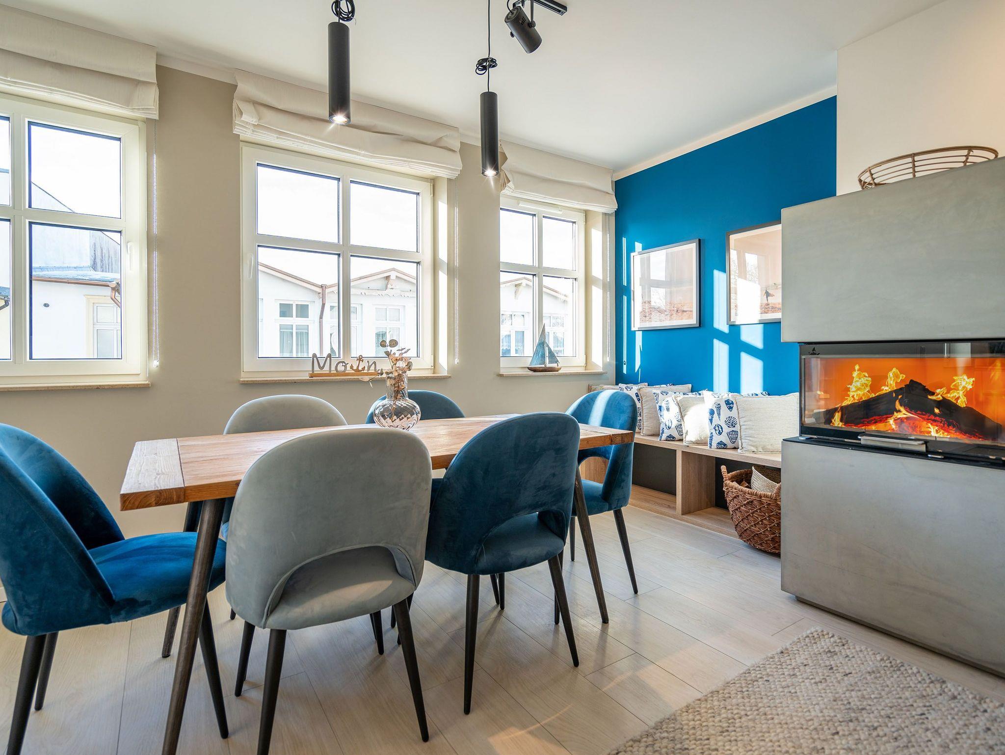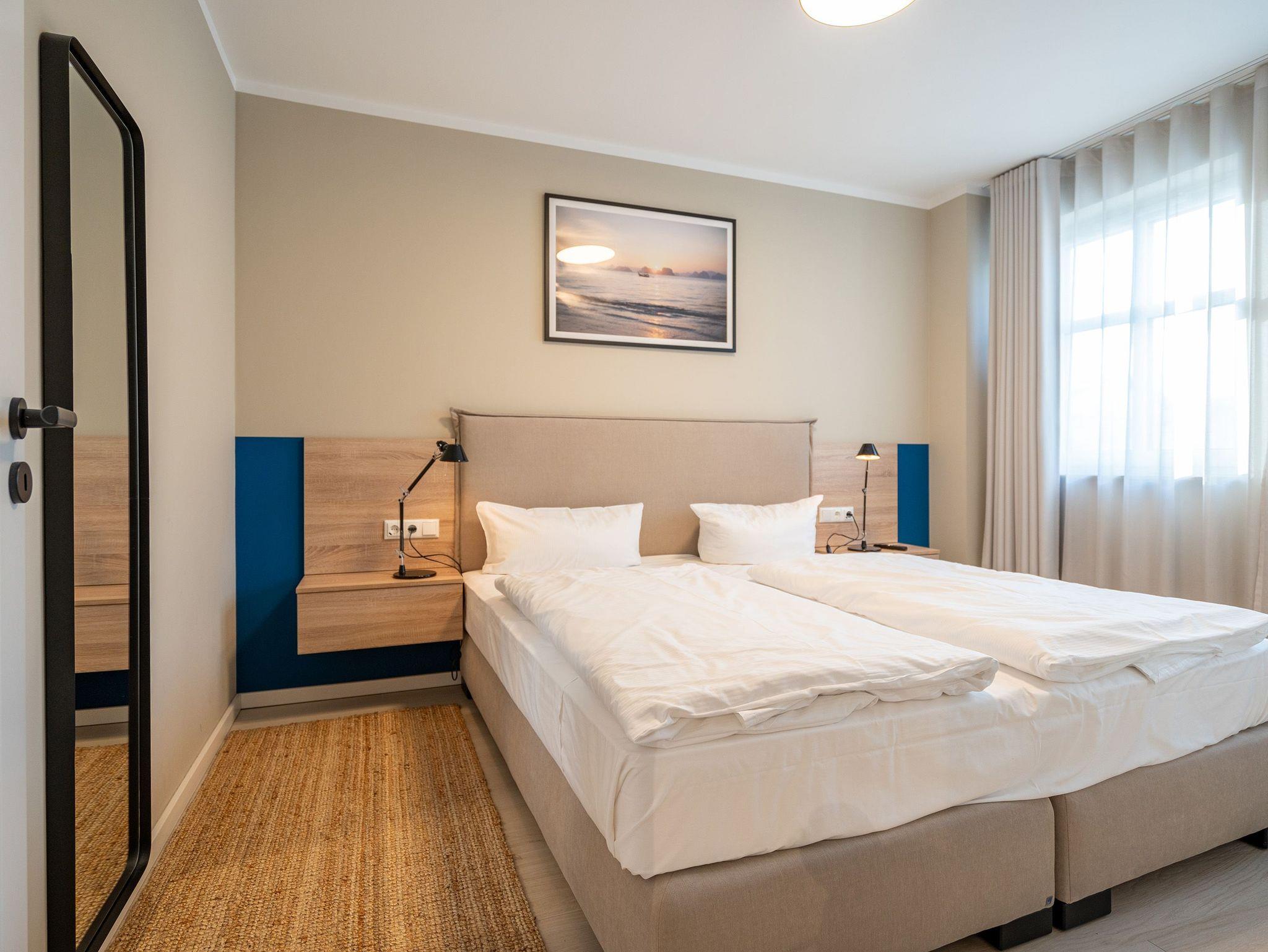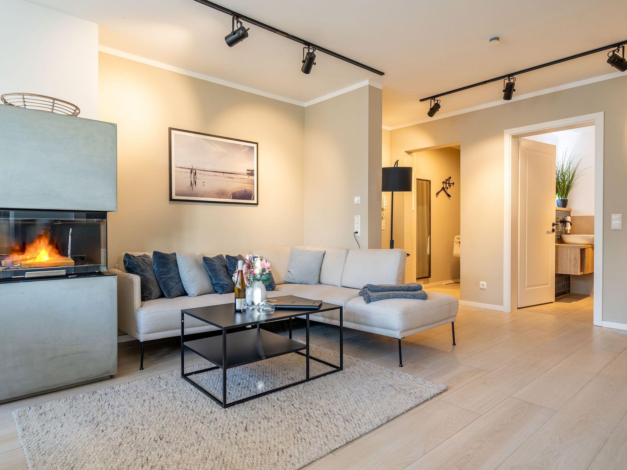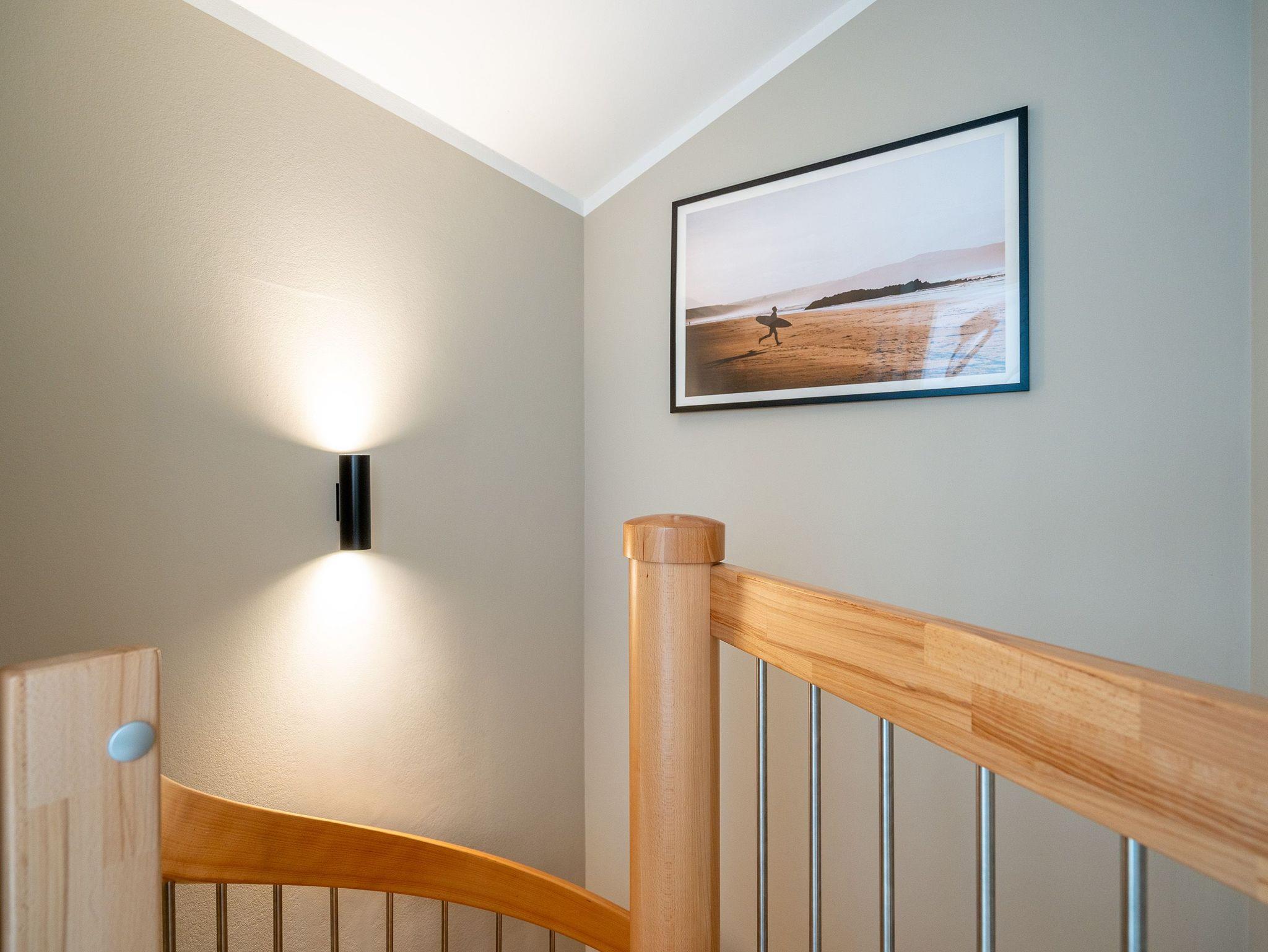 Maritimes Flair und eleganter Wohnkomfort ? das Appartement Nummer 10 im ersten Obergeschoss ist ein echter Urlaubstraum. 100 Quadratmeter verteilt auf zwei Etagen sorgen für viel Platz. Ein Urlaubsparadies, aus dem man am liebsten nicht wieder ausziehen möchte. Bis zu sechs Personen können hier unterkommen. Die drei Schlafzimmer und das schöne, geräumige Wohn-Esszimmer sind ideal für einen Urlaub mit der ganzen Familie oder den Freunden. Das Wohnzimmer verfügt über eine gemütliche Sofalandschaft, einen Kamin und einen großen Flat-TV. Ein schöner Esstisch aus Holz und samtig bequeme Stühle laden zum Genießen und Verweilen ein. Jedes Accessoires, jedes Foto an der Wand versetzt hier in Ostseeauszeitstimmung. Lassen Sie sich fallen und fühlen Sie sich einfach nur wohl. Die zum Wohnzimmer hin offene Küche ist mit hochwertigen Markengeräten voll ausgestattet. Ob Induktionsherd, Spülmaschine, Mikrowelle, Kaffeemaschine, Toaster oder edles Geschirr ? es ist alles vorhanden. Auf der unteren Ebene befinden sich zudem zwei der drei Schlafzimmer. Das dritte ist eine Etage höher. Alle drei jedoch sind gleich eingerichtet, verfügen über ein komfortables Boxspringdoppelbett (1,80 m x 2,00 m), einen Einbauschrank und einen Flat-TV. Zwei Bäder mit Dusche und WC hat das Appartement. Im Masterbad mit Tageslicht wartet außerdem neben einem Doppelwaschtisch auch noch eine Finnische Sauna darauf, Ihnen nach einem frostigen Sturmspaziergang ordentlich einzuheizen. In der Garderobe befindet sich eine Waschmaschine und ein Trockner. Über eine Wendeltreppe gelangt man in die obere Etage. Hier ist das dritte Schlafzimmer untergebracht, aber auch das absolute Highlight der Wohnung: eine sonnige und abgeschirmte Dachterrasse (12 Quadratmeter groß). Ob Frühstück oder erfrischender Abendcocktail ? hier lässt sich der Sommerurlaub wunderbar entspannt angehen. Das WLAN ist kostenfrei nutzbar. Bei Anreise sind die Betten bezogen und Handtücher liegen bereit. In der Tiefgarage sind für das Appartement zwei hintereinander liegende Stellplätze reserviert. Hier gibt es auch die Möglichkeit, ein E-Auto an der Ladestation kostenpflichtig aufzuladen.