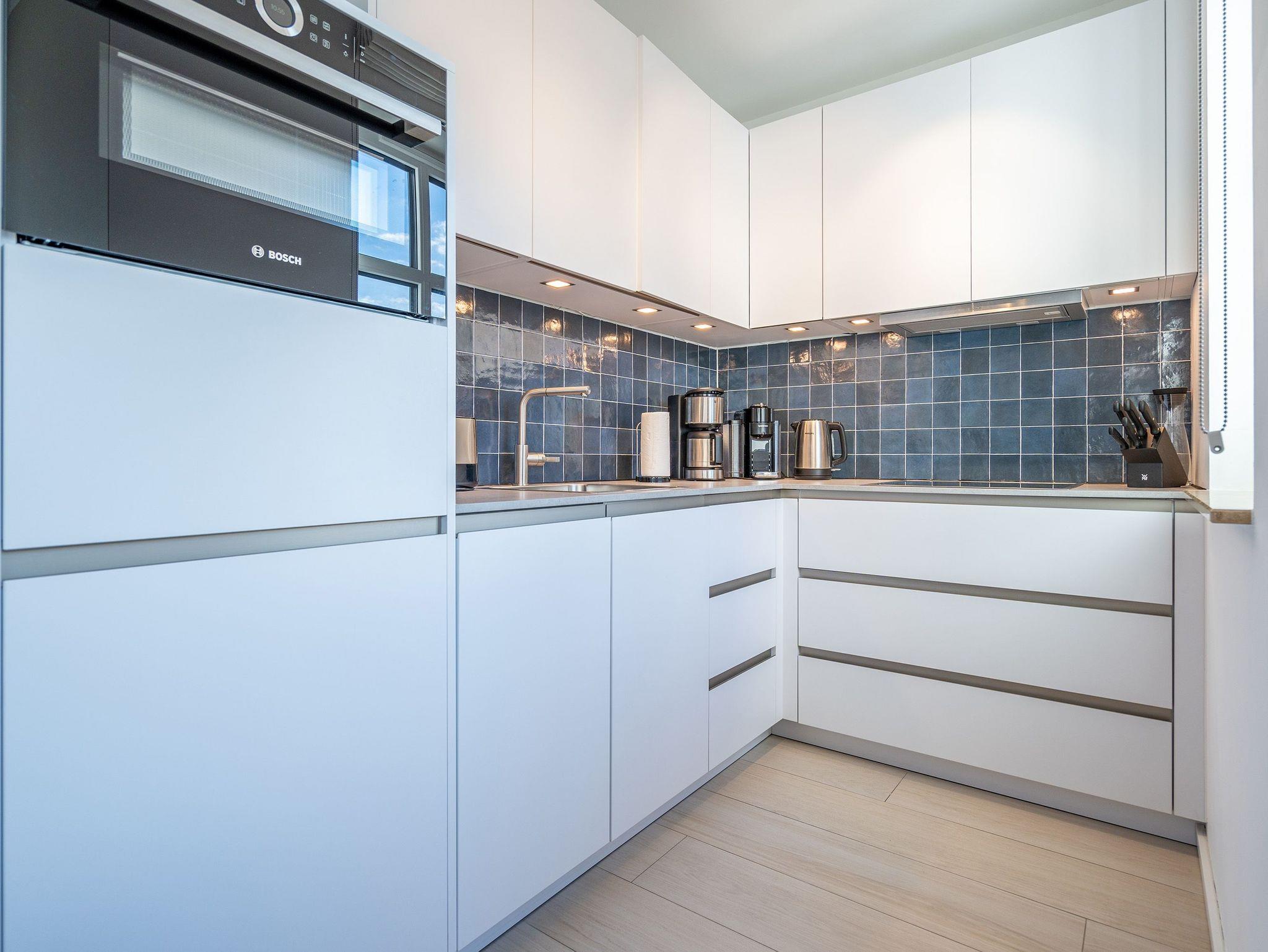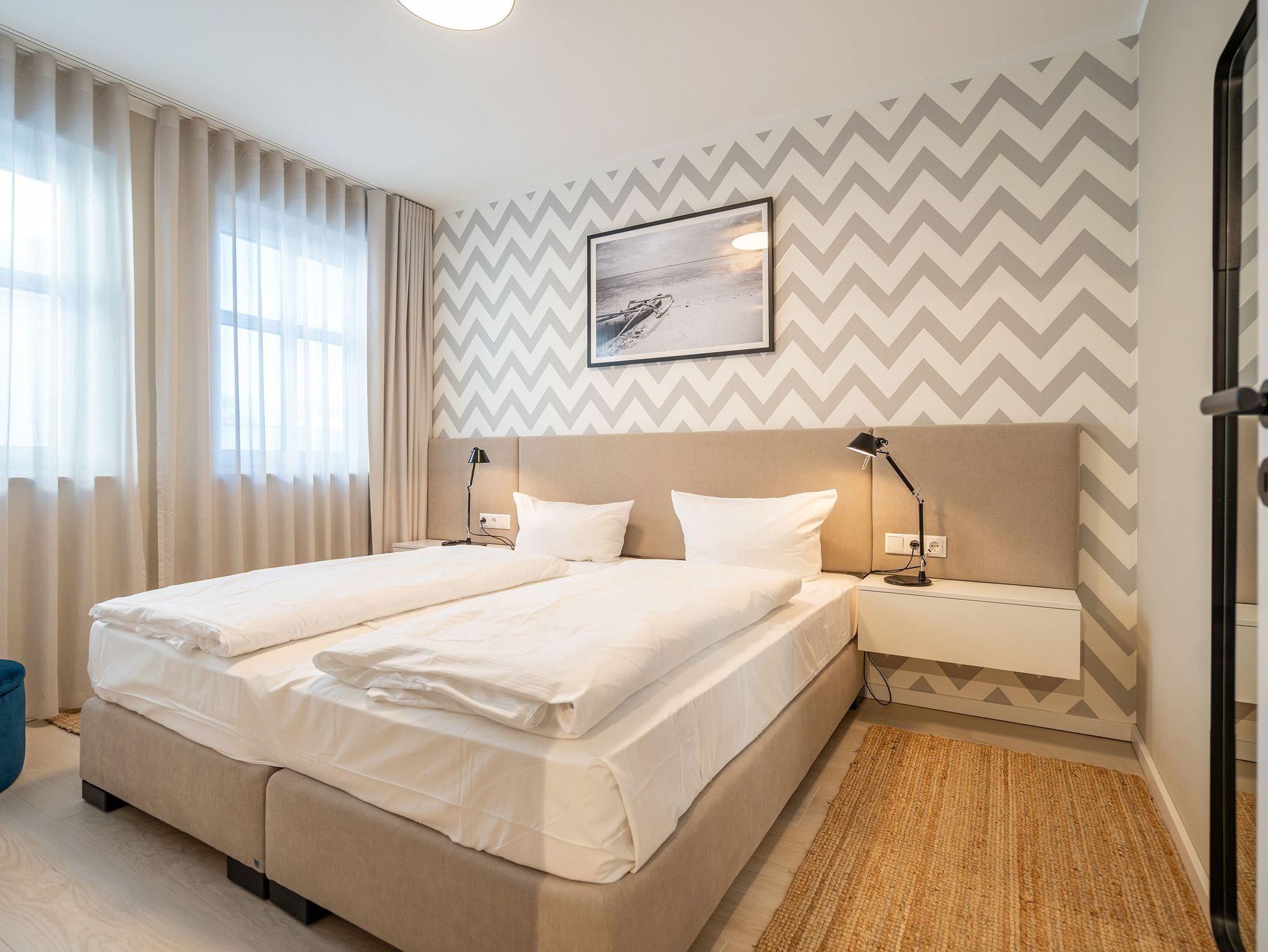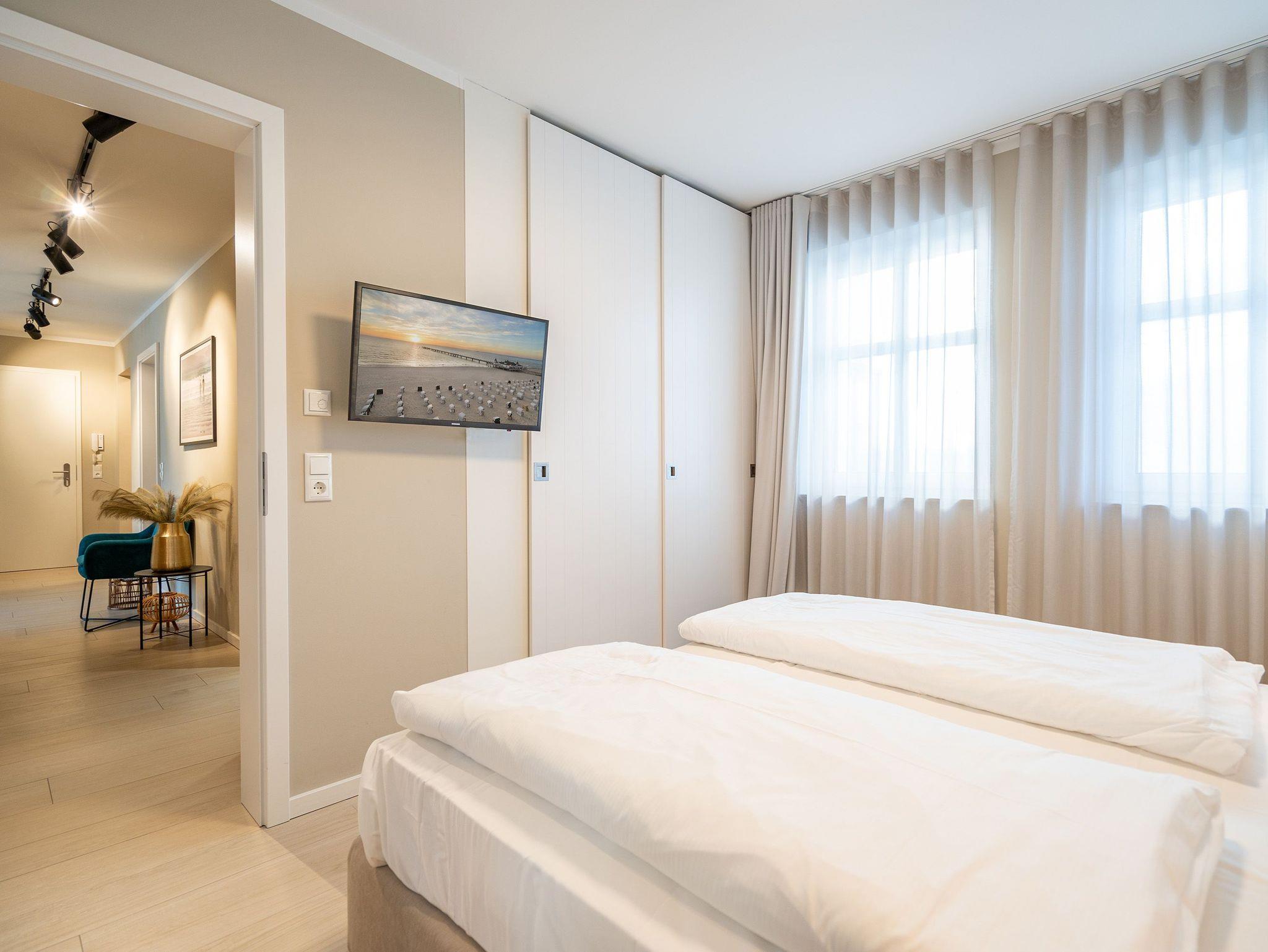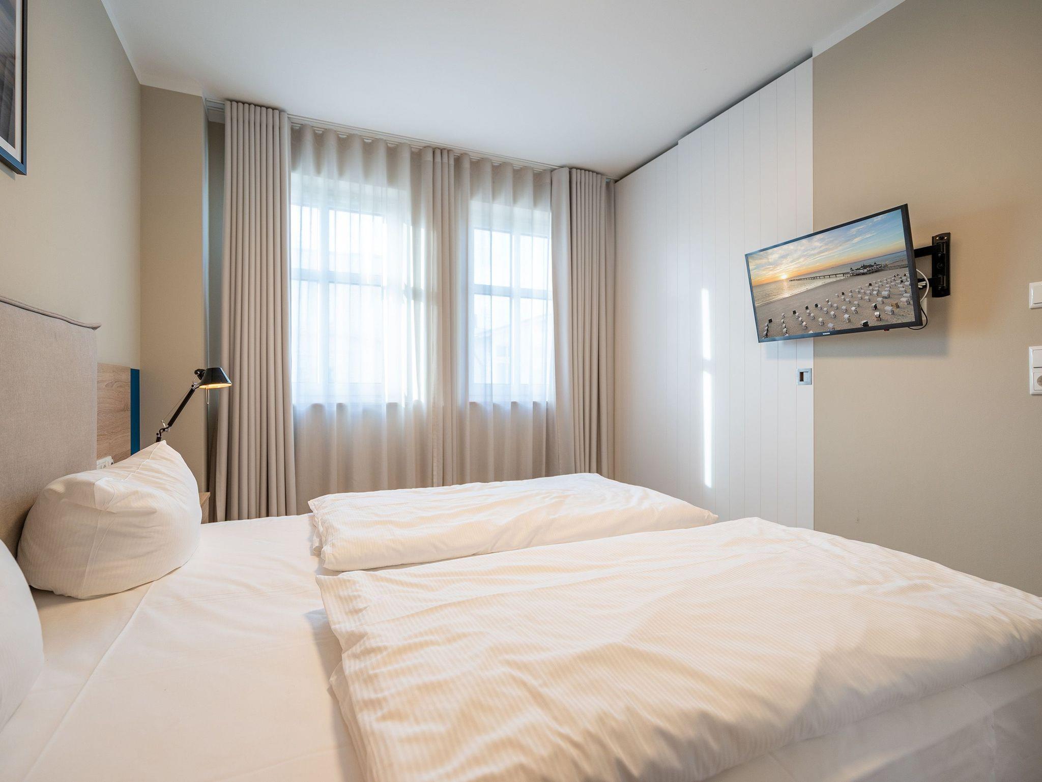 Maritimes Flair und eleganter Wohnkomfort ? das Appartement Nummer 10 im ersten Obergeschoss ist ein echter Urlaubstraum. 100 Quadratmeter verteilt auf zwei Etagen sorgen für viel Platz. Ein Urlaubsparadies, aus dem man am liebsten nicht wieder ausziehen möchte. Bis zu sechs Personen können hier unterkommen. Die drei Schlafzimmer und das schöne, geräumige Wohn-Esszimmer sind ideal für einen Urlaub mit der ganzen Familie oder den Freunden. Das Wohnzimmer verfügt über eine gemütliche Sofalandschaft, einen Kamin und einen großen Flat-TV. Ein schöner Esstisch aus Holz und samtig bequeme Stühle laden zum Genießen und Verweilen ein. Jedes Accessoires, jedes Foto an der Wand versetzt hier in Ostseeauszeitstimmung. Lassen Sie sich fallen und fühlen Sie sich einfach nur wohl. Die zum Wohnzimmer hin offene Küche ist mit hochwertigen Markengeräten voll ausgestattet. Ob Induktionsherd, Spülmaschine, Mikrowelle, Kaffeemaschine, Toaster oder edles Geschirr ? es ist alles vorhanden. Auf der unteren Ebene befinden sich zudem zwei der drei Schlafzimmer. Das dritte ist eine Etage höher. Alle drei jedoch sind gleich eingerichtet, verfügen über ein komfortables Boxspringdoppelbett (1,80 m x 2,00 m), einen Einbauschrank und einen Flat-TV. Zwei Bäder mit Dusche und WC hat das Appartement. Im Masterbad mit Tageslicht wartet außerdem neben einem Doppelwaschtisch auch noch eine Finnische Sauna darauf, Ihnen nach einem frostigen Sturmspaziergang ordentlich einzuheizen. In der Garderobe befindet sich eine Waschmaschine und ein Trockner. Über eine Wendeltreppe gelangt man in die obere Etage. Hier ist das dritte Schlafzimmer untergebracht, aber auch das absolute Highlight der Wohnung: eine sonnige und abgeschirmte Dachterrasse (12 Quadratmeter groß). Ob Frühstück oder erfrischender Abendcocktail ? hier lässt sich der Sommerurlaub wunderbar entspannt angehen. Das WLAN ist kostenfrei nutzbar. Bei Anreise sind die Betten bezogen und Handtücher liegen bereit. In der Tiefgarage sind für das Appartement zwei hintereinander liegende Stellplätze reserviert. Hier gibt es auch die Möglichkeit, ein E-Auto an der Ladestation kostenpflichtig aufzuladen.