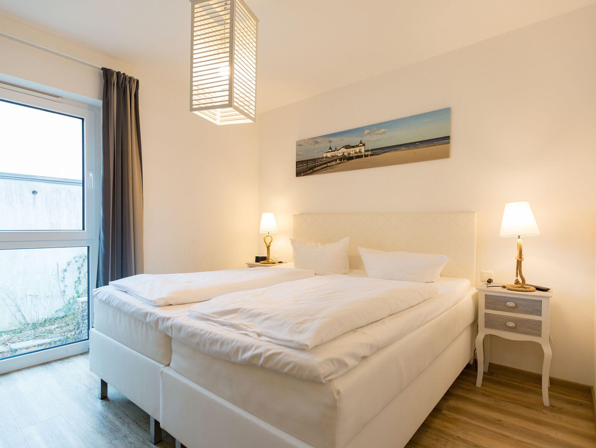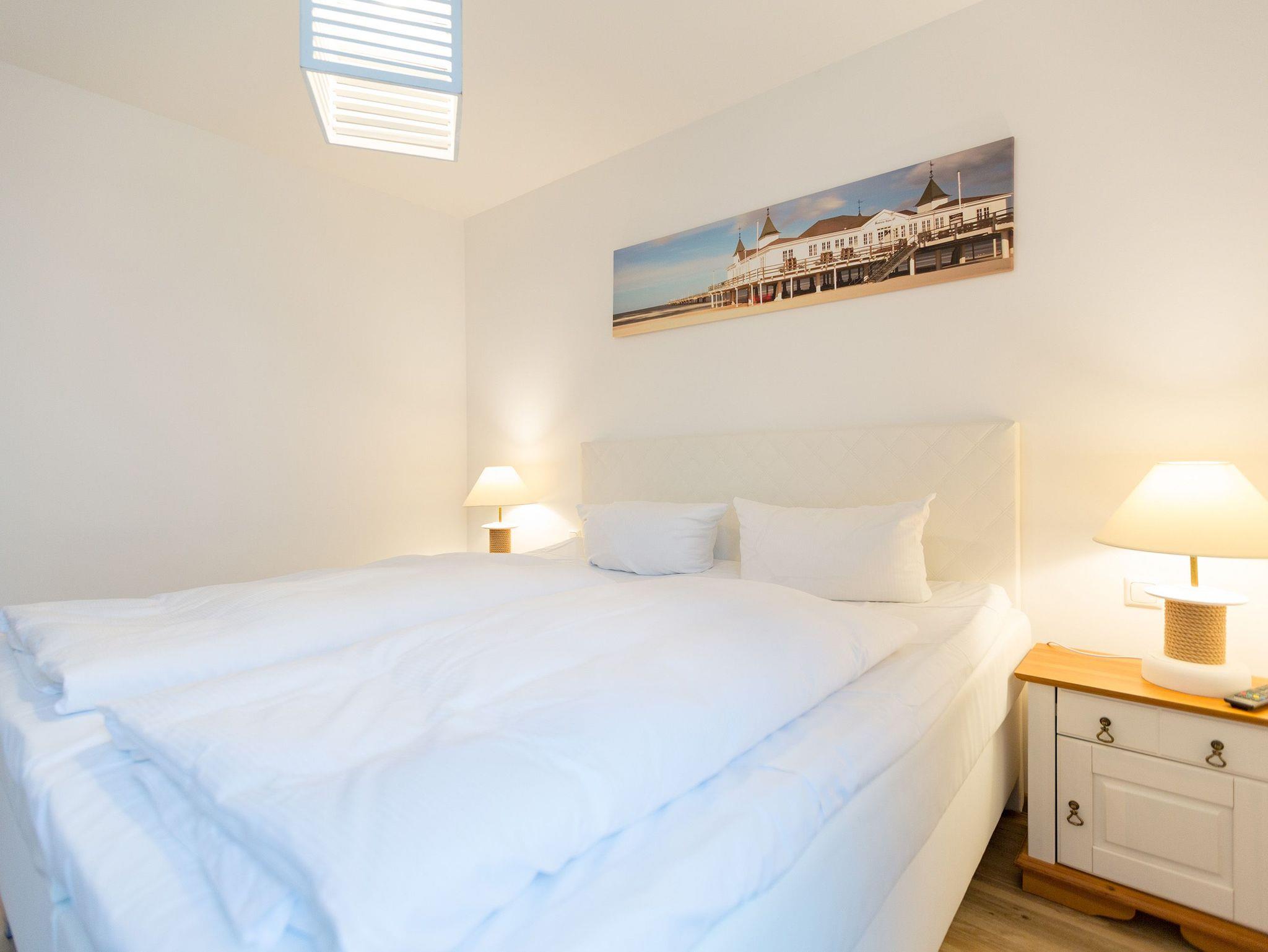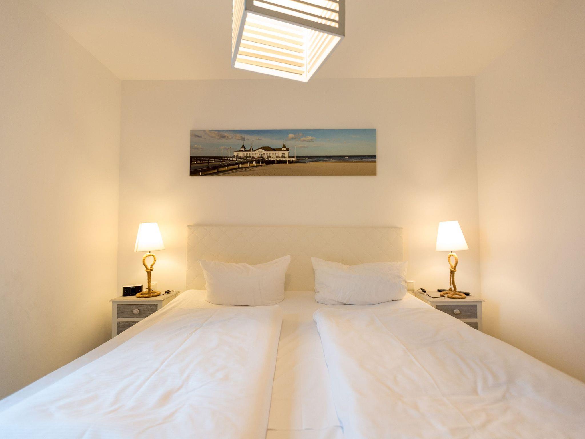 Träumen Sie nicht auch ab und an von einen kleinen Auszeit in ungewöhnlicher und ungewöhnlich schöner Umgebung? Dieses Appartement für bis zu 4 Personen [&] 1 Kleinkind ( bis 2 Jahre im Kinderreisebett) in der ersten Etage des Quartier Ahlbeck ist genau das Richtige für Liebhaber exquisiter Stilmöbel. Denn in diesem 80 Quadratmeter großen Ferienappartement erwartet Sie Landhausstil vom Feinsten. Der helle Wohnbereich mit der offenen Küche ist der ideale Rückzugsort, um neue Energie zu tanken. Ein bequemes Sofa aus Korb und die beiden großen Ohrensessel laden geradezu ein, sich in ihnen zu entspannen. Ein Kaminofen sorgt zusätzlich für Gemütlichkeit. Der Flat-TV besitzt einen Blue-Ray-Player. So wird das Urlaubsdomizil zum echten Heimkino. Durch die bodentiefen Fenster gelangen Sie auf einen lichtüberfluteten Süd-West-Balkon. Genießen Sie die Sonne und vergessen dabei einfach mal den Alltag. Lockt der Appetit, bietet die offene Wohnküche mit wunderschönem Essplatz alles, was das Herz des Hobbykochs höher schlagen lässt. Hochwertige Geräte vom Herd, über die Kaffeemaschine bis zur Mikrowelle und erlesenes Geschirr machen das Zubereiten und Genießen der Speisen zum Vergnügen. Die zwei Bäder sind geräumig und mit Dusche, Waschtisch und WC ausgestattet. Schalten Sie ab und kommen Sie zur Ruhe in der eigenen Finnischen Sauna. Danach bleischwer und völlig entspannt ins Bett fallen? Kein Problem. In den beiden Schlafzimmern warten bequeme Boxspringdoppelbetten (1,80 m x 2,00 m) nur darauf, Ihnen himmlische Träume zu bescheren. Auch hier sind Möbel und Wände wunderbar hell gehalten und geben den Zimmern ein luftig leichtes Ambiente. Große Schränke bieten viel Platz für Ihre Sachen. Damit Ihre Urlaubsauszeit so entspannend wie möglich ist, sind die Betten bei Ihrer Anreise bezogen und Handtücher liegen bereit.