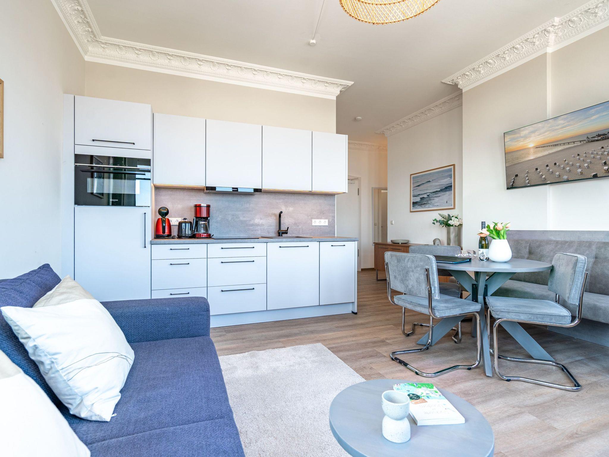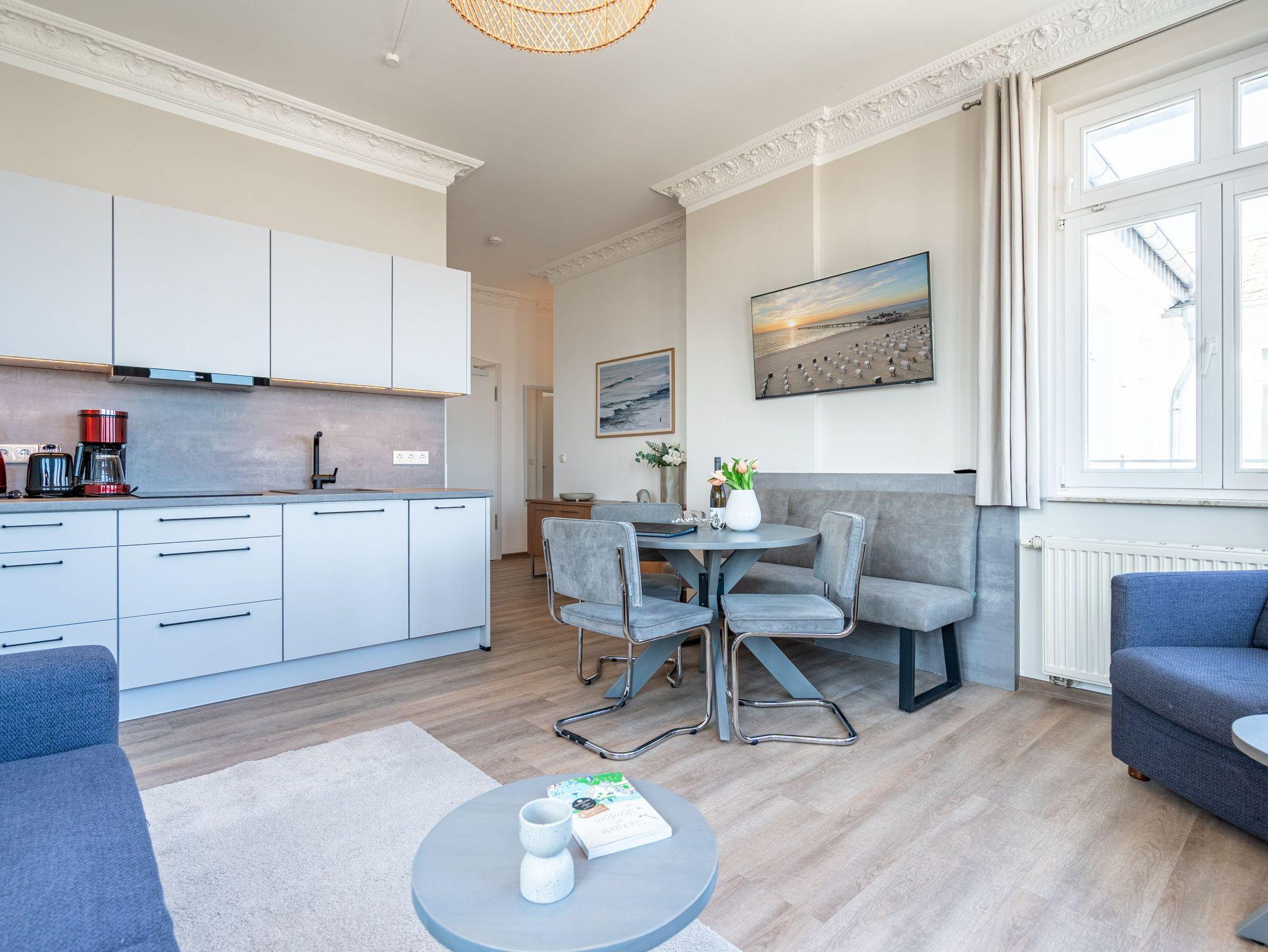 Die 3-Raum-Ferienwohnung Nr. C12 in der Villa Seedüwel bietet auf 52 qm Platz für 2 bis 4 Personen und befindet sich im 2. Obergeschoss. Der offene Wohnbereich besticht durch einen traumhaften Blick auf die Seebrücke und die Ostsee. Hier finden Sie eine gut ausgestattete Küchenzeile mit einem Induktionskochfeld, einer Mikrowelle und einem Kühlschrank mit Gefrierfach sowie einen Essplatz für vier Personen, eine gemütliche Sitzgruppe und einen Flat-TV. Das erste Schlafzimmer verfügt über ein komfortables Doppelbett (1,80 m x 2,00 m) und einen Kleiderschrank. Von hier aus gelangen Sie auf den kleinen Nord-Ost-Balkon, der einen schönen Blick auf die Ostsee bietet. Das zweite Schlafzimmer ist mit einem Etagenbett (0,90 m x 2,00 m) ausgestattet. Das innenliegende Bad umfasst eine Dusche und ein Waschbecken, zudem gibt es ein separates WC. Ein Stellplatz in der Tiefgarage ( Einfahrthöhe 2,03m) des benachbarten Hauses „Strandterrasse“ ist für Sie reserviert. WLAN steht Ihnen kostenfrei zur Verfügung.