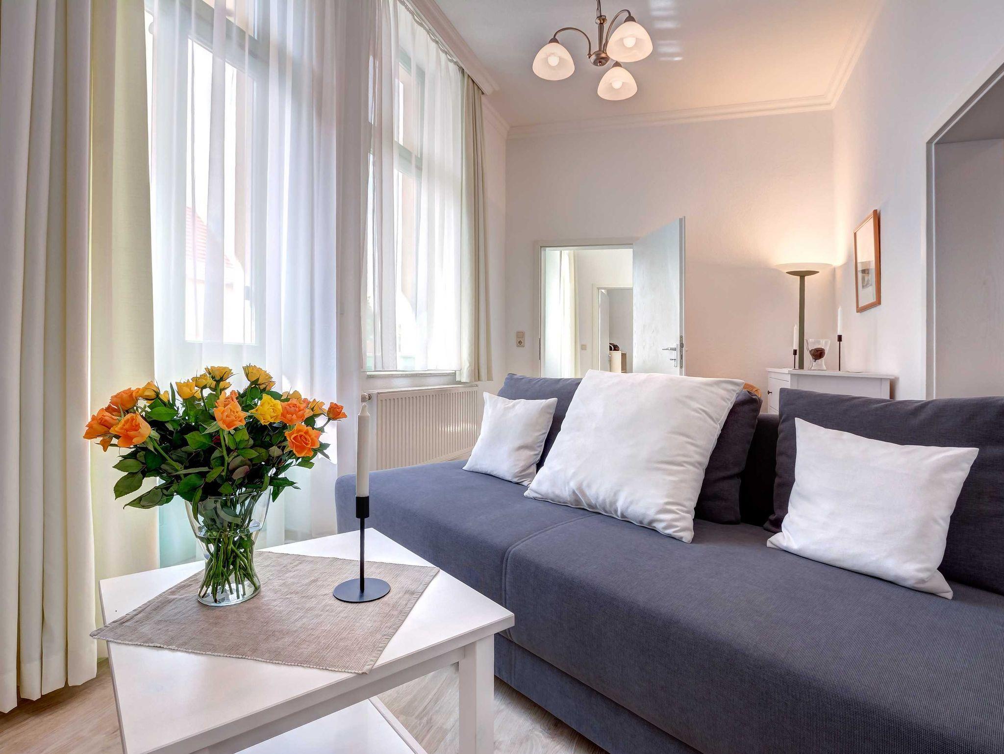 STRANDNAH! Nur ca. 100 m zur Strandpromenade mit TERRASSE und KLEINEM GARTEN! Schönes 2-Zimmer-Apartment mit gemütlicher Ausstattung. Separates Schlafzimmer, Wohnzimmer mit zus. Schlafcouch, separate Küche mit Essplatz, geräumiges Duschbad, kleiner Vorflur, Terrasse mit Gartenmöbeln und 2 Ruheliegen, separater Eingang. Küche zusätzlich mit Minibackofen, Wasserkocher, Eierkocher und Mixer. W-LAN-DSL (kostenpflichtig. Die Wohnung verfügt über einen Pkw-Stellplatz . Abstellraum für Fahrräder und ähnliches ist vorhanden. Eine Sauna in der Villa Germania kann kostenpflichtig genutzt werden. Vom Haus aus können Sie das Ortszentrum und die bekannte Ahlbecker Seebrücke in ca. 3 bzw. 5 Minuten zu Fuß erreichen.