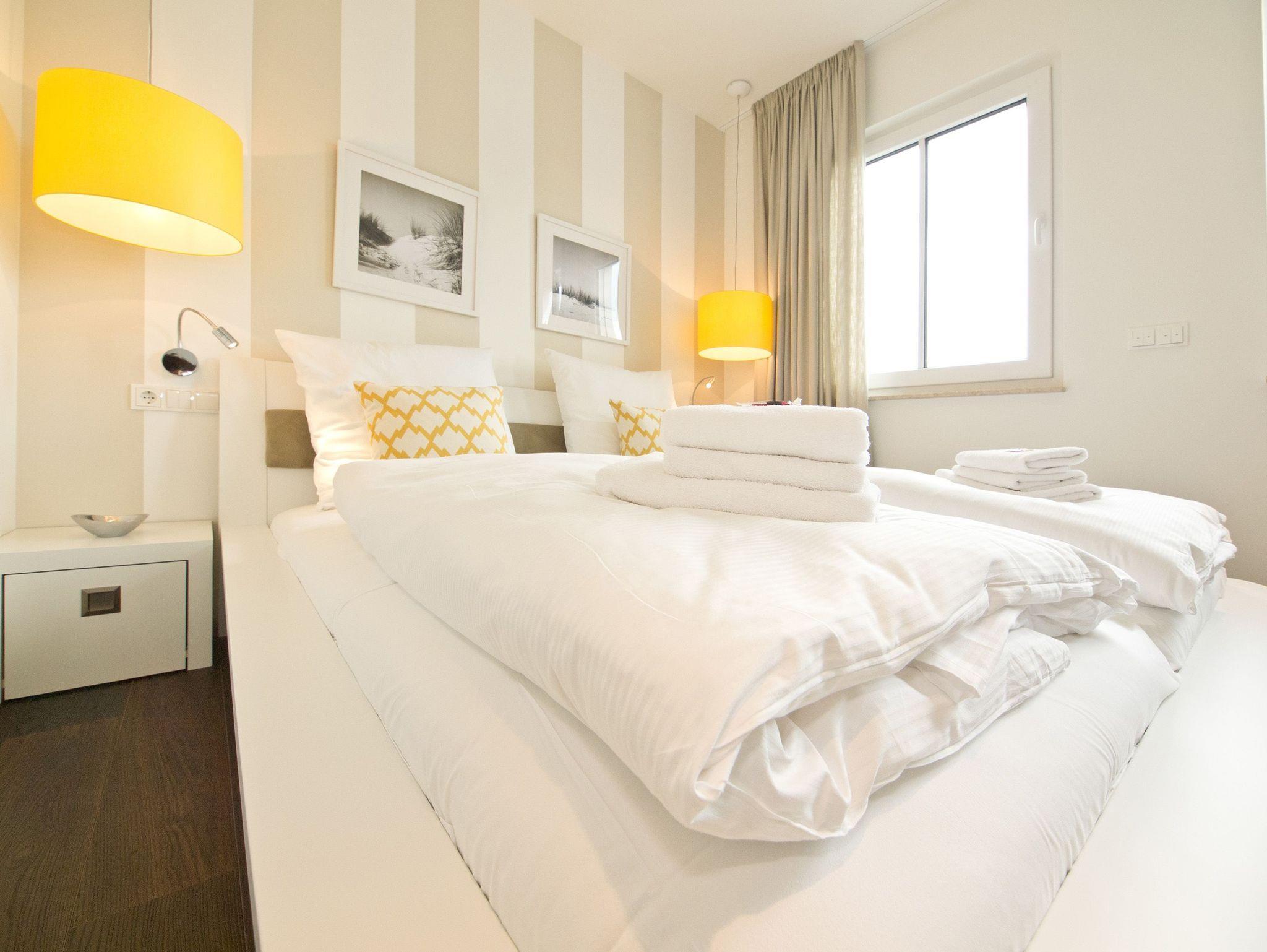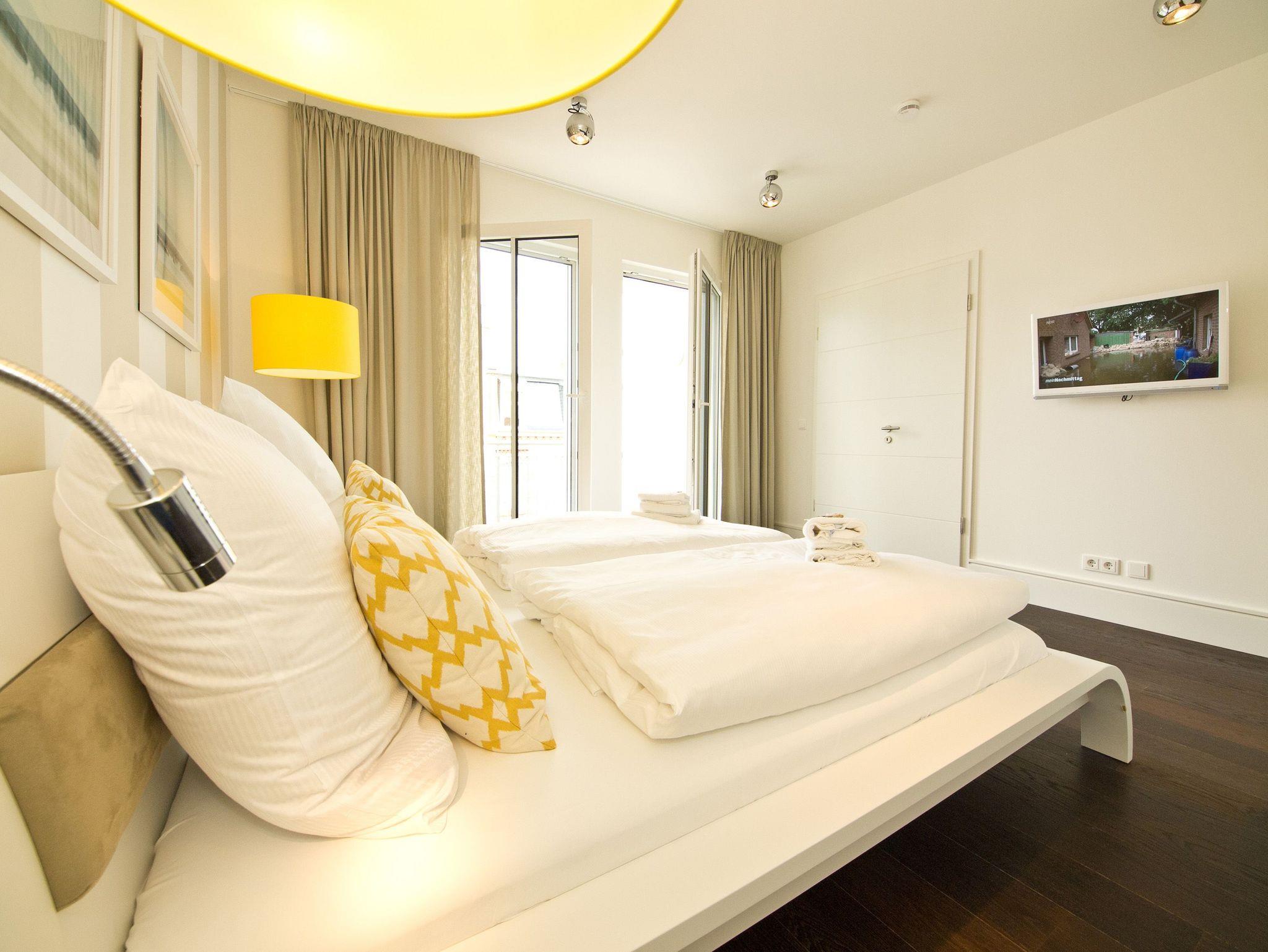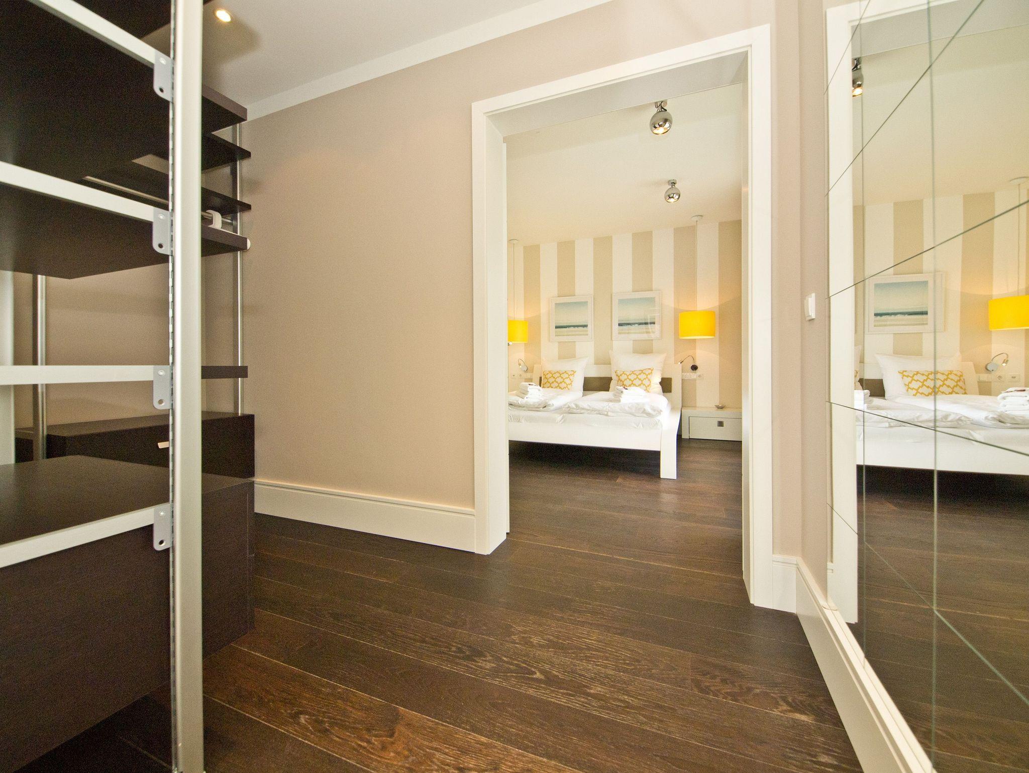 Im 2. Obergeschoss des Dünenpalais trifft modernes Design exklusive Ausstattung! Auf 100 qm wurden hochwertige Einbauten, ein edler dunkler Dielenboden und geschmackvolle Dekorationen von versierter Innenarchitektenhand zusammengestellt und schaffen so eine stylische Wohlfühlatmosphäre für bis zu 4 Personen und 1 Kleinkind (bis 3 Jahre im Kinderreisebett). Der großzügige Wohnbereich mit bequemer Sitzgruppe und Flat-TV schließt sich an die offene Küche mit Essplatz an. Ein besonderes Highlight ist der Gaskamin, der per Fernbedienung ein tolles Ambiente zaubert. Der Masterbedroom (mit Doppelbett 1,80m und Flat-TV) mit Balkon (Nordseite) verfügt über ein eigenes Ankleidezimmer, an das sich das große Bad mit Echtglasdusche [&] WC anschließt. Hier wurde ebenfalls die wohnungseigene Sauna (gegen Gebühr 1,00 Euro pro Stunde) integriert, nicht nur in der kalten Jahreszeit ein Ort zum Relaxen. Das zweite Schlafzimmer ist ebenfalls mit Doppelbett und eigenem Flat-TV ausgestattet, ihm gegenüber liegt das zweite Duschbad. Im Abstellraum kann eine Waschmaschine ( gegen Gebühr) genutzt werden. Ein sonniger Südbalkon mit Strandkorb und Gartenmöbeln rundet das Appartement ab. Für Ihren Komfort steht die Erstausstattung Wäsche für Sie bereit. Auf Wunsch stellen wir ein Kinderreisebett (ohne Matratze [&] Bettzeug) und einen Kinderhochstuhl gegen einen Aufpreis zur Verfügung. Ein PKW-Stellplatz steht Ihnen in der Tiefgarage zur Verfügung.