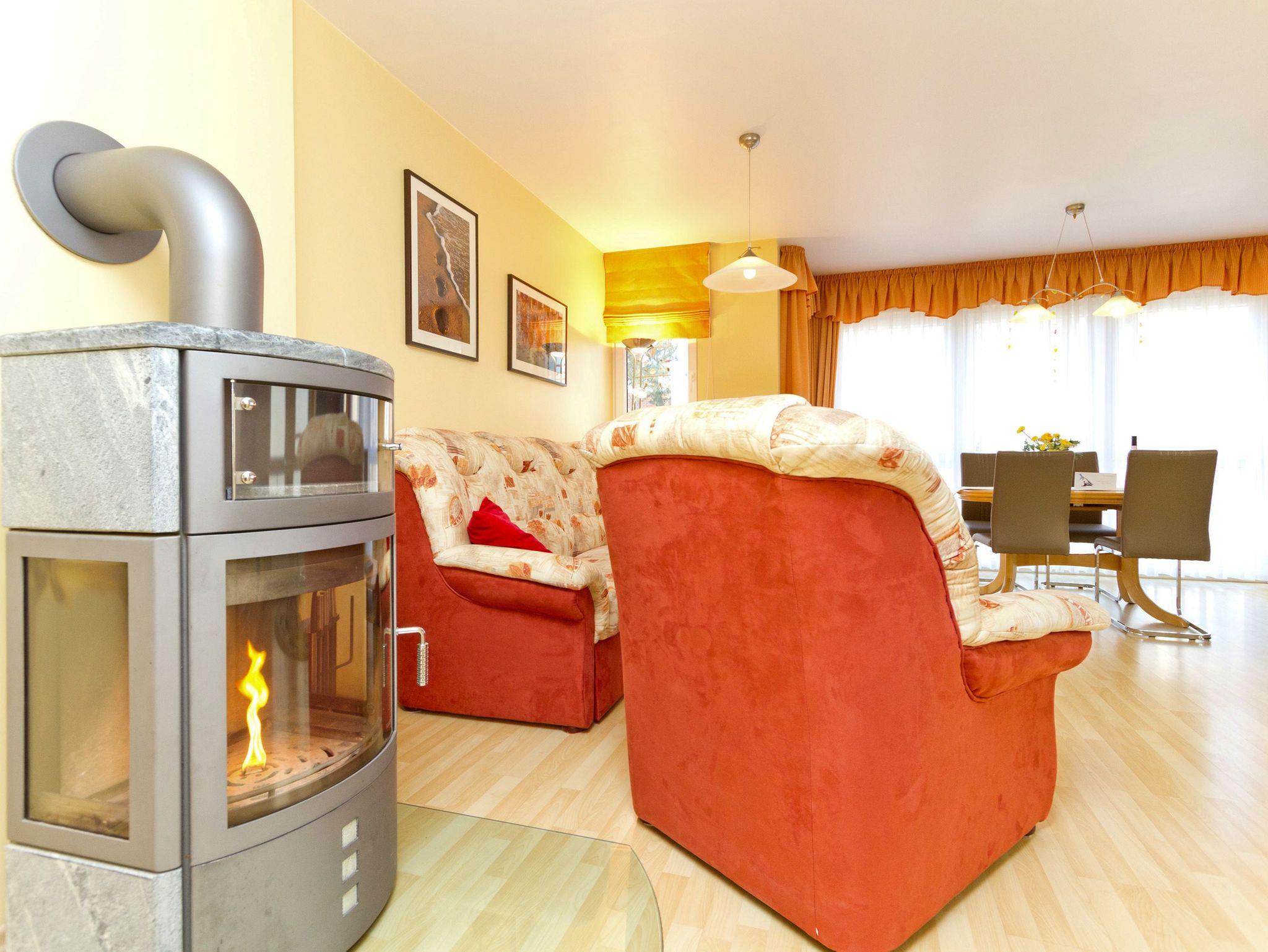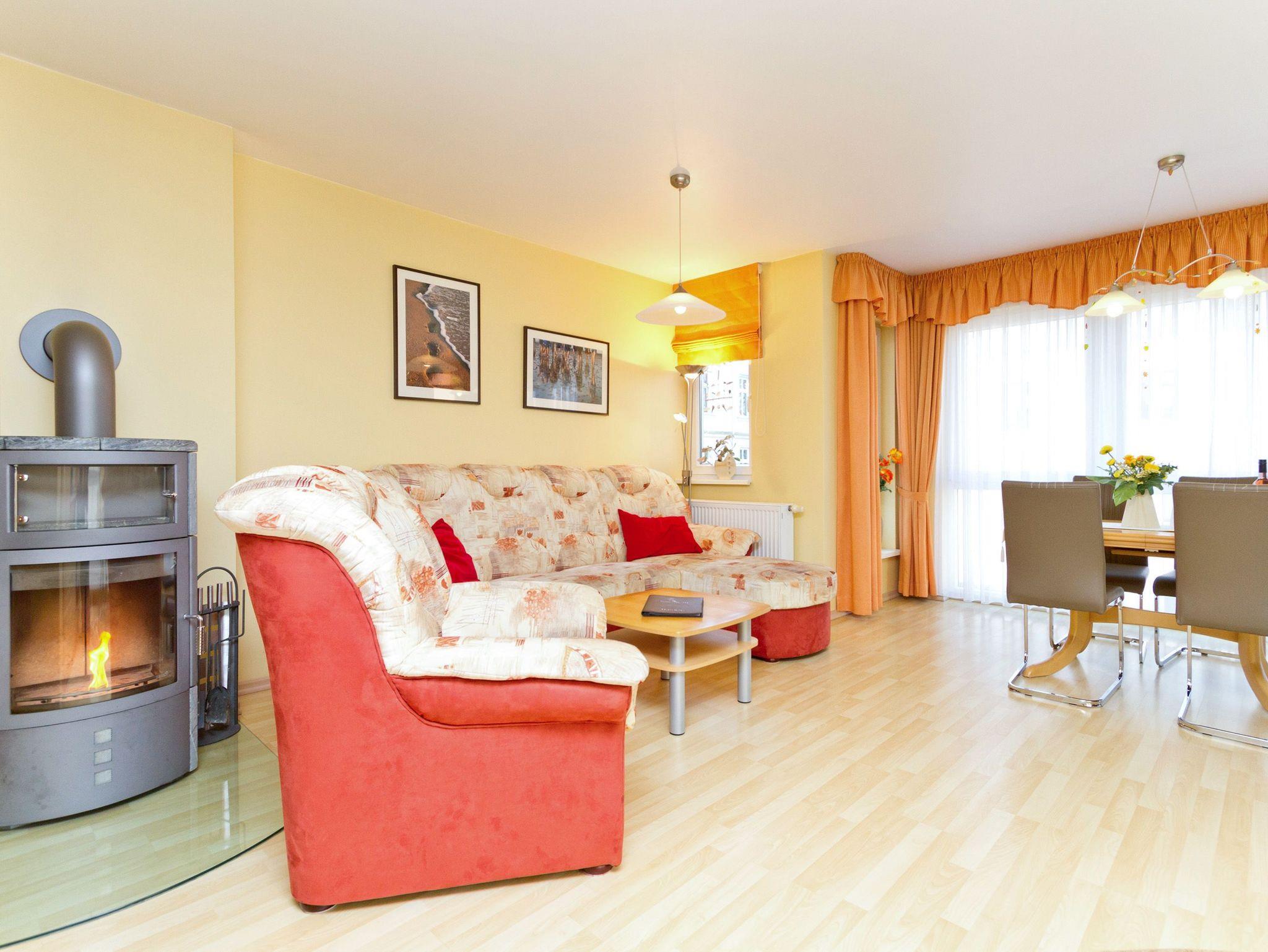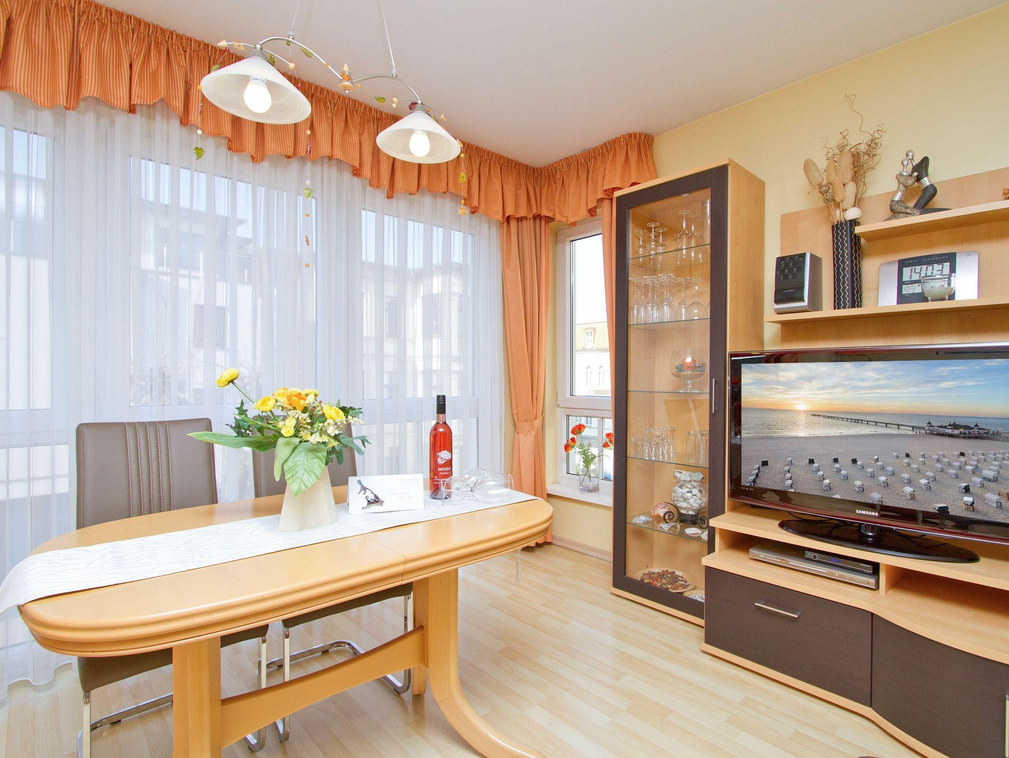 Die Ferienwohnung 11 in der Residenz Bismarck empfängt Sie in der 1. Etage des Hauses. Für Ihren Komfort ist es komplett ausgestattet und verfügt über einen großzügigen Wohnbereich mit Flat-TV, eine integrierte Küchenzeile und einen separaten Essplatz. Der Kamin im Wohnbereich ergänzt den Komfort dieser Ferienwohnung und lädt nicht nur in den kalten Jahreszeiten zum Entspannen ein. Durch die große Fensterfront im Wohnzimmer können Sie seitlich die Ostsee sehen. Das Schlafzimmer bietet Platz für drei Personen und verfügt über ein Doppelbett und ein Einzelbett für ein Kind bis 12 Jahre. Zusätzlich gelangen Sie von hier auf einen Balkon, der nach Osten ausgerichtet ist. Einen weitere Schlafmöglichkeit bietet die Couch mit Schlaffunktion im Wohnzimmer. Für Ihren Komfort ist die Erstausstattung Bettwäsche bereits bezogen und Handtücher liegen bereit.
