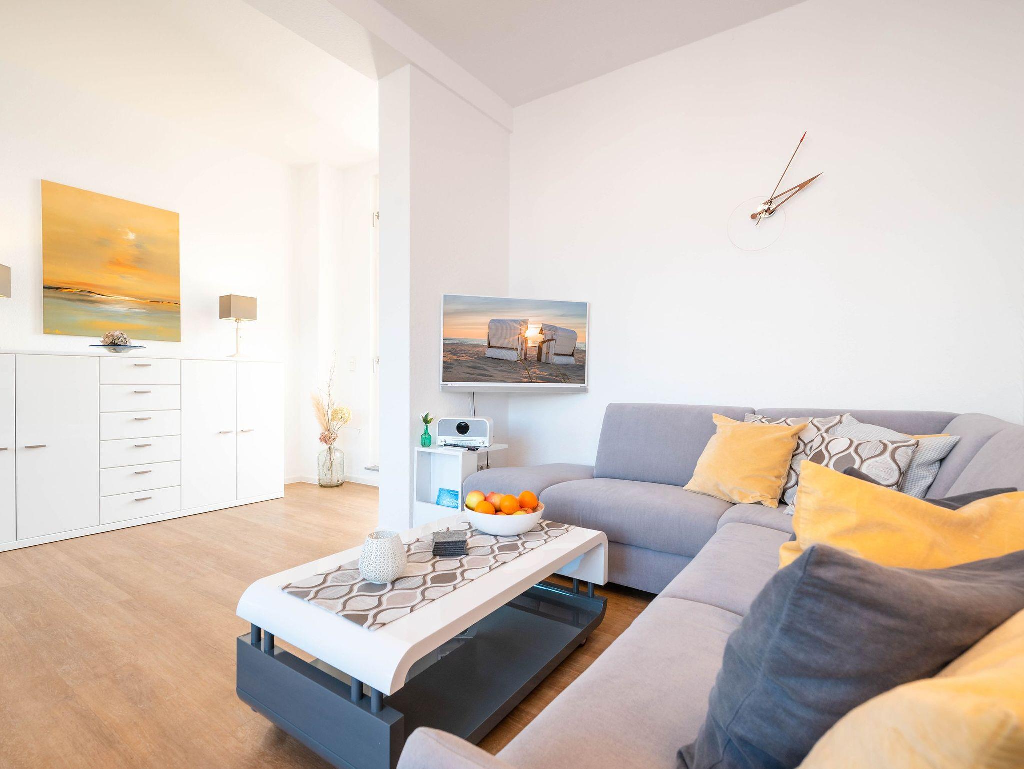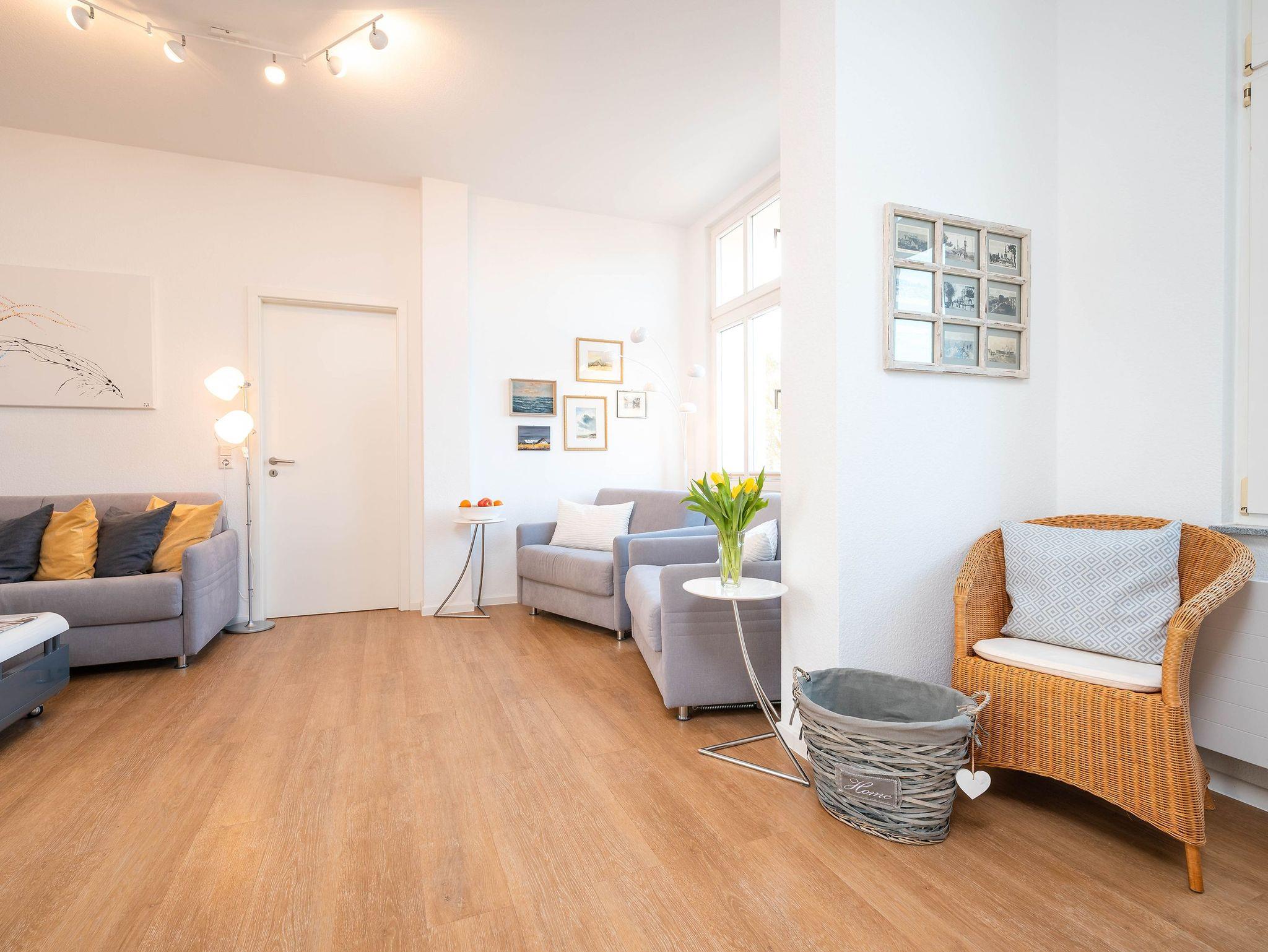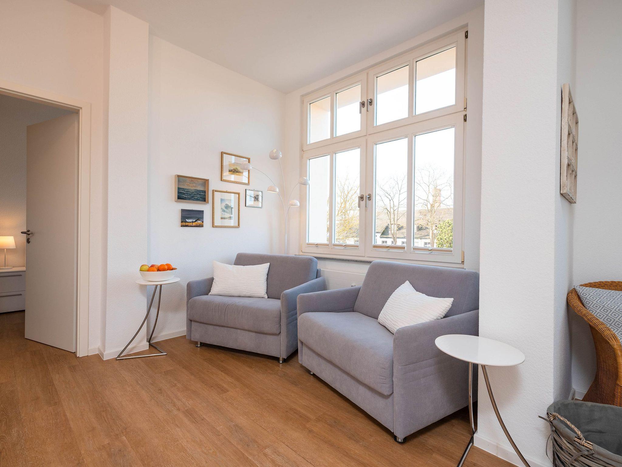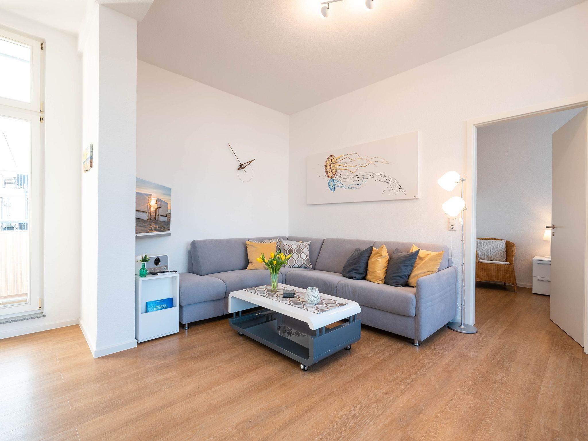 Das lichtdurchflutete Zweiraumappartement zeichnet sich durch seinen modernen Wohnkomfort und den wunderbaren seitlichen Meerblick aus. Im hell gestalteten Wohnbereich sorgt eine bequeme Couch neben einem Flat-TV und einer gemütlichen Sitzecke für entspannte Stunden. Vom Wohnzimmer aus öffnet sich der Zugang zu einem großzügigen Balkon, der Sie mit der Morgensonne begrüßt ? ideal für ein Frühstück mit Ausblick.