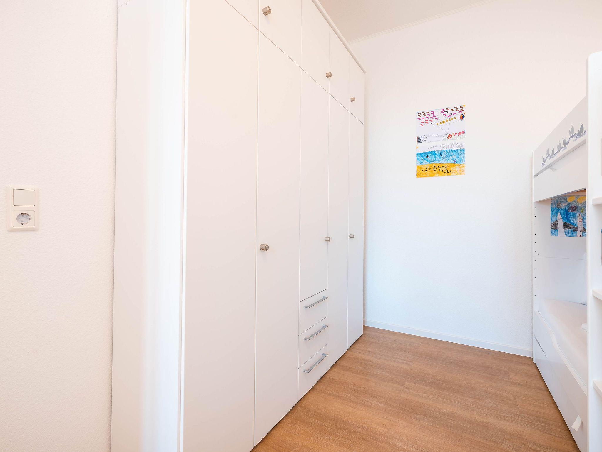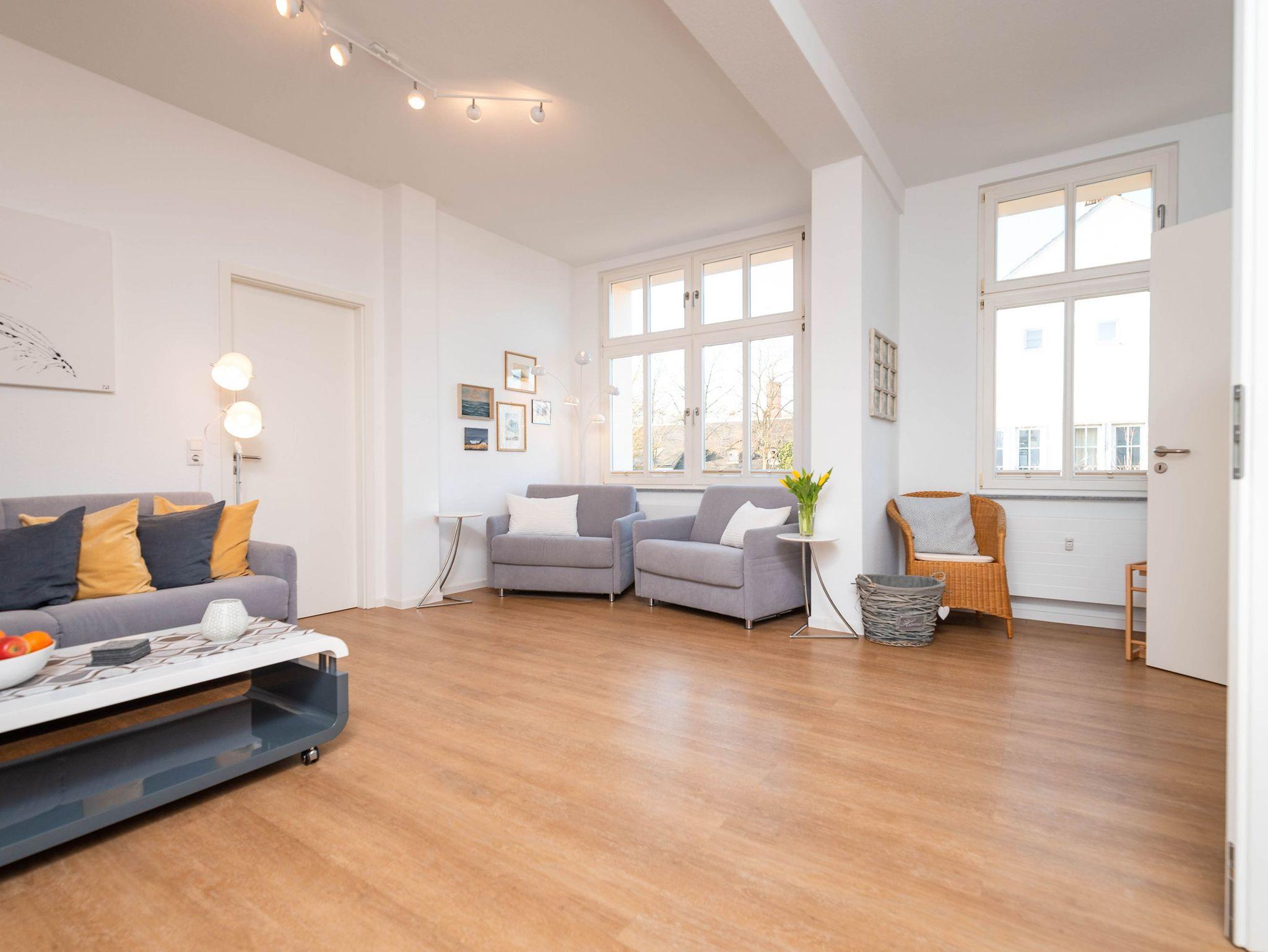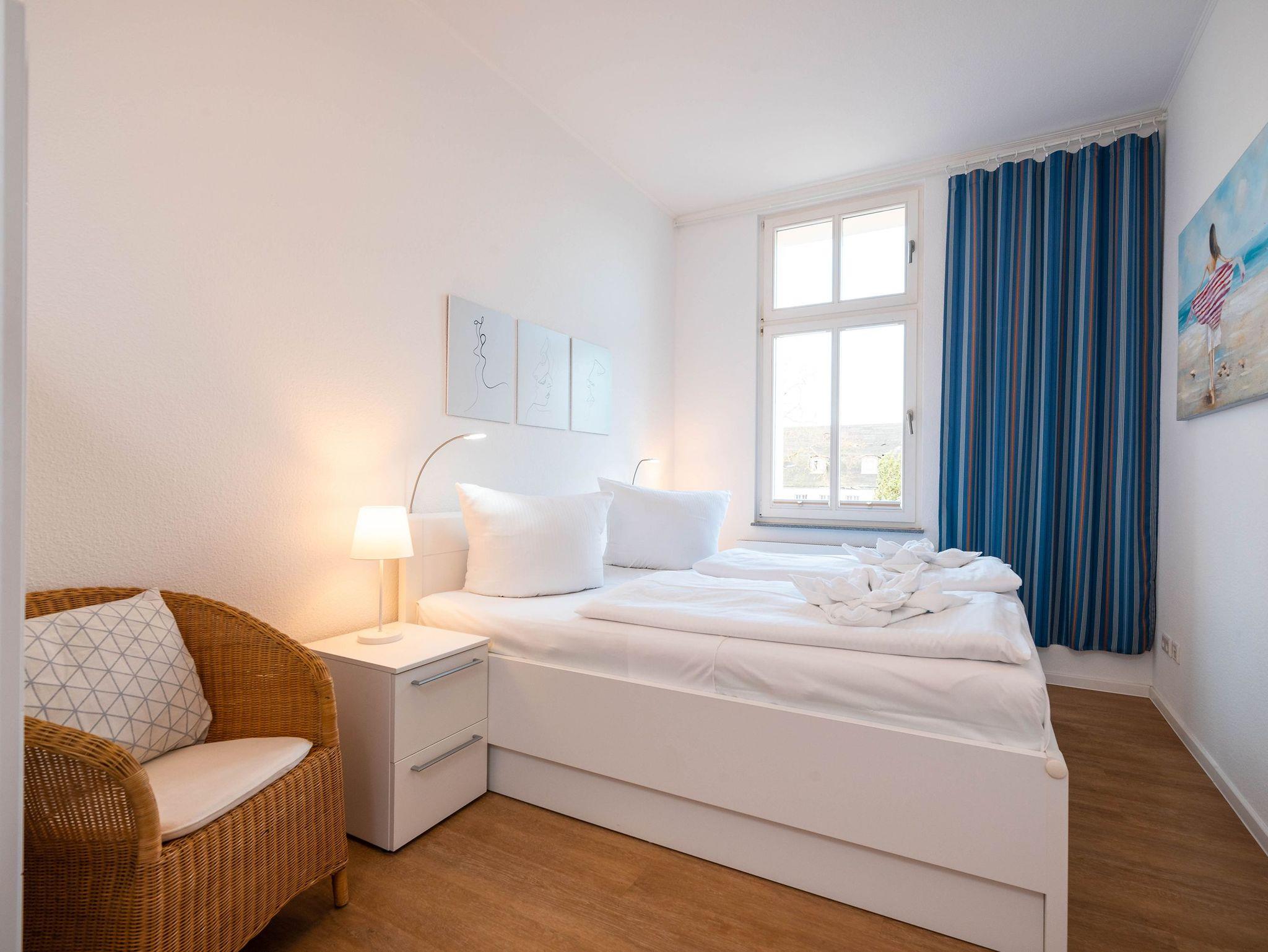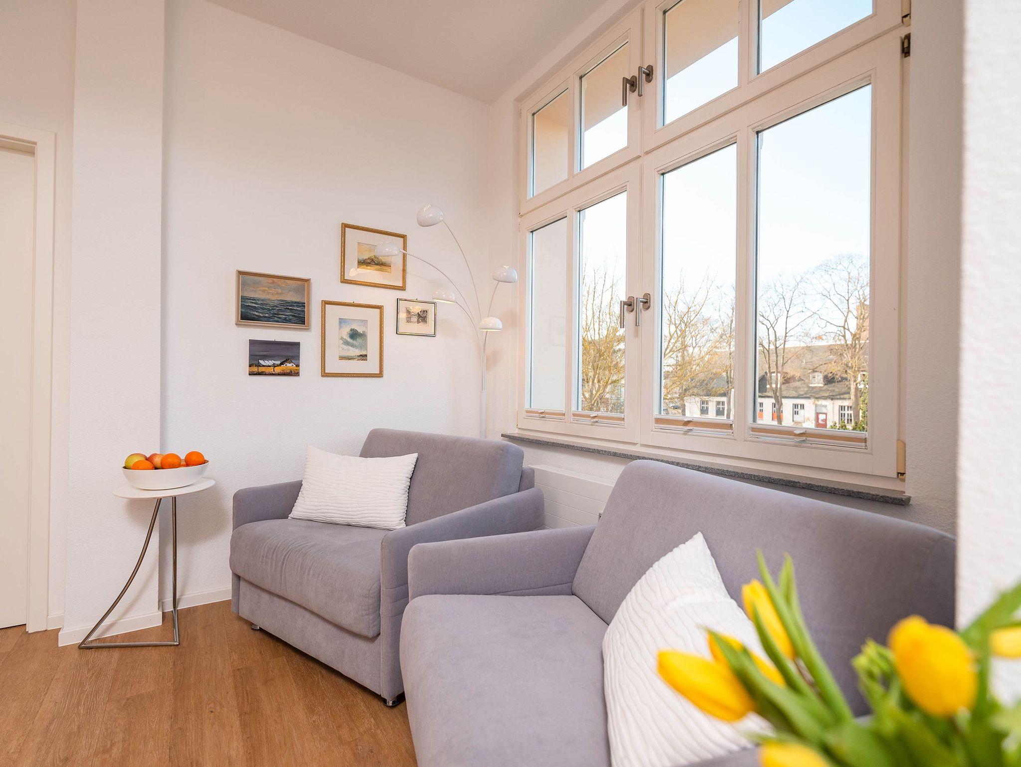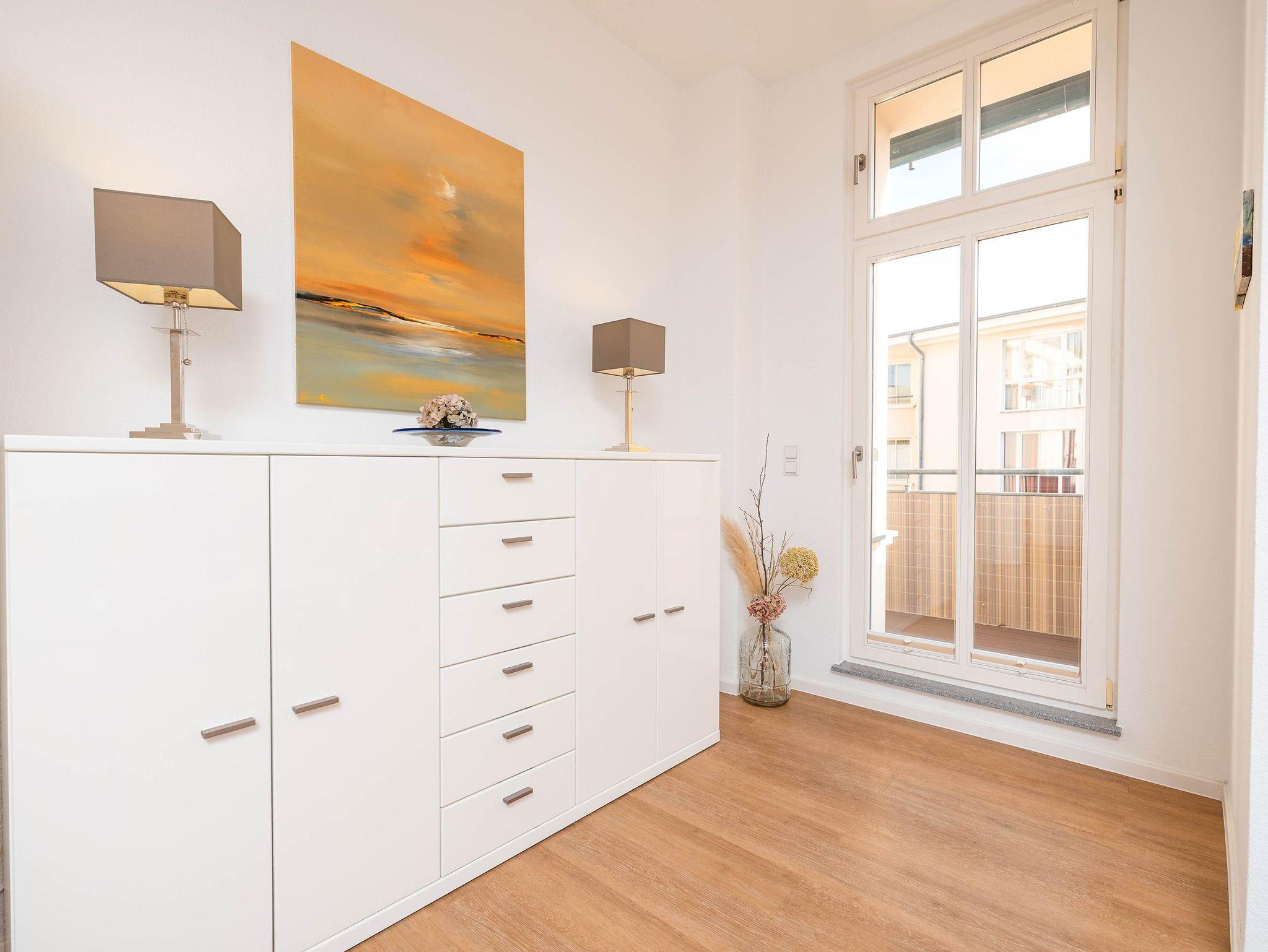 Das lichtdurchflutete Zweiraumappartement zeichnet sich durch seinen modernen Wohnkomfort und den wunderbaren seitlichen Meerblick aus. Im hell gestalteten Wohnbereich sorgt eine bequeme Couch neben einem Flat-TV und einer gemütlichen Sitzecke für entspannte Stunden. Vom Wohnzimmer aus öffnet sich der Zugang zu einem großzügigen Balkon, der Sie mit der Morgensonne begrüßt ? ideal für ein Frühstück mit Ausblick.