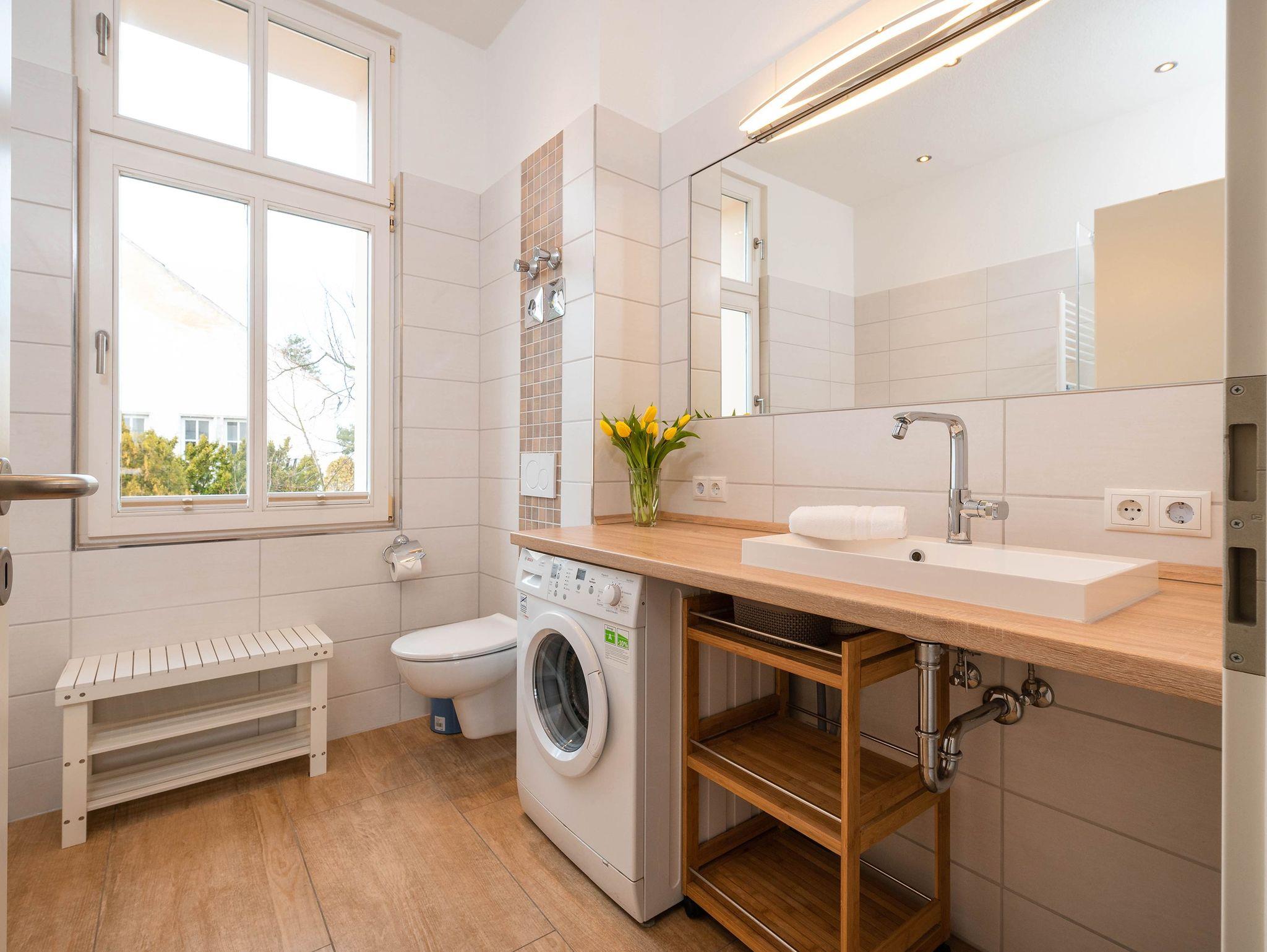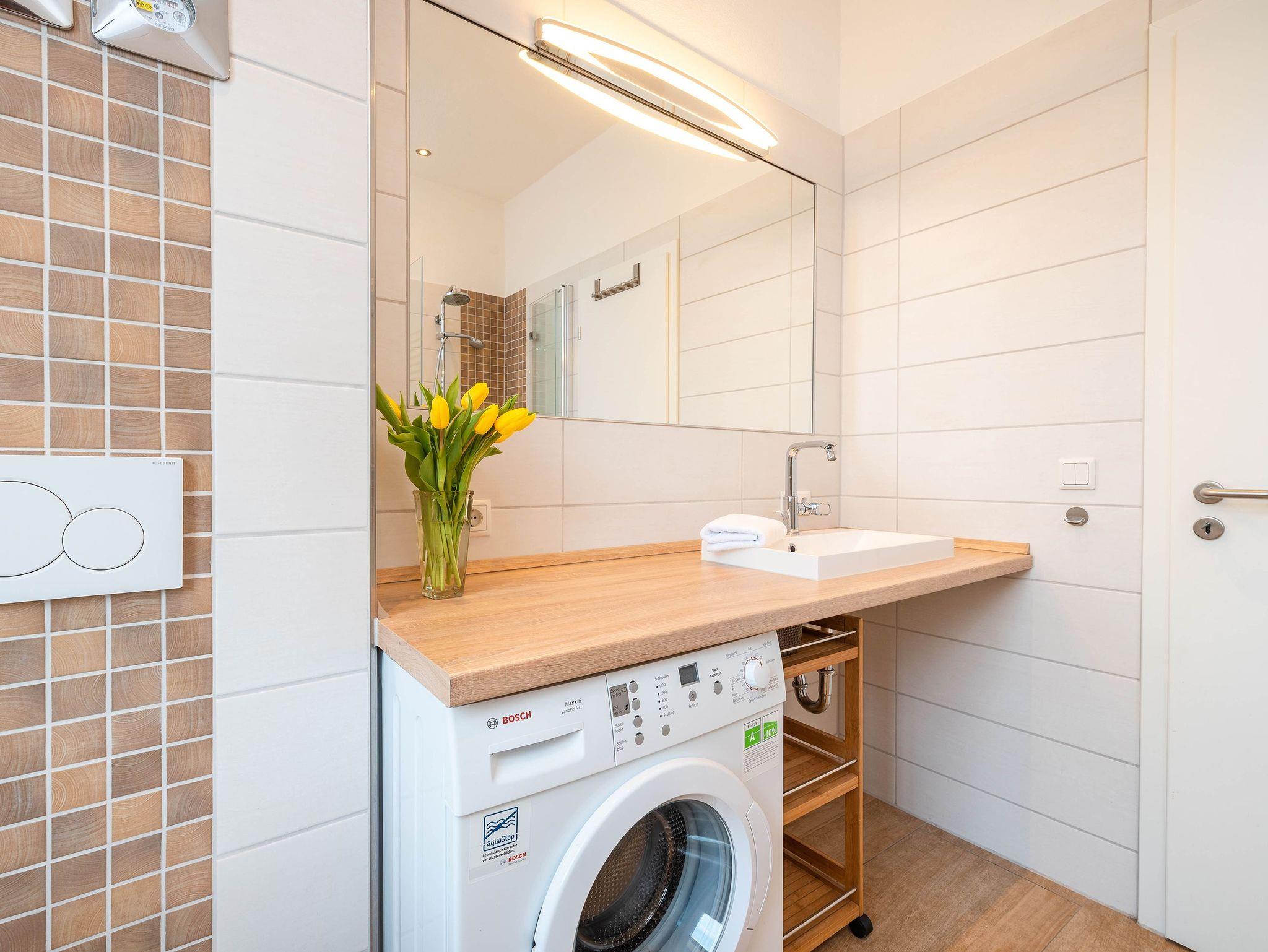 Das geräumige Badezimmer verfügt über eine große Dusche und eine kleine Badewanne und ist zusätzlich mit einer Waschmaschine ausgestattet, was den Aufenthalt auch bei längeren Urlauben komfortabel macht. Der einladende, lichtdurchflutete Flur bietet viel Stauraum für Ihr Gepäck und Strandutensilien.