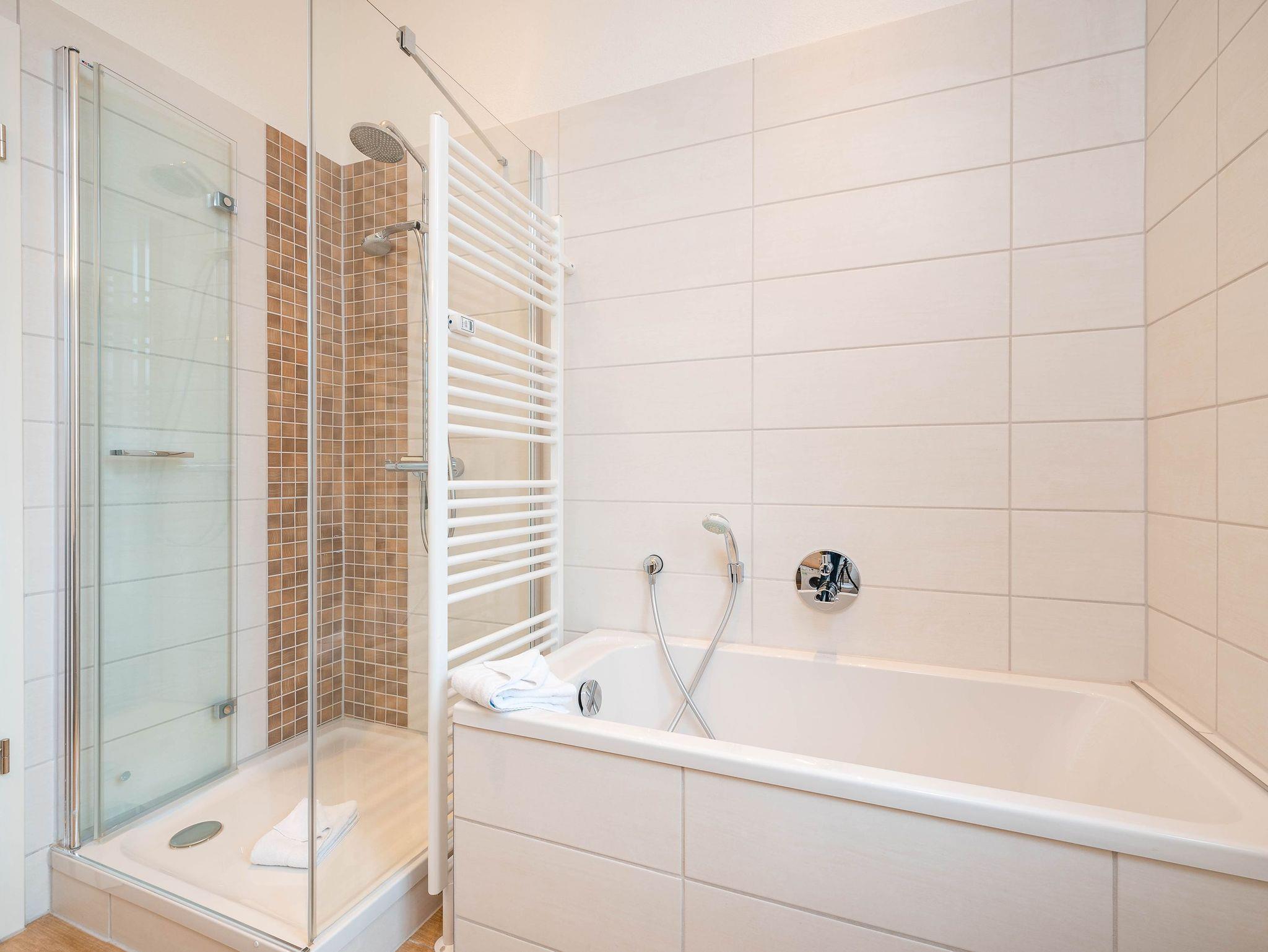 • großes Badezimmer mit Dusche und kleiner Badewanne