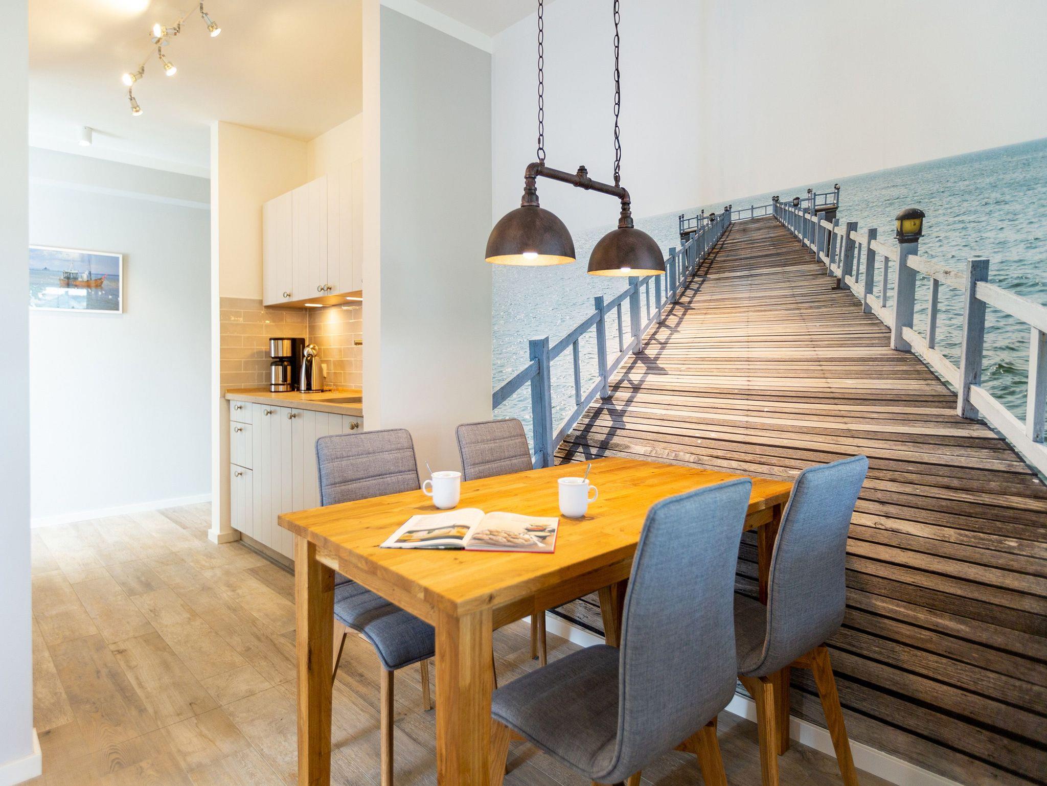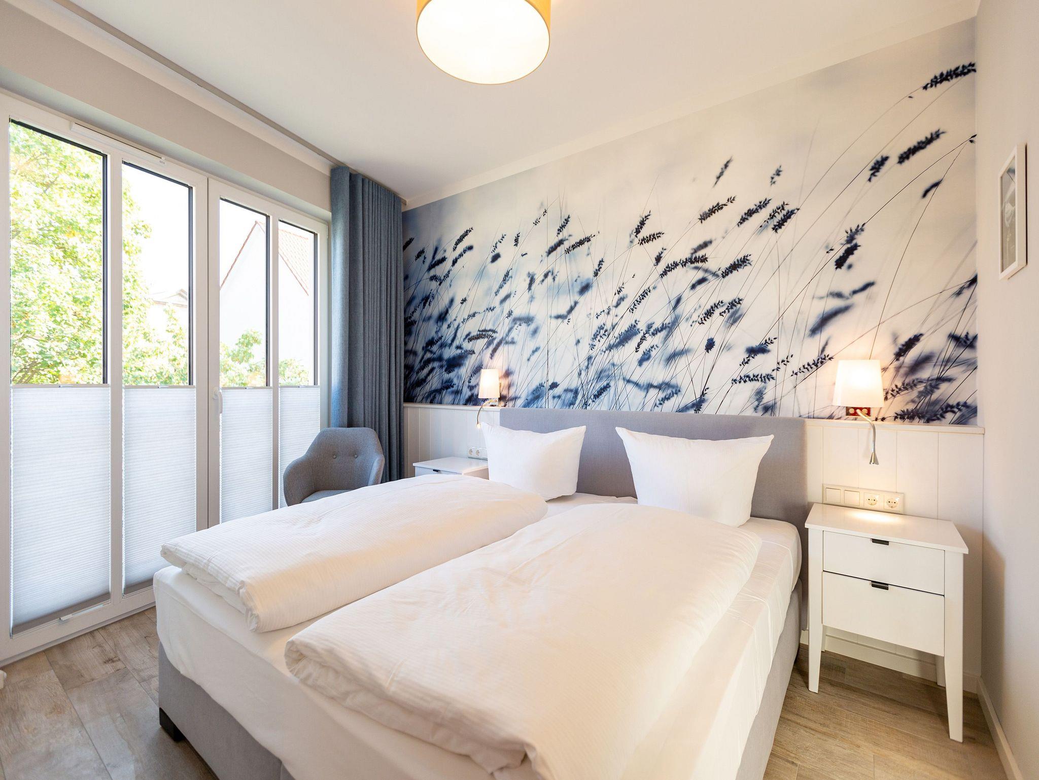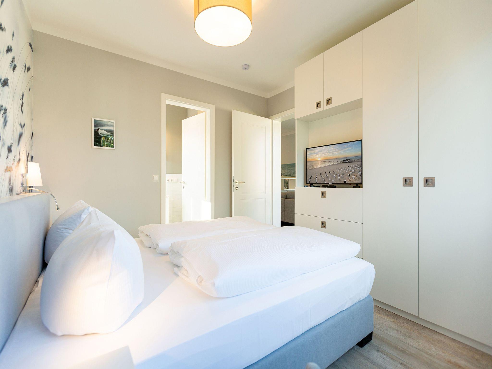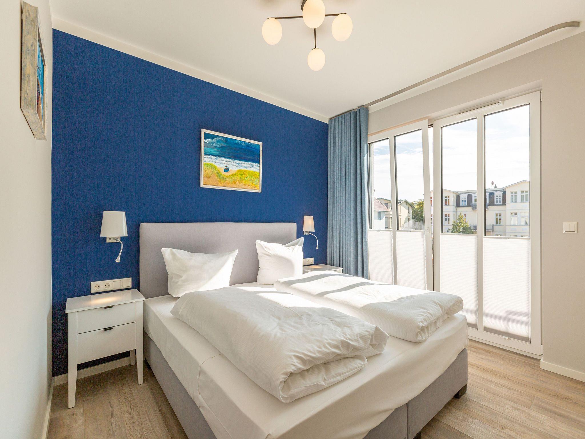 Die Ostsee stand Pate bei dieser wunderschönen Drei-Zimmer-Ferienwohnung im ersten Obergeschoss des Quartier 7. Denn Strand und Meer gibt es nicht nur fast vor der Haustür, sondern verleihen in Farbgestaltung, Bildern und stilvollen Möbeln dem ganzen Interieur ein maritimes Flair. Bis zu vier Personen finden in den 72 Quadratmetern einen Ort zum ausgiebigen Entspannen. Offen und hell ist die gesamte Gestaltung des Appartements. Zwei Balkone ? ein Ost-Balkon (7 Quadratmeter) und ein Süd-Balkon (4 Quadratmeter) ? locken Frischluftfans und Sonnenanbeter nach draußen, es sich auf den Stühlen bequem zu machen. Das großzügige Wohnzimmer wartet mit einer bequemen Sitzlandschaft, einem großen Flat-TV mit Blue-Ray-Player und einem Echtholz-Kamin auf. Fußkalt wird Ihnen in diesem Appartement garantiert nicht. Denn es ist mit einer Fußbodenheizung ausgestattet. Kommt der Appetit, können Sie in der vollausgestatteten Küche allerhand zaubern. Herd, Backofen, Toaster, Kaffeemaschine, Kühlschrank, Geschirrspüler und feines Porzellan ? es ist alles vorhanden. Und wundern Sie sich nicht. Beim Essen sind Sie der Ostsee ganz nah. Genießen Sie das Gefühl, auf einer Seebrücke zu speisen. Denn im Übergang von der offenen Küche ins Wohnzimmer befindet sich ein schöner Essplatz mit Tisch und Stühlen und im Hintergrund ein wunderschönes Seebrückenmotiv. In den zwei Schlafzimmern warten kuschelige Boxspring-Doppelbetten (1,80 m x 2,00 m) darauf, Ihnen einen erholsamen Schlaf zu schenken und Ihre Träume süß und bunt zu färben. Maßangefertigte Einbauschränke bieten Platz für Ihre Garderobe. Beide Zimmer haben einen Flat-TV. Die Wohnung verfügt über zwei moderne Tageslichtbäder mit Dusche und WC. Eines davon besitzt sogar eine finnische Sauna. Für Ihr Auto bieten wir Ihnen in der Tiefgarage den Stellplatz Nummer 11 an. Bei Anreise liegen zudem Handtücher bereit und die Betten sind bezogen. Das WLAN können Sie kostenfrei nutzen.