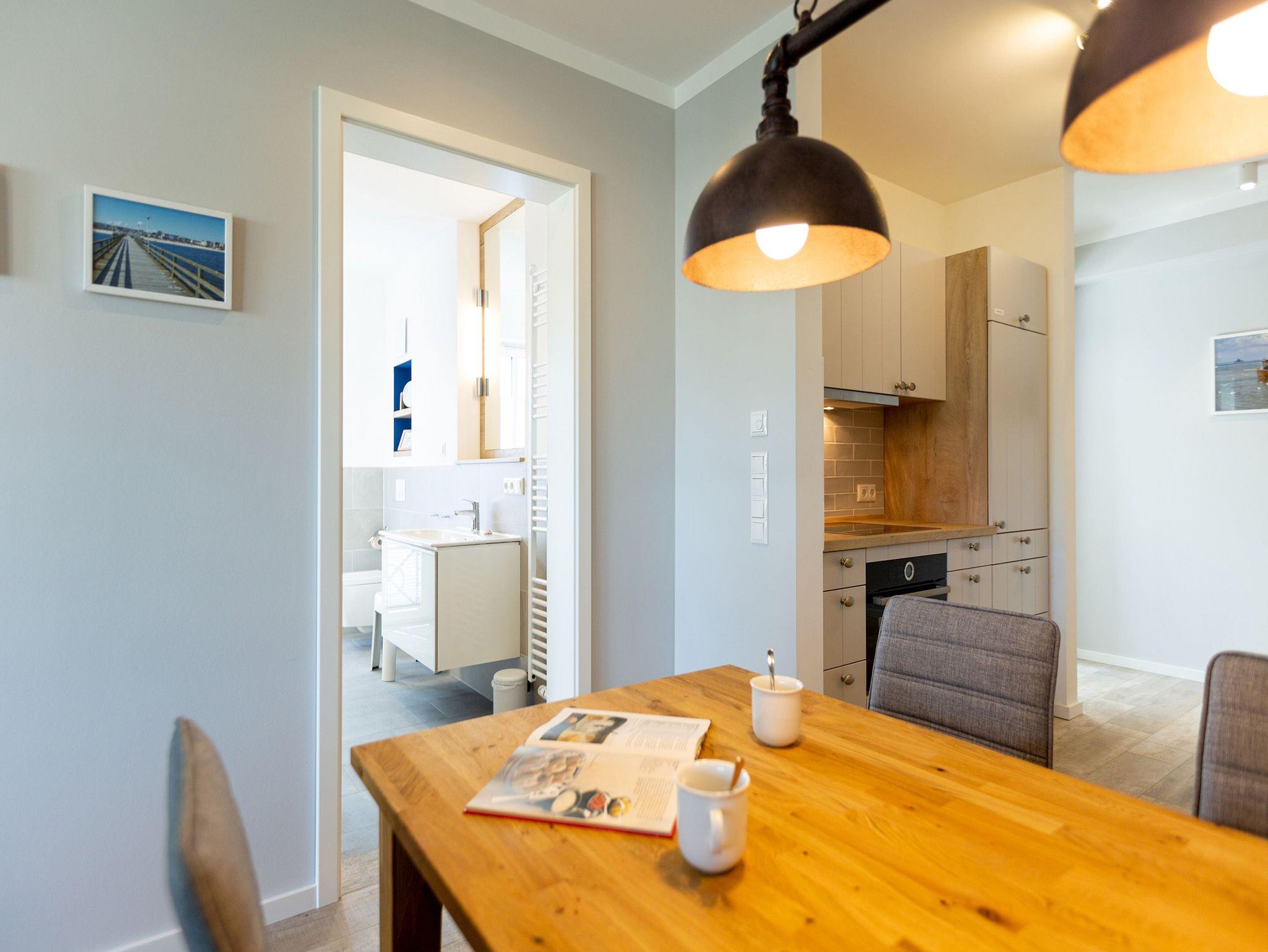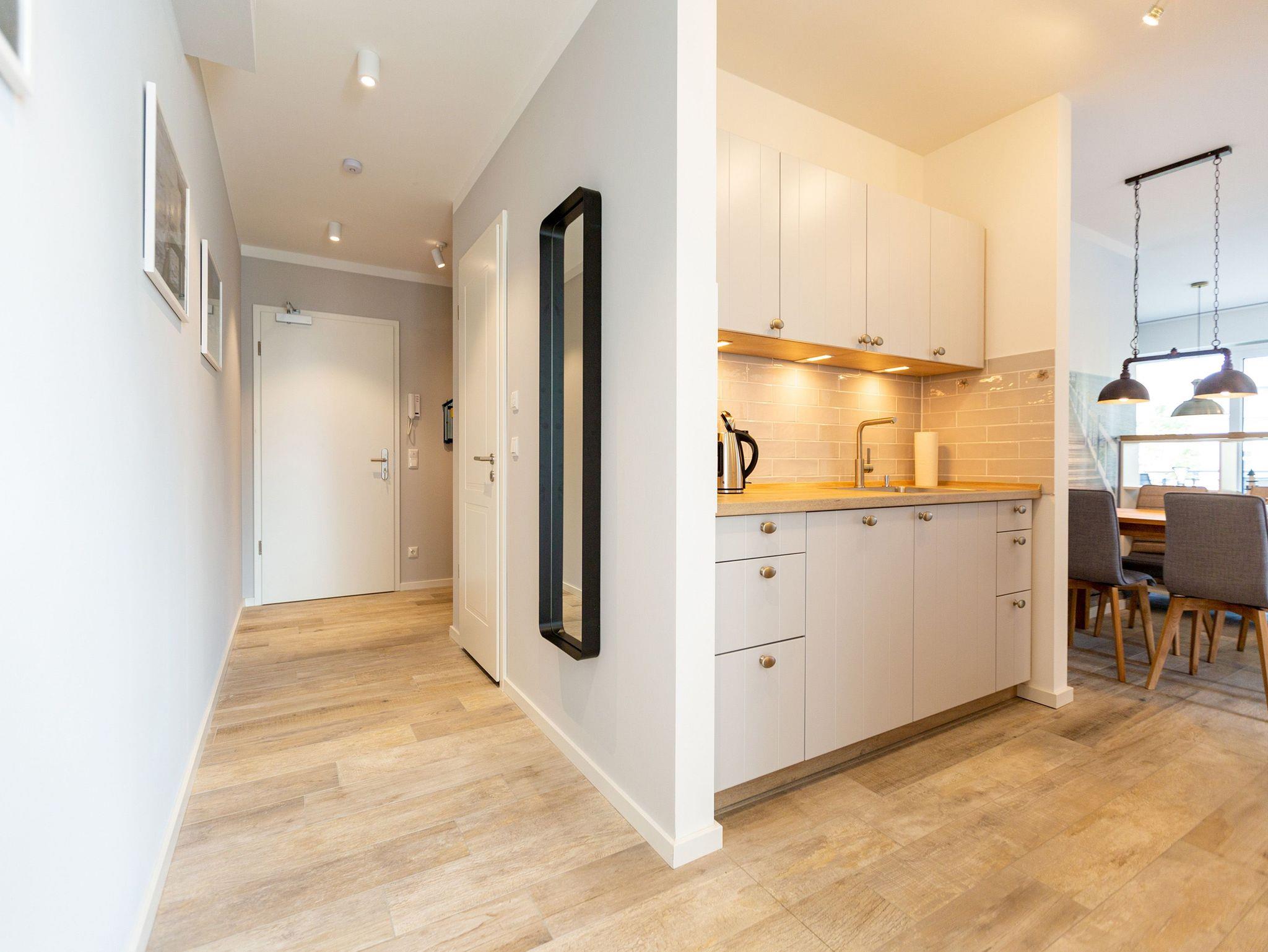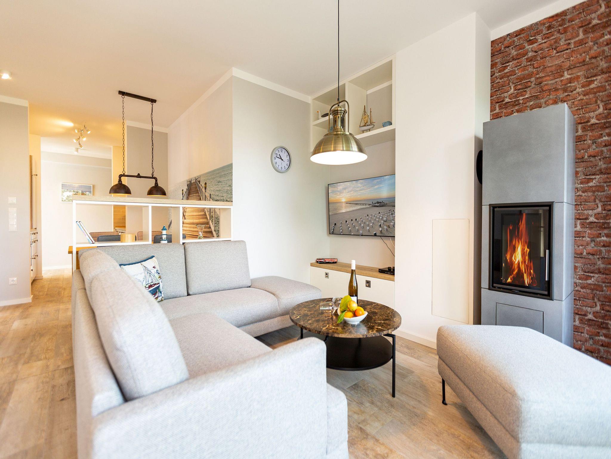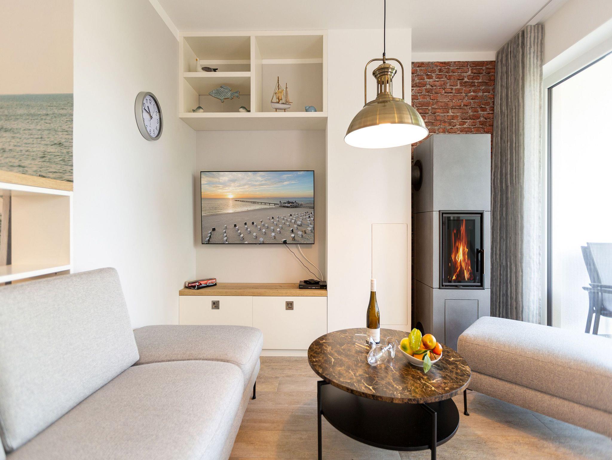 Die Ostsee stand Pate bei dieser wunderschönen Drei-Zimmer-Ferienwohnung im ersten Obergeschoss des Quartier 7. Denn Strand und Meer gibt es nicht nur fast vor der Haustür, sondern verleihen in Farbgestaltung, Bildern und stilvollen Möbeln dem ganzen Interieur ein maritimes Flair. Bis zu vier Personen finden in den 72 Quadratmetern einen Ort zum ausgiebigen Entspannen. Offen und hell ist die gesamte Gestaltung des Appartements. Zwei Balkone ? ein Ost-Balkon (7 Quadratmeter) und ein Süd-Balkon (4 Quadratmeter) ? locken Frischluftfans und Sonnenanbeter nach draußen, es sich auf den Stühlen bequem zu machen. Das großzügige Wohnzimmer wartet mit einer bequemen Sitzlandschaft, einem großen Flat-TV mit Blue-Ray-Player und einem Echtholz-Kamin auf. Fußkalt wird Ihnen in diesem Appartement garantiert nicht. Denn es ist mit einer Fußbodenheizung ausgestattet. Kommt der Appetit, können Sie in der vollausgestatteten Küche allerhand zaubern. Herd, Backofen, Toaster, Kaffeemaschine, Kühlschrank, Geschirrspüler und feines Porzellan ? es ist alles vorhanden. Und wundern Sie sich nicht. Beim Essen sind Sie der Ostsee ganz nah. Genießen Sie das Gefühl, auf einer Seebrücke zu speisen. Denn im Übergang von der offenen Küche ins Wohnzimmer befindet sich ein schöner Essplatz mit Tisch und Stühlen und im Hintergrund ein wunderschönes Seebrückenmotiv. In den zwei Schlafzimmern warten kuschelige Boxspring-Doppelbetten (1,80 m x 2,00 m) darauf, Ihnen einen erholsamen Schlaf zu schenken und Ihre Träume süß und bunt zu färben. Maßangefertigte Einbauschränke bieten Platz für Ihre Garderobe. Beide Zimmer haben einen Flat-TV. Die Wohnung verfügt über zwei moderne Tageslichtbäder mit Dusche und WC. Eines davon besitzt sogar eine finnische Sauna. Für Ihr Auto bieten wir Ihnen in der Tiefgarage den Stellplatz Nummer 11 an. Bei Anreise liegen zudem Handtücher bereit und die Betten sind bezogen. Das WLAN können Sie kostenfrei nutzen.