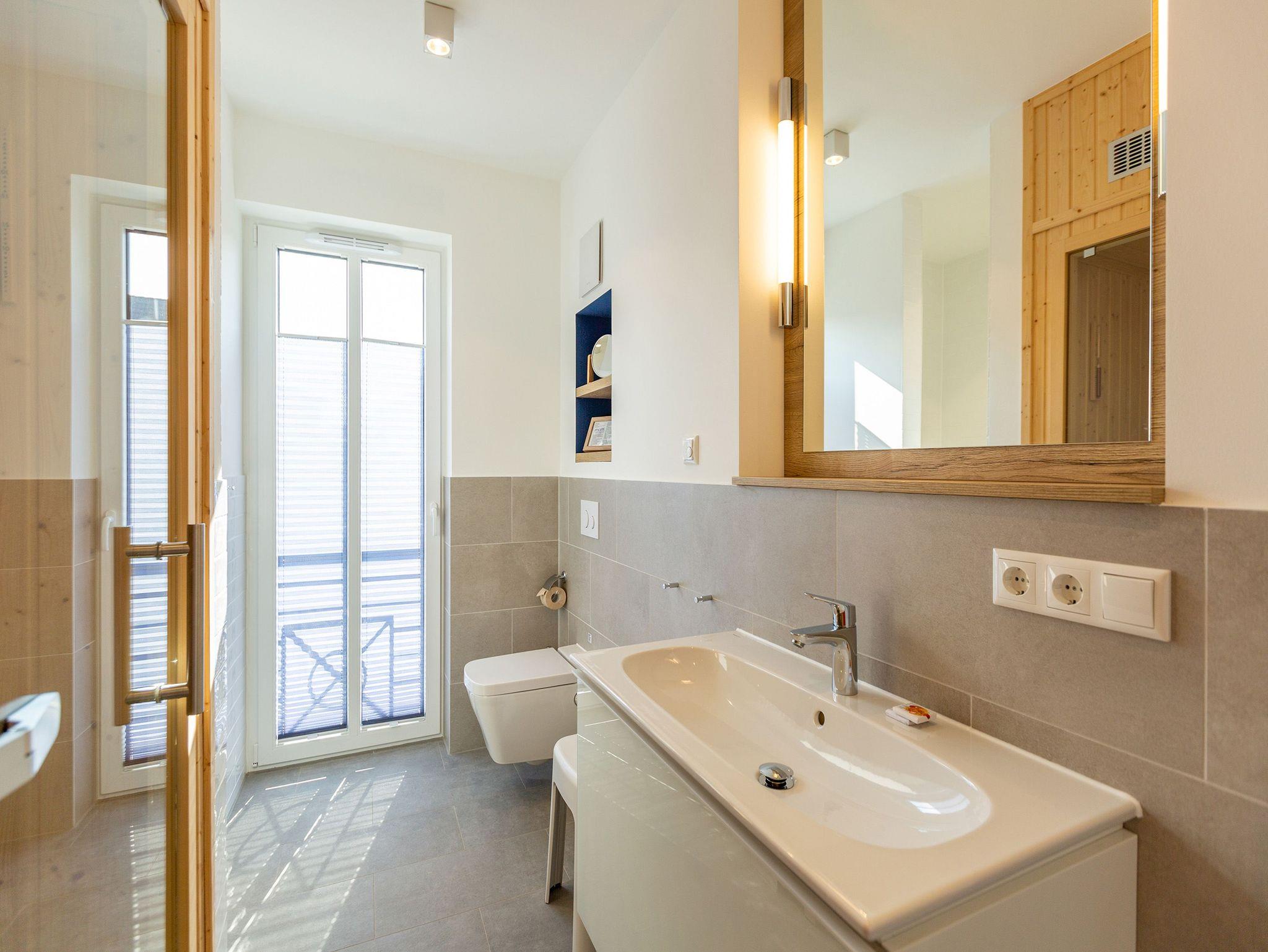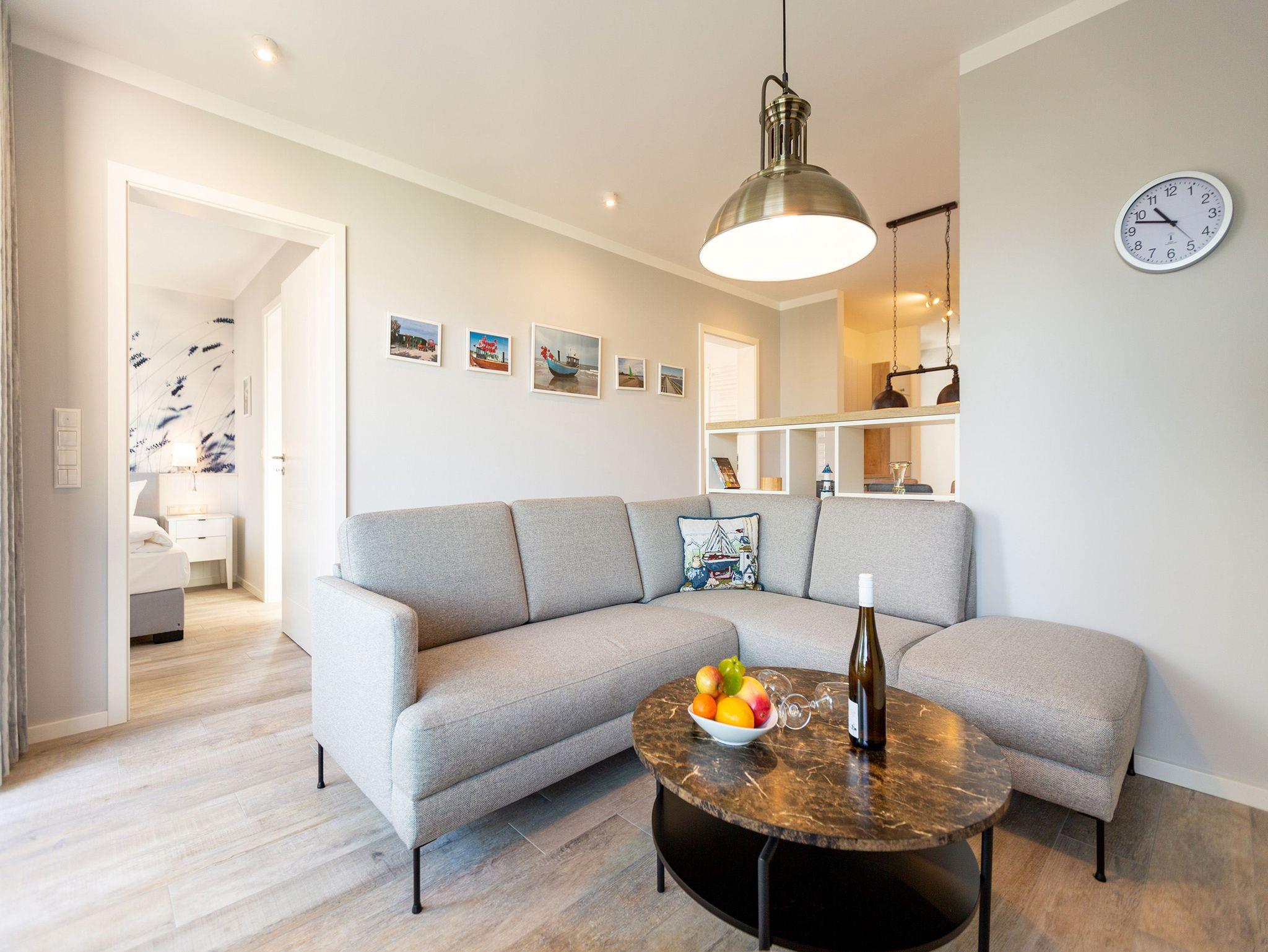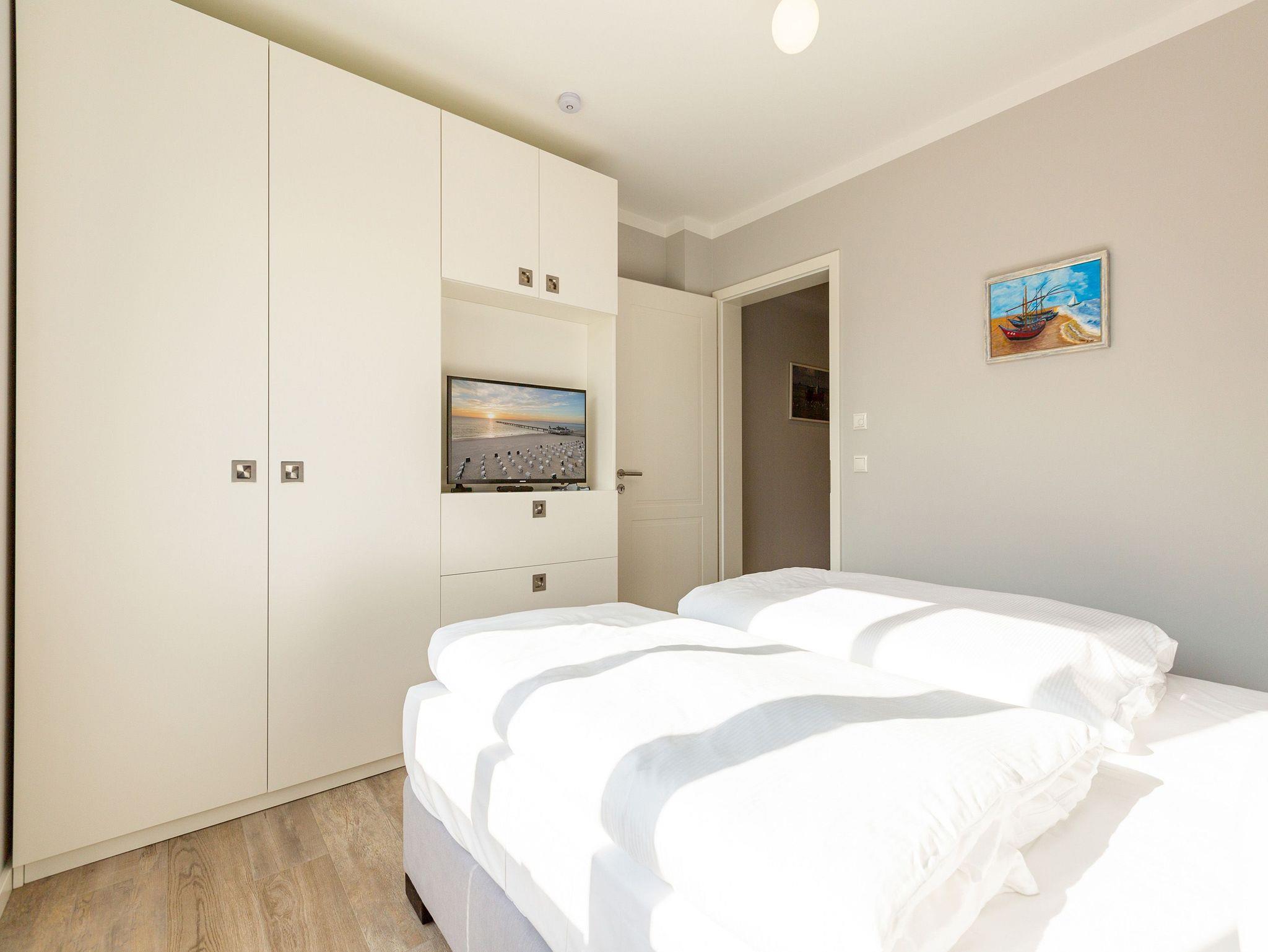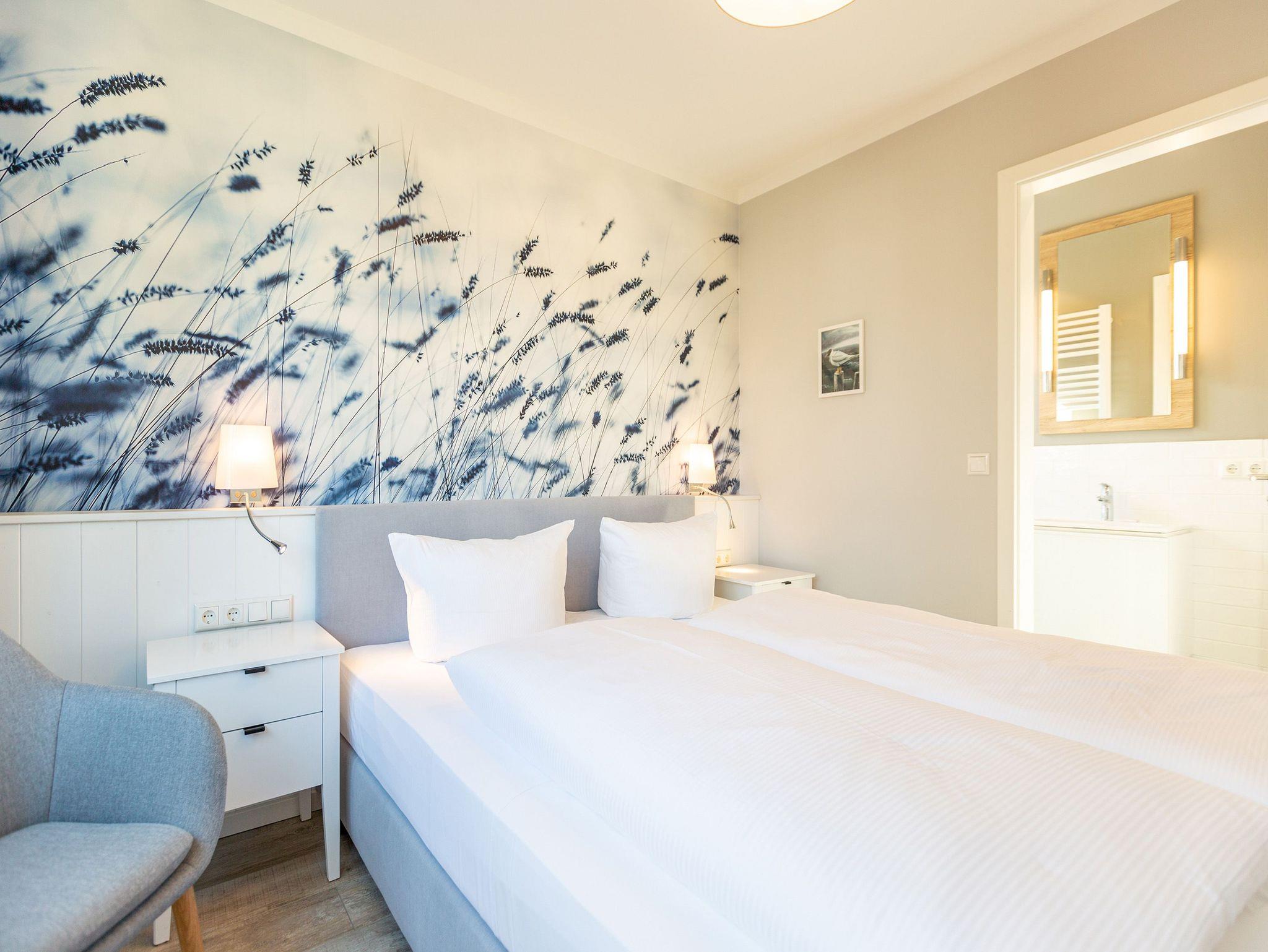 Die Ostsee stand Pate bei dieser wunderschönen Drei-Zimmer-Ferienwohnung im ersten Obergeschoss des Quartier 7. Denn Strand und Meer gibt es nicht nur fast vor der Haustür, sondern verleihen in Farbgestaltung, Bildern und stilvollen Möbeln dem ganzen Interieur ein maritimes Flair. Bis zu vier Personen finden in den 72 Quadratmetern einen Ort zum ausgiebigen Entspannen. Offen und hell ist die gesamte Gestaltung des Appartements. Zwei Balkone ? ein Ost-Balkon (7 Quadratmeter) und ein Süd-Balkon (4 Quadratmeter) ? locken Frischluftfans und Sonnenanbeter nach draußen, es sich auf den Stühlen bequem zu machen. Das großzügige Wohnzimmer wartet mit einer bequemen Sitzlandschaft, einem großen Flat-TV mit Blue-Ray-Player und einem Echtholz-Kamin auf. Fußkalt wird Ihnen in diesem Appartement garantiert nicht. Denn es ist mit einer Fußbodenheizung ausgestattet. Kommt der Appetit, können Sie in der vollausgestatteten Küche allerhand zaubern. Herd, Backofen, Toaster, Kaffeemaschine, Kühlschrank, Geschirrspüler und feines Porzellan ? es ist alles vorhanden. Und wundern Sie sich nicht. Beim Essen sind Sie der Ostsee ganz nah. Genießen Sie das Gefühl, auf einer Seebrücke zu speisen. Denn im Übergang von der offenen Küche ins Wohnzimmer befindet sich ein schöner Essplatz mit Tisch und Stühlen und im Hintergrund ein wunderschönes Seebrückenmotiv. In den zwei Schlafzimmern warten kuschelige Boxspring-Doppelbetten (1,80 m x 2,00 m) darauf, Ihnen einen erholsamen Schlaf zu schenken und Ihre Träume süß und bunt zu färben. Maßangefertigte Einbauschränke bieten Platz für Ihre Garderobe. Beide Zimmer haben einen Flat-TV. Die Wohnung verfügt über zwei moderne Tageslichtbäder mit Dusche und WC. Eines davon besitzt sogar eine finnische Sauna. Für Ihr Auto bieten wir Ihnen in der Tiefgarage den Stellplatz Nummer 11 an. Bei Anreise liegen zudem Handtücher bereit und die Betten sind bezogen. Das WLAN können Sie kostenfrei nutzen.