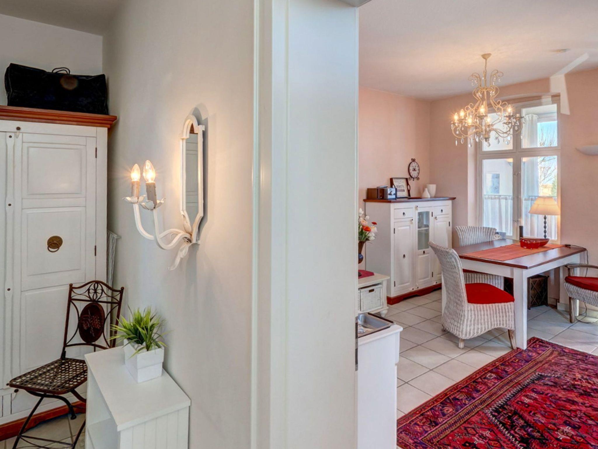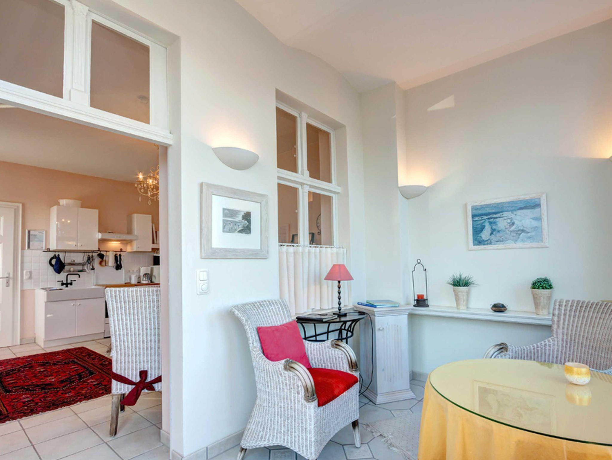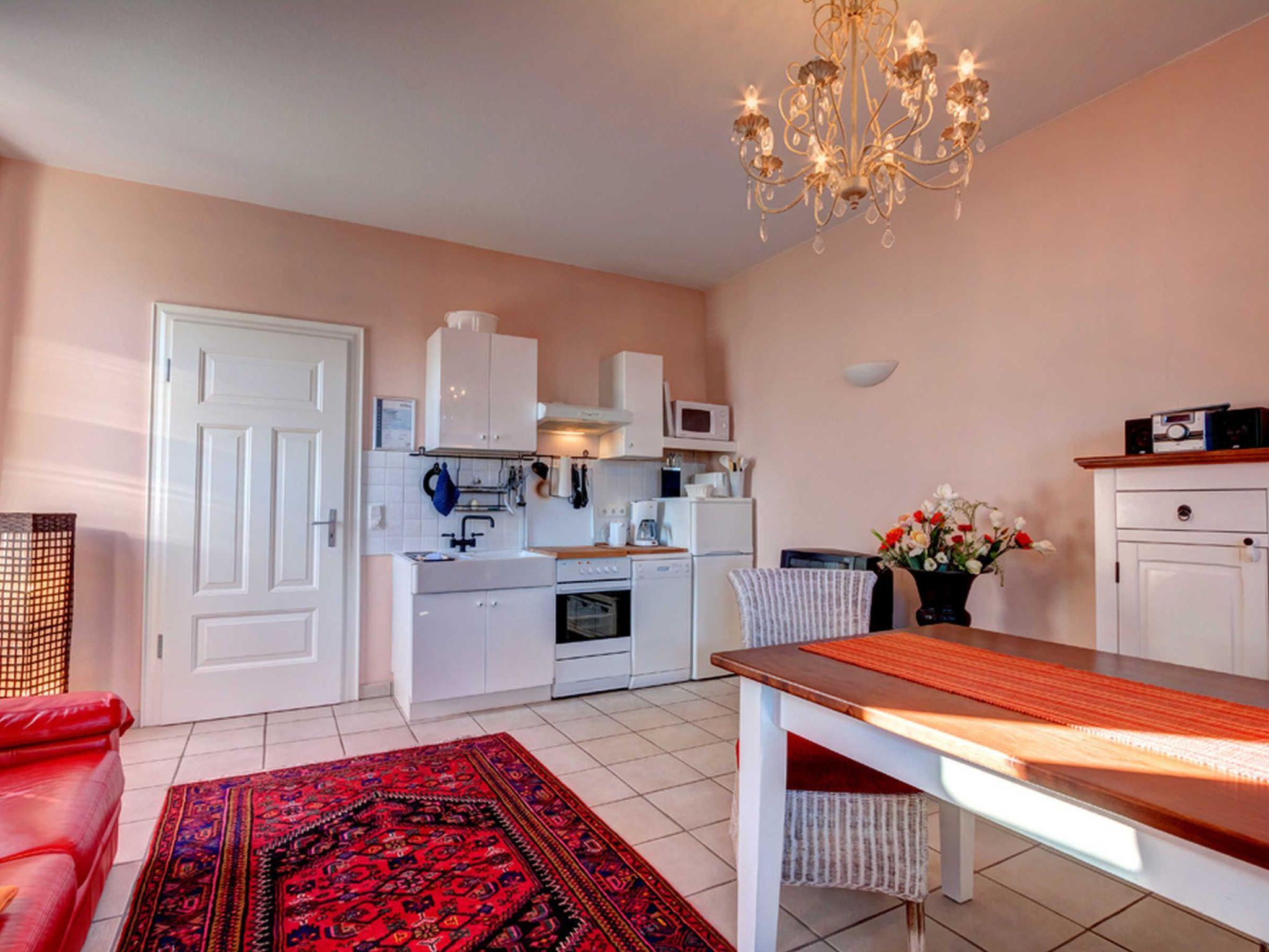 Willkommen in dieser modernen, hellen 2-Raum-Nichtraucher-Ferienwohnung im Erdgeschoss einer sanierten Villa im weißen Landhausstil. Die Wohnküche ist mit einer Couch, einem Tisch und vier Stühlen ausgestattet und bietet Unterhaltung durch einen Flachbild-TV, ein Radio mit CD-Player und einen DVD-Player.