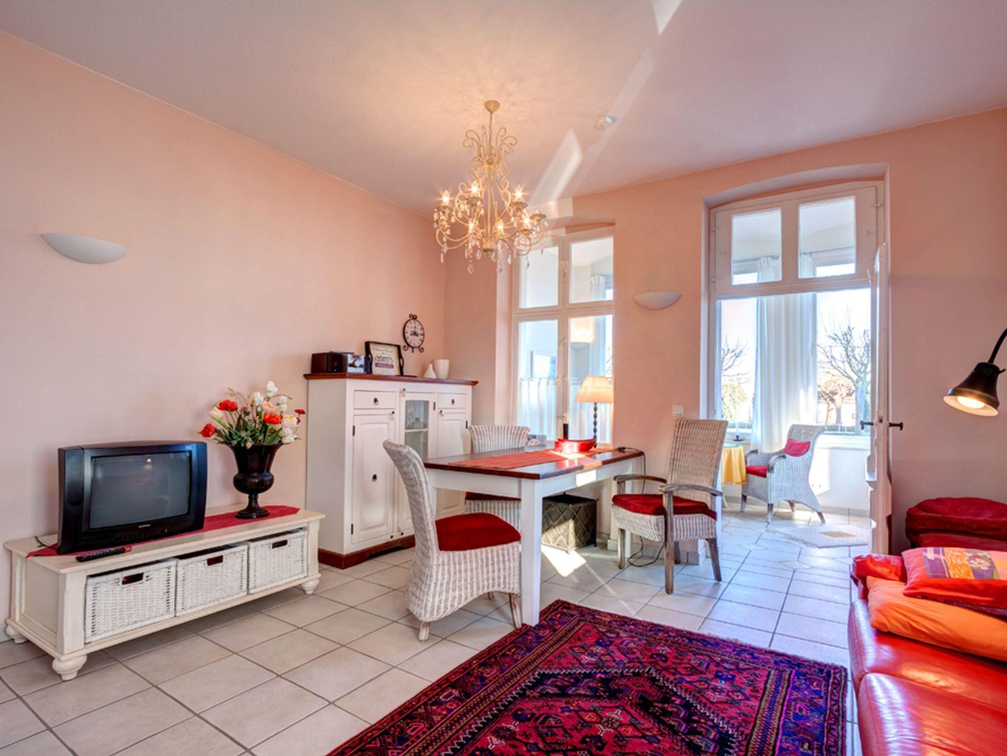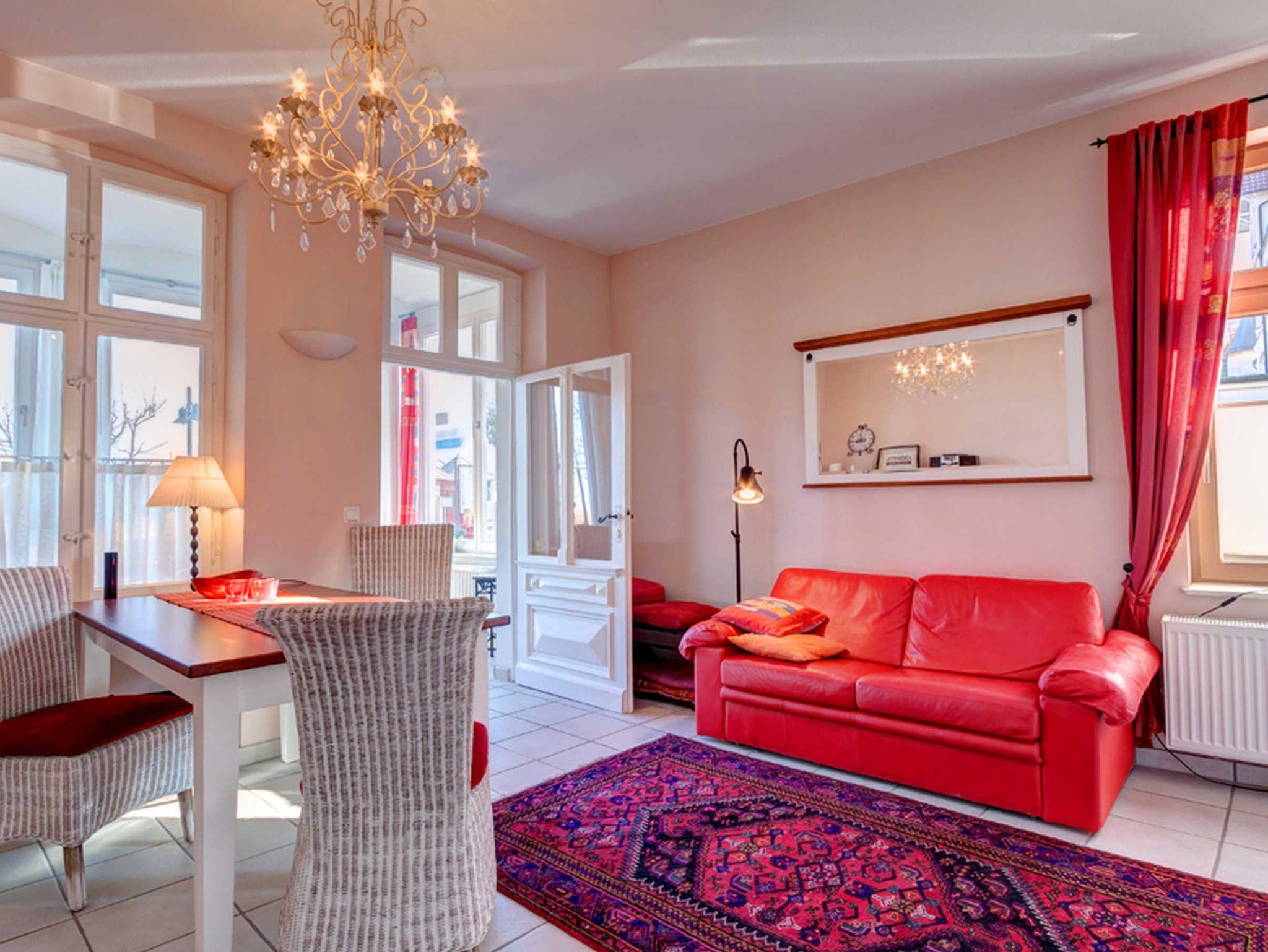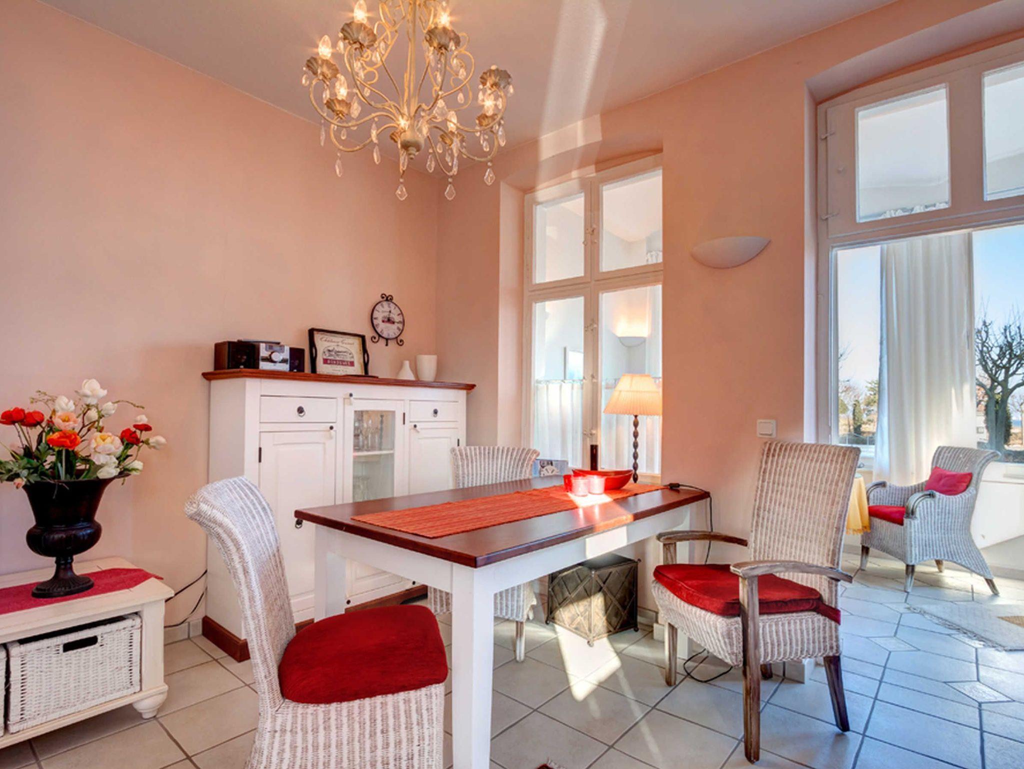 Willkommen in dieser modernen, hellen 2-Raum-Nichtraucher-Ferienwohnung im Erdgeschoss einer sanierten Villa im weißen Landhausstil. Die Wohnküche ist mit einer Couch, einem Tisch und vier Stühlen ausgestattet und bietet Unterhaltung durch einen Flachbild-TV, ein Radio mit CD-Player und einen DVD-Player.