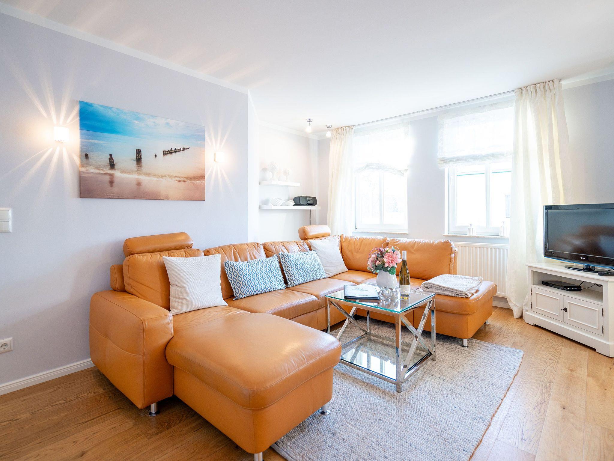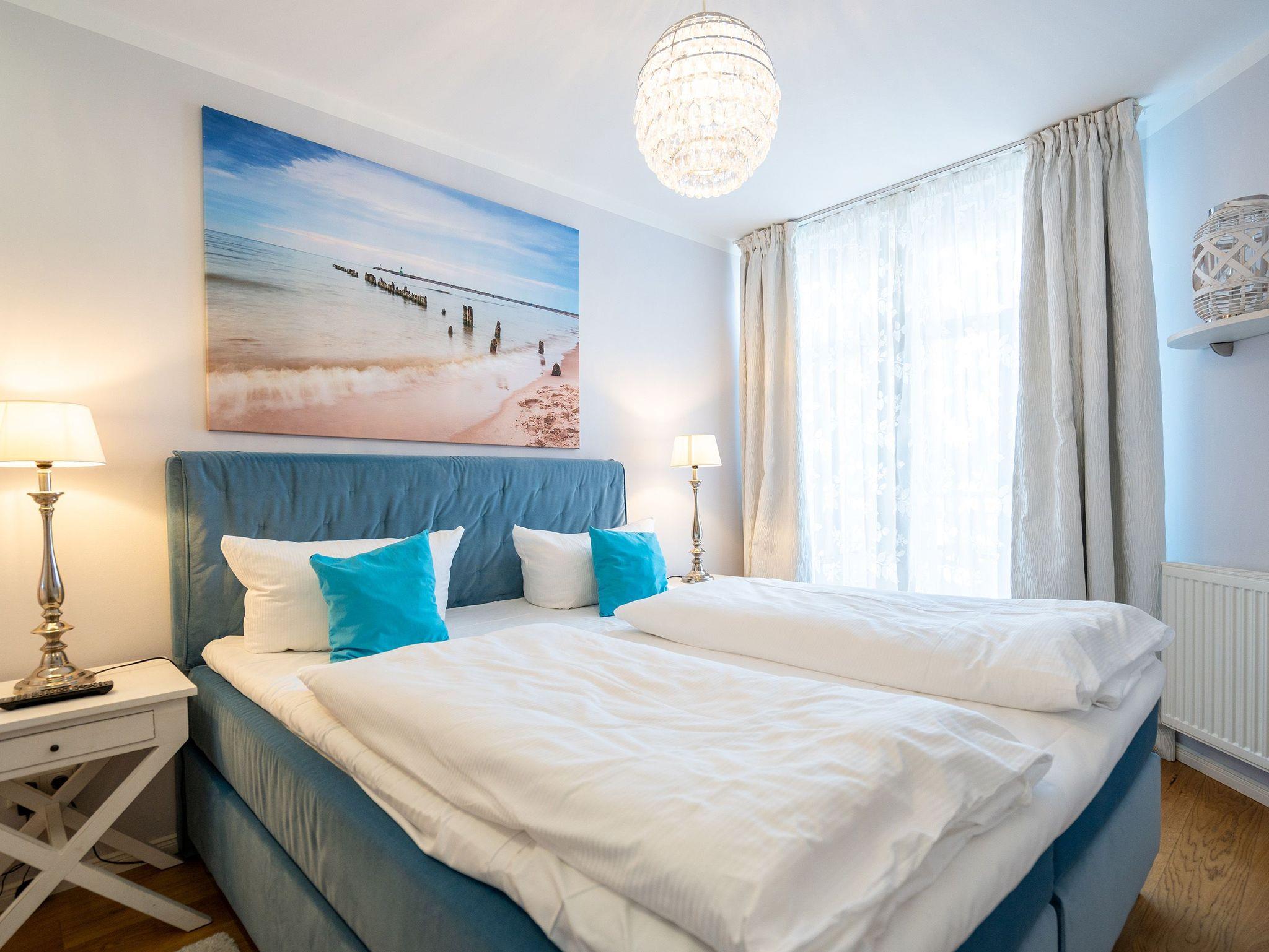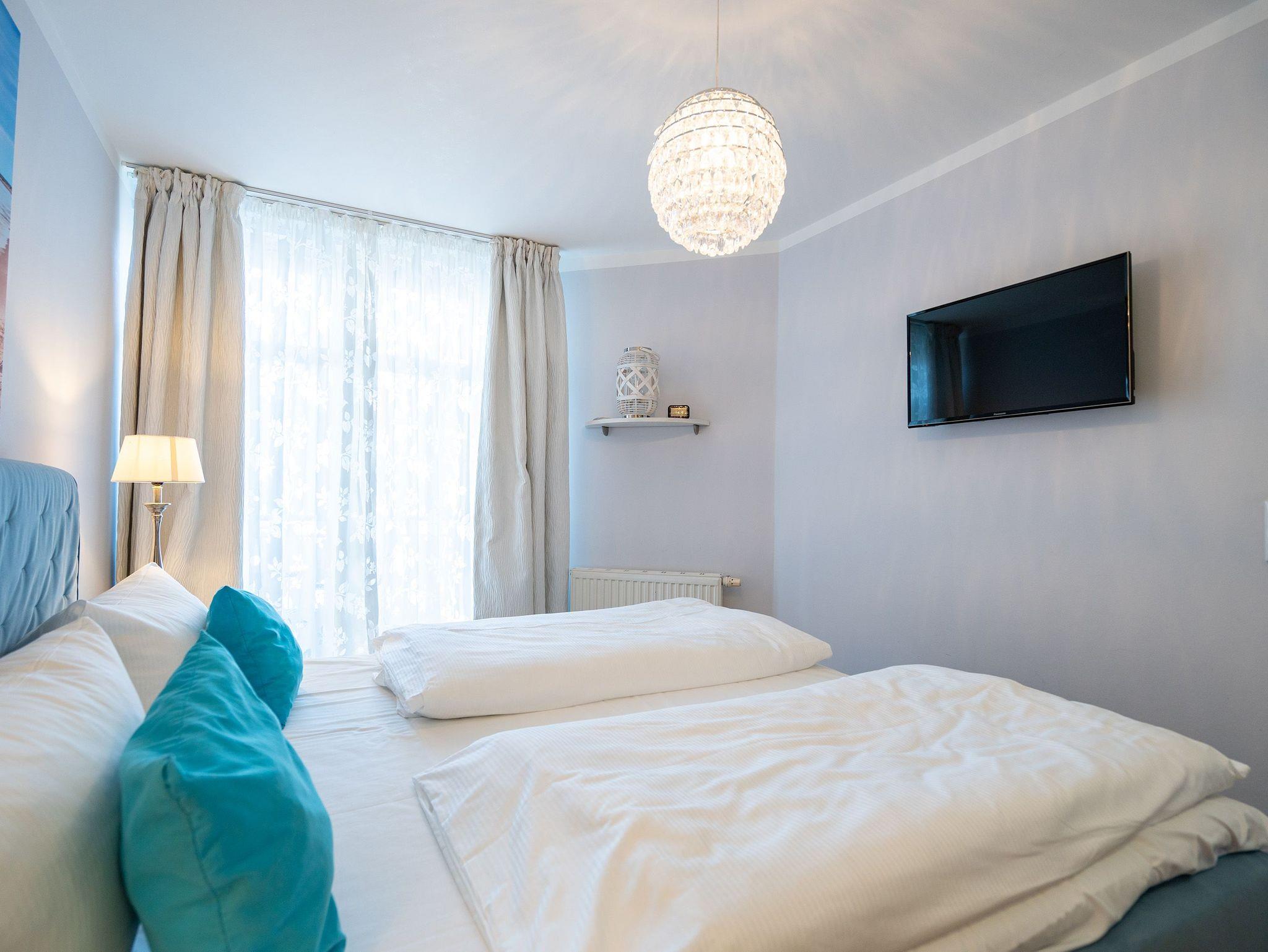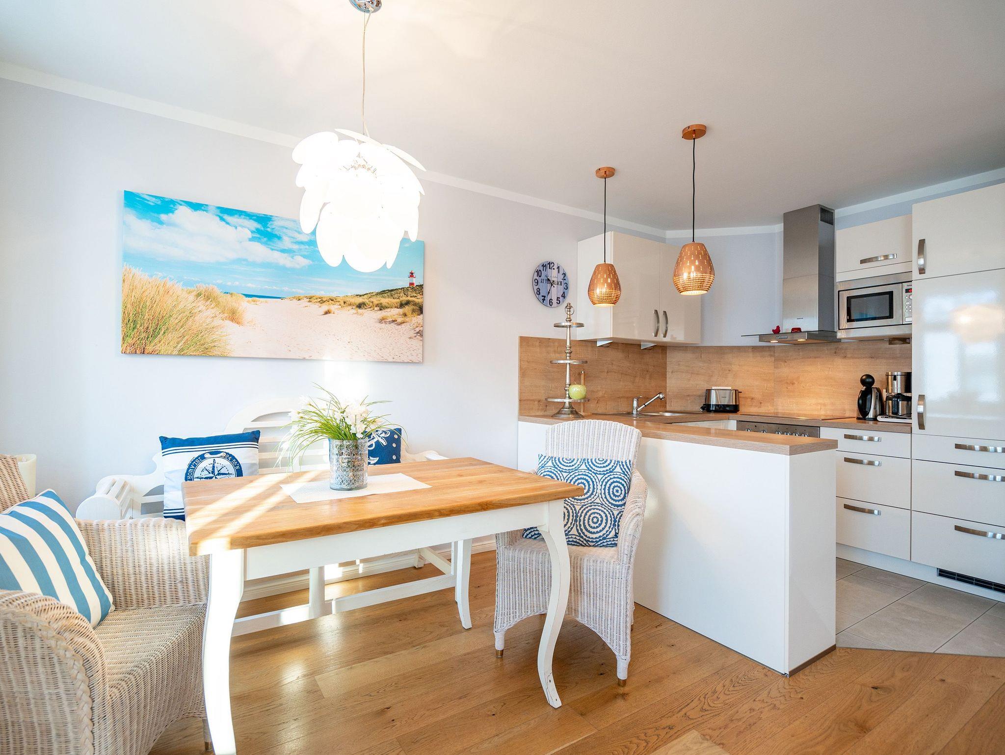 Eintreten und wohlfühlen! Dieses 2-Raumappartement (50 qm) im 1. Obergeschoss bietet für 2 Personen und ein 1 Kind (als Aufbettung auf der bequemen Schlafcouch im Wohnbereich) ein ideales Urlaubsdomizil. Liebevoll gestaltet und sehr wertig eingerichtet, sorgen abgestimmte Stoffe, Farben und Dekorationen für die richtige Urlaubsatmosphäre. Schon beim Eintreten offeriert sich durch die Glastür der schöne Wohnbereich. Eine großzügige Sitzgruppe lädt zum Relaxen vor dem Flat Smart TV ein. Neben der komplett ausgestatteten Küchenzeile lädt der liebevoll arrangierte Essplatz zum Verweilen ein. Erholung garantiert das Schlafzimmer, das mit komfortablen Doppelboxspringbett mit Talalay-Latex-Topper, wertigen großen Schiebeschrank und Flat-Smart-TV ausgestattet ist. Ein besonderes Highlight ist ein Sternenhimmel, den ein österreichischer Künstler an die Zimmerdecke gemalt hat. Tagsüber ist er nicht zu sehen, aber nachts, wenn sich Ihre Augen an die Dunkelheit gewöhnt haben, entfaltet er seine ganze dezente Pracht. Von hier hat man Zugang zum kleinen Südbalkon. Ein modernes Bad mit Dusche ergänzt das Appartement. Für Ihren Komfort sind die Betten bei Ihrer Anreise bezogen und die Erstausstattung Wäsche steht für Sie bereit. Das WLAN-Netz ist kostenfrei nutzbar.