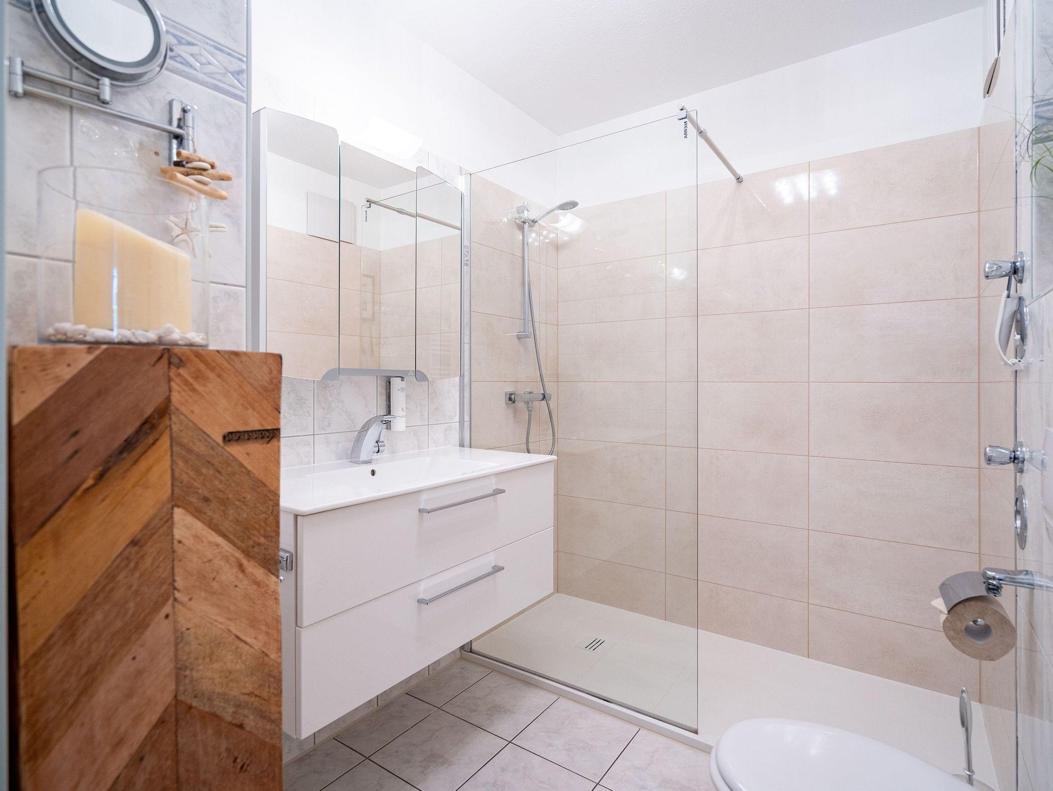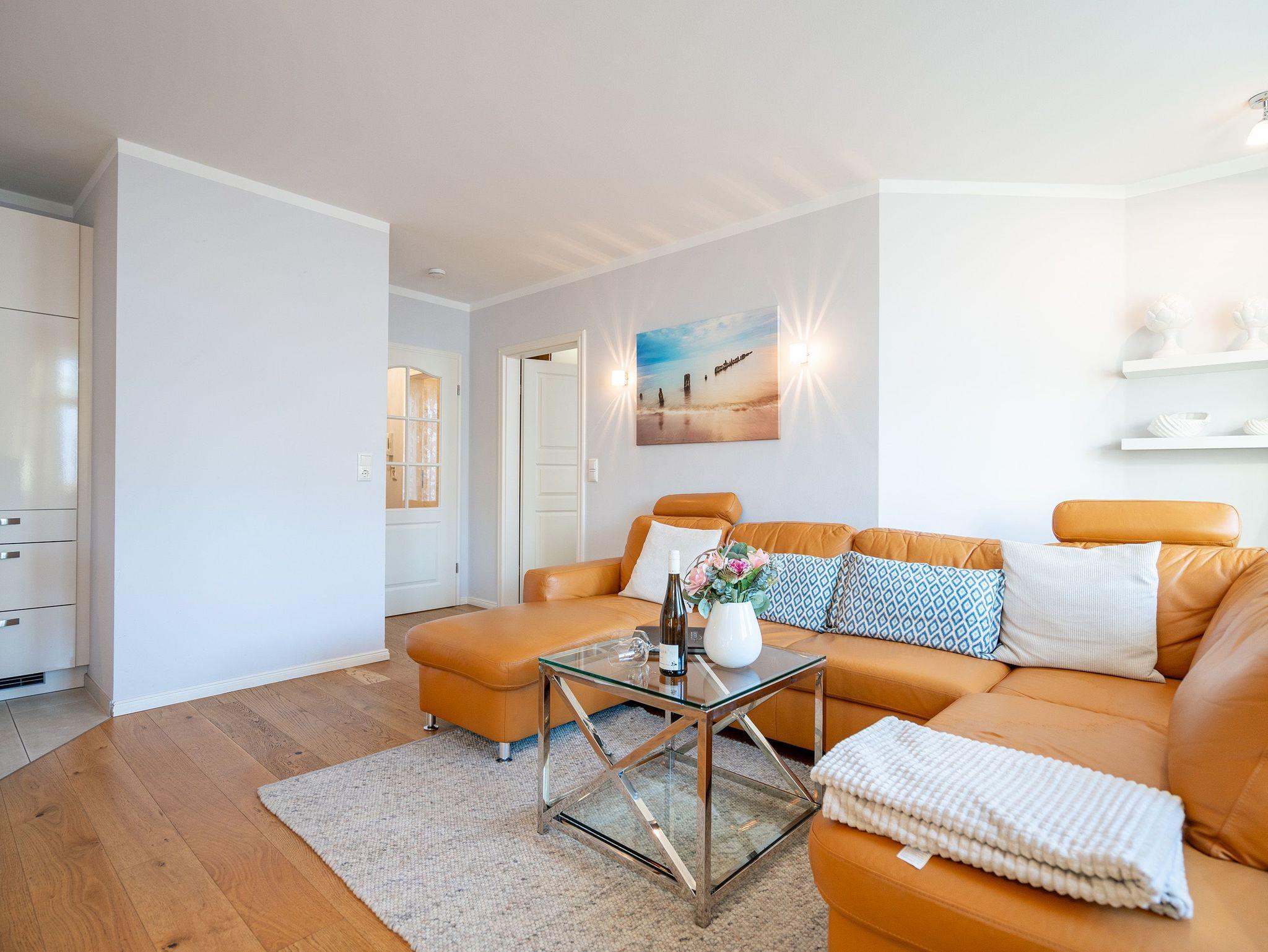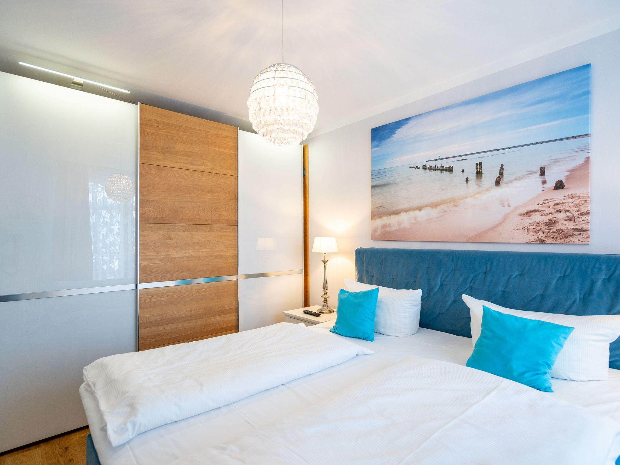 Eintreten und wohlfühlen! Dieses 2-Raumappartement (50 qm) im 1. Obergeschoss bietet für 2 Personen und ein 1 Kind (als Aufbettung auf der bequemen Schlafcouch im Wohnbereich) ein ideales Urlaubsdomizil. Liebevoll gestaltet und sehr wertig eingerichtet, sorgen abgestimmte Stoffe, Farben und Dekorationen für die richtige Urlaubsatmosphäre. Schon beim Eintreten offeriert sich durch die Glastür der schöne Wohnbereich. Eine großzügige Sitzgruppe lädt zum Relaxen vor dem Flat Smart TV ein. Neben der komplett ausgestatteten Küchenzeile lädt der liebevoll arrangierte Essplatz zum Verweilen ein. Erholung garantiert das Schlafzimmer, das mit komfortablen Doppelboxspringbett mit Talalay-Latex-Topper, wertigen großen Schiebeschrank und Flat-Smart-TV ausgestattet ist. Ein besonderes Highlight ist ein Sternenhimmel, den ein österreichischer Künstler an die Zimmerdecke gemalt hat. Tagsüber ist er nicht zu sehen, aber nachts, wenn sich Ihre Augen an die Dunkelheit gewöhnt haben, entfaltet er seine ganze dezente Pracht. Von hier hat man Zugang zum kleinen Südbalkon. Ein modernes Bad mit Dusche ergänzt das Appartement. Für Ihren Komfort sind die Betten bei Ihrer Anreise bezogen und die Erstausstattung Wäsche steht für Sie bereit. Das WLAN-Netz ist kostenfrei nutzbar.