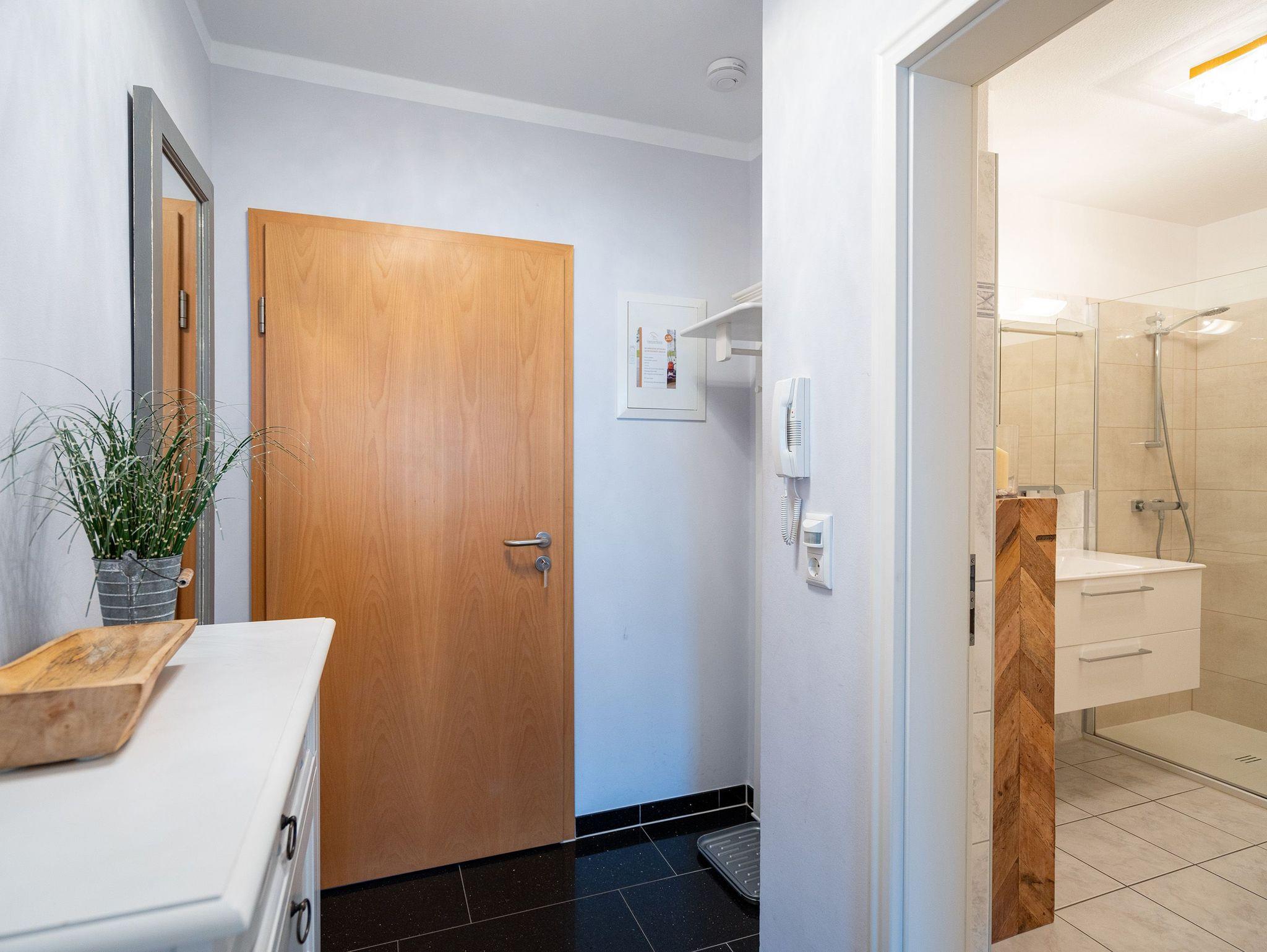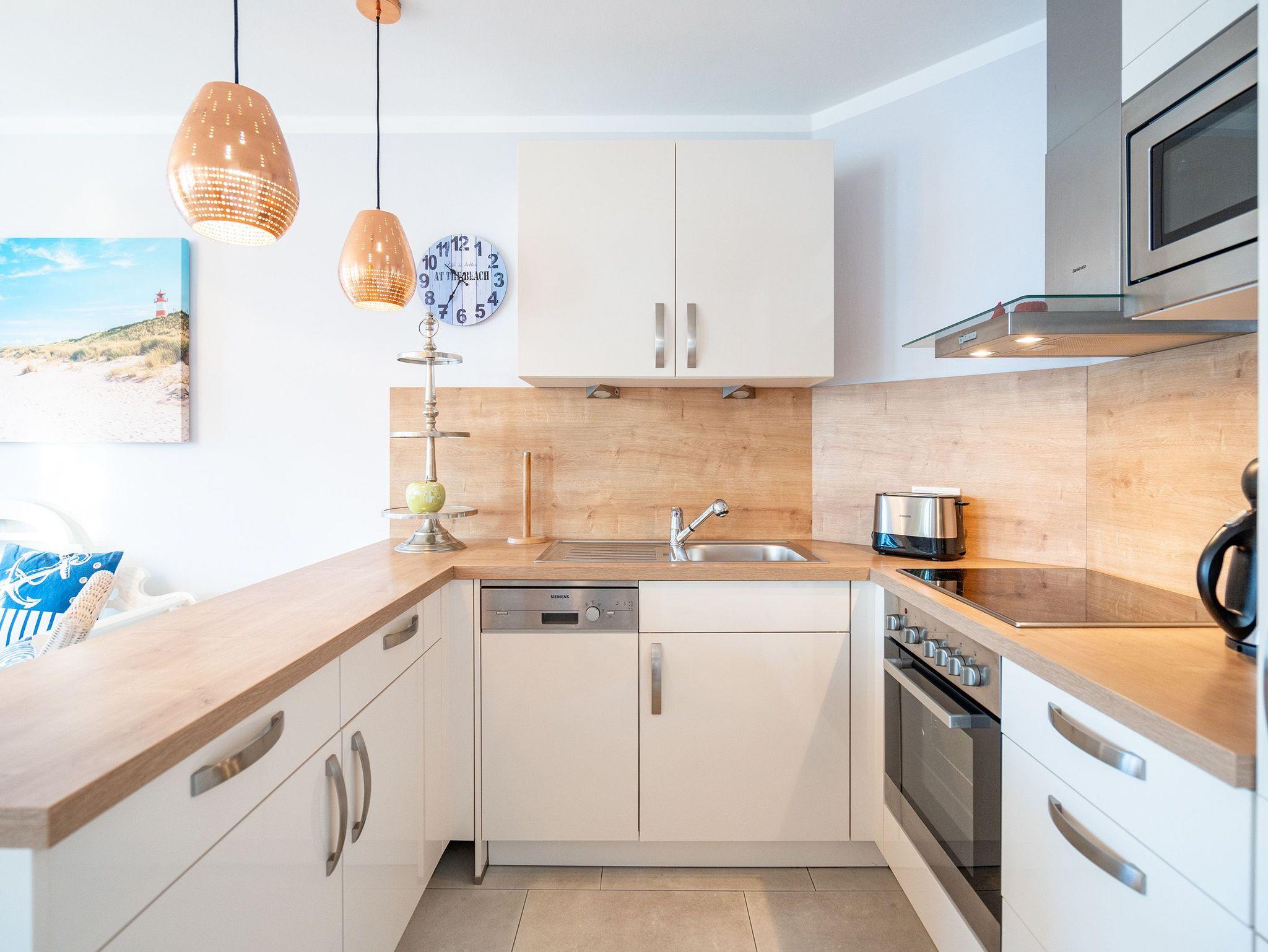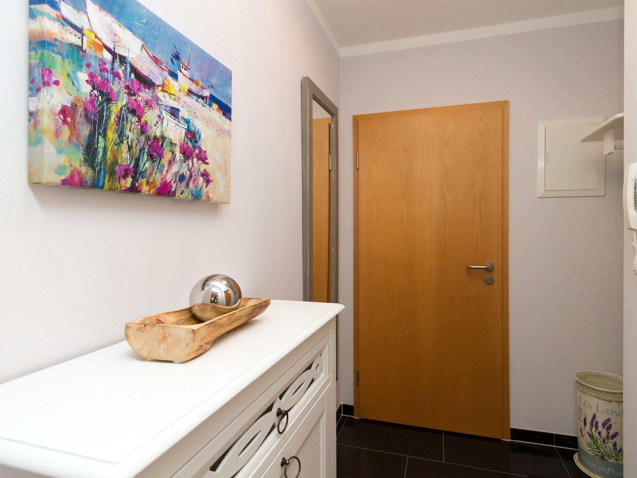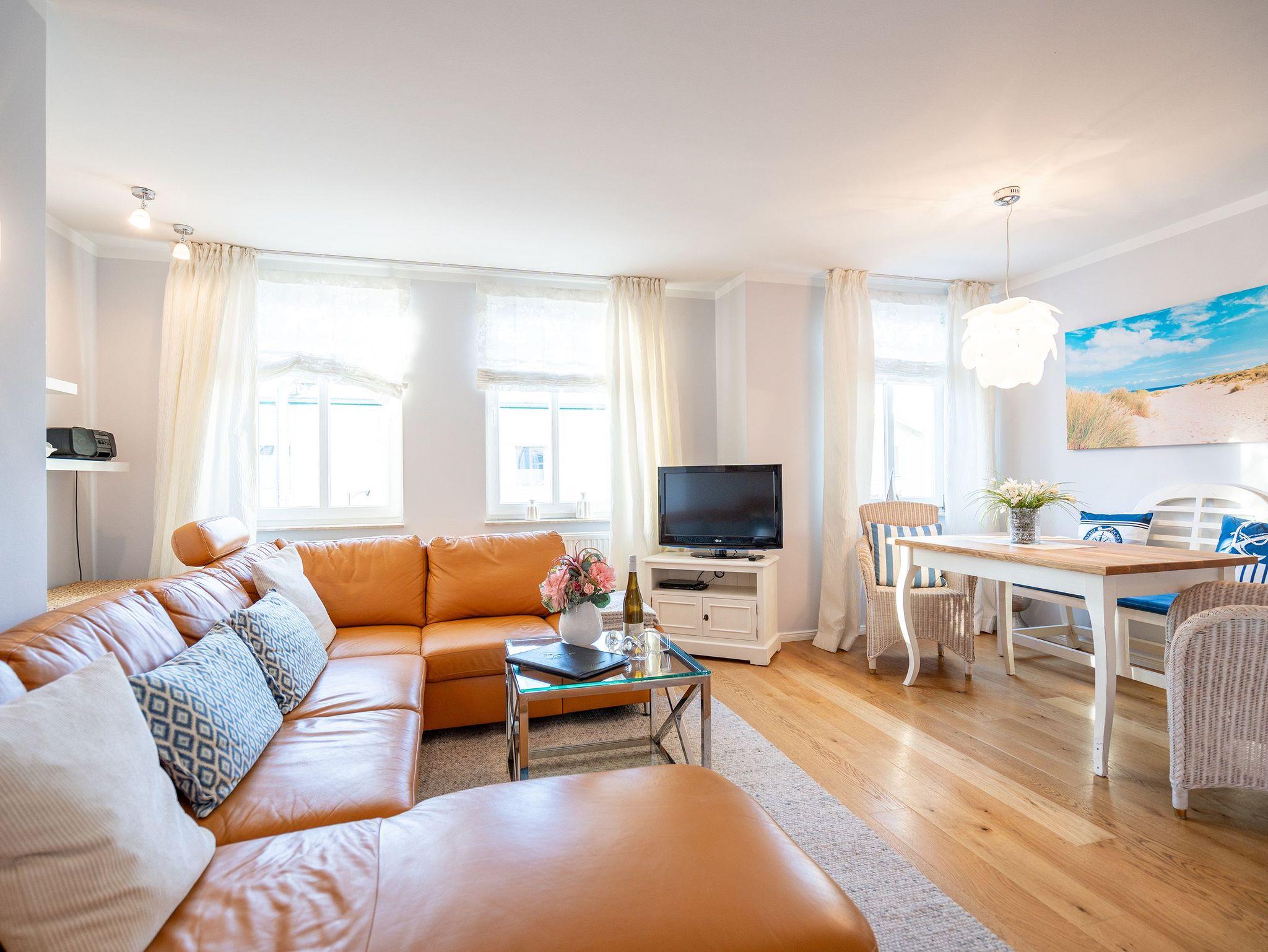 Eintreten und wohlfühlen! Dieses 2-Raumappartement (50 qm) im 1. Obergeschoss bietet für 2 Personen und ein 1 Kind (als Aufbettung auf der bequemen Schlafcouch im Wohnbereich) ein ideales Urlaubsdomizil. Liebevoll gestaltet und sehr wertig eingerichtet, sorgen abgestimmte Stoffe, Farben und Dekorationen für die richtige Urlaubsatmosphäre. Schon beim Eintreten offeriert sich durch die Glastür der schöne Wohnbereich. Eine großzügige Sitzgruppe lädt zum Relaxen vor dem Flat Smart TV ein. Neben der komplett ausgestatteten Küchenzeile lädt der liebevoll arrangierte Essplatz zum Verweilen ein. Erholung garantiert das Schlafzimmer, das mit komfortablen Doppelboxspringbett mit Talalay-Latex-Topper, wertigen großen Schiebeschrank und Flat-Smart-TV ausgestattet ist. Ein besonderes Highlight ist ein Sternenhimmel, den ein österreichischer Künstler an die Zimmerdecke gemalt hat. Tagsüber ist er nicht zu sehen, aber nachts, wenn sich Ihre Augen an die Dunkelheit gewöhnt haben, entfaltet er seine ganze dezente Pracht. Von hier hat man Zugang zum kleinen Südbalkon. Ein modernes Bad mit Dusche ergänzt das Appartement. Für Ihren Komfort sind die Betten bei Ihrer Anreise bezogen und die Erstausstattung Wäsche steht für Sie bereit. Das WLAN-Netz ist kostenfrei nutzbar.