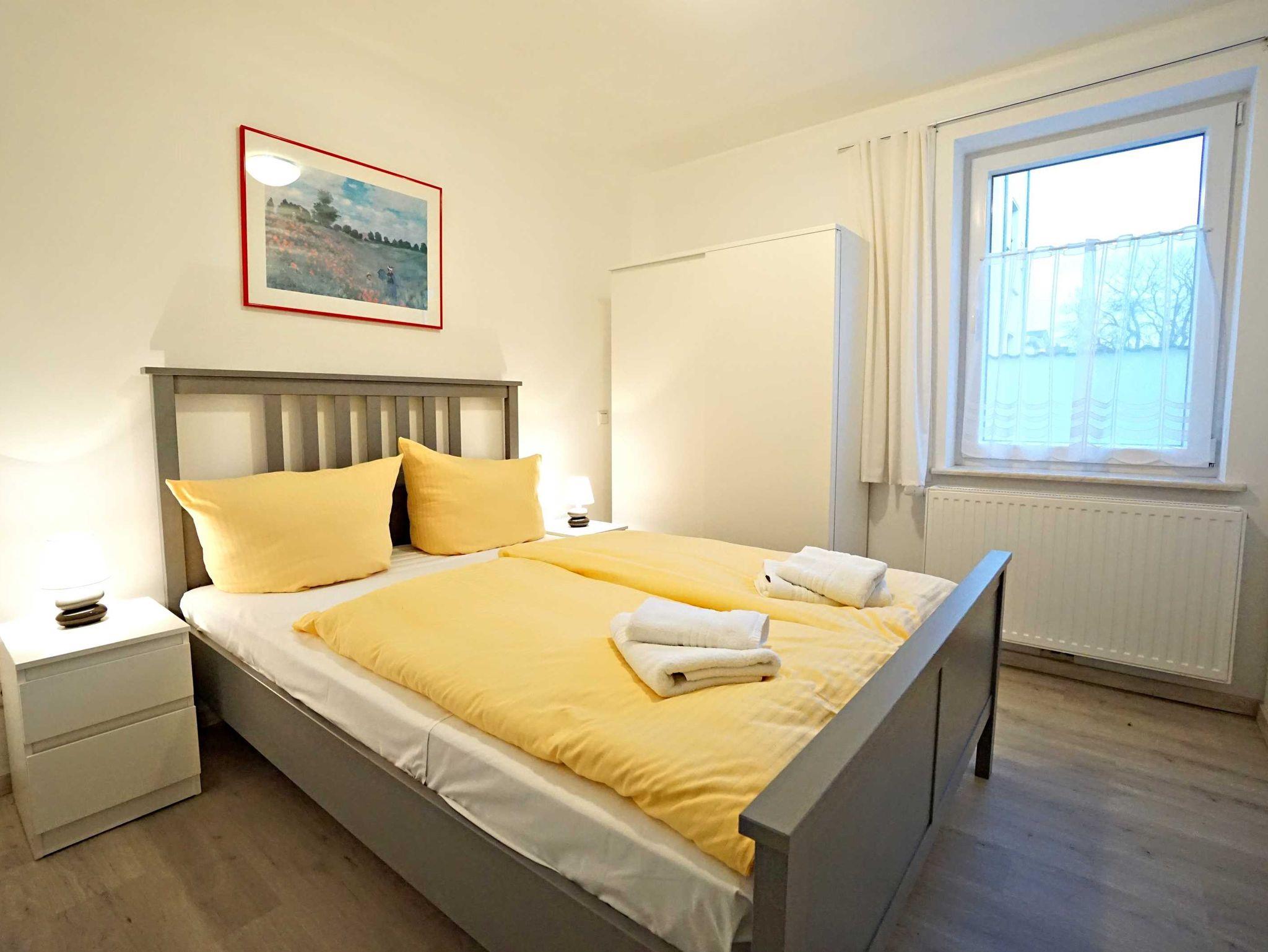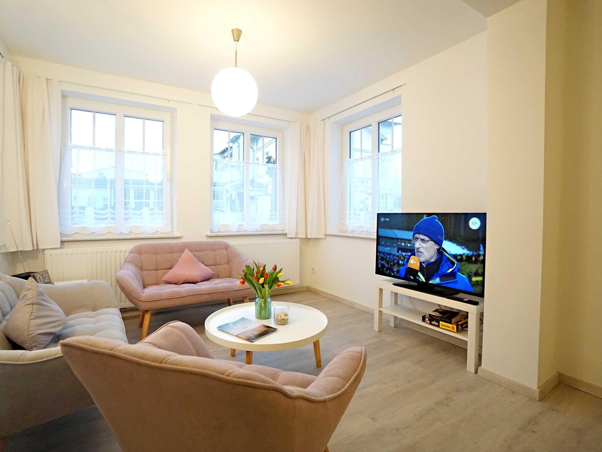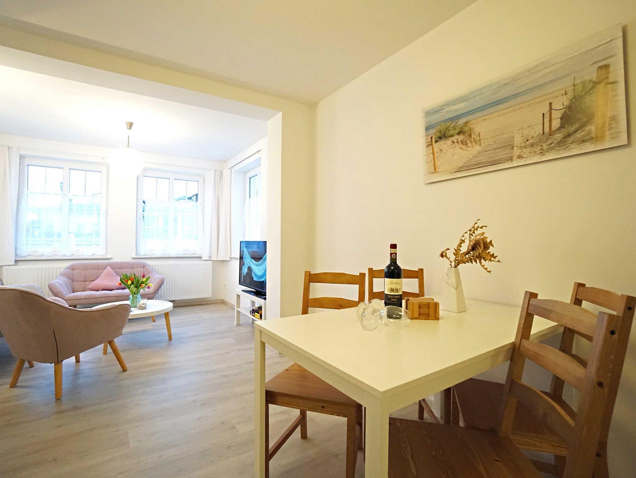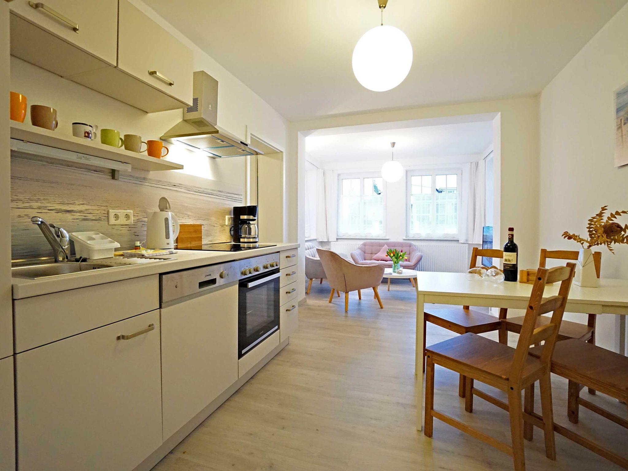 Die großzügige Ferienwohnung im Erdgeschoss verfügt über zwei Schlafzimmer, einen kombinierten Wohn- und Kochbereich sowie ein großzügiges Duschbad. Das große Schlafzimmer ist mit einem Doppelbett (160cm breit) ausgestattet und bietet genügend Platz für ein zusätzliches Kinderbett. Das zweite Schlafzimmer verfügt auch über ein Doppelbett (140cm breit). Der kombinierte Wohn- Kochraum verfügt über eine komplett ausgestattete Küchenzeile, einen Esstisch und eine gemütliche Fernsehecke im Erkerbereich. Die Wohnung besticht durch ihre komfortable, moderne Ausstattung, die Größe und die direkte Nähe zum feinen Ostseestrand und der Promenade.