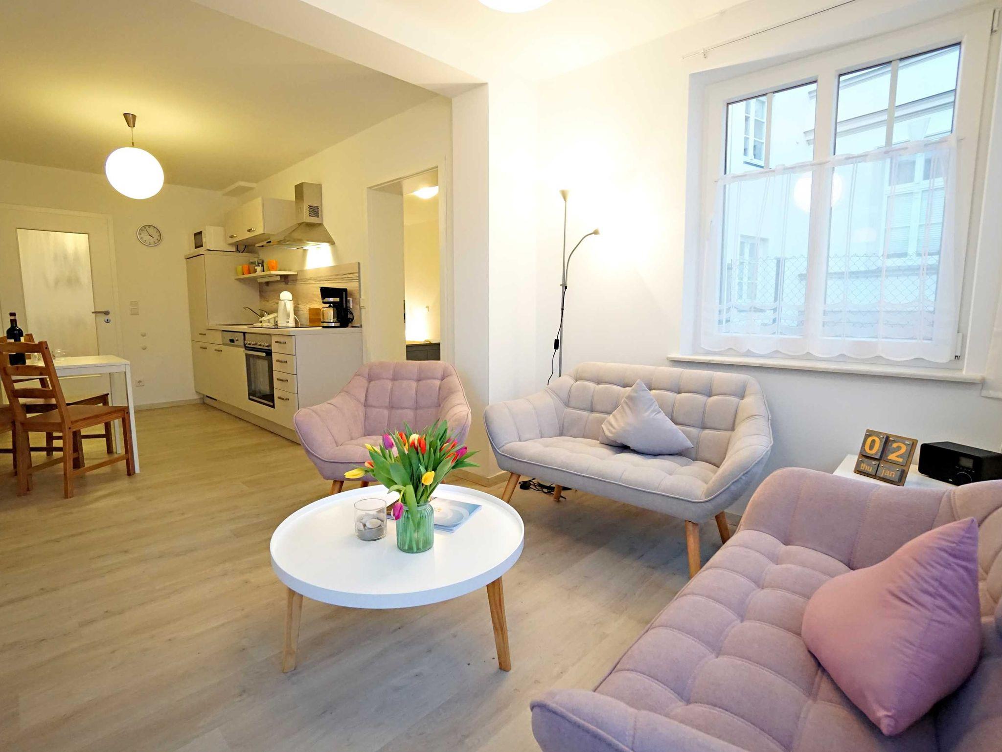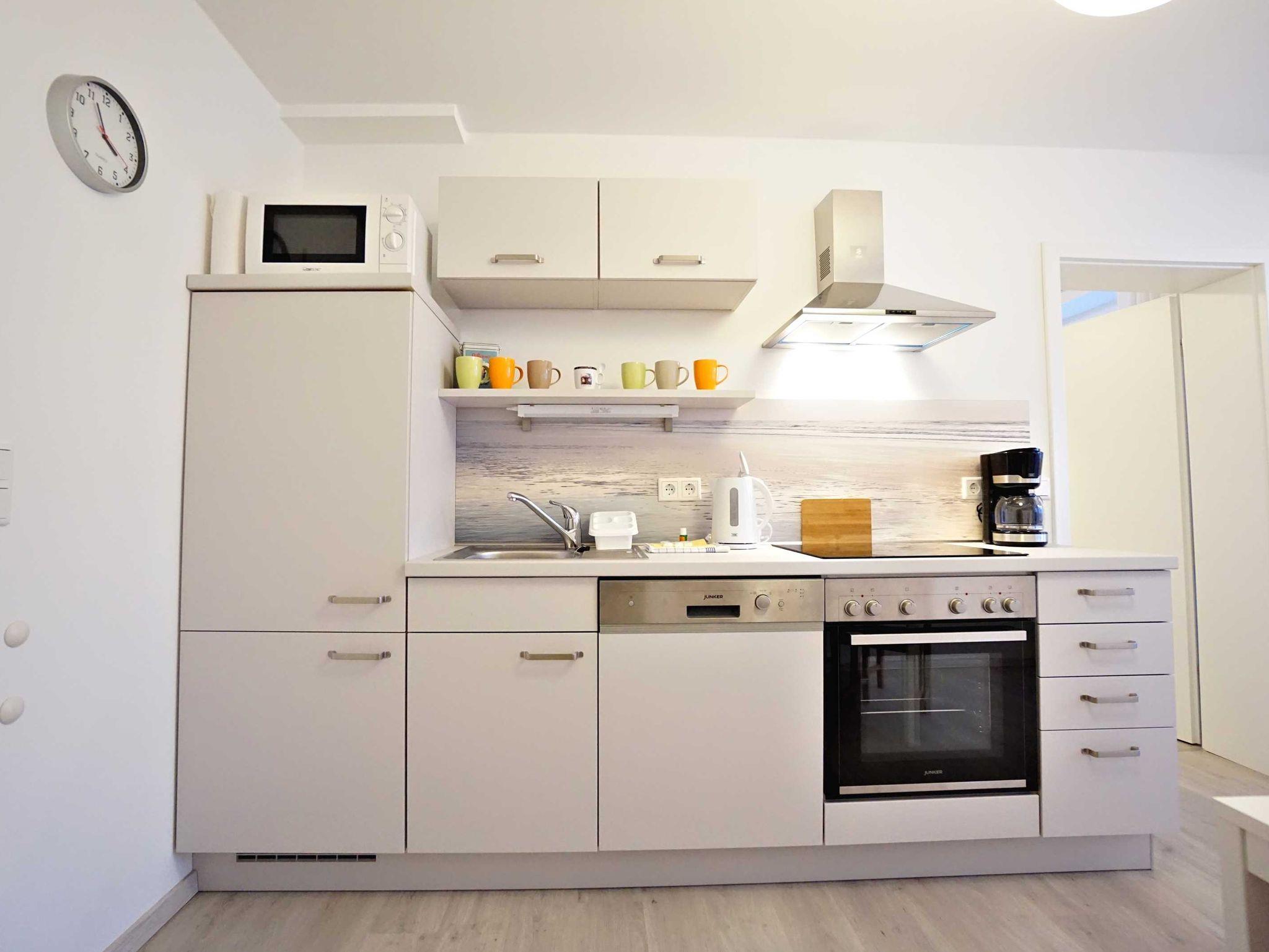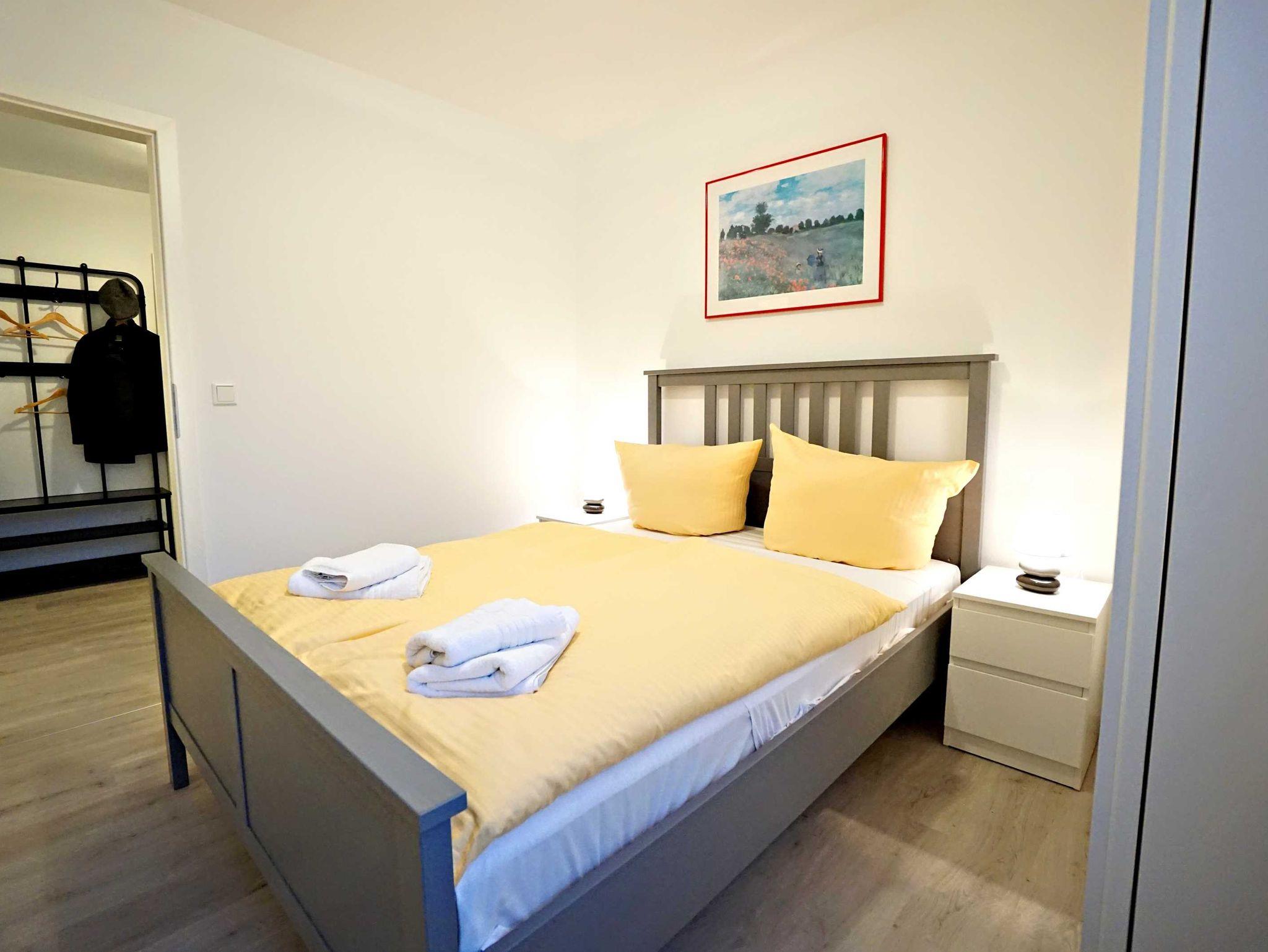 Die großzügige Ferienwohnung im Erdgeschoss verfügt über zwei Schlafzimmer, einen kombinierten Wohn- und Kochbereich sowie ein großzügiges Duschbad. Das große Schlafzimmer ist mit einem Doppelbett (160cm breit) ausgestattet und bietet genügend Platz für ein zusätzliches Kinderbett. Das zweite Schlafzimmer verfügt auch über ein Doppelbett (140cm breit). Der kombinierte Wohn- Kochraum verfügt über eine komplett ausgestattete Küchenzeile, einen Esstisch und eine gemütliche Fernsehecke im Erkerbereich. Die Wohnung besticht durch ihre komfortable, moderne Ausstattung, die Größe und die direkte Nähe zum feinen Ostseestrand und der Promenade.