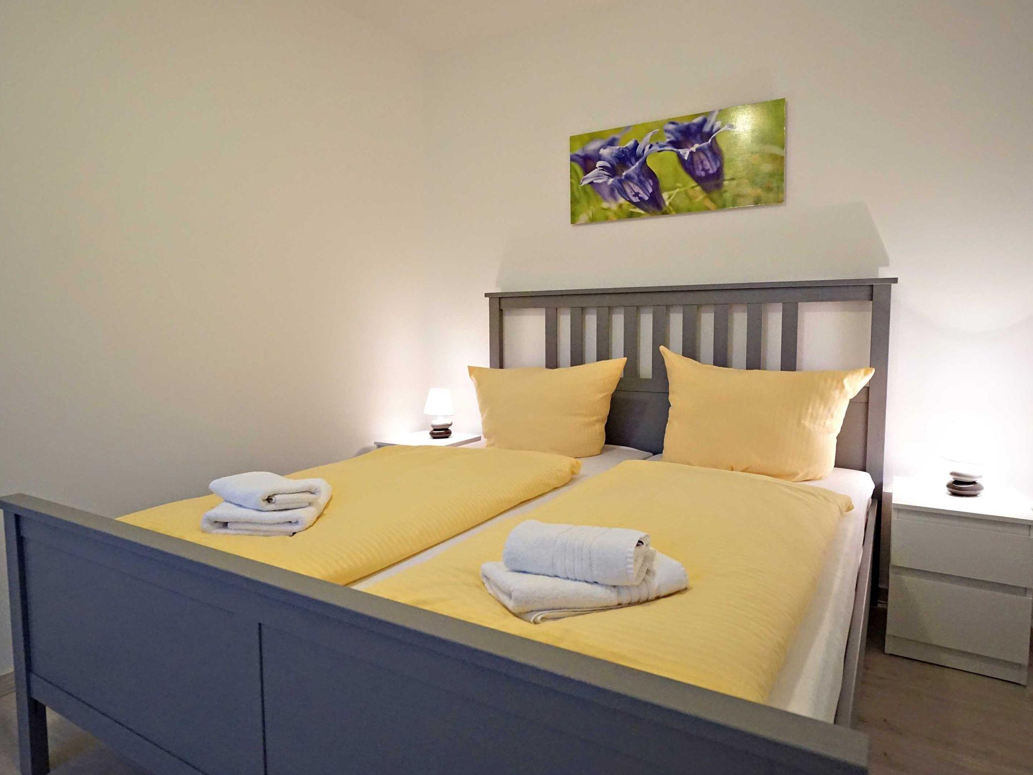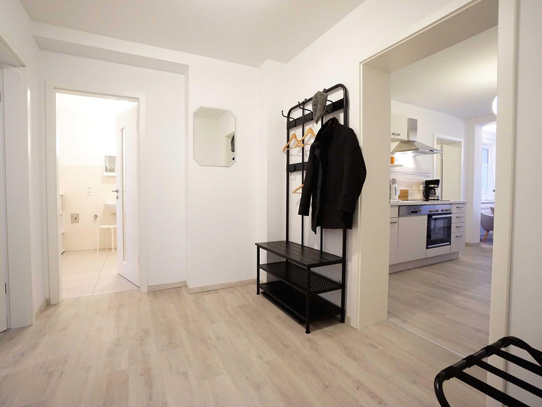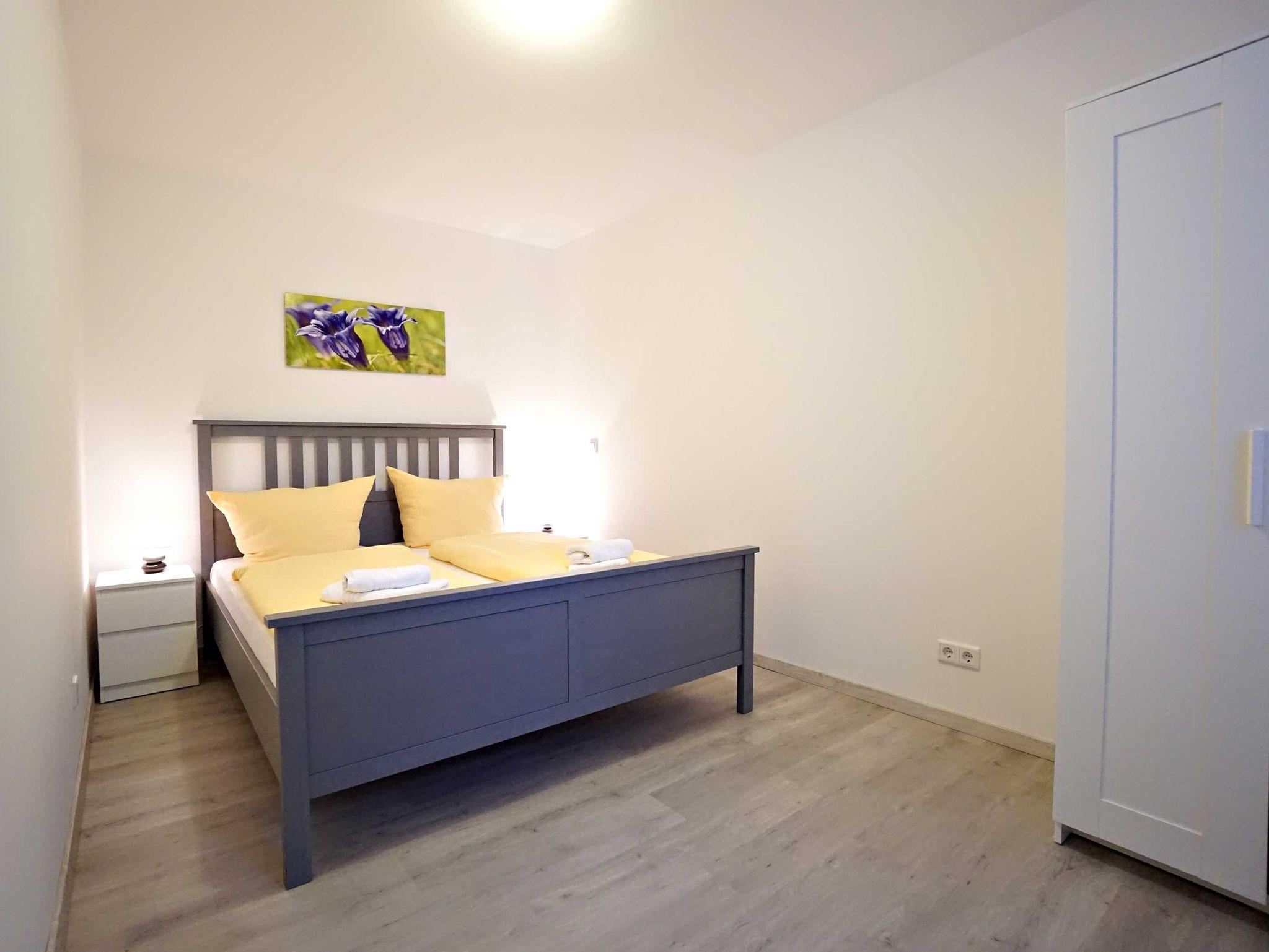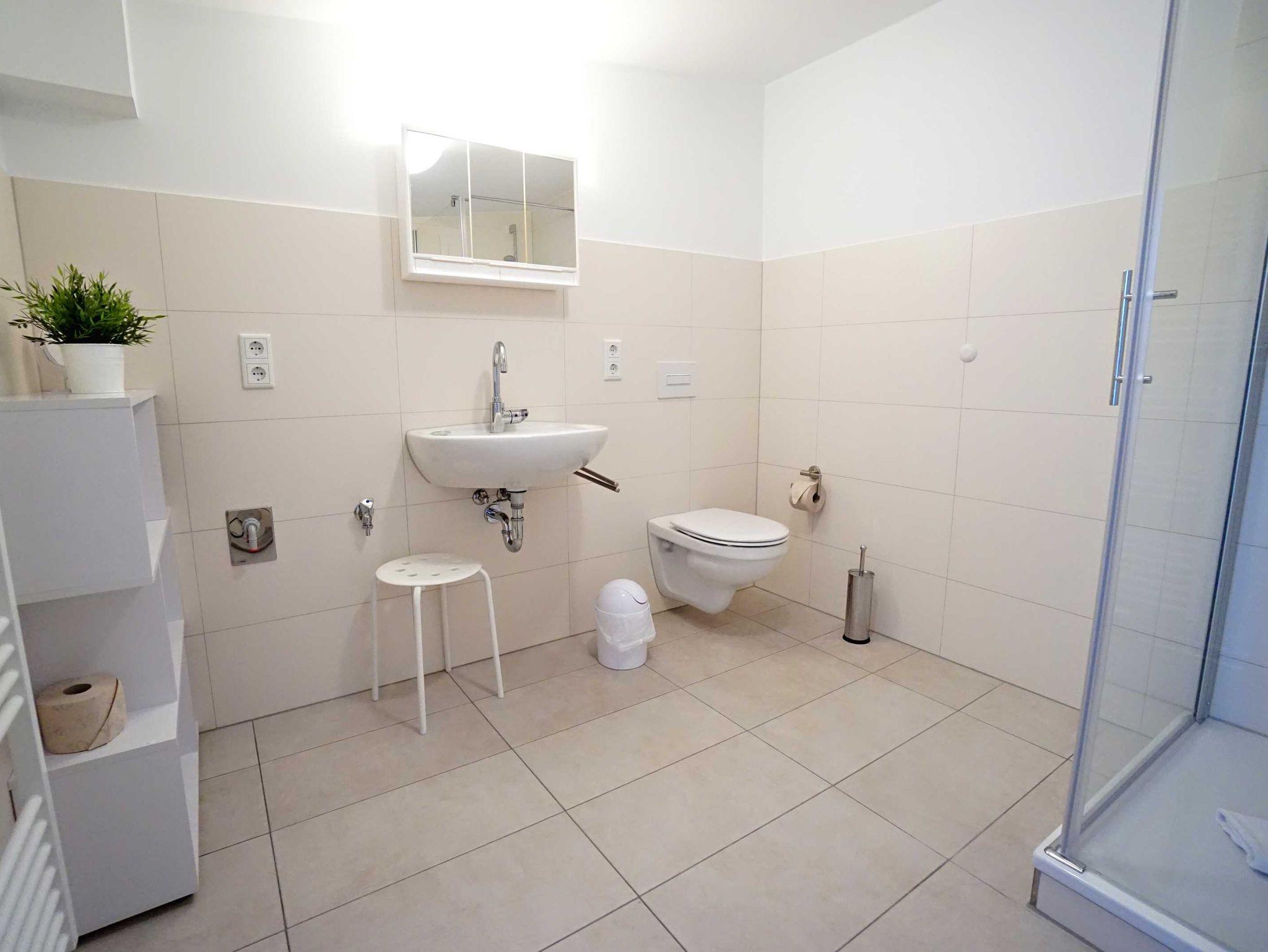 Die großzügige Ferienwohnung im Erdgeschoss verfügt über zwei Schlafzimmer, einen kombinierten Wohn- und Kochbereich sowie ein großzügiges Duschbad. Das große Schlafzimmer ist mit einem Doppelbett (160cm breit) ausgestattet und bietet genügend Platz für ein zusätzliches Kinderbett. Das zweite Schlafzimmer verfügt auch über ein Doppelbett (140cm breit). Der kombinierte Wohn- Kochraum verfügt über eine komplett ausgestattete Küchenzeile, einen Esstisch und eine gemütliche Fernsehecke im Erkerbereich. Die Wohnung besticht durch ihre komfortable, moderne Ausstattung, die Größe und die direkte Nähe zum feinen Ostseestrand und der Promenade.