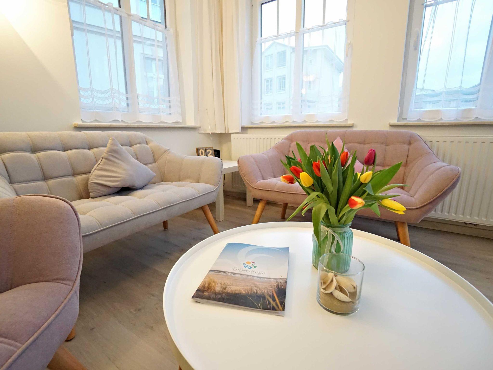 an der Dünenstraße, um den Charme der Kaiserbäder eindrucksvoll und unverfälscht widerzuspiegeln. Das historische Ambiente bietet beste Voraussetzungen für einen gelungenen Urlaub. Die Wohnungen sind modern und komfortabel eingerichtet und verfügen jeweils über 2 Schlafzimmer, Diele, Bad,Wohnzimmer mit Küchenzeile.