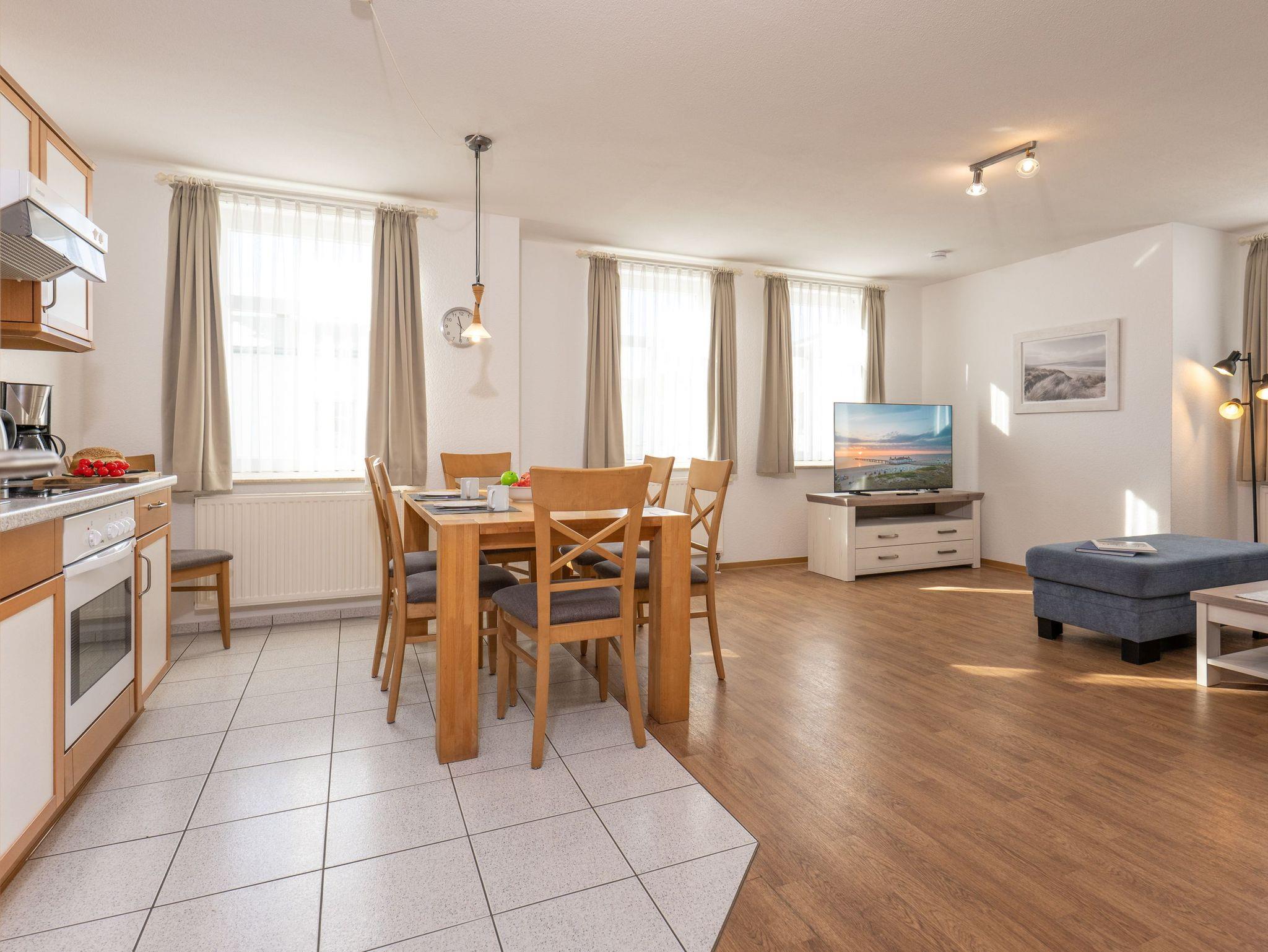 Wohnbereich: gemütliches, helles Wohnzimmer mit großem TV und angrenzendem Essbereich sowie voll ausgestatteter Küchenzeile