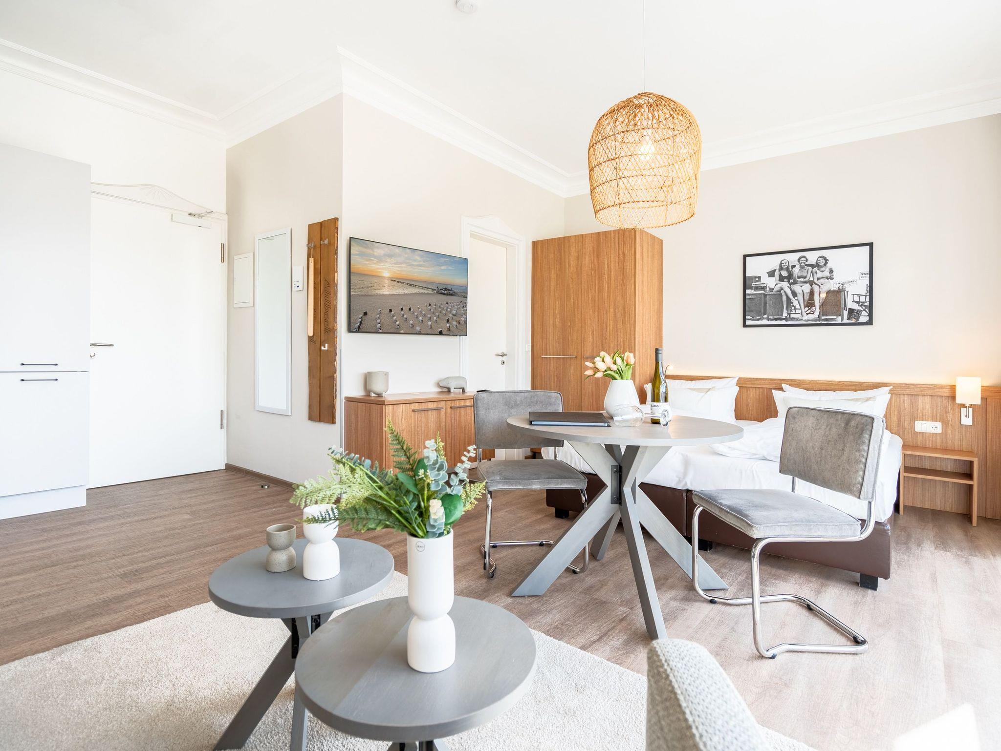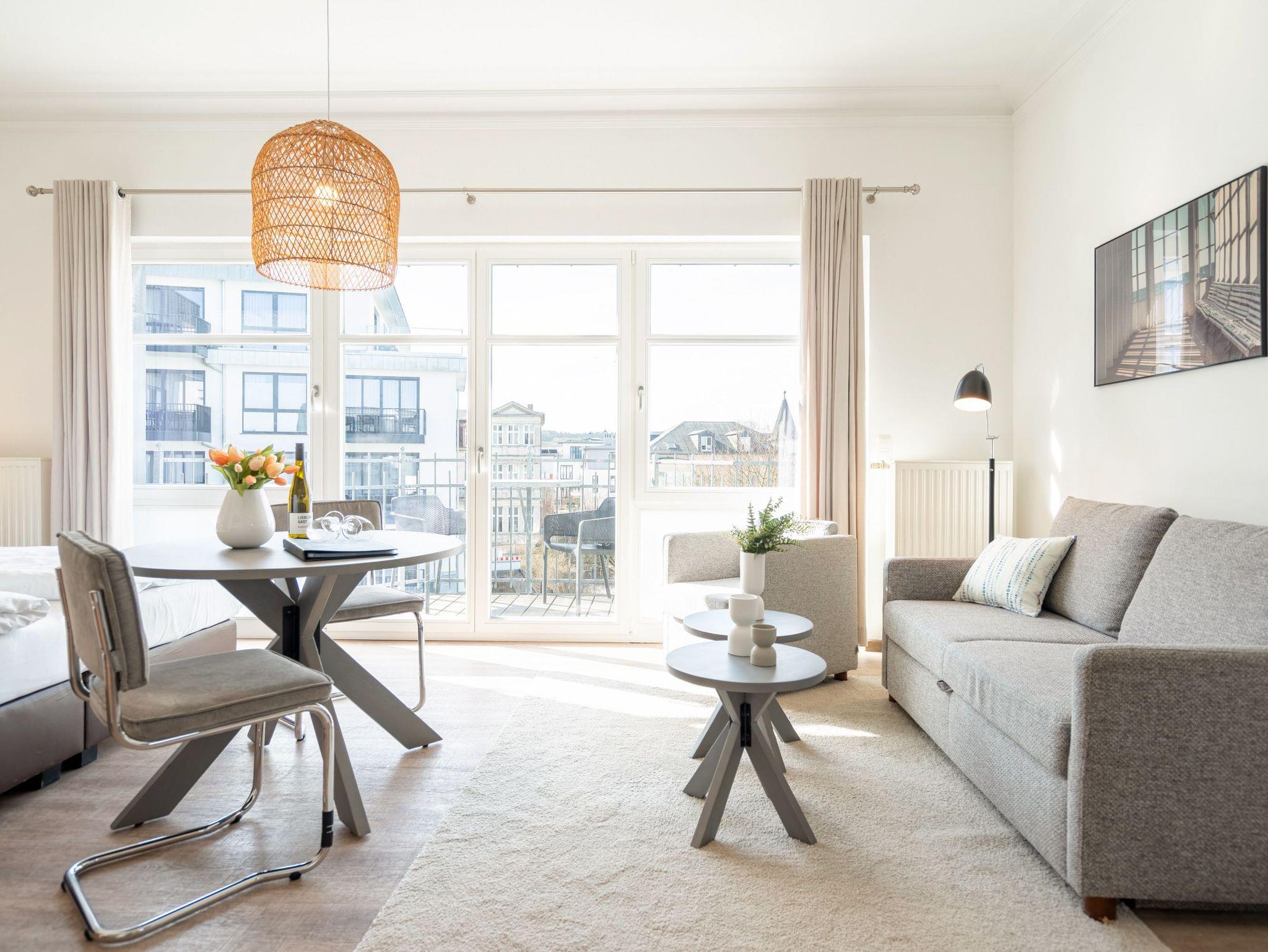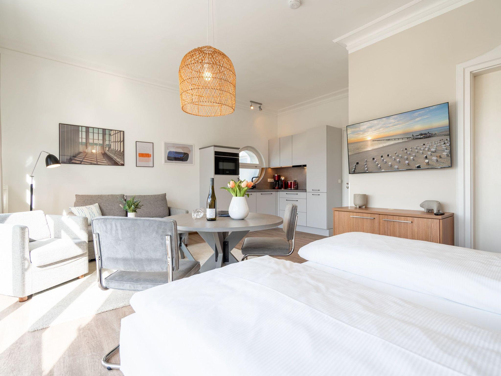 Die 1-Raum-Ferienwohnung Nr. C09 in der Villa Seedüwel bietet auf 35 qm komfortablen Platz für zwei Personen und befindet sich im Dachgeschoss. Der offene Wohnbereich ist mit einer Küchenzeile ausgestattet, die ein Induktionskochfeld, eine Mikrowelle und einen Kühlschrank mit Gefrierfach umfasst. Ein Essplatz für zwei Personen, eine gemütliche Sitzgruppe und ein Flat-TV sorgen für Komfort. Das Doppelbett (1,80 m x 2,00 m) befindet sich ebenfalls im Wohnbereich und wird durch eine Kommode sowie einen Kleiderschrank ergänzt. Von hier aus gelangen Sie auf den sonnigen Süd-West-Balkon. Das Tageslicht-Bad verfügt über eine Dusche, ein Waschbecken und ein WC. Ein Stellplatz in der Tiefgarage ( Einfahrthöhe 2,03m) des benachbarten Hauses „Strandterrasse“ ist für Sie reserviert. WLAN steht Ihnen kostenfrei zur Verfügung.
