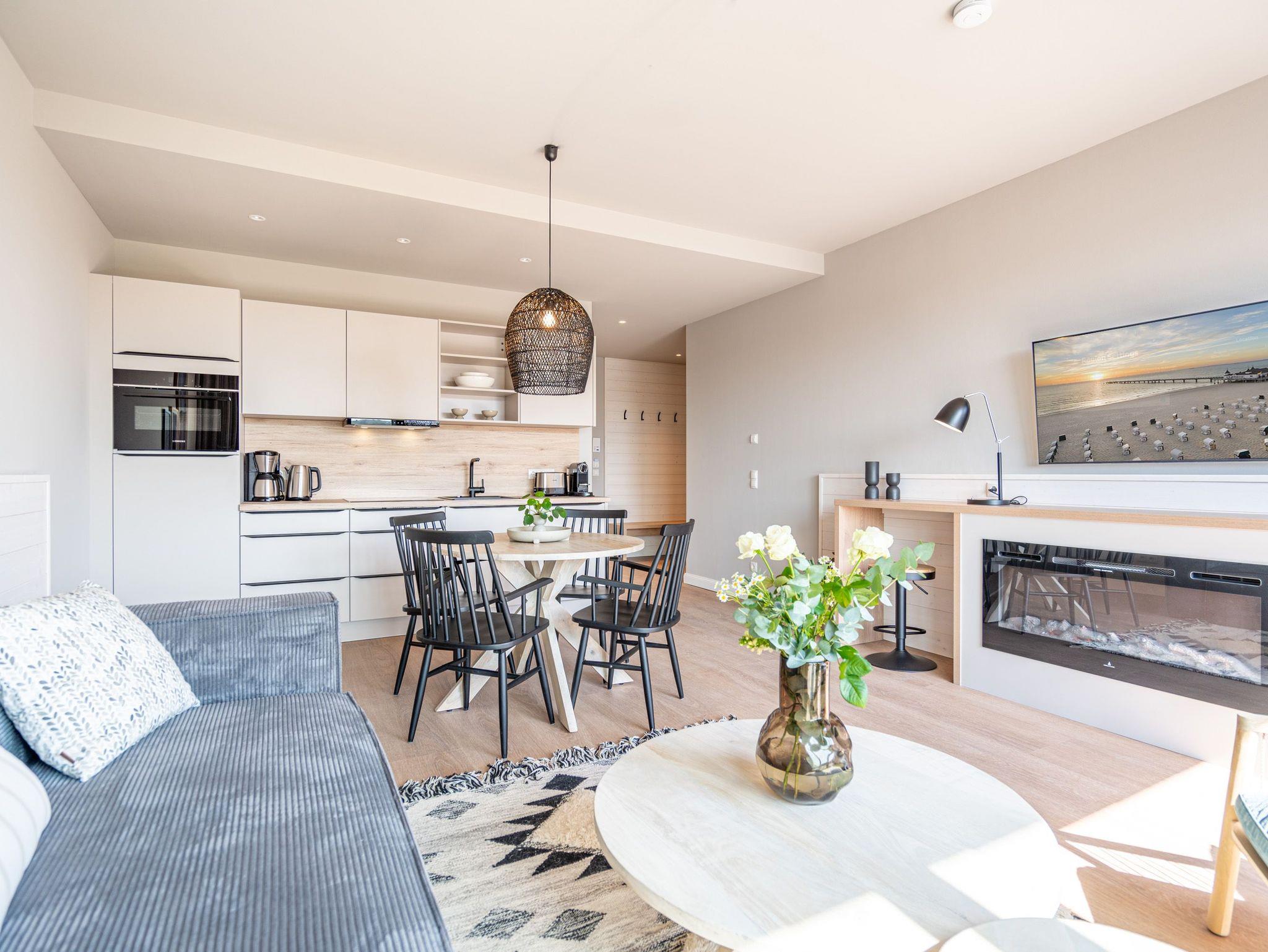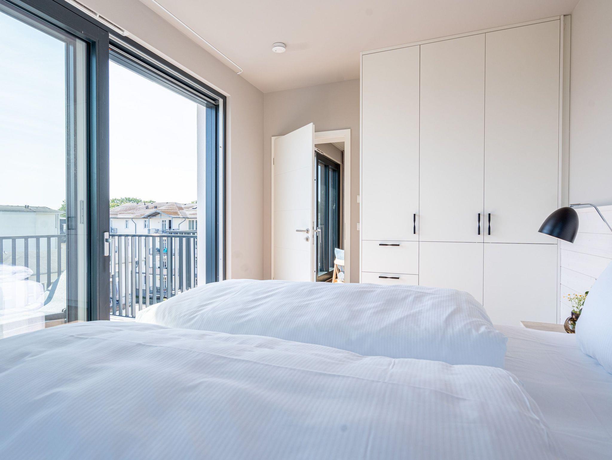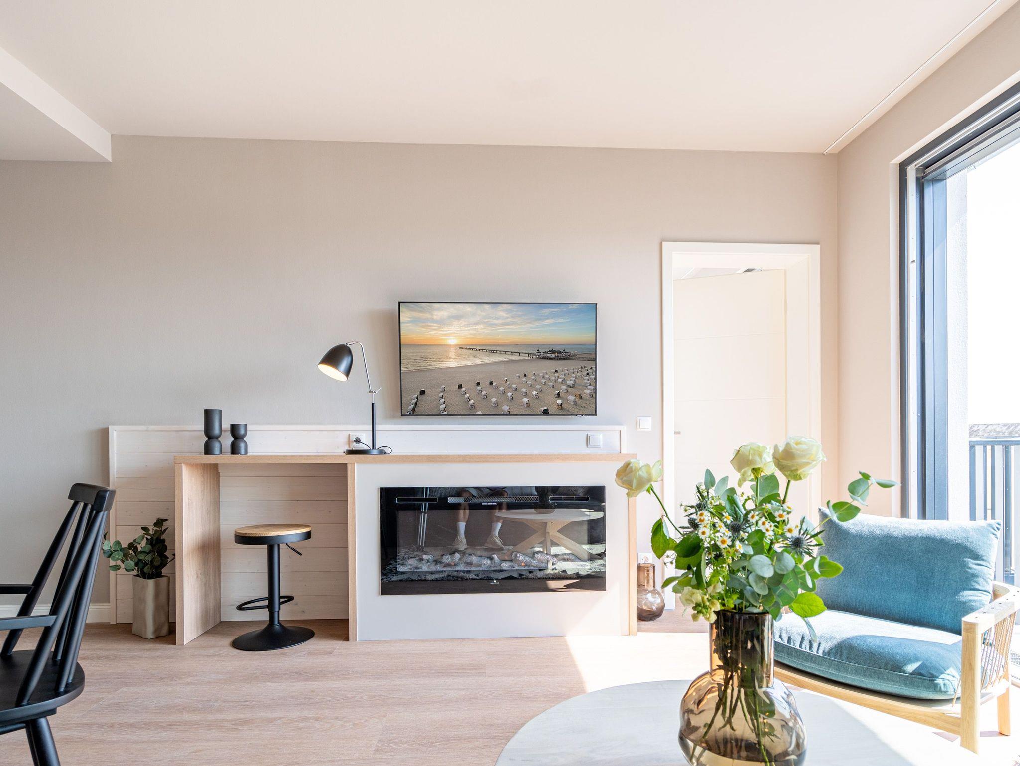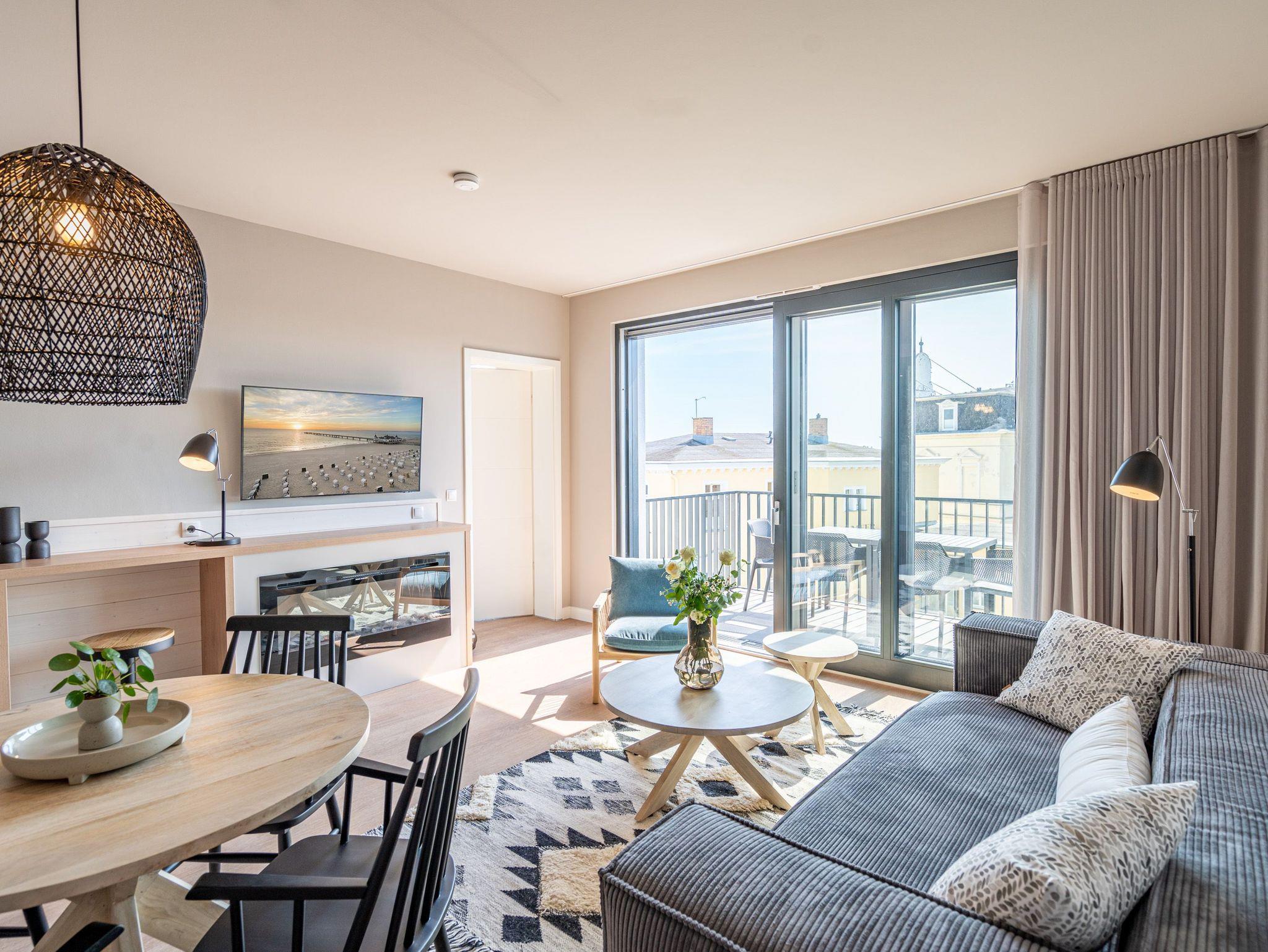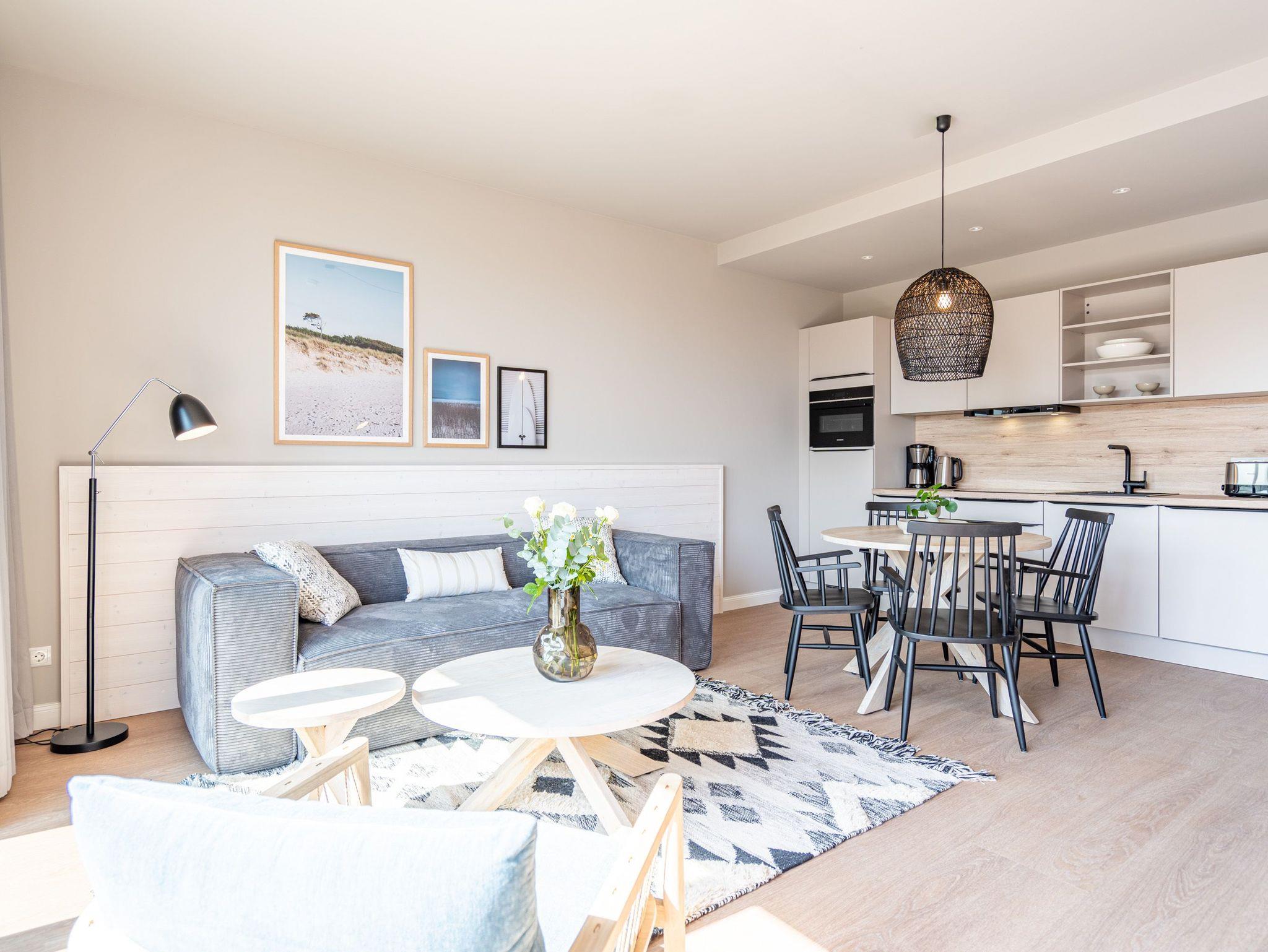 Drei helle, komfortable Räume warten im Appartement B 3.2 (Haus B) in der 3. Etage der Strandterrasse nur auf Ostseesehnsüchtige mit einer Vorliebe für ein schönes Zuhause und für Meerblicke. Auch wenn es nur auf Zeit ist. Die 76 Quadratmeter große Wohnung ist für 4 Personen das ideale Urlaubsdomizil mit Meerblick. Und was für einer! Von den zwei Balkonen, über die das Appartement verfügt, können Sie morgens, mittags und abends auf das unendliche Blau schauen. Ob beim Essen unter freiem Himmel oder beim Relaxen auf der Sonnenliege: Das Rauschen der Wellen ist hier ganz nah. Dazu bietet das Innere der Wohnung allen Komfort und eine stylische Einrichtung. Die gemütliche Sitzgruppe aus Sofa und Sessel verspricht Entspannung beim Lesen, Chillen mit Blick auf den Elektrokamin (ohne Wärmeabgabe) oder bei spannenden Filmabenden vor dem großen Flat-TV (50 Zoll). Eine Working-Station ist ein funktionales Gimmick. Die zum Wohnzimmer hin offene Küche ist voll ausgestattet und mit hochwertigen Elektrogeräten wie einem Backofen, einem 4-Platten-Induktionsherd, einem Geschirrspüler und einer Nespresso-Kapselmaschine bestückt. An dem schönen Esstisch werden die Mahlzeiten zum kulinarisch vergnüglichen Erlebnis. Die Wohnung verfügt über zwei Schlafzimmer, in denen ein komfortables Boxspringdoppelbett (1,80m x 2,00m) süße Träume verspricht. In den Kleiderschränken ist viel Platz und jedes der Zimmer besitzt zusätzlich einen Flat-TV (43 Zoll). Eines der Schlafzimmer hat einen Zugang zum 2. Balkon. Der andere Balkon ist über das Wohnzimmer betretbar. Zwei moderne Badezimmer mit geräumiger Dusche, Waschtisch und WC komplettieren das Wohlfühlreich. Für Entspannung sorgt zudem in einem der beiden Bäder eine Infrarotsaunakabine. Mehr Behaglichkeit geht nicht. Parken Sie bequem auf dem zur Wohnung gehörenden PKW-Stellplatz in der Tiefgarage und genießen Sie die Auszeit in einer stilvollen Ferienwohnung mit hochwertiger Ausstattung und einem traumhaften Blick auf die Ostsee.
