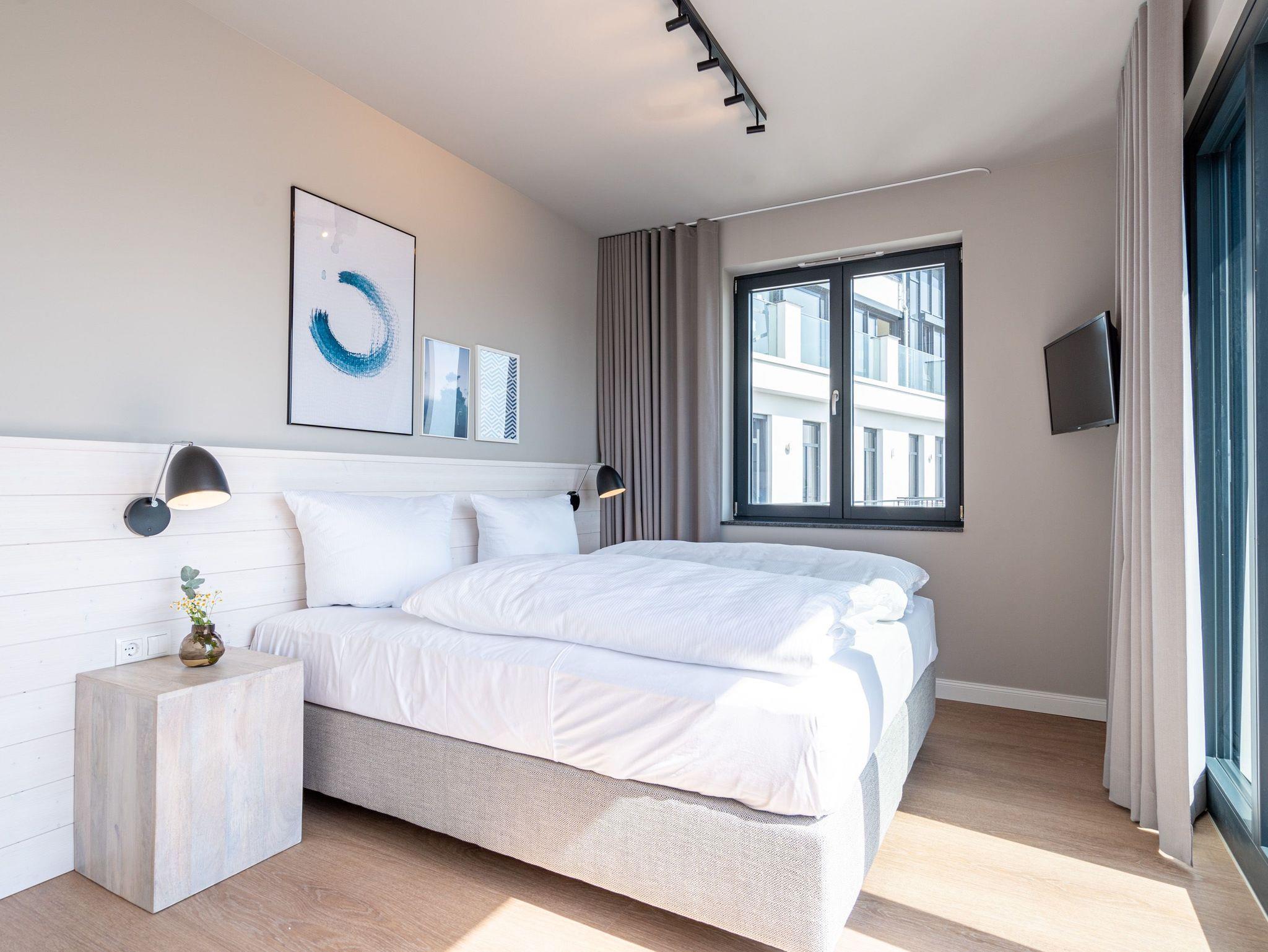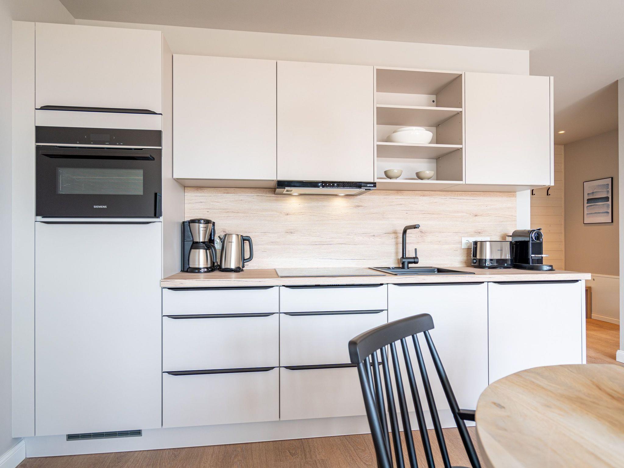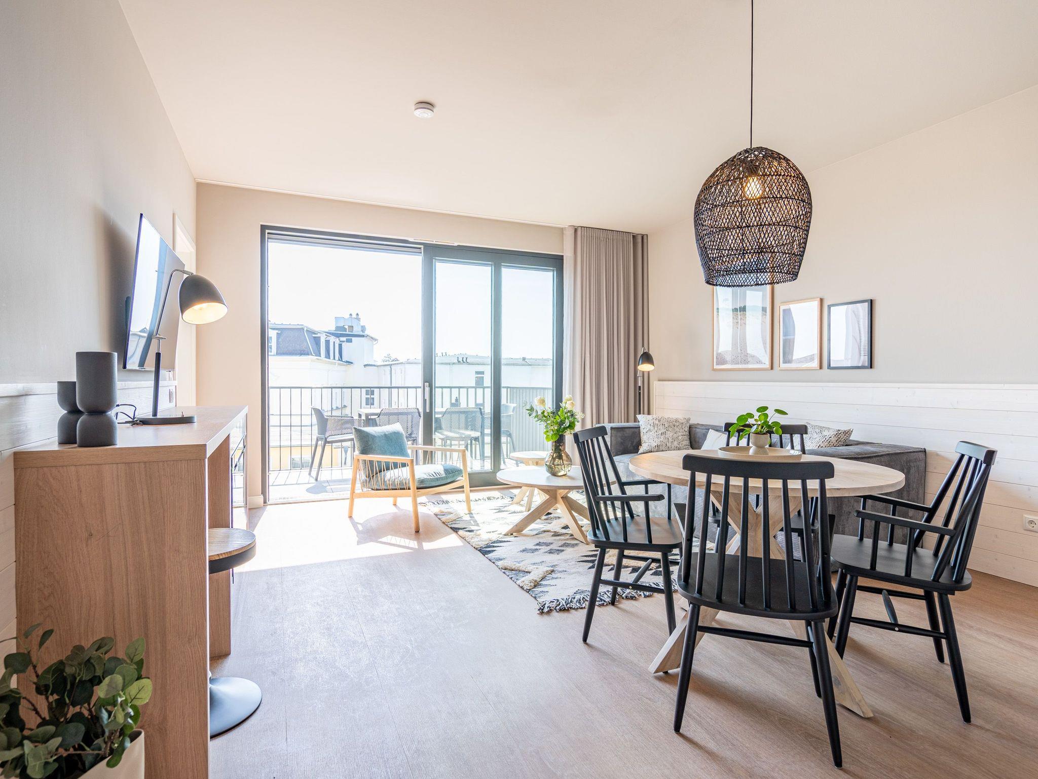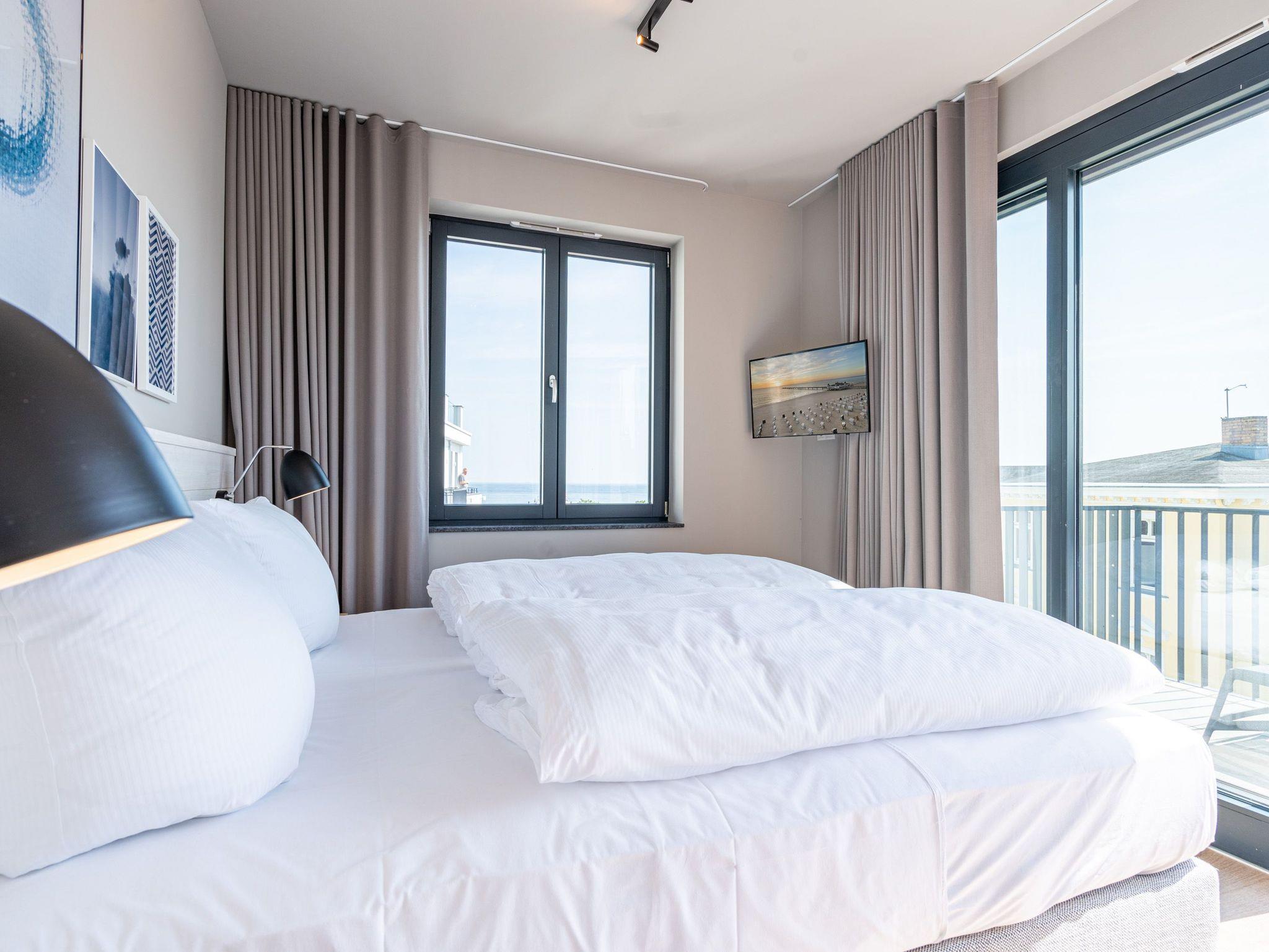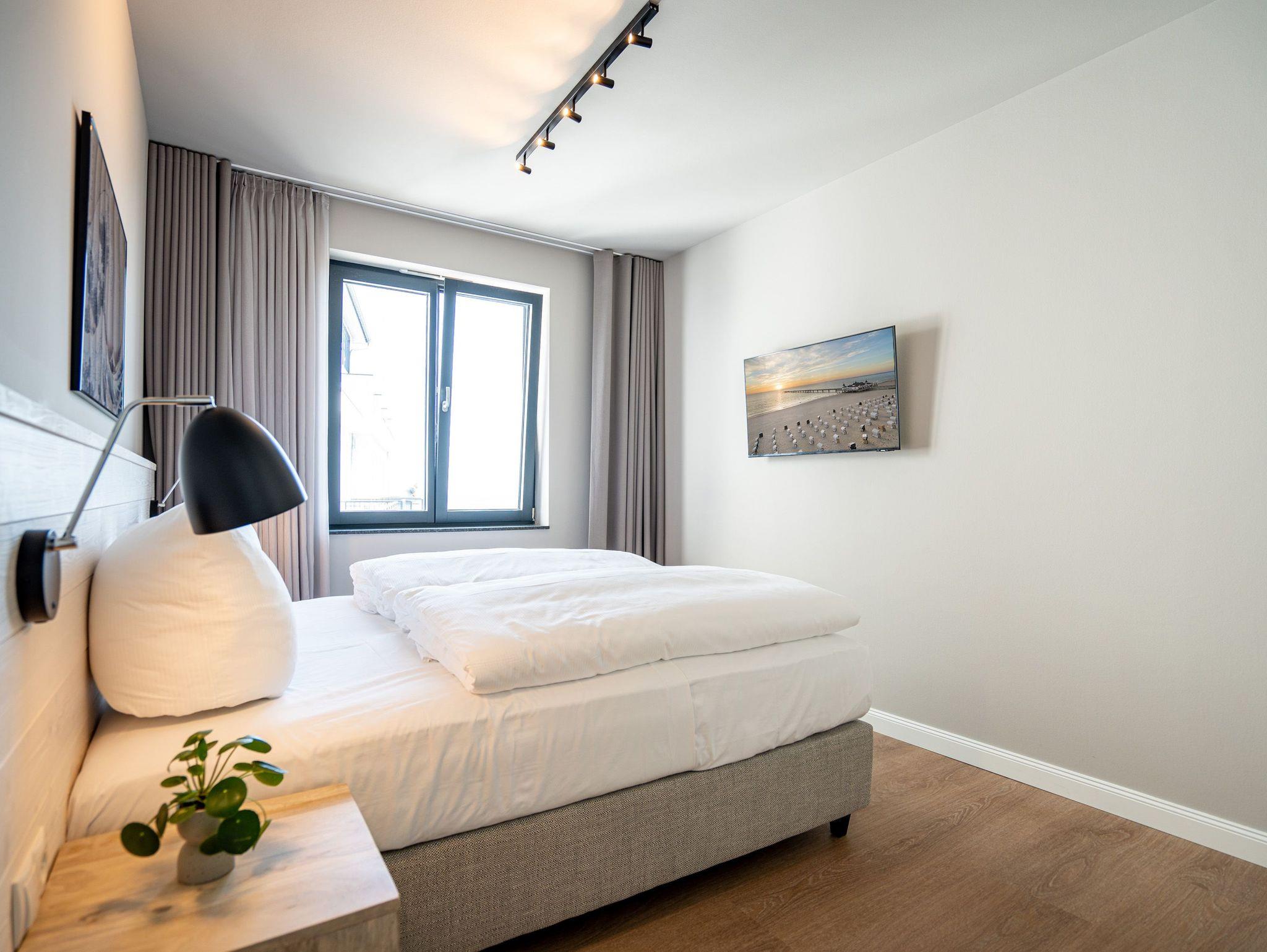 Drei helle, komfortable Räume warten im Appartement B 3.2 (Haus B) in der 3. Etage der Strandterrasse nur auf Ostseesehnsüchtige mit einer Vorliebe für ein schönes Zuhause und für Meerblicke. Auch wenn es nur auf Zeit ist. Die 76 Quadratmeter große Wohnung ist für 4 Personen das ideale Urlaubsdomizil mit Meerblick. Und was für einer! Von den zwei Balkonen, über die das Appartement verfügt, können Sie morgens, mittags und abends auf das unendliche Blau schauen. Ob beim Essen unter freiem Himmel oder beim Relaxen auf der Sonnenliege: Das Rauschen der Wellen ist hier ganz nah. Dazu bietet das Innere der Wohnung allen Komfort und eine stylische Einrichtung. Die gemütliche Sitzgruppe aus Sofa und Sessel verspricht Entspannung beim Lesen, Chillen mit Blick auf den Elektrokamin (ohne Wärmeabgabe) oder bei spannenden Filmabenden vor dem großen Flat-TV (50 Zoll). Eine Working-Station ist ein funktionales Gimmick. Die zum Wohnzimmer hin offene Küche ist voll ausgestattet und mit hochwertigen Elektrogeräten wie einem Backofen, einem 4-Platten-Induktionsherd, einem Geschirrspüler und einer Nespresso-Kapselmaschine bestückt. An dem schönen Esstisch werden die Mahlzeiten zum kulinarisch vergnüglichen Erlebnis. Die Wohnung verfügt über zwei Schlafzimmer, in denen ein komfortables Boxspringdoppelbett (1,80m x 2,00m) süße Träume verspricht. In den Kleiderschränken ist viel Platz und jedes der Zimmer besitzt zusätzlich einen Flat-TV (43 Zoll). Eines der Schlafzimmer hat einen Zugang zum 2. Balkon. Der andere Balkon ist über das Wohnzimmer betretbar. Zwei moderne Badezimmer mit geräumiger Dusche, Waschtisch und WC komplettieren das Wohlfühlreich. Für Entspannung sorgt zudem in einem der beiden Bäder eine Infrarotsaunakabine. Mehr Behaglichkeit geht nicht. Parken Sie bequem auf dem zur Wohnung gehörenden PKW-Stellplatz in der Tiefgarage und genießen Sie die Auszeit in einer stilvollen Ferienwohnung mit hochwertiger Ausstattung und einem traumhaften Blick auf die Ostsee.