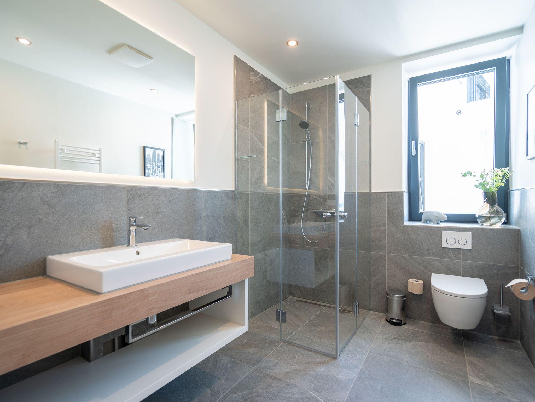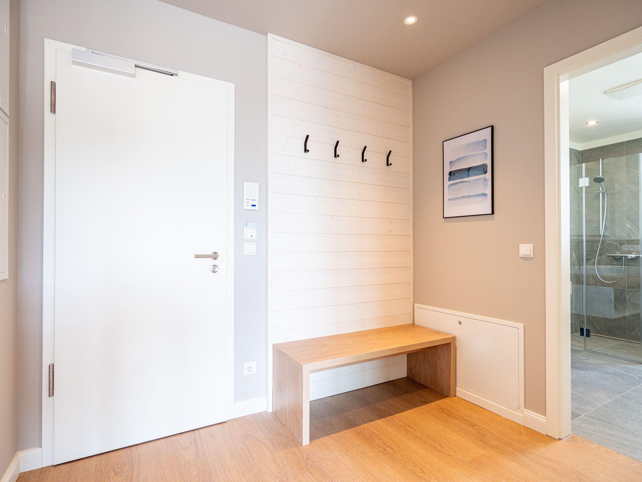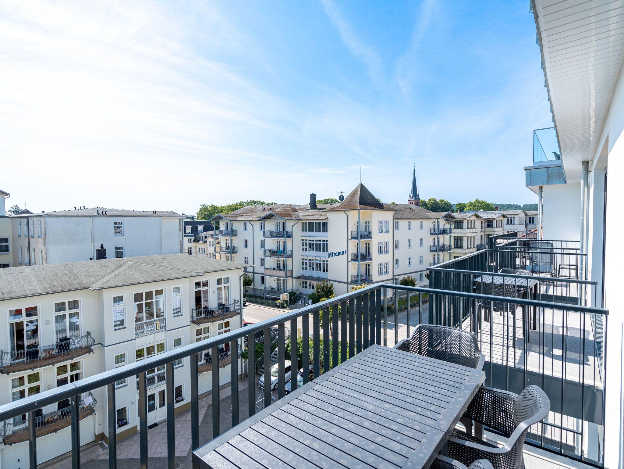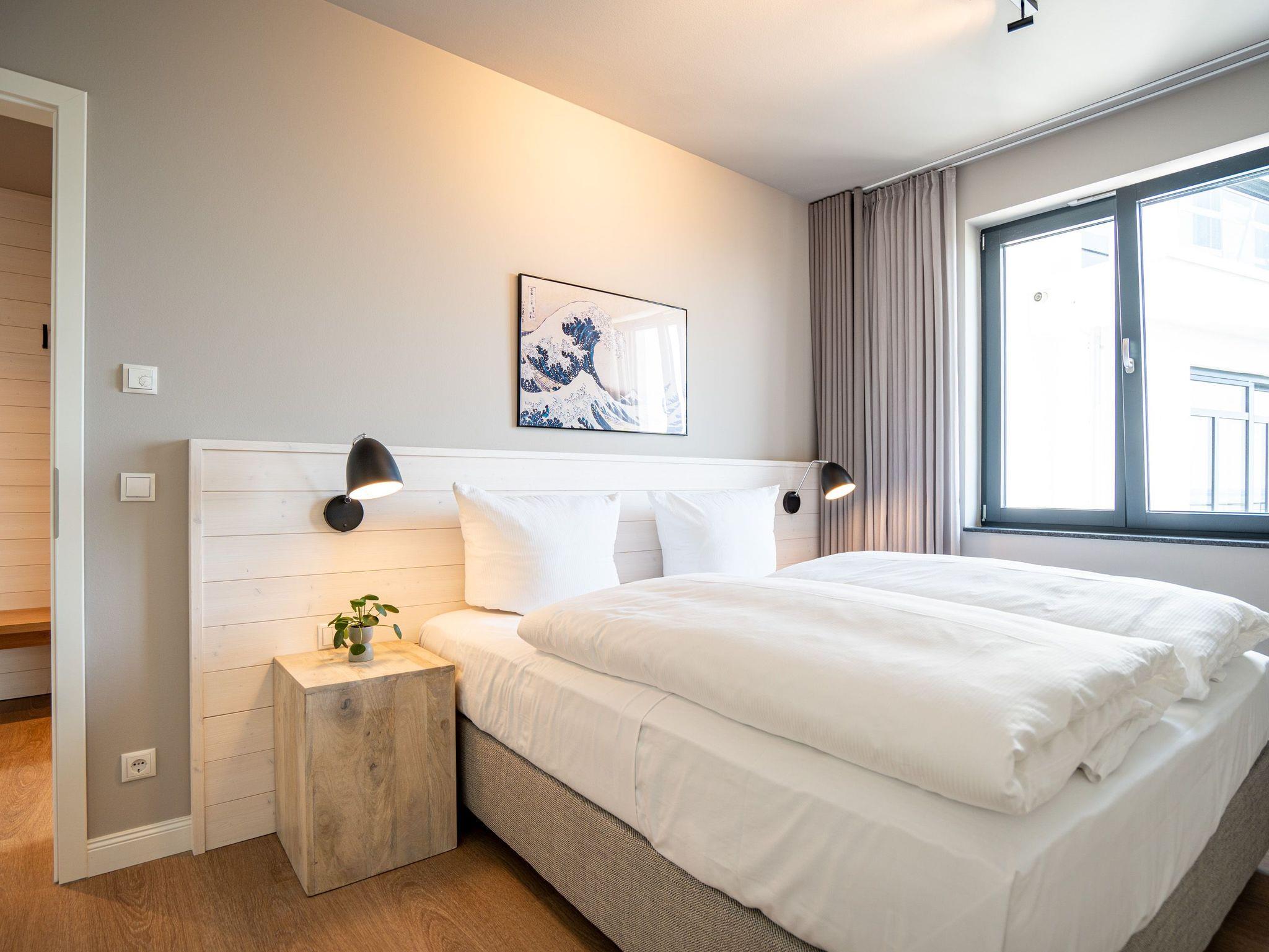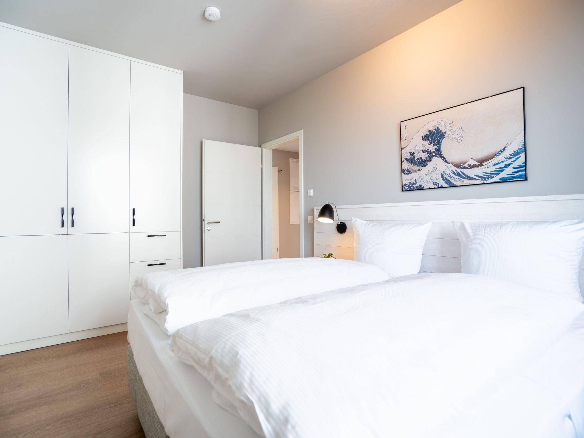 Drei helle, komfortable Räume warten im Appartement B 3.2 (Haus B) in der 3. Etage der Strandterrasse nur auf Ostseesehnsüchtige mit einer Vorliebe für ein schönes Zuhause und für Meerblicke. Auch wenn es nur auf Zeit ist. Die 76 Quadratmeter große Wohnung ist für 4 Personen das ideale Urlaubsdomizil mit Meerblick. Und was für einer! Von den zwei Balkonen, über die das Appartement verfügt, können Sie morgens, mittags und abends auf das unendliche Blau schauen. Ob beim Essen unter freiem Himmel oder beim Relaxen auf der Sonnenliege: Das Rauschen der Wellen ist hier ganz nah. Dazu bietet das Innere der Wohnung allen Komfort und eine stylische Einrichtung. Die gemütliche Sitzgruppe aus Sofa und Sessel verspricht Entspannung beim Lesen, Chillen mit Blick auf den Elektrokamin (ohne Wärmeabgabe) oder bei spannenden Filmabenden vor dem großen Flat-TV (50 Zoll). Eine Working-Station ist ein funktionales Gimmick. Die zum Wohnzimmer hin offene Küche ist voll ausgestattet und mit hochwertigen Elektrogeräten wie einem Backofen, einem 4-Platten-Induktionsherd, einem Geschirrspüler und einer Nespresso-Kapselmaschine bestückt. An dem schönen Esstisch werden die Mahlzeiten zum kulinarisch vergnüglichen Erlebnis. Die Wohnung verfügt über zwei Schlafzimmer, in denen ein komfortables Boxspringdoppelbett (1,80m x 2,00m) süße Träume verspricht. In den Kleiderschränken ist viel Platz und jedes der Zimmer besitzt zusätzlich einen Flat-TV (43 Zoll). Eines der Schlafzimmer hat einen Zugang zum 2. Balkon. Der andere Balkon ist über das Wohnzimmer betretbar. Zwei moderne Badezimmer mit geräumiger Dusche, Waschtisch und WC komplettieren das Wohlfühlreich. Für Entspannung sorgt zudem in einem der beiden Bäder eine Infrarotsaunakabine. Mehr Behaglichkeit geht nicht. Parken Sie bequem auf dem zur Wohnung gehörenden PKW-Stellplatz in der Tiefgarage und genießen Sie die Auszeit in einer stilvollen Ferienwohnung mit hochwertiger Ausstattung und einem traumhaften Blick auf die Ostsee.