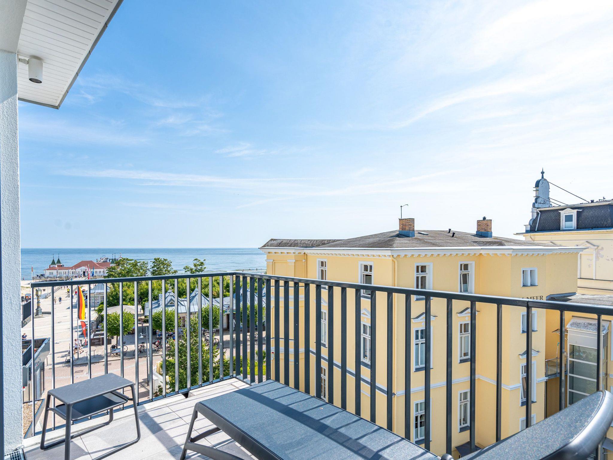 Die 2024 fertig gestellte Strandterrasse liegt direkt an der belebten Strandpromenade und bietet einen einzigartigen Ausblick auf die Grand Dame der historischen Seebrücken sowie die historische Konzertmuschel, einem beliebten Treffpunkt für Kunst und Kultur. Dahinter liegt die Ostsee ? ein Panorama, das zu den schönsten in den Kaiserbädern gehört. Es ist wie das Abtauchen in eine andere Zeit. In eine Zeit, in der man mit Stock, Sonnenschirm und Hut fürs ?Sehen und gesehen werden? über die Promenade schlenderte; aber auch in eine Zeit, in der ? damals wie heute ? Zeit einmal für eine kurze Weile keine Rolle spielt. Weil man angekommen ist im Loslassen, Entspannen und Genießen. Es ist dieser besondere Geruch nach Meeresluft und Freiheit, der in Erinnerung bleibt. Dazu die Bilder, die man mitnimmt. Von langen Strandspaziergängen, vom Lachen in fröhlich schäumenden Ostseewellen, von der Zeit in einem wunderschönen Urlaubsdomizil. Denn genau das ist die Strandterrasse mit ihren 56 modernen und exklusiven Ferienappartements direkt gegenüber der Ahlbecker Seebrücke. Die Ein-, Zwei- oder Dreizimmerwohnungen ? zwischen 40 und 70 Quadratmeter groß ? sind von einer Innenarchitektin gemeinsam mit unserem Erfahrungsschatz an Gästewünschen mit viel Liebe zum Detail und ganz individuell konzipiert worden. Entspannung und Wohlfühlen stehen an erster Stelle. Alles ist aufeinander abgestimmt und sorgt für eine gemütliche Atmosphäre. Wählen Sie zwischen einem Domizil in einem hellen, sandfarbenen Designkonzept oder einem Appartement mit anthrazitfarbenen Farbakzenten. Alle Appartements verfügen gleichermaßen über eine stilvolle und komfortable Einrichtung, die passgenau angefertigt worden ist, sowie über moderne Küchen und Bäder. Jedem Schlafzimmer ist ein eigenes Bad mit Dusche zugeordnet (außer App. B4.5). Die Appartements besitzen fast alle einen Balkon ? viele schauen sogar zur Ostsee hinaus. Die meisten Feriendomizile haben einen Elektrokamin und Infrarotsaunen. Im Erdgeschoss befindet sich ein separater Gemeinschaftsraum für Fahrräder. Außerdem besteht die Möglichkeit, im Gemeinschaftswaschraum 2 Waschmaschinen [&] Trockner zu nutzen. Ergänzt wird das Angebot durch eine Gemeinschaftssauna, die täglich von 11:00 bis 22:00 Uhr nutzbar ist. In der Tiefgarage (Einfahrtshöhe 2,03 Meter) steht für jede Wohnung 1 Pkw-Stellplatz zur Verfügung. Ist alles zur Zufriedenheit untergebracht? Dann kann der Urlaub ja beginnen. Und beim Blick vom Balkon über die Ostsee treffen sich zum Sonnenaufgang das Heute und das Damals. Gelassenheit legt sich beim Gang hinunter an den Strand auf die Seele. Jetzt darf die Zeit stehenbleiben.