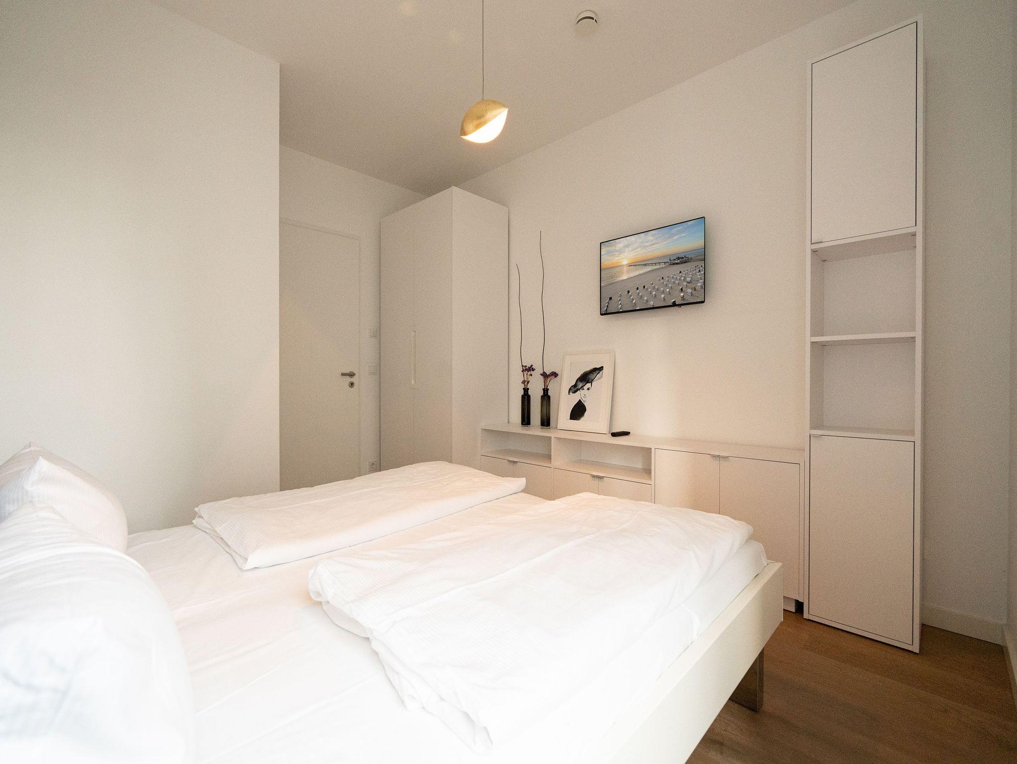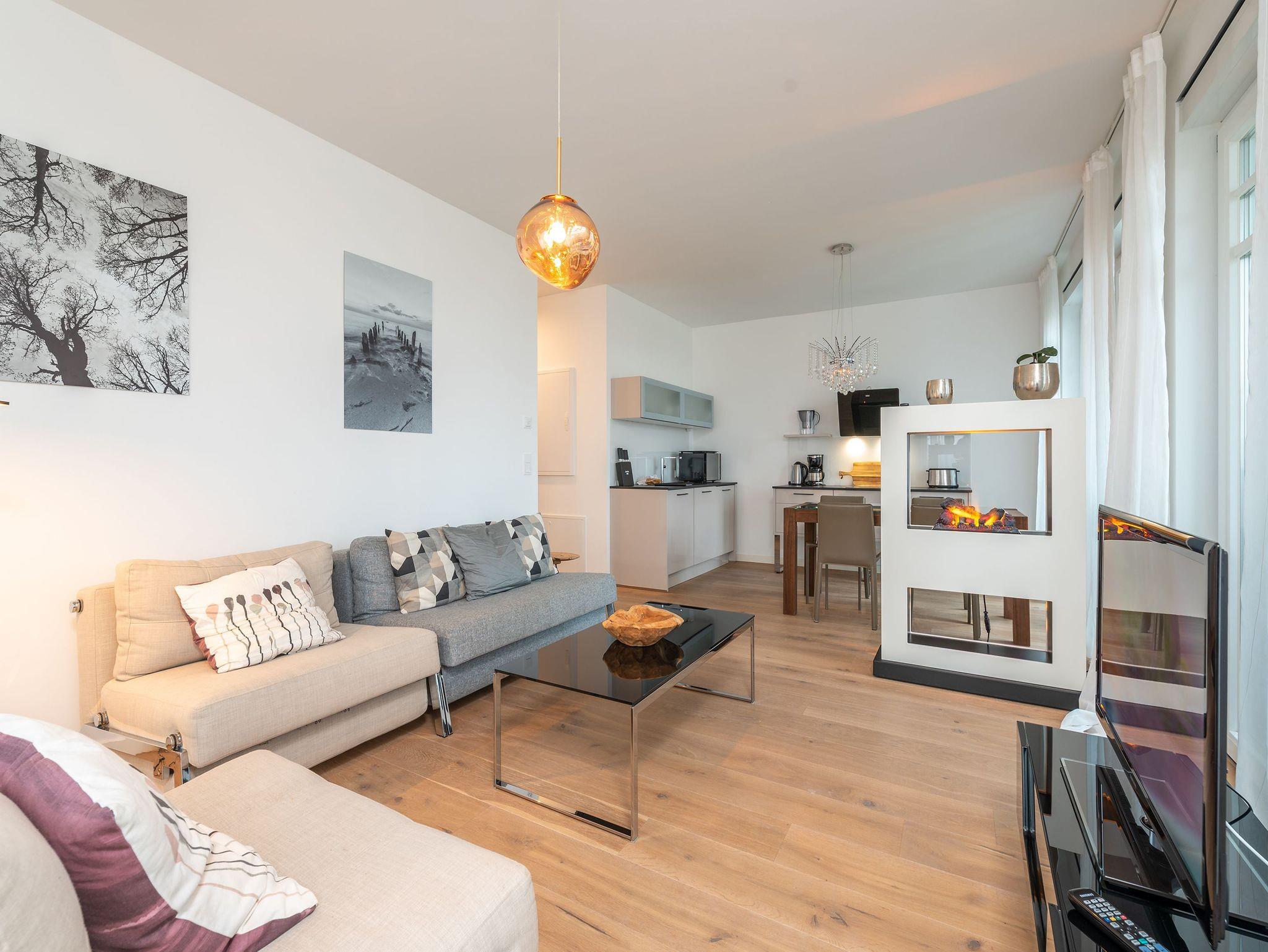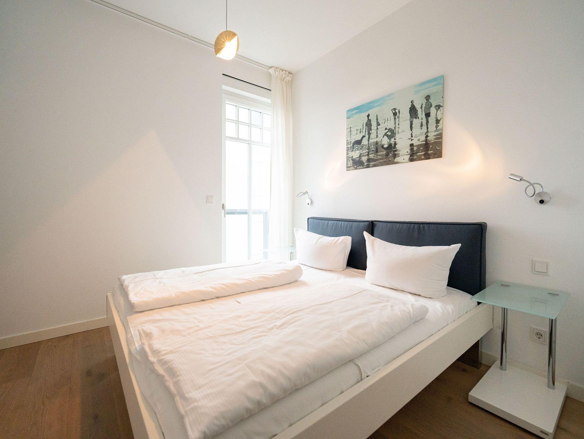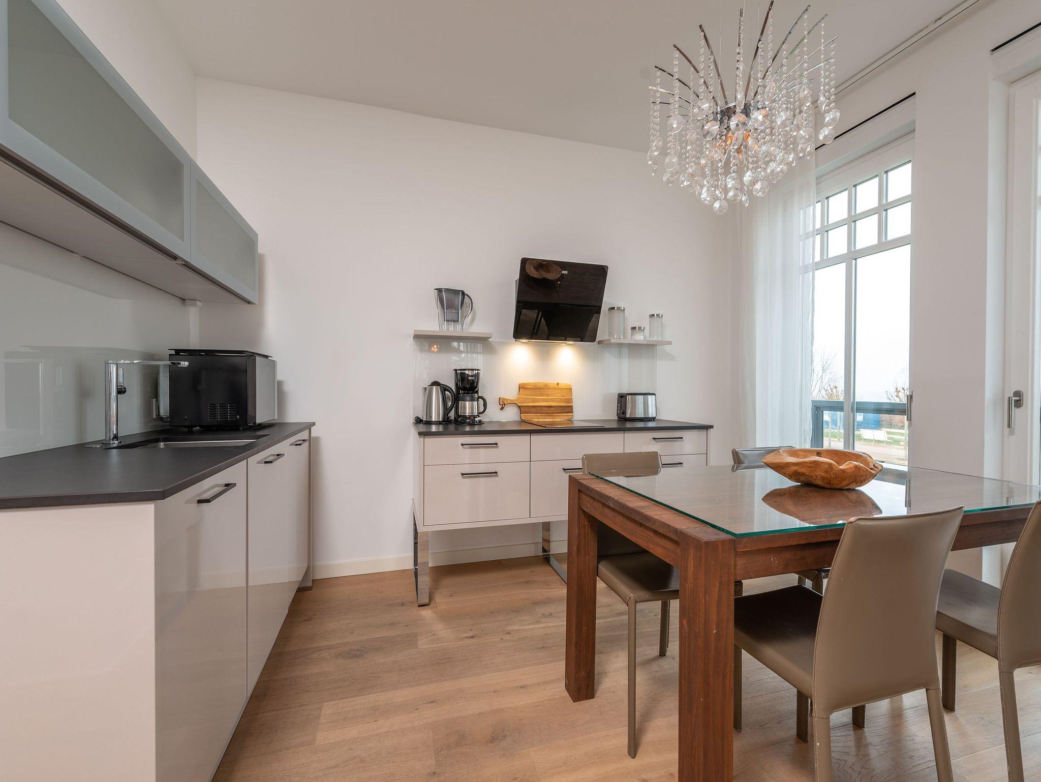 Urlaub beginnt da, wo Sie bereits beim Frühstück aufs Meer blicken! Das 77 Quadratmeter große Appartement 7 im 1. OG erfüllt Ihnen diesen Urlaubstraum. Lichtdurchflutete, helle 3 Zimmer und eine großzügige Raumaufteilung versprechen eine exklusive Auszeit am Meer für bis zu 4 Personen. Dafür sorgt auch der offene Wohn-Essbereich. Genießen Sie vom Balkon oder Design-Sofa aus den direkten Blick auf die Ostsee oder entspannen Sie vor dem Flat-TV. Ein Elektro-Kamin sorgt auch an kühleren Tagen für ein stimmungsvolles Ambiente und dient als Raumtrenner zum angrenzenden Küchenbereich mit Design-Küche. Zur Erleichterung Ihres Küchendienstes wurden hochwertige Geräte verbaut, die keine Wünsche beim Zubereiten Ihrer Speisen offen lassen. Hier befindet sich ebenfalls ein Essplatz für bis zu 4 Personen. Die dezent gestalteten Schlafzimmer sind jeweils mit Flat-TV und offenen Möbeln ausgestattet. Ein Doppelbett im Master-Schlafzimmer (1,80m x 2,00m) und ein Boxspringbett (1,60m x 2,00m) im zweiten Schlafzimmer sorgen für angenehmen Schlafkomfort. Das absolute Highlight bildet das Badezimmer mit Finnischer Sauna und XXL-Regendusche. Ein Bidet und WC sowie ein Doppelwaschtisch runden das Masterbad ab. Ein Gäste-WC ist darüber hinaus ebenfalls vorhanden. Ein Platz in der Tiefgarage ist bei Anreise für Sie reserviert. Für einen sorgenfreien Urlaubsstart sind die Betten bereits bezogen und Handtücher liegen für Sie bereit. Kostenfreies WLAN rundet dieses Appartement ab.
