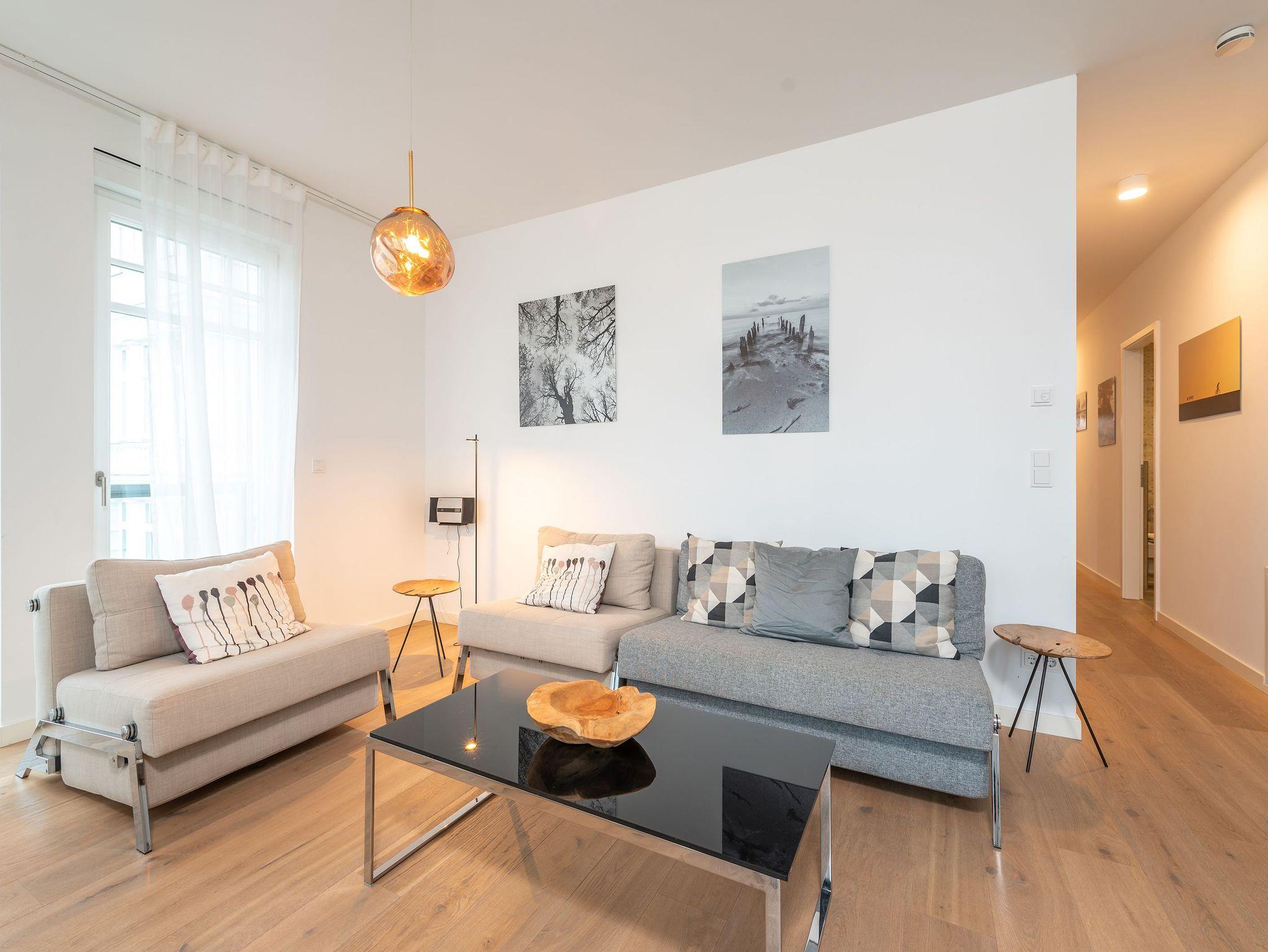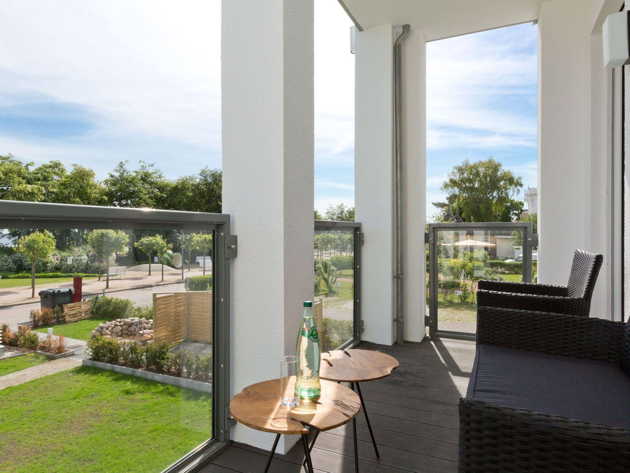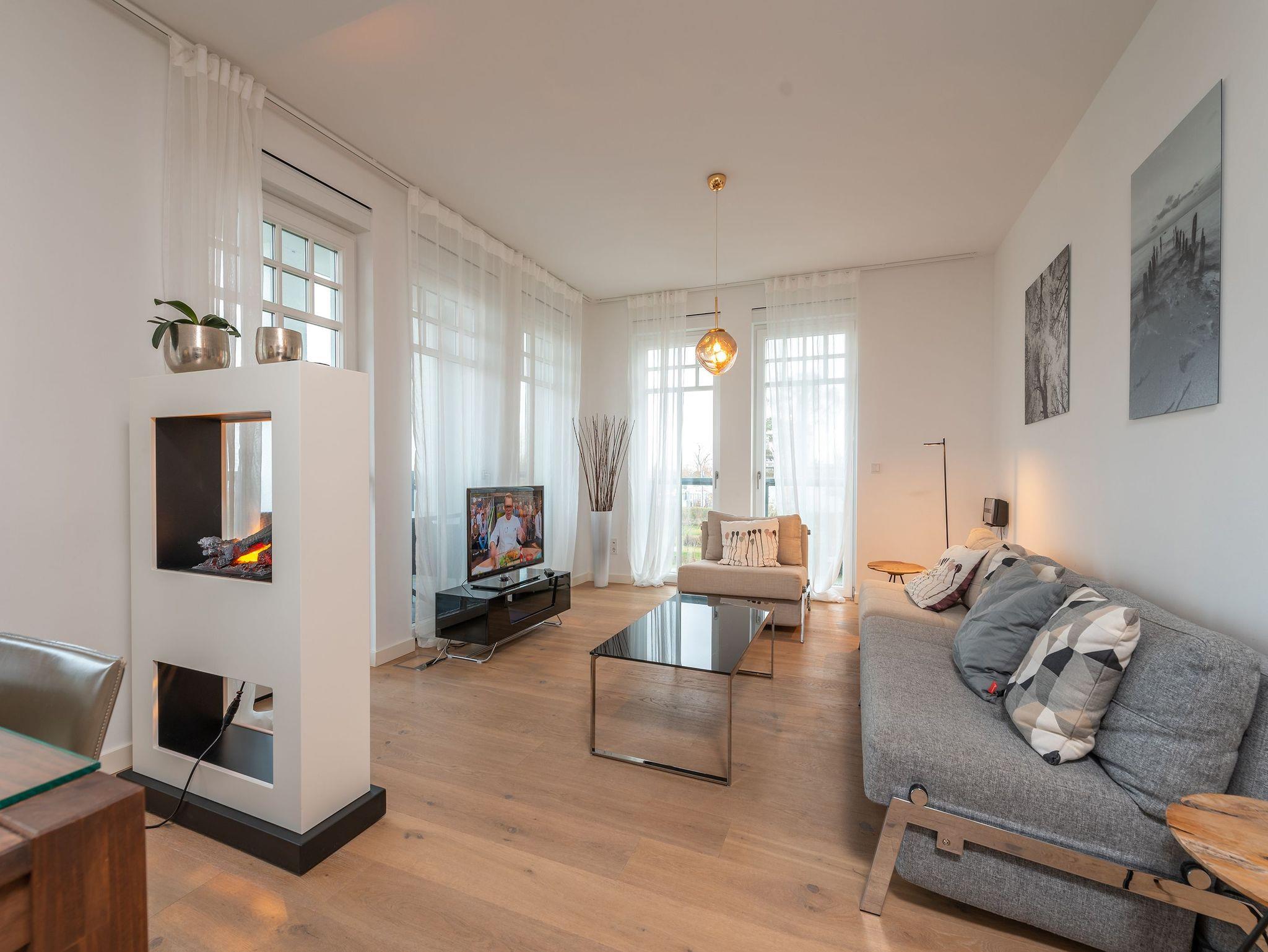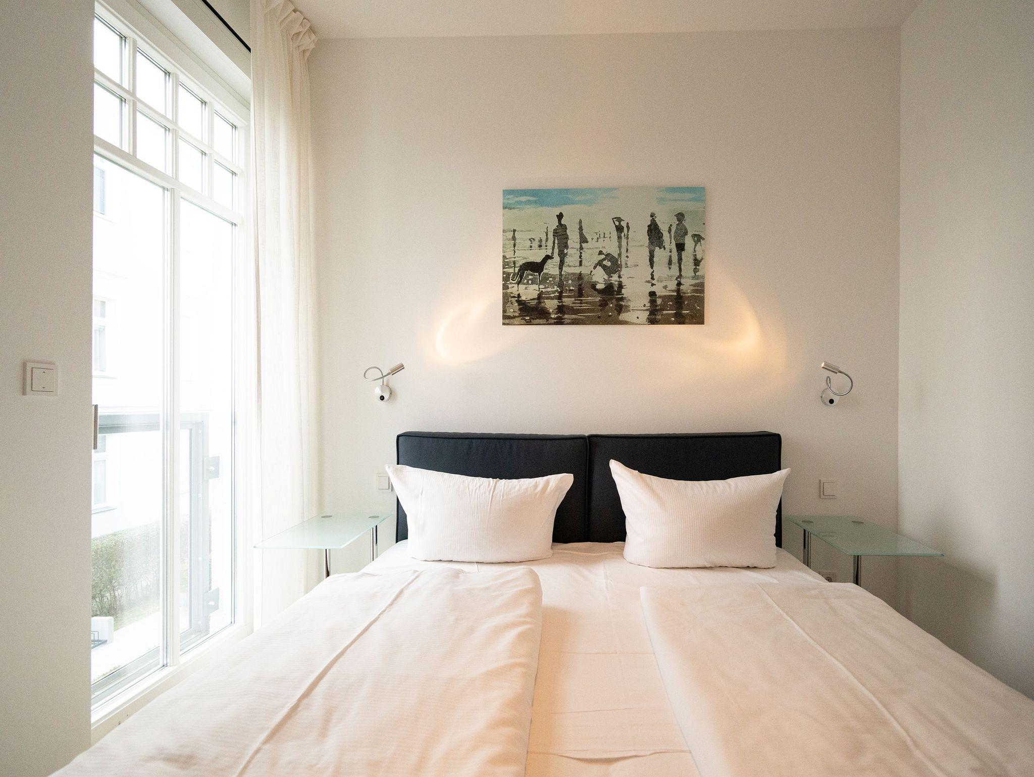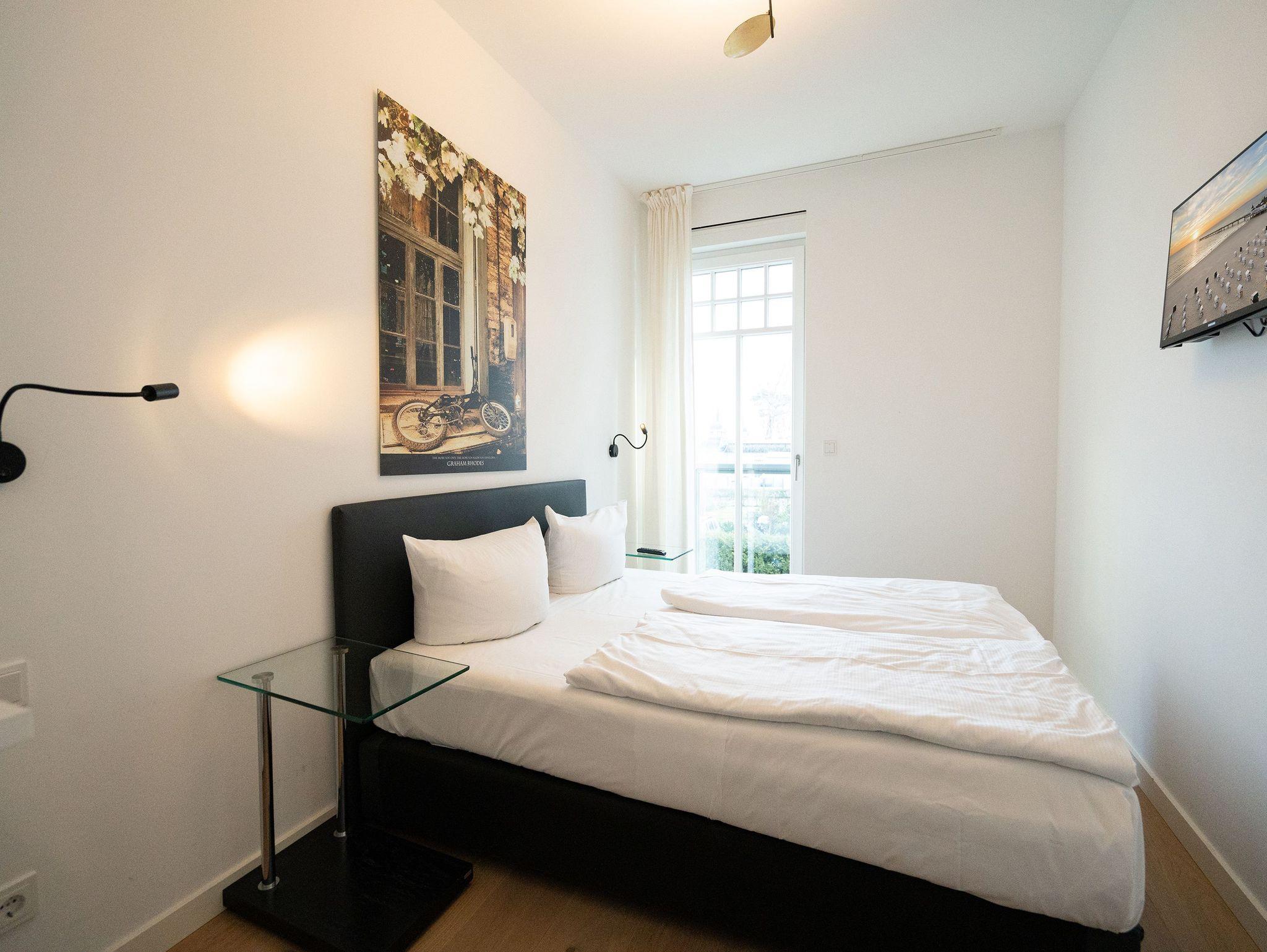 Urlaub beginnt da, wo Sie bereits beim Frühstück aufs Meer blicken! Das 77 Quadratmeter große Appartement 7 im 1. OG erfüllt Ihnen diesen Urlaubstraum. Lichtdurchflutete, helle 3 Zimmer und eine großzügige Raumaufteilung versprechen eine exklusive Auszeit am Meer für bis zu 4 Personen. Dafür sorgt auch der offene Wohn-Essbereich. Genießen Sie vom Balkon oder Design-Sofa aus den direkten Blick auf die Ostsee oder entspannen Sie vor dem Flat-TV. Ein Elektro-Kamin sorgt auch an kühleren Tagen für ein stimmungsvolles Ambiente und dient als Raumtrenner zum angrenzenden Küchenbereich mit Design-Küche. Zur Erleichterung Ihres Küchendienstes wurden hochwertige Geräte verbaut, die keine Wünsche beim Zubereiten Ihrer Speisen offen lassen. Hier befindet sich ebenfalls ein Essplatz für bis zu 4 Personen. Die dezent gestalteten Schlafzimmer sind jeweils mit Flat-TV und offenen Möbeln ausgestattet. Ein Doppelbett im Master-Schlafzimmer (1,80m x 2,00m) und ein Boxspringbett (1,60m x 2,00m) im zweiten Schlafzimmer sorgen für angenehmen Schlafkomfort. Das absolute Highlight bildet das Badezimmer mit Finnischer Sauna und XXL-Regendusche. Ein Bidet und WC sowie ein Doppelwaschtisch runden das Masterbad ab. Ein Gäste-WC ist darüber hinaus ebenfalls vorhanden. Ein Platz in der Tiefgarage ist bei Anreise für Sie reserviert. Für einen sorgenfreien Urlaubsstart sind die Betten bereits bezogen und Handtücher liegen für Sie bereit. Kostenfreies WLAN rundet dieses Appartement ab.