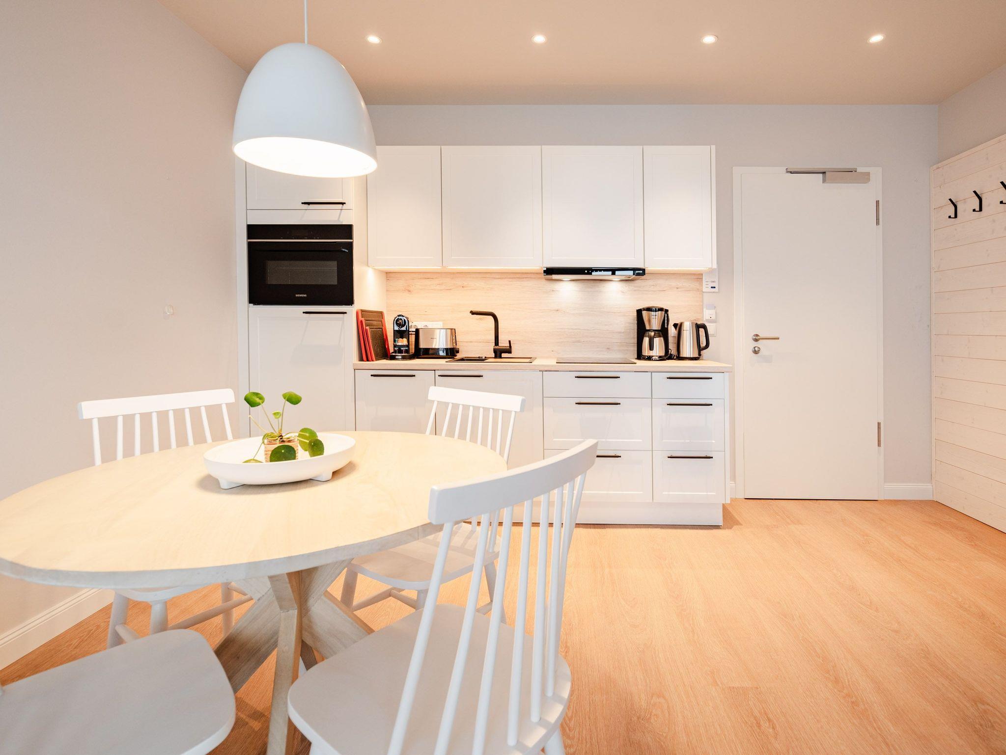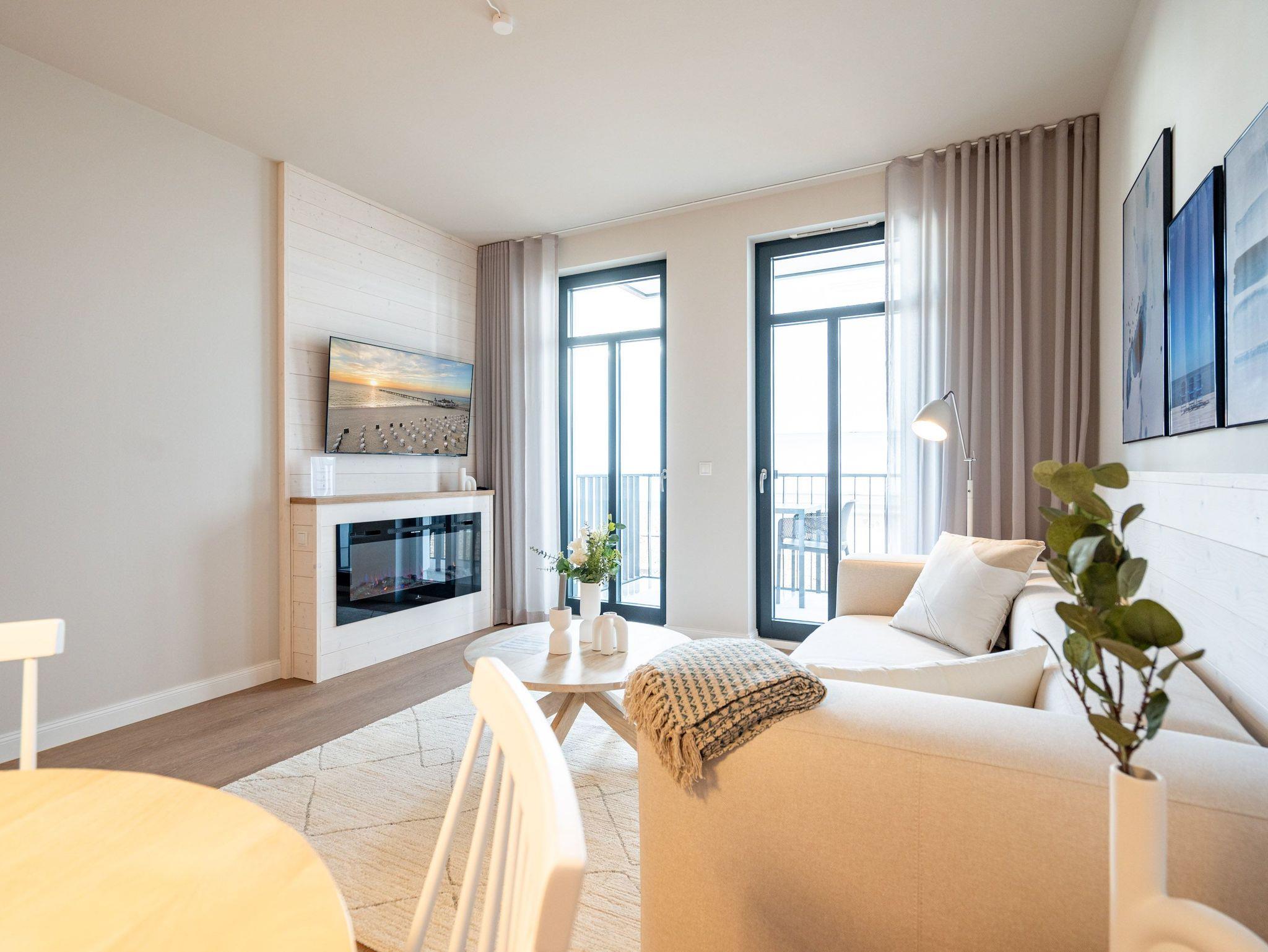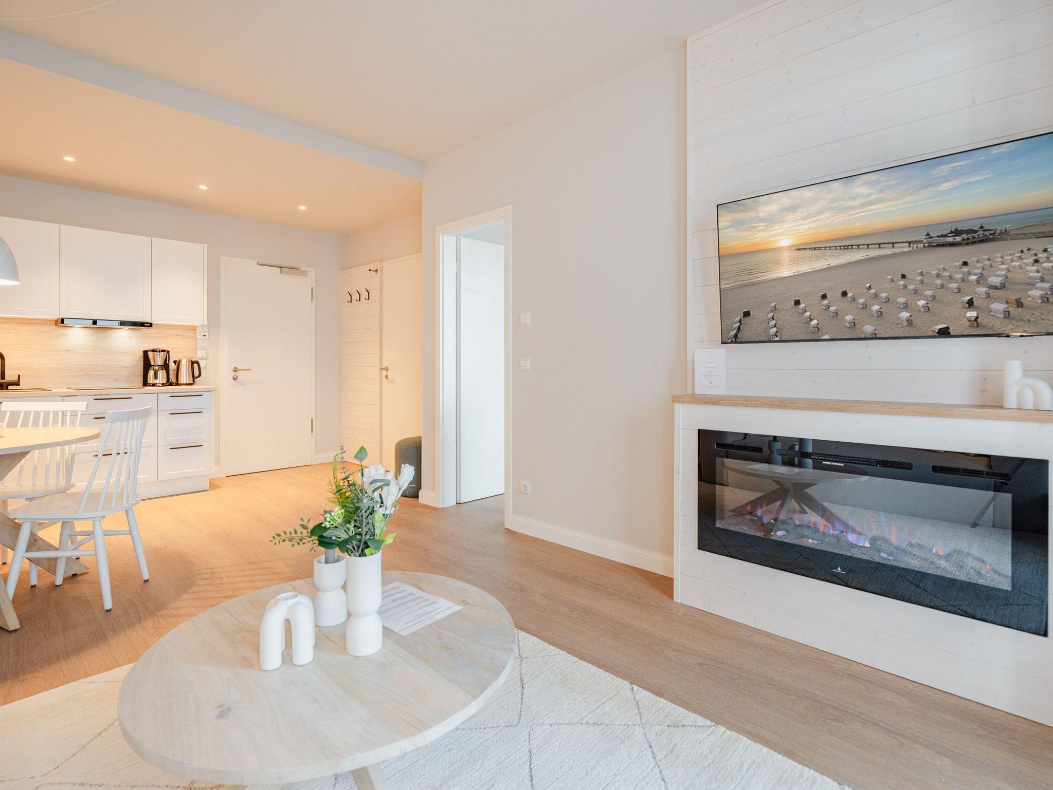 Das gemütliche 2-Raum-Appartement A1.2 im ersten Obergeschoss wartet nur darauf, seine beiden Gäste mit seiner harmonischen und ausgleichenden Atmosphäre in entspannte Urlaubsstimmung zu versetzen. Auf 50 Quadratmetern ist hier alles so aufeinander abgestimmt, dass es Ihnen an nichts fehlen wird, was Sie für unvergessliche Glücksmomente benötigen. Eine stilvolle und hochwertige Einrichtung heißt Sie schon beim Eintreten in das Wohn-Esszimmer herzlich willkommen. Lichtdurchflutet ist es eine echte Wohlfühloase mit einem gemütlichen Sofa, einem 50-Zoll-Flachbildfernseher und einem Elektrokamin (ohne Wärmeabgabe). Hier fällt das Relaxen und Ausspannen leicht. Eine vollausgestattete Küchenzeile lädt dazu ein, sich für die kulinarischen Gaumenfreuden selbst zu betätigen. Der schöne Esstisch eignet sich ideal zum anschließenden Genießen und Zusammensitzen. In dem großen Boxspringdoppelbett (1,80m x 2,00m) im Schlafzimmer werden die Nächte ein Traum. Im Schlafzimmer befindet sich ein weiterer, 43-Zoll-Flachbildfernseher sowie ein geräumiger Kleiderschrank und eine Kommode. Das Appartement besitzt sogar zwei Balkone, auf denen Sie die frische Ostseeluft tief in sich aufnehmen können und seitlich auch Blick auf die Ahlbecker Seebrücke haben. Gönnen Sie Ihren Augen von den Balkonmöbeln oder der Sonnenliege aus ein bisschen Weitsicht. Sie werden es sofort spüren, wie erholsam sich das auf ihre Seele auswirkt. Zugang zu den beiden Nordbalkonen haben Sie jeweils vom Wohnzimmer und vom Schlafzimmer. Das innenliegende Bad verfügt über eine Dusche, ein WC, einen Waschtisch und eine Infrarotsauna. Hier können Sie bei wohliger Wärme vollkommen abschalten und runterkommen. Zum Appartement gehört ein PKW-Stellplatz in der Tiefgarage, die Sie bequem über den Fahrstuhl erreichen können. Lassen Sie sich also fallen in das Rund-um-Sorglos-Gefühl und genießen Sie die Annehmlichkeiten dieser charmanten Ferienwohnung.