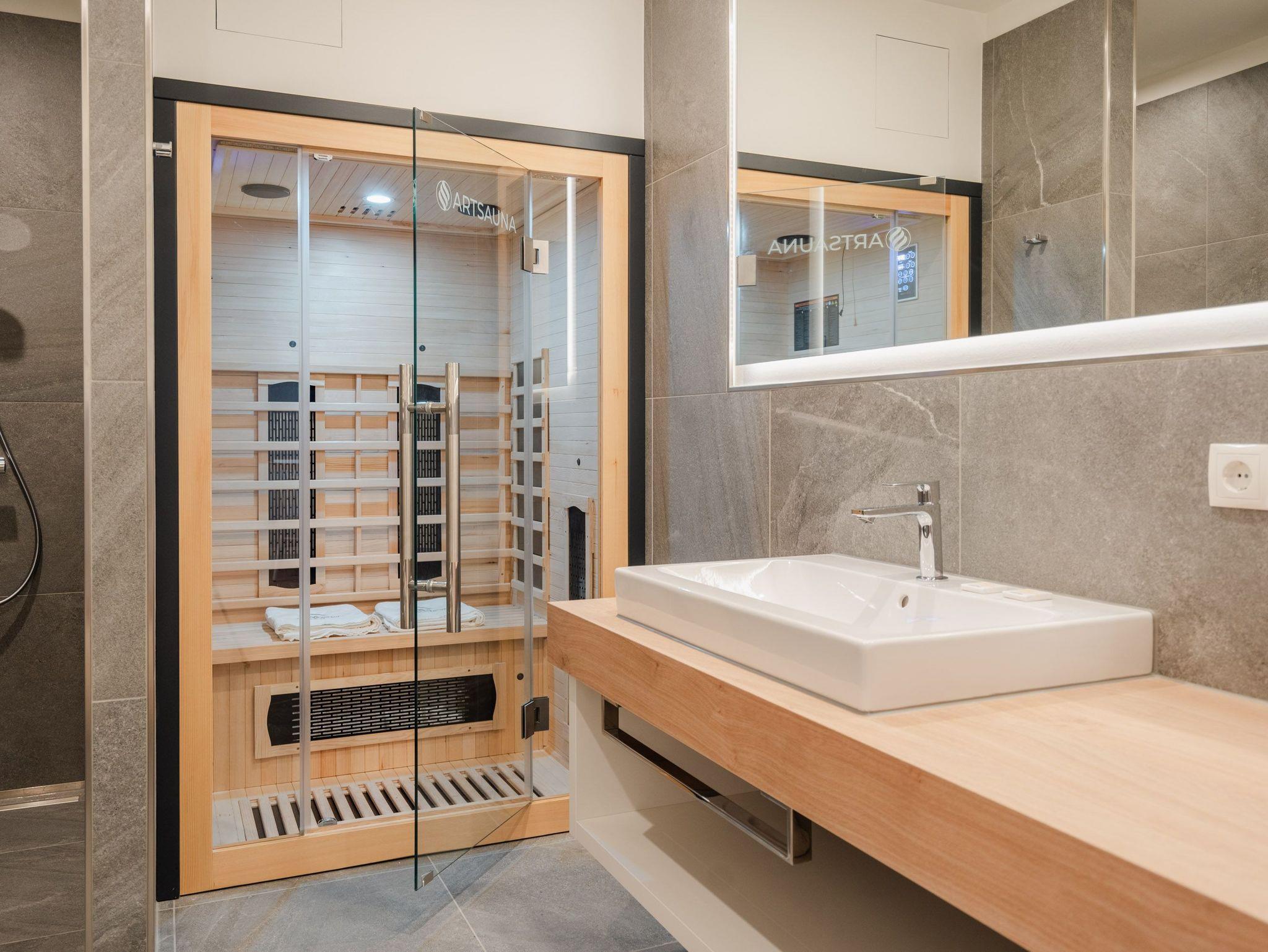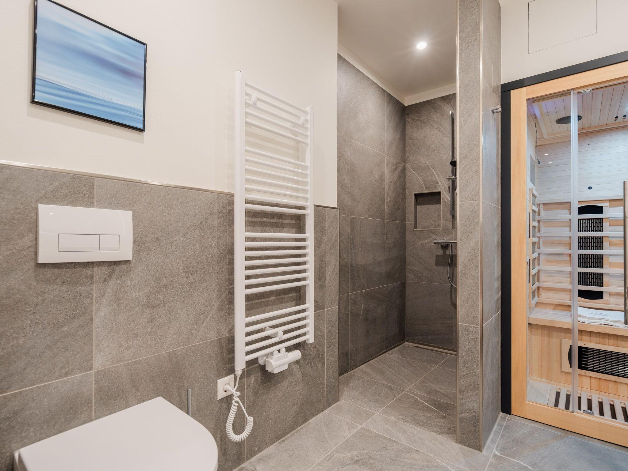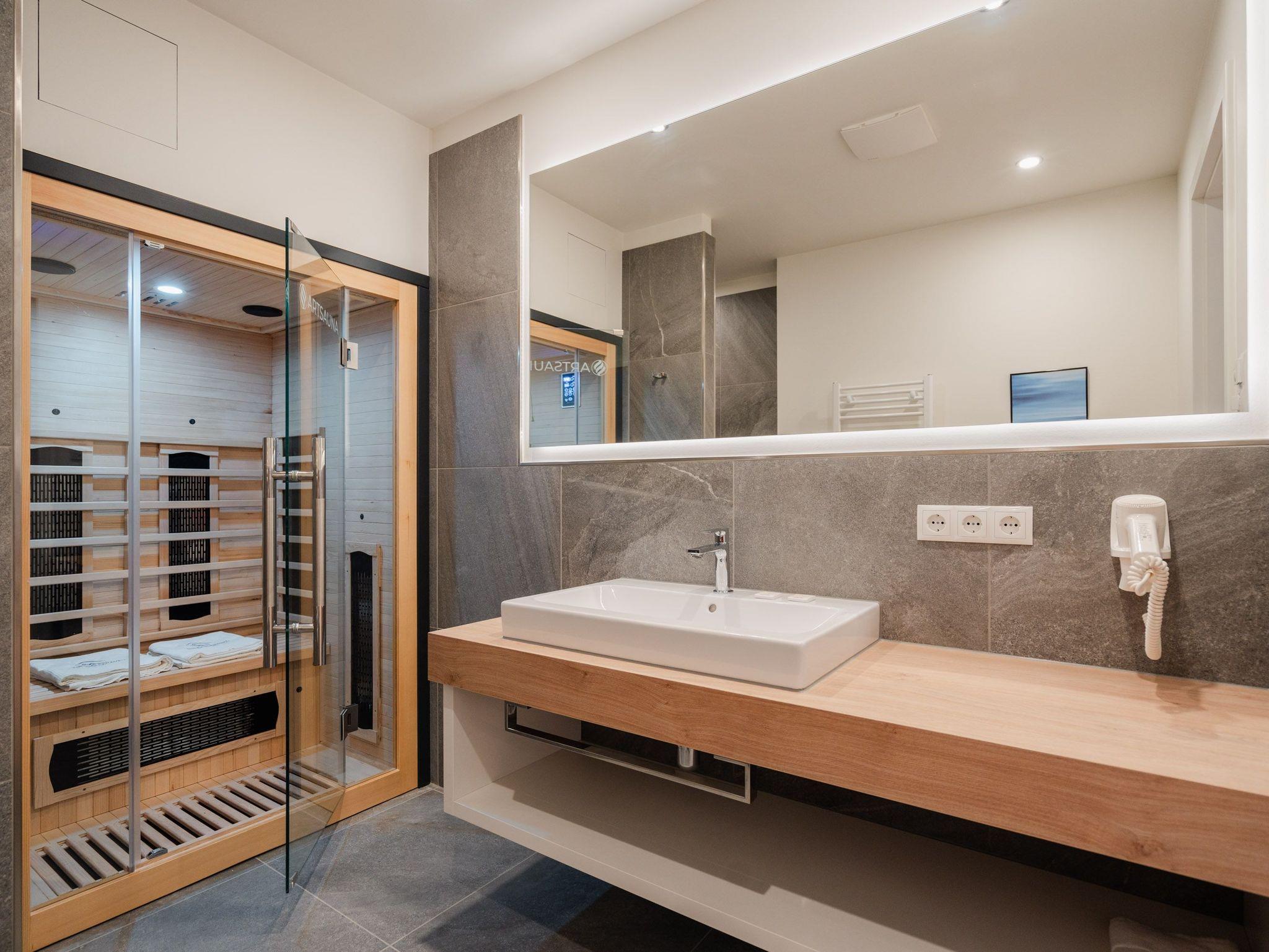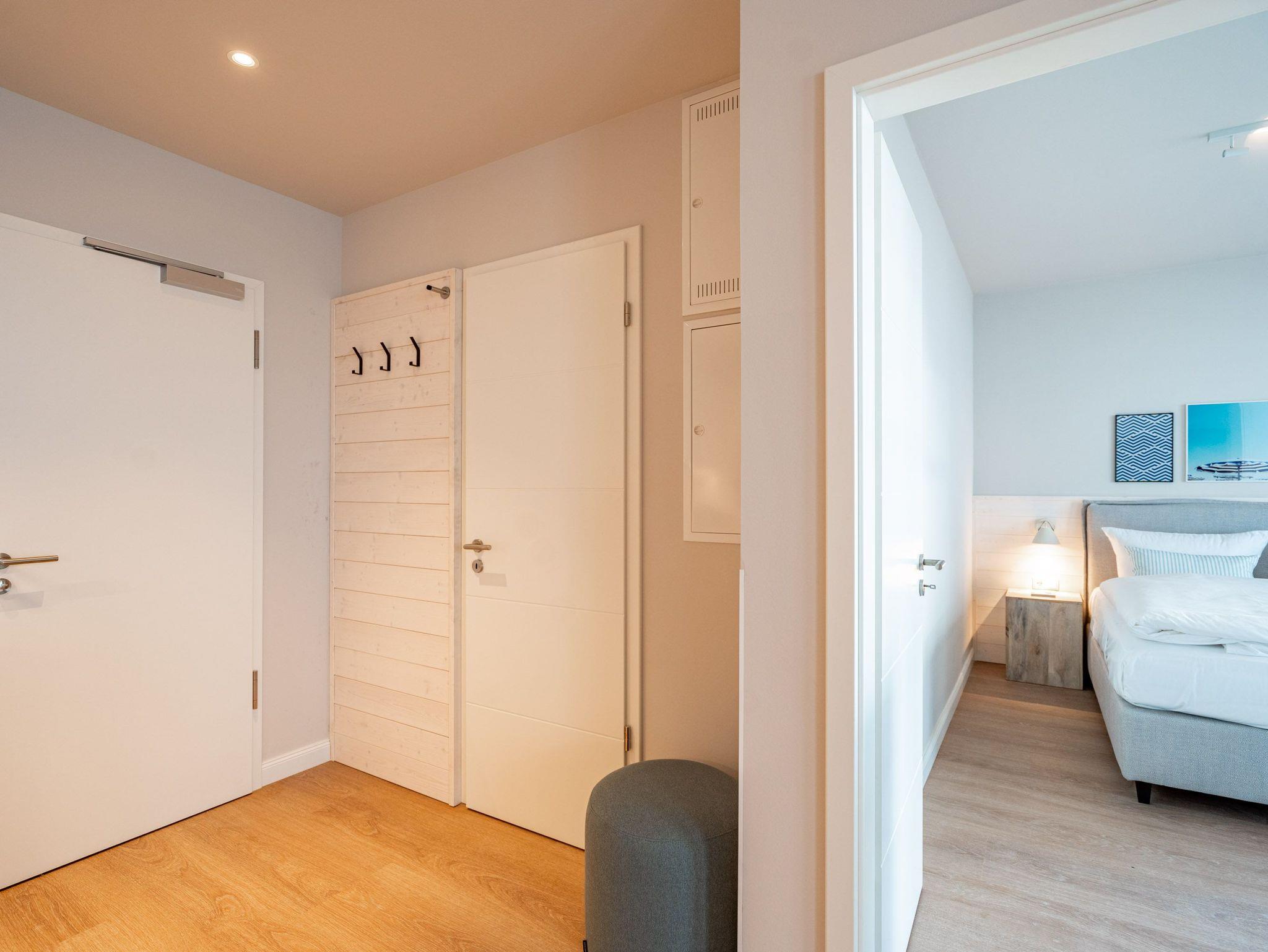 Das gemütliche 2-Raum-Appartement A1.2 im ersten Obergeschoss wartet nur darauf, seine beiden Gäste mit seiner harmonischen und ausgleichenden Atmosphäre in entspannte Urlaubsstimmung zu versetzen. Auf 50 Quadratmetern ist hier alles so aufeinander abgestimmt, dass es Ihnen an nichts fehlen wird, was Sie für unvergessliche Glücksmomente benötigen. Eine stilvolle und hochwertige Einrichtung heißt Sie schon beim Eintreten in das Wohn-Esszimmer herzlich willkommen. Lichtdurchflutet ist es eine echte Wohlfühloase mit einem gemütlichen Sofa, einem 50-Zoll-Flachbildfernseher und einem Elektrokamin (ohne Wärmeabgabe). Hier fällt das Relaxen und Ausspannen leicht. Eine vollausgestattete Küchenzeile lädt dazu ein, sich für die kulinarischen Gaumenfreuden selbst zu betätigen. Der schöne Esstisch eignet sich ideal zum anschließenden Genießen und Zusammensitzen. In dem großen Boxspringdoppelbett (1,80m x 2,00m) im Schlafzimmer werden die Nächte ein Traum. Im Schlafzimmer befindet sich ein weiterer, 43-Zoll-Flachbildfernseher sowie ein geräumiger Kleiderschrank und eine Kommode. Das Appartement besitzt sogar zwei Balkone, auf denen Sie die frische Ostseeluft tief in sich aufnehmen können und seitlich auch Blick auf die Ahlbecker Seebrücke haben. Gönnen Sie Ihren Augen von den Balkonmöbeln oder der Sonnenliege aus ein bisschen Weitsicht. Sie werden es sofort spüren, wie erholsam sich das auf ihre Seele auswirkt. Zugang zu den beiden Nordbalkonen haben Sie jeweils vom Wohnzimmer und vom Schlafzimmer. Das innenliegende Bad verfügt über eine Dusche, ein WC, einen Waschtisch und eine Infrarotsauna. Hier können Sie bei wohliger Wärme vollkommen abschalten und runterkommen. Zum Appartement gehört ein PKW-Stellplatz in der Tiefgarage, die Sie bequem über den Fahrstuhl erreichen können. Lassen Sie sich also fallen in das Rund-um-Sorglos-Gefühl und genießen Sie die Annehmlichkeiten dieser charmanten Ferienwohnung.