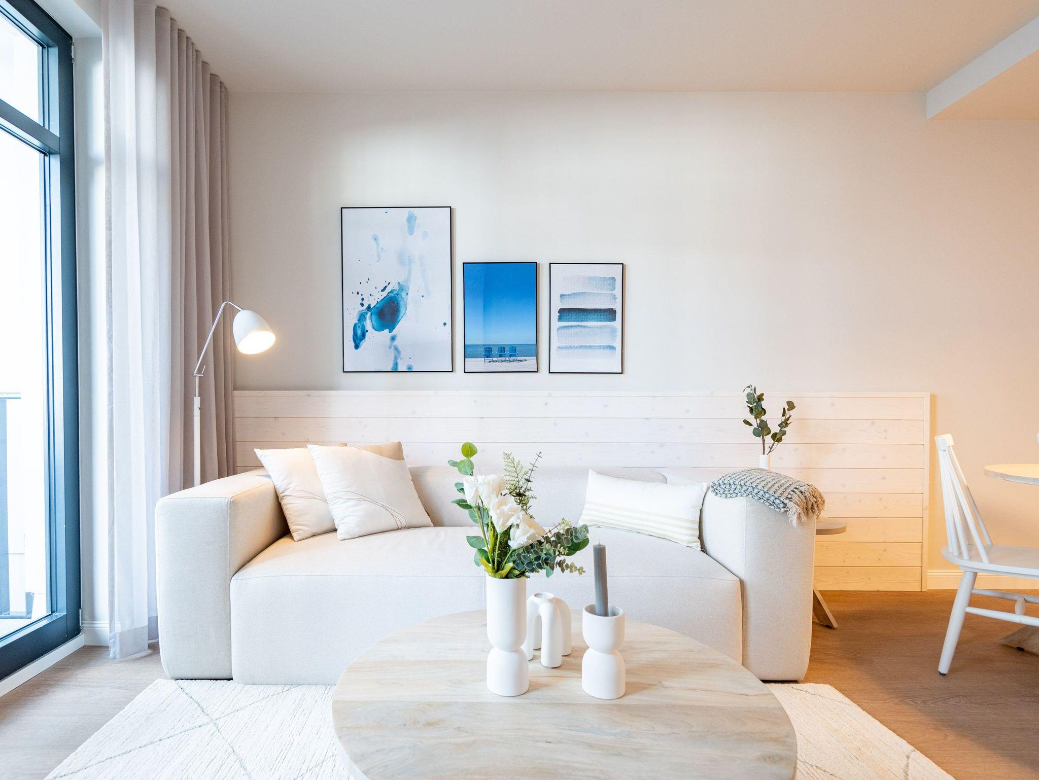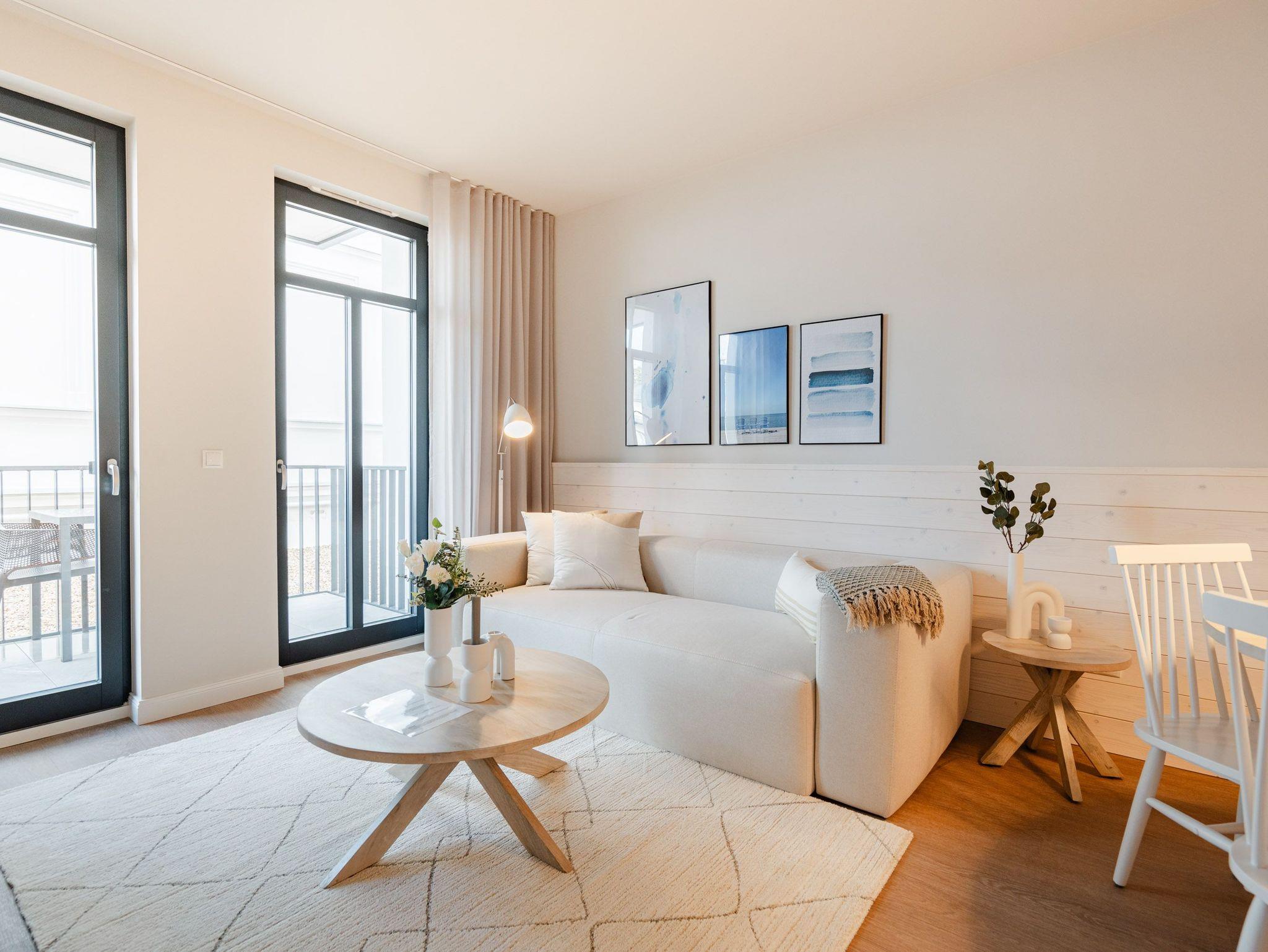 Die 2024 fertig gestellte Strandterrasse liegt direkt an der belebten Strandpromenade und bietet einen einzigartigen Ausblick auf die Grand Dame der historischen Seebrücken sowie die historische Konzertmuschel, einem beliebten Treffpunkt für Kunst und Kultur. Dahinter liegt die Ostsee ? ein Panorama, das zu den schönsten in den Kaiserbädern gehört. Es ist wie das Abtauchen in eine andere Zeit. In eine Zeit, in der man mit Stock, Sonnenschirm und Hut fürs „Sehen und gesehen werden“ über die Promenade schlenderte; aber auch in eine Zeit, in der ? damals wie heute ? Zeit einmal für eine kurze Weile keine Rolle spielt. Weil man angekommen ist im Loslassen, Entspannen und Genießen. Es ist dieser besondere Geruch nach Meeresluft und Freiheit, der in Erinnerung bleibt. Dazu die Bilder, die man mitnimmt. Von langen Strandspaziergängen, vom Lachen in fröhlich schäumenden Ostseewellen, von der Zeit in einem wunderschönen Urlaubsdomizil. Denn genau das ist die Strandterrasse mit ihren 56 modernen und exklusiven Ferienappartements direkt gegenüber der Ahlbecker Seebrücke. Die Ein-, Zwei- oder Dreizimmerwohnungen ? zwischen 40 und 70 Quadratmeter groß ? sind von einer Innenarchitektin gemeinsam mit unserem Erfahrungsschatz an Gästewünschen mit viel Liebe zum Detail und ganz individuell konzipiert worden. Entspannung und Wohlfühlen stehen an erster Stelle. Alles ist aufeinander abgestimmt und sorgt für eine gemütliche Atmosphäre. Wählen Sie zwischen einem Domizil in einem hellen, sandfarbenen Designkonzept oder einem Appartement mit anthrazitfarbenen Farbakzenten. Alle Appartements verfügen gleichermaßen über eine stilvolle und komfortable Einrichtung, die passgenau angefertigt worden ist, sowie über moderne Küchen und Bäder. Jedem Schlafzimmer ist ein eigenes Bad mit Dusche zugeordnet (außer App. B4.5). Die Appartements besitzen fast alle einen Balkon ? viele schauen sogar zur Ostsee hinaus. Die meisten Feriendomizile haben einen Elektrokamin und Infrarotsaunen. Im Erdgeschoss befindet sich ein separater Gemeinschaftsraum für Fahrräder. Außerdem besteht die Möglichkeit, im Gemeinschaftswaschraum 2 Waschmaschinen [&] Trockner zu nutzen. Ergänzt wird das Angebot durch eine Gemeinschaftssauna, die täglich von 11:00 bis 22:00 Uhr nutzbar ist. In der Tiefgarage (Einfahrtshöhe 2,03 Meter) steht für jede Wohnung 1 Pkw-Stellplatz zur Verfügung. Ist alles zur Zufriedenheit untergebracht? Dann kann der Urlaub ja beginnen. Und beim Blick vom Balkon über die Ostsee treffen sich zum Sonnenaufgang das Heute und das Damals. Gelassenheit legt sich beim Gang hinunter an den Strand auf die Seele. Jetzt darf die Zeit stehenbleiben.