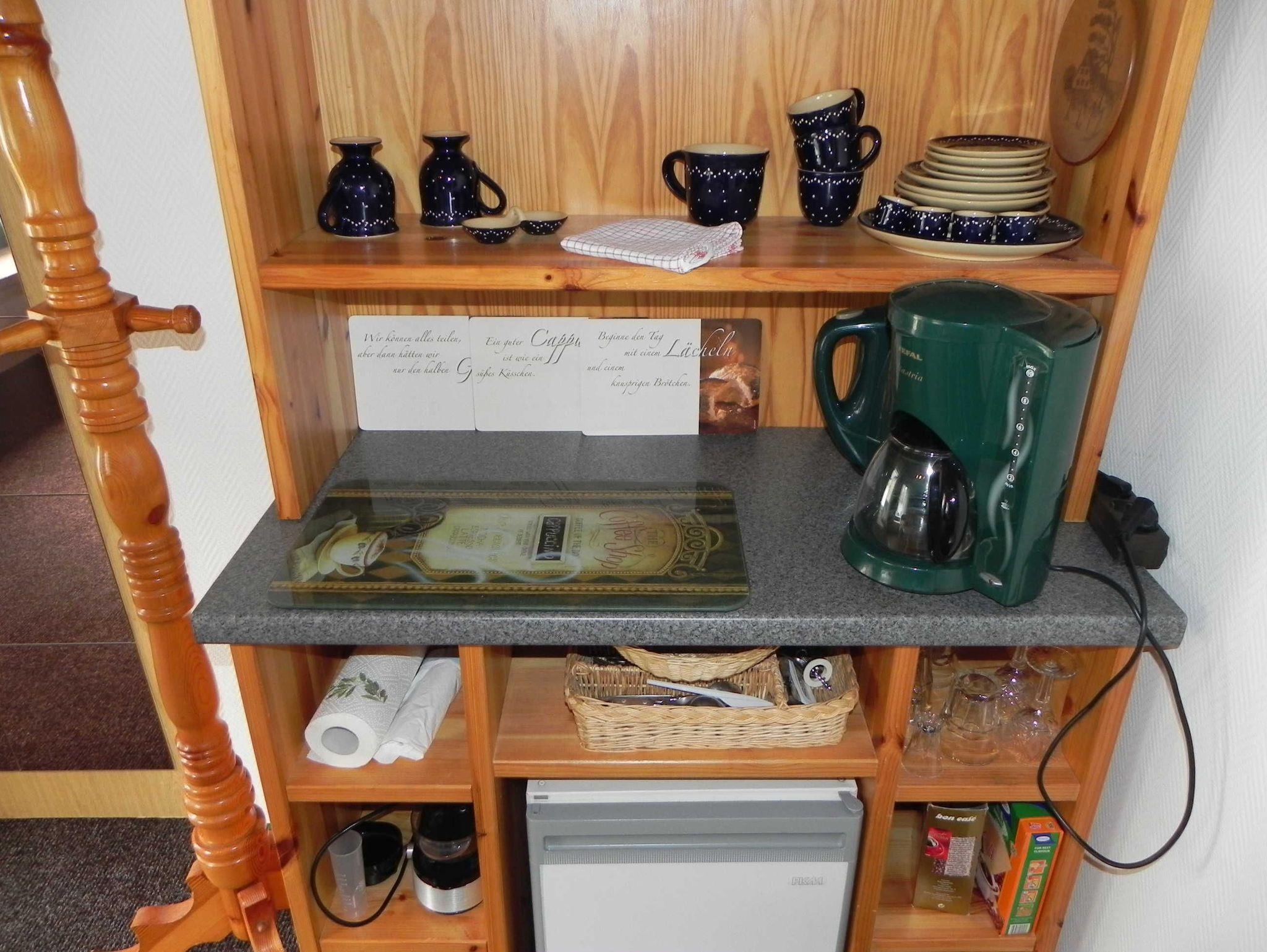Herzlich willkommen in diesem gemütlichen Nichtraucher-Ferienzimmer! Mit einer Größe von ca. 25 qm bietet es ausreichend Platz für zwei Personen und ist funktionell ausgestattet. Sie finden hier ein komfortables Doppelbett (1,80 m x 1,90 m), ein praktisches Kleiderregal, eine einladende Sitzgelegenheit mit Tisch und zwei Stühlen sowie eine Kommode und einen Flachbild-TV für Ihre Unterhaltung. Bitte beachten Sie, dass keine Kochgelegenheit vorhanden ist. Für die Zubereitung Ihres Frühstücks stehen Ihnen jedoch eine Kaffeemaschine, ein Toaster, ein Kühlschrank und Geschirr zur Verfügung. Das Tageslicht-Bad ist mit einer Dusche und WC ausgestattet. Genießen Sie auch die kleine, möblierte Terrasse, die perfekt zum Entspannen einlädt. Hier können Sie morgens Ihren Kaffee genießen oder den Abend bei einem Glas Wein ausklingen lassen. Die Erstausstattung mit Bettwäsche und Handtüchern ist selbstverständlich im Preis enthalten.
