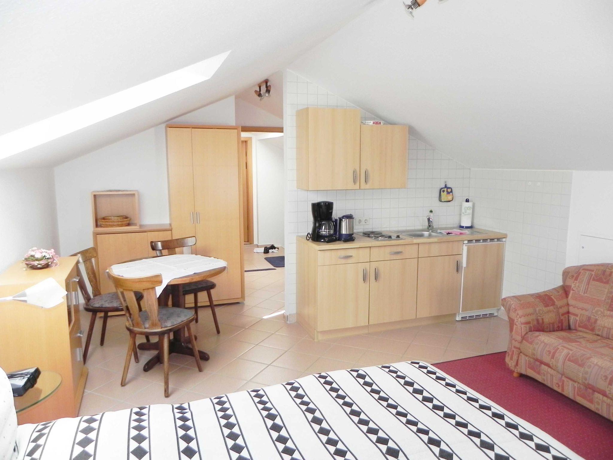 Die 35 qm große Wohnung in der Mansarde (drittes Obergeschoss) bietet komfortabel Platz für zwei Personen. Der helle Wohn-/Schlafraum ist mit einem Doppelbett, einem Sofa, Kabel-TV und einem kleinen Essplatz gemütlich eingerichtet - ideal für entspannte Stunden. Die angrenzende, gut ausgestattete Pantryküche mit 2-Platten-Herd, Kühlschrank, Wasserkocher und Kaffeemaschine ermöglicht eine bequeme Selbstversorgung. Abgerundet wird die Wohnung durch ein freundliches Tageslicht-Bad mit Dusche und WC, das den Komfort Ihres Aufenthalts perfekt ergänzt.