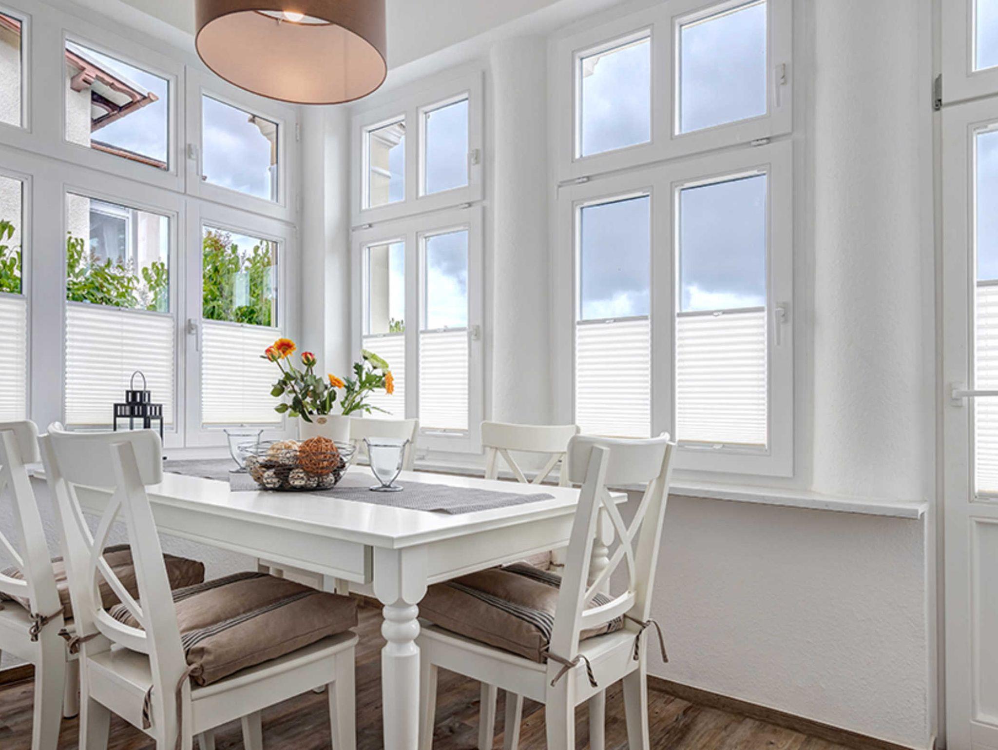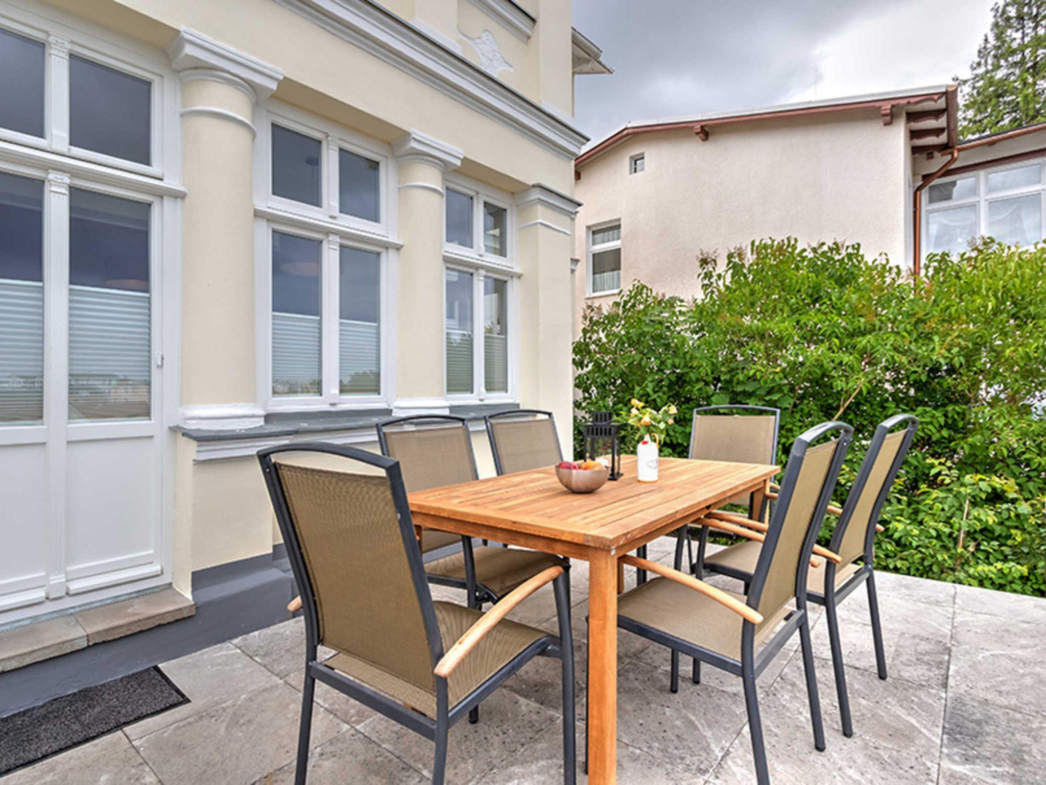 Schicke 4-Zimmer-Wohnung für bis zu 5 Personen mit Veranda und TERRASSE. Die Wohnung ist modern und dennoch gemütlich eingerichtet und komfortabel ausgestattet. Sie wird 2018 komplett renoviert, mit Fußbodenheizung! Die Wohnung verfügt über drei separate Schlafzimmer (eines davon für eine Person und eines mit zugehörigem ensuite-Duschbad), Wohnzimmer mit Küchenzeile, Essplatz in der Veranda und ein weiteres Bad mit Wanne und Dusche. Die Wohnung verfügt weiter über einen Eingangsflur mit Garderobe. Aus der Veranda gelangt man auf die möblierte Terrasse und in den Garten. Ein Pkw-Stellplatz ist inklusive. Die Villa Margarete steht etwas erhöht in der Bergstrasse, wodurch sich ein schöner Blick ergibt. Die Wohnung befindet sich im EG, etwa 300m zur Strandpromenade. Zum Ortszentrum und der bekannten Ahlbecker Seebrücke sind es ca. 8-10 Minuten zu Fuß. Die Zufahrt mit dem Auto erfolgt über die Ferdinand-Egelinski-Straße.