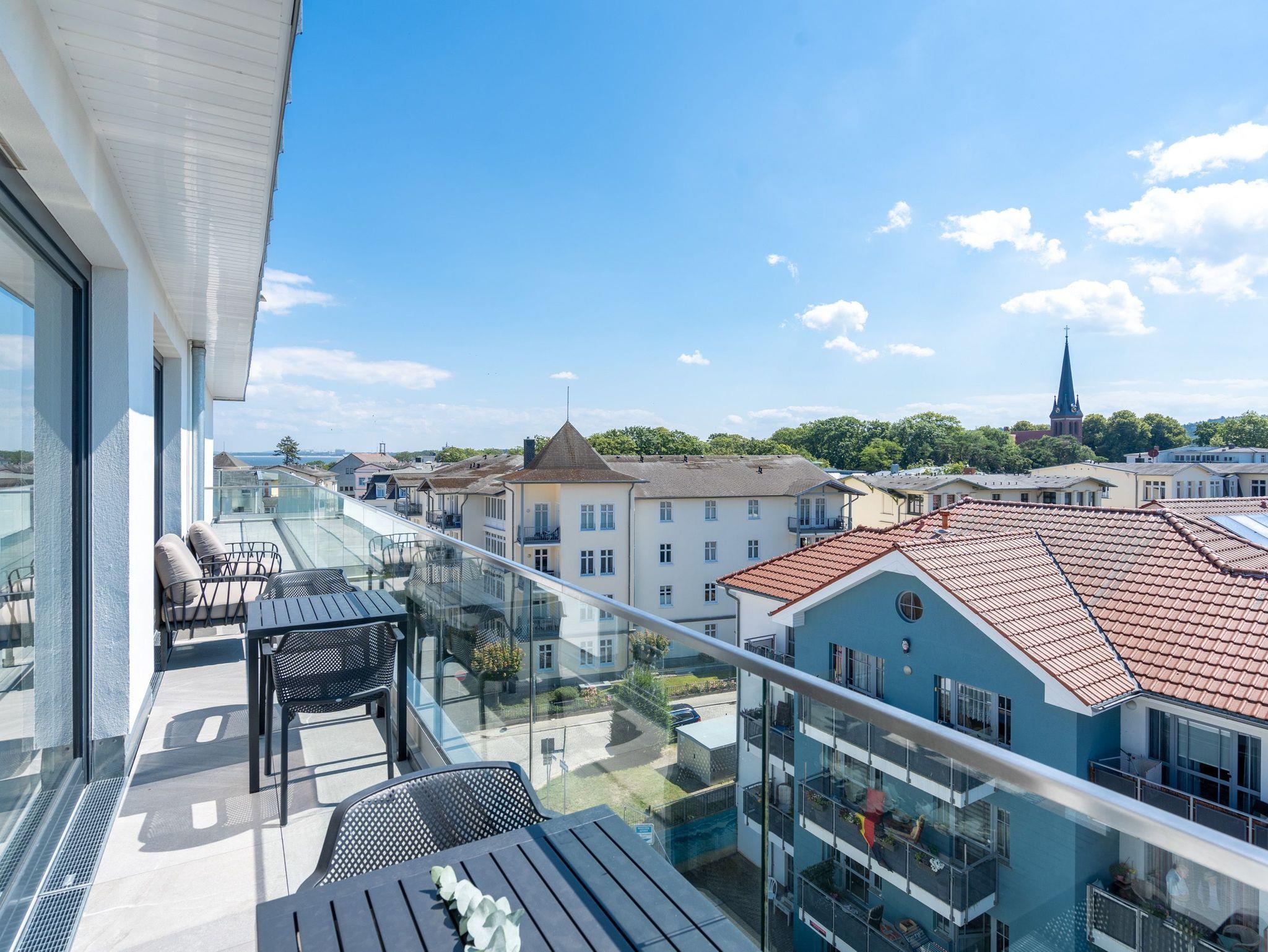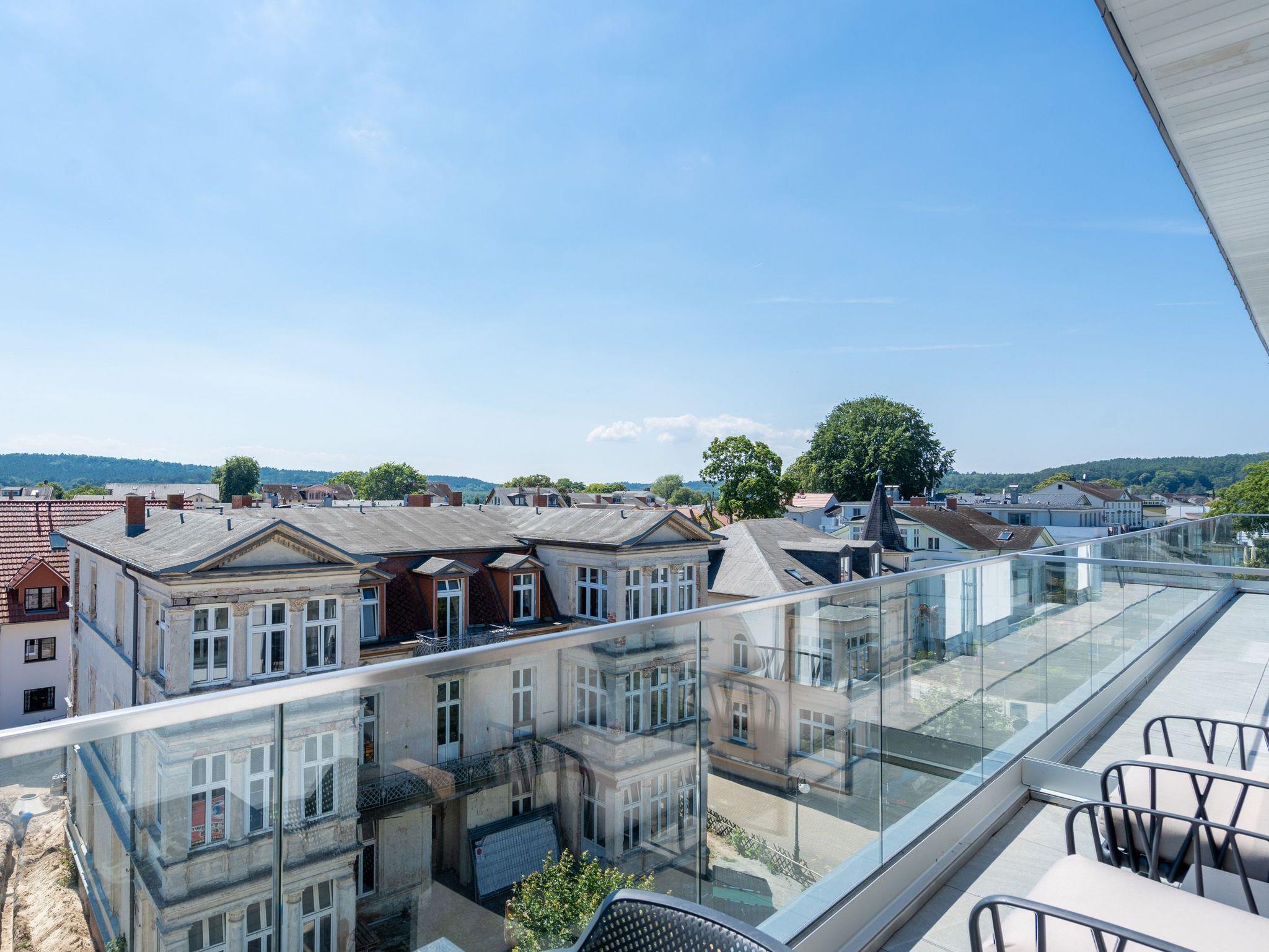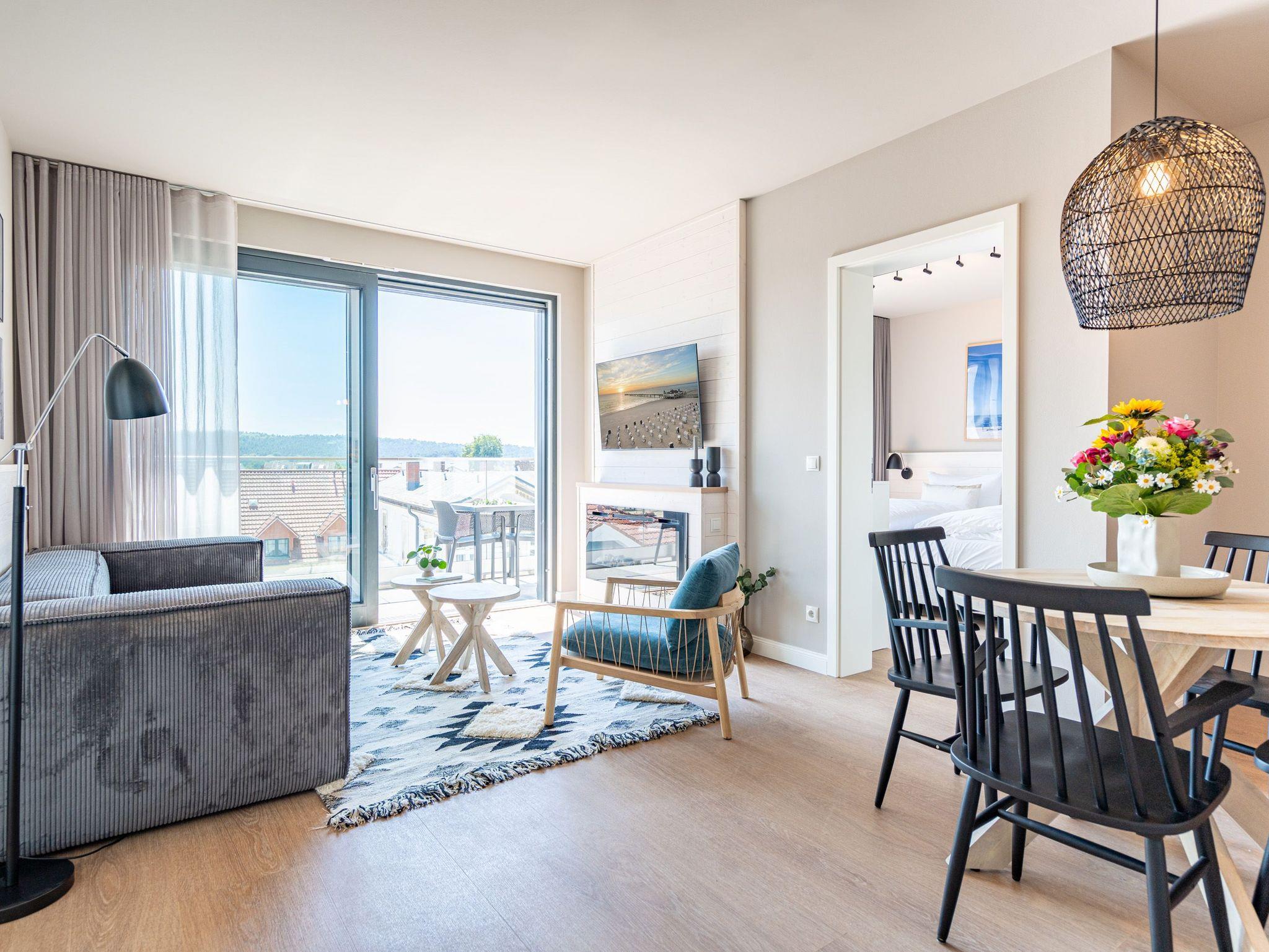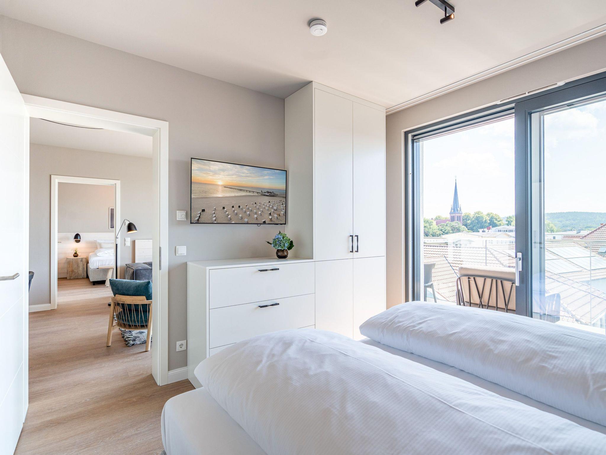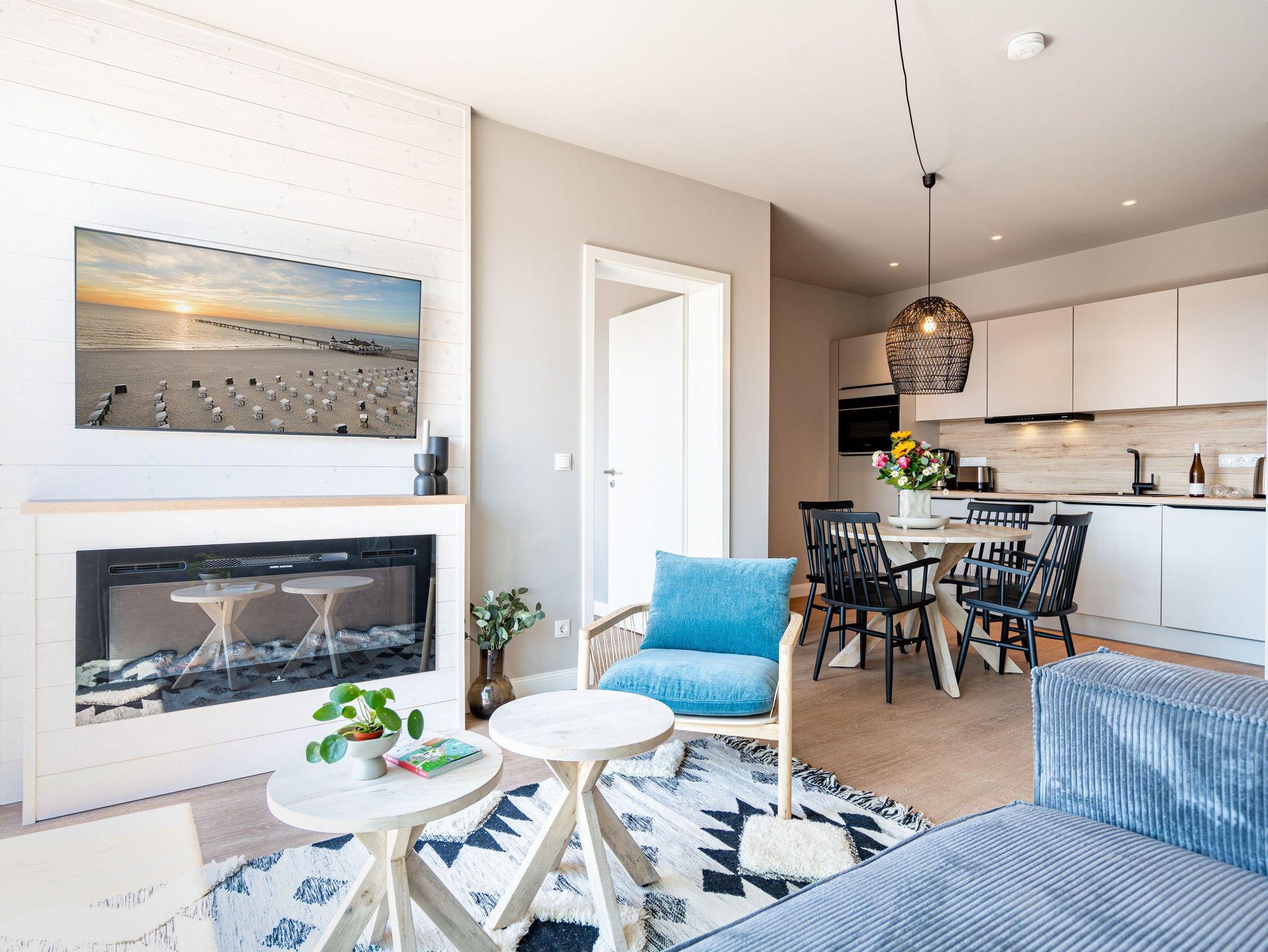 Über den Dächern des Seebades Ahlbeck lebt und urlaubt es sich im 3-Raum-Appartement B 4.5 (Haus B) in der 4. Etage der Strandterrasse ganz besonders entspannt. Bis zu 4 Personen können in den 68 Quadratmetern in unmittelbarer Nähe zur Promenade und zum Strand gemeinsam eine unvergesslich schöne Auszeit erleben. Der große Süd-Balkon mit 2 Tischen und je 2 Stühlen bietet einen wundervollen Blick über das altehrwürdige Kaiserbad mit seinen schicken Villen bis hinüber zur Ahlbecker Kirche mit ihrer Turmuhr. Ein wunderschön eingerichtetes Appartement erwartet Sie im Inneren, das mit allem ausgestattet ist, was man sich für erholsame Tage am Meer nur wünschen kann. Eine offene Küche eignet sich, Dank der hochwertigen Elektronikausstattung mit einem 4-Platten-Induktionsherd und vielem mehr, ideal zur Zubereitung ausgefeilter Mahlzeiten. Für den perfekten Morgenkaffee sorgt eine Nespresso-Kapselmaschine. Das geräumige Wohnzimmer ist eine Wohlfühlarea mit kuscheliger Cordcouch, Sessel, Elektrokamin (ohne Wärmeabgabe) und einem großen Flat-TV (50 Zoll). Ein schöner Esstisch lädt zum Dinieren und gemütlichen Zusammensitzen ein. Die Wohnung verfügt über zwei Schlafzimmer, die jeweils mit einem bequemen Boxspringdoppelbett (1,80m x 2,00m), einem geräumigen Kleiderschrank und einem Flat-TV (43 Zoll) ausgestattet sind. Beide Schlafzimmer und das Wohnzimmer haben Zugang zum Balkon. Genießen Sie hier die energieaufladenden Sonnenstunden, die Usedom zu bieten hat, und lassen Sie Ihre Tage auf dem Balkon bei einem der traumhaften Sonnenuntergänge ausklingen. Ein modernes Badezimmer mit Dusche, Waschtisch und WC sowie ein zusätzliches Gäste-WC sorgen für Komfort und ausreichend Platz für Privatsphäre. Zum Appartement gehört in der Tiefgarage ein PKW-Stellplatz. Wir wünschen Ihnen eine erholsame Zeit an der Ostsee. Genießen Sie die unvergesslich schönen Momente in dieser heimeligen und exklusiven Ferienwohnung direkt am Meer.