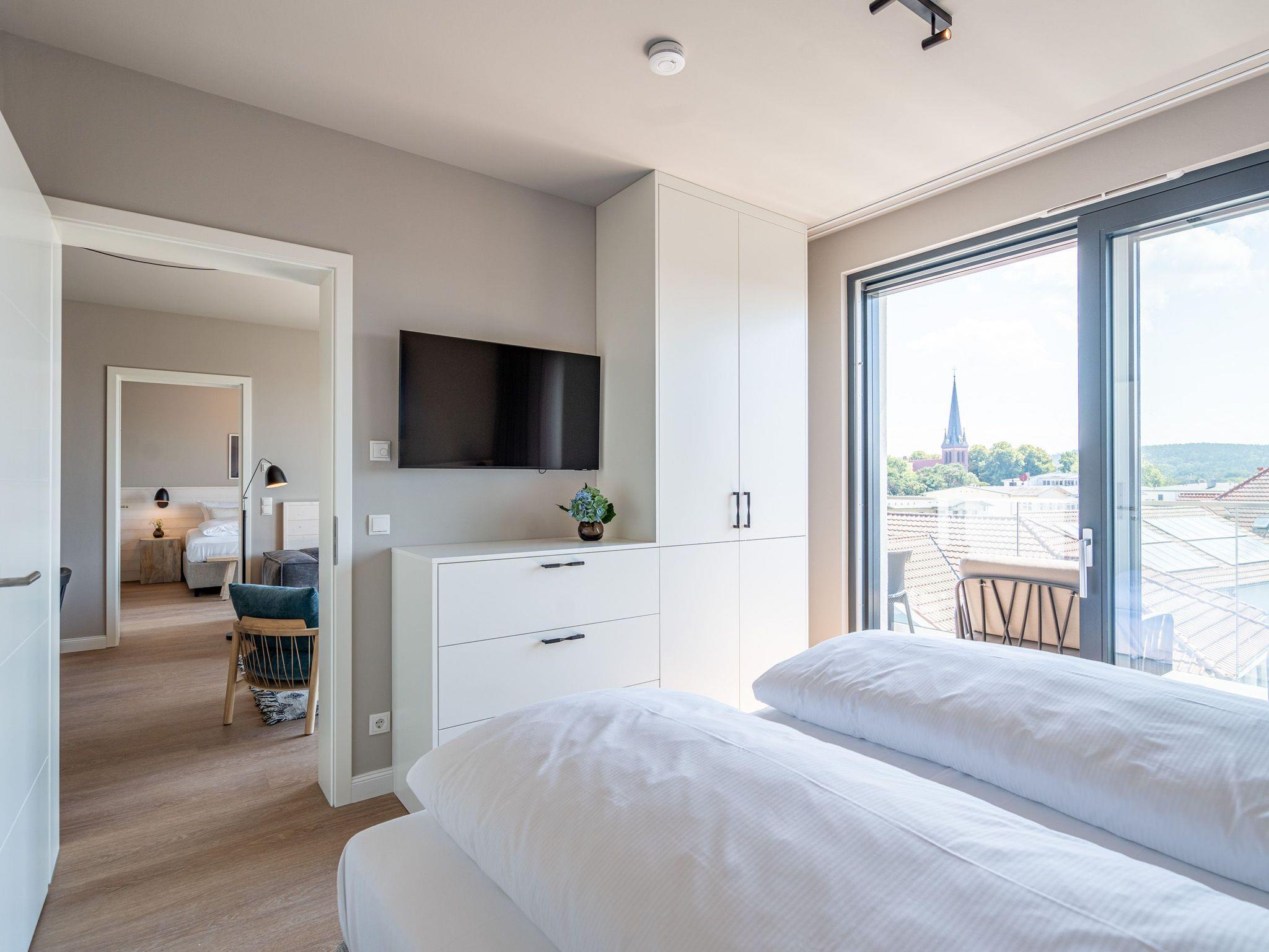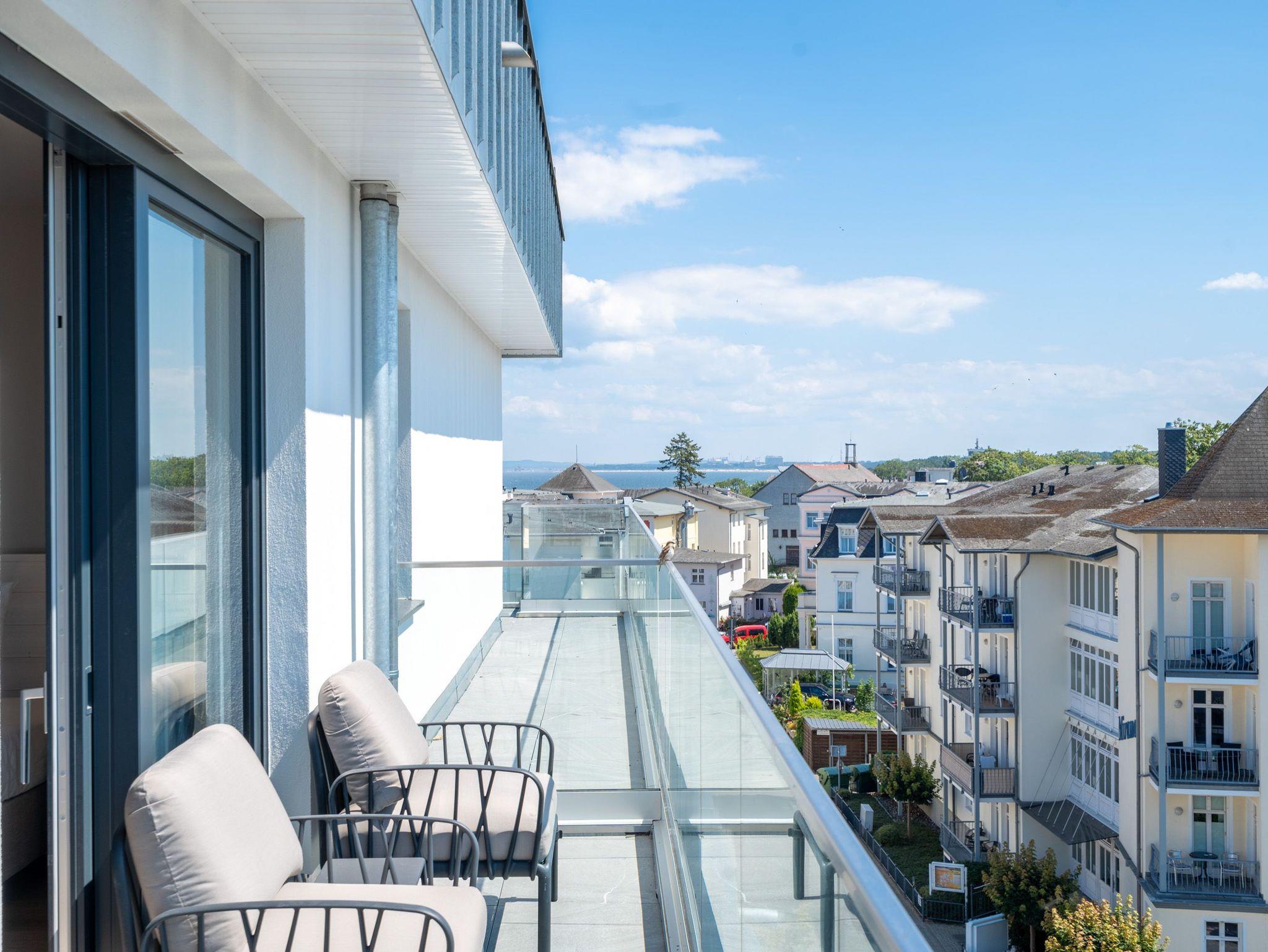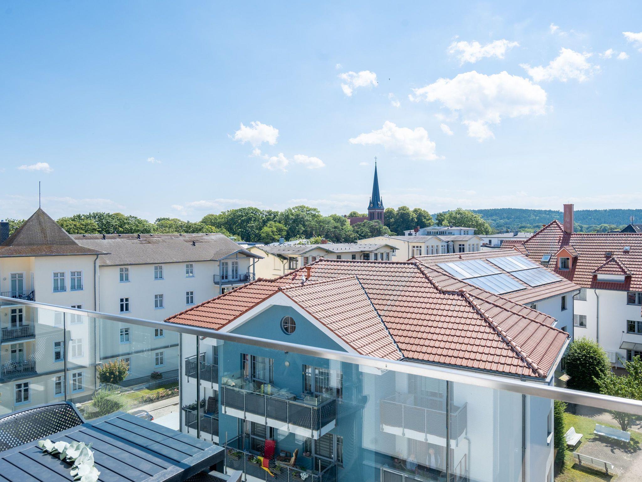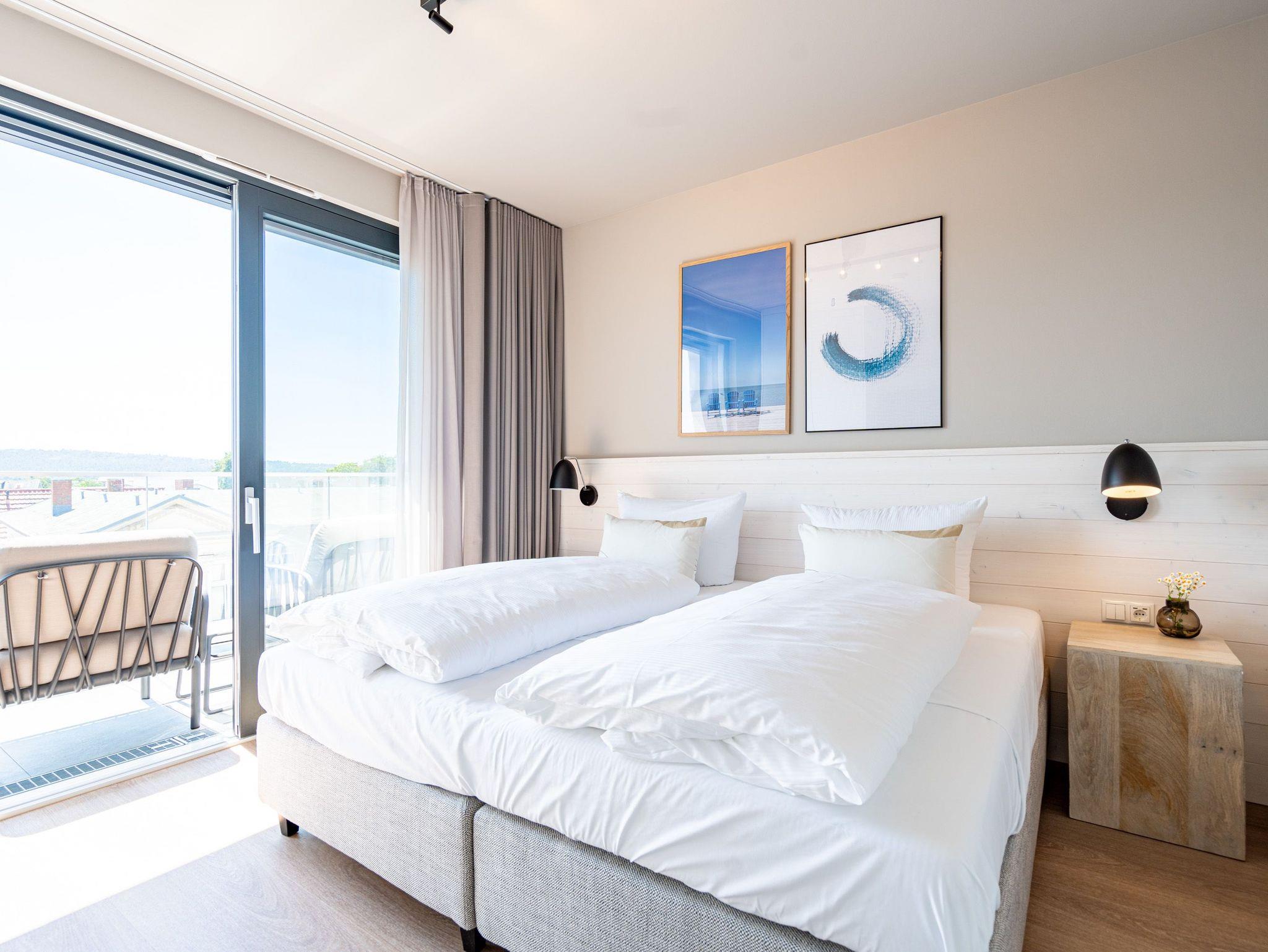 Über den Dächern des Seebades Ahlbeck lebt und urlaubt es sich im 3-Raum-Appartement B 4.5 (Haus B) in der 4. Etage der Strandterrasse ganz besonders entspannt. Bis zu 4 Personen können in den 68 Quadratmetern in unmittelbarer Nähe zur Promenade und zum Strand gemeinsam eine unvergesslich schöne Auszeit erleben. Der große Süd-Balkon mit 2 Tischen und je 2 Stühlen bietet einen wundervollen Blick über das altehrwürdige Kaiserbad mit seinen schicken Villen bis hinüber zur Ahlbecker Kirche mit ihrer Turmuhr. Ein wunderschön eingerichtetes Appartement erwartet Sie im Inneren, das mit allem ausgestattet ist, was man sich für erholsame Tage am Meer nur wünschen kann. Eine offene Küche eignet sich, Dank der hochwertigen Elektronikausstattung mit einem 4-Platten-Induktionsherd und vielem mehr, ideal zur Zubereitung ausgefeilter Mahlzeiten. Für den perfekten Morgenkaffee sorgt eine Nespresso-Kapselmaschine. Das geräumige Wohnzimmer ist eine Wohlfühlarea mit kuscheliger Cordcouch, Sessel, Elektrokamin (ohne Wärmeabgabe) und einem großen Flat-TV (50 Zoll). Ein schöner Esstisch lädt zum Dinieren und gemütlichen Zusammensitzen ein. Die Wohnung verfügt über zwei Schlafzimmer, die jeweils mit einem bequemen Boxspringdoppelbett (1,80m x 2,00m), einem geräumigen Kleiderschrank und einem Flat-TV (43 Zoll) ausgestattet sind. Beide Schlafzimmer und das Wohnzimmer haben Zugang zum Balkon. Genießen Sie hier die energieaufladenden Sonnenstunden, die Usedom zu bieten hat, und lassen Sie Ihre Tage auf dem Balkon bei einem der traumhaften Sonnenuntergänge ausklingen. Ein modernes Badezimmer mit Dusche, Waschtisch und WC sowie ein zusätzliches Gäste-WC sorgen für Komfort und ausreichend Platz für Privatsphäre. Zum Appartement gehört in der Tiefgarage ein PKW-Stellplatz. Wir wünschen Ihnen eine erholsame Zeit an der Ostsee. Genießen Sie die unvergesslich schönen Momente in dieser heimeligen und exklusiven Ferienwohnung direkt am Meer.