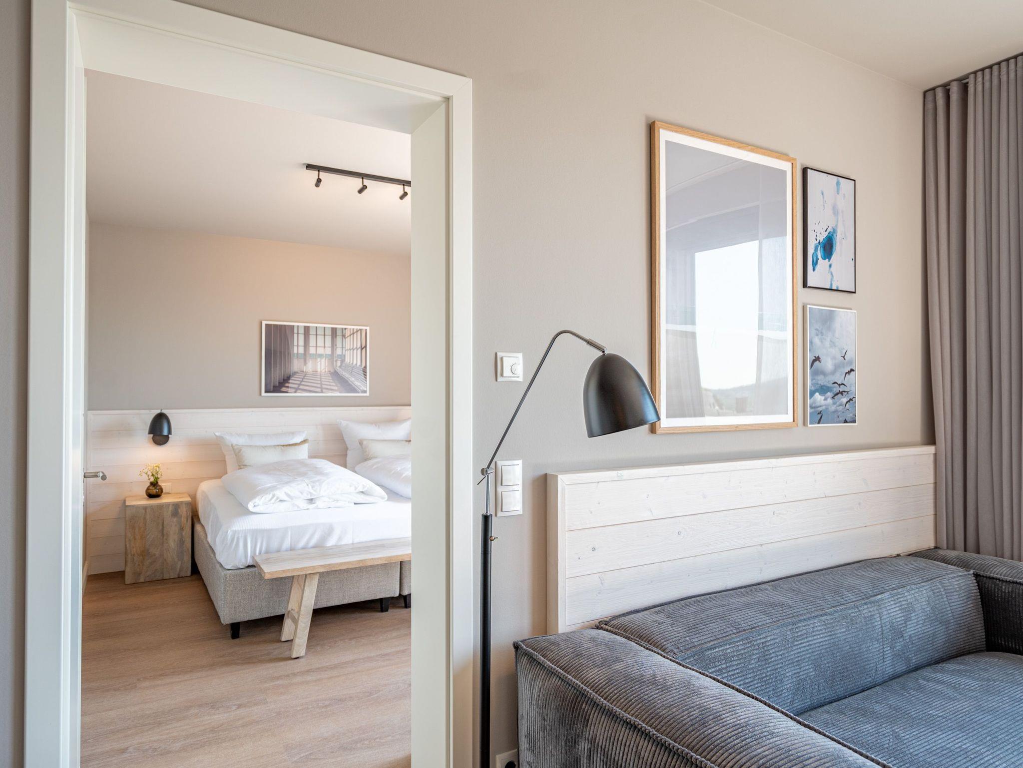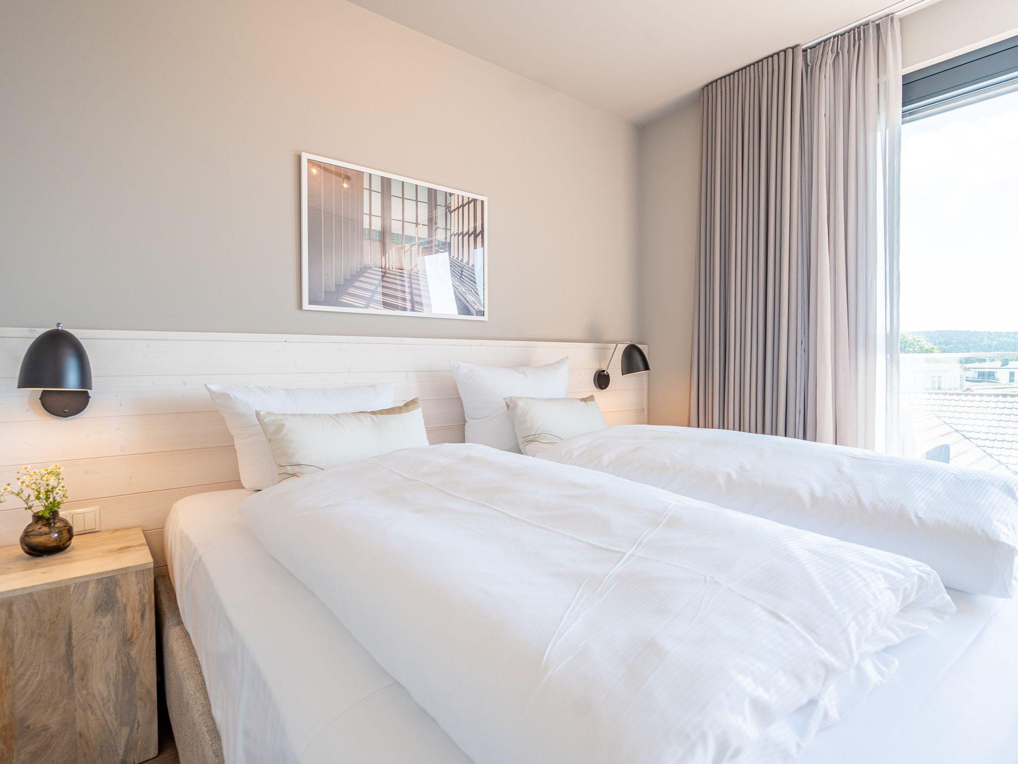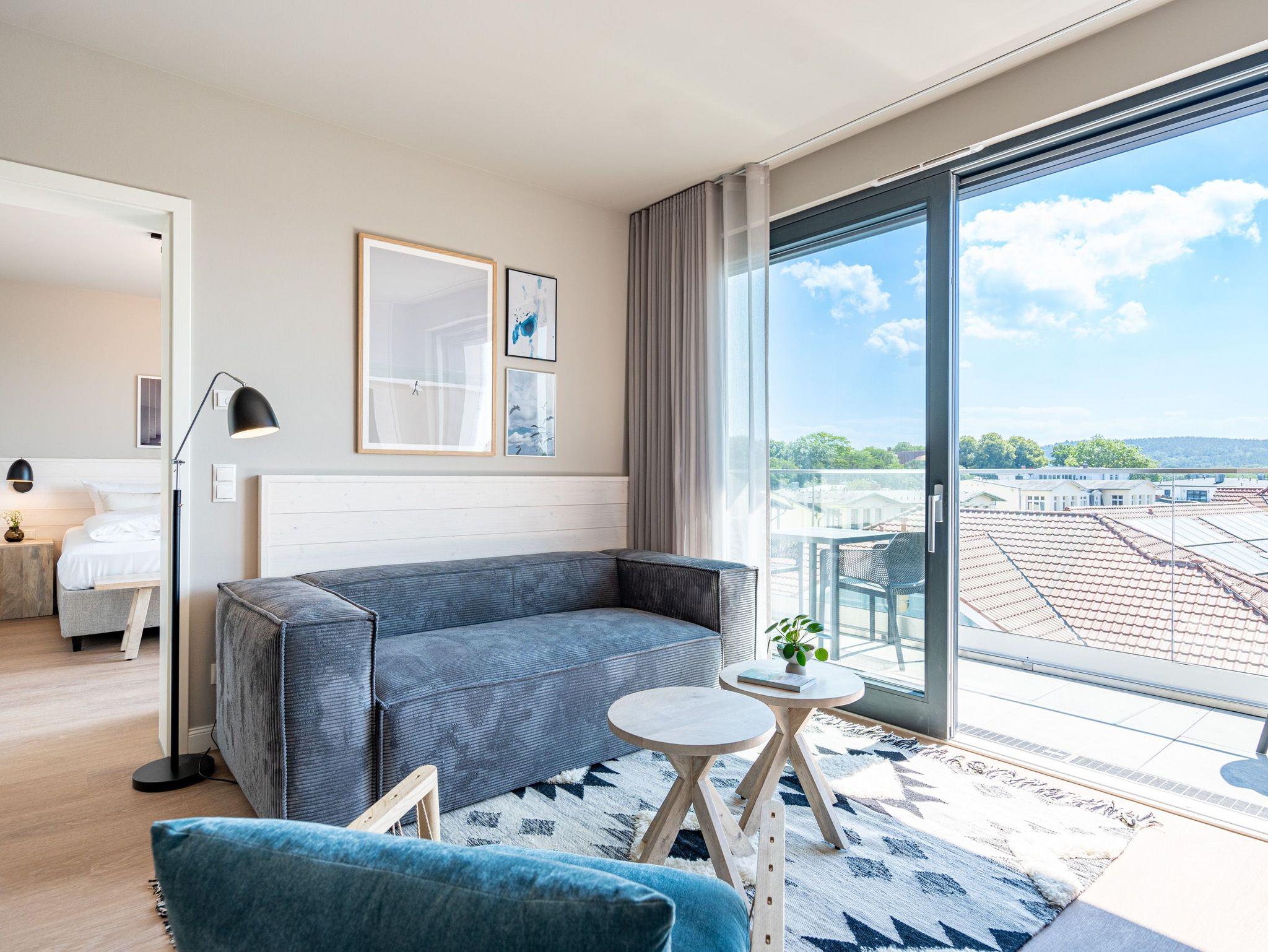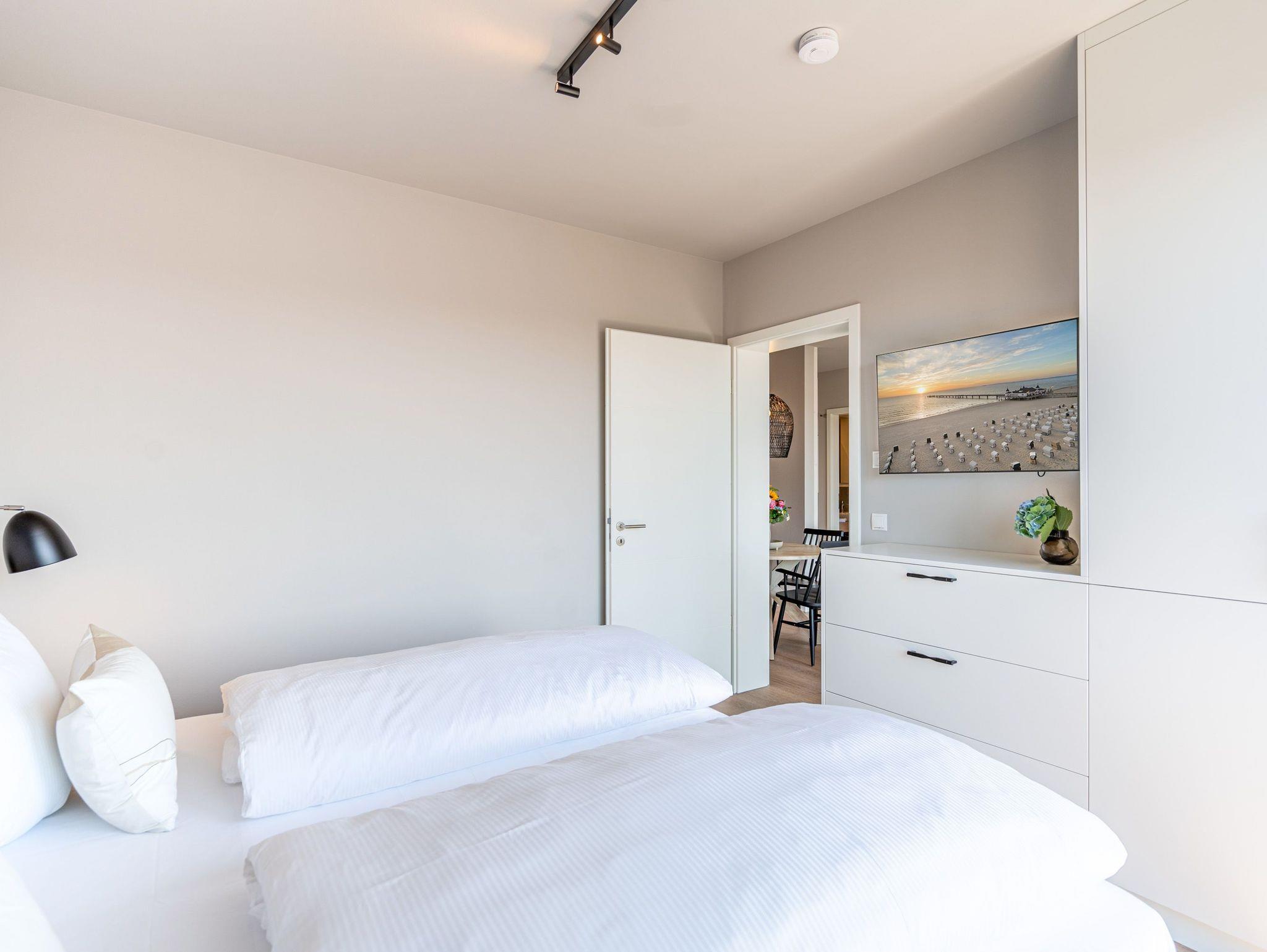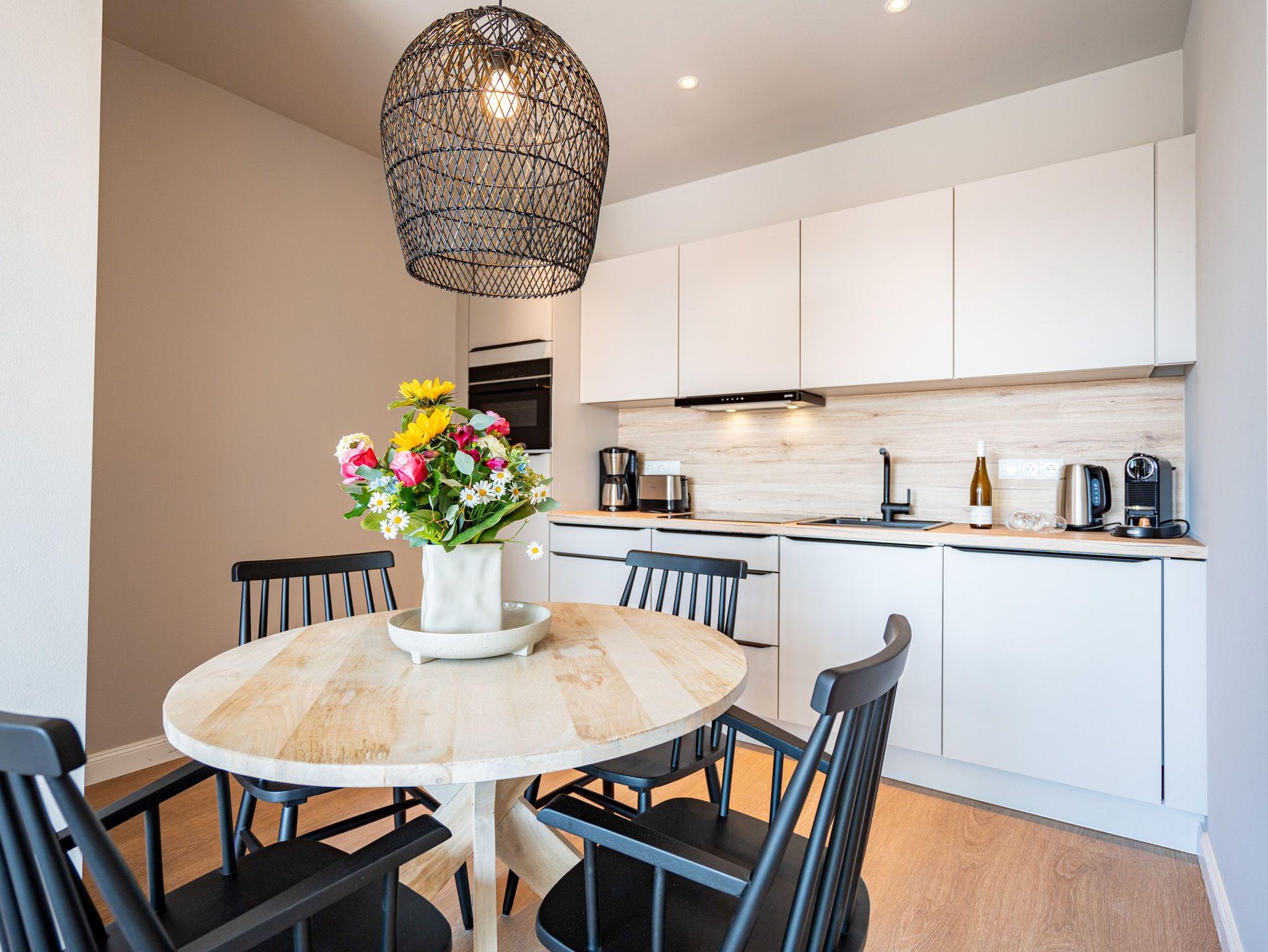 Über den Dächern des Seebades Ahlbeck lebt und urlaubt es sich im 3-Raum-Appartement B 4.5 (Haus B) in der 4. Etage der Strandterrasse ganz besonders entspannt. Bis zu 4 Personen können in den 68 Quadratmetern in unmittelbarer Nähe zur Promenade und zum Strand gemeinsam eine unvergesslich schöne Auszeit erleben. Der große Süd-Balkon mit 2 Tischen und je 2 Stühlen bietet einen wundervollen Blick über das altehrwürdige Kaiserbad mit seinen schicken Villen bis hinüber zur Ahlbecker Kirche mit ihrer Turmuhr. Ein wunderschön eingerichtetes Appartement erwartet Sie im Inneren, das mit allem ausgestattet ist, was man sich für erholsame Tage am Meer nur wünschen kann. Eine offene Küche eignet sich, Dank der hochwertigen Elektronikausstattung mit einem 4-Platten-Induktionsherd und vielem mehr, ideal zur Zubereitung ausgefeilter Mahlzeiten. Für den perfekten Morgenkaffee sorgt eine Nespresso-Kapselmaschine. Das geräumige Wohnzimmer ist eine Wohlfühlarea mit kuscheliger Cordcouch, Sessel, Elektrokamin (ohne Wärmeabgabe) und einem großen Flat-TV (50 Zoll). Ein schöner Esstisch lädt zum Dinieren und gemütlichen Zusammensitzen ein. Die Wohnung verfügt über zwei Schlafzimmer, die jeweils mit einem bequemen Boxspringdoppelbett (1,80m x 2,00m), einem geräumigen Kleiderschrank und einem Flat-TV (43 Zoll) ausgestattet sind. Beide Schlafzimmer und das Wohnzimmer haben Zugang zum Balkon. Genießen Sie hier die energieaufladenden Sonnenstunden, die Usedom zu bieten hat, und lassen Sie Ihre Tage auf dem Balkon bei einem der traumhaften Sonnenuntergänge ausklingen. Ein modernes Badezimmer mit Dusche, Waschtisch und WC sowie ein zusätzliches Gäste-WC sorgen für Komfort und ausreichend Platz für Privatsphäre. Zum Appartement gehört in der Tiefgarage ein PKW-Stellplatz. Wir wünschen Ihnen eine erholsame Zeit an der Ostsee. Genießen Sie die unvergesslich schönen Momente in dieser heimeligen und exklusiven Ferienwohnung direkt am Meer.