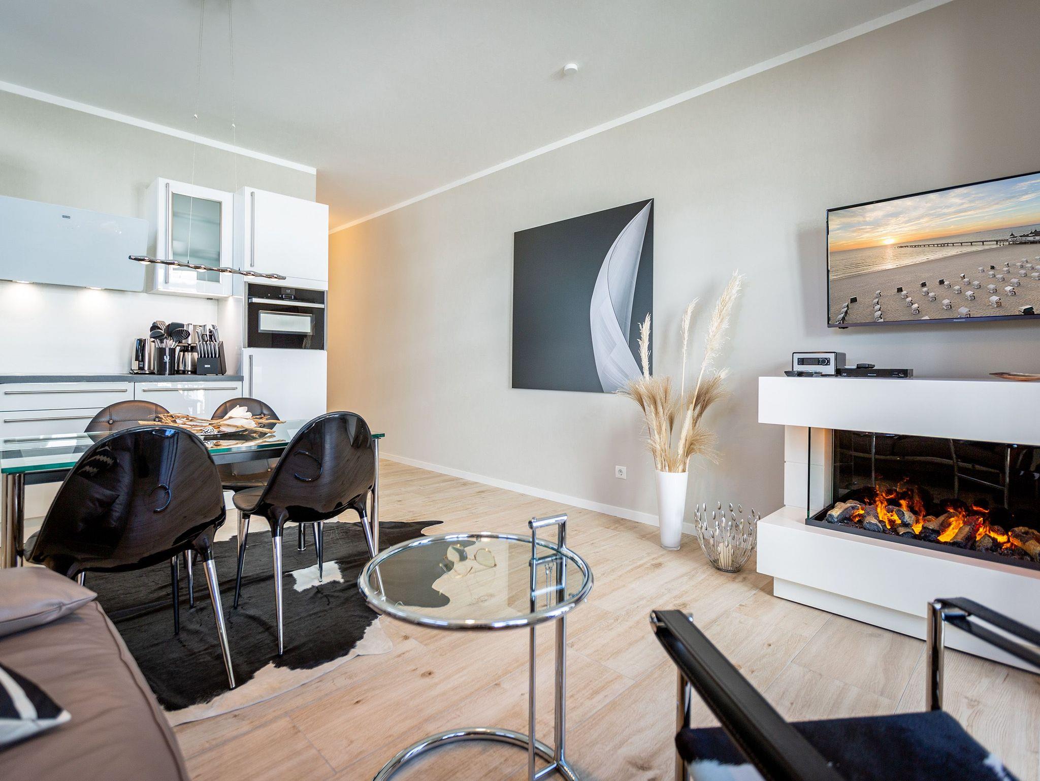 Mitten im Herzen von Ahlbeck sorgt dieses stylische Appartement für zwei Personen und ein Kleinkind (im Kinderreisebett) für viel Erholung und Entspannung. Das 46 Quadratmeter große Urlaubsparadies befindet sich im Erdgeschoss des Quartiers Frohsinn, hat eine kuschelig urige Terrasse und zwei Zimmer. Bringen Sie ihren geliebten Vierbeiner hier ruhig mit. Er oder sie ist herzlich willkommen. Das Innere des Appartements besticht mit schlichter Eleganz und ausgesuchten Design-Möbeln. Die Cassina-Reihe von Le Corbusier ist hier durchgehend vertreten. Selbst der berühmte LC1 mit Kuhfell fehlt nicht. Aber ganz gleich, ob Sofa oder bequemer Essplatz, Couchtisch oder die Kunst an der Wand ? das Appartement wurde mit viel Geschmack eingerichtet. Leder in Kombination mit Glas und Chrome verleihen Ihrem Wohlfühlreich ein besonderes Flair. Das Wohnzimmer verfügt zudem über einen Elektrokamin mit Fernbedienung und einen großen Flat-TV (50 Zoll) mit Blue-Ray-Player. Eine offene Küchenzeile ist mit allem Notwendigen ausgestattet. Die Küche enthält qualitativ hochwertige Geräte wie einen Induktionsherd, eine Mikrowelle, einen Geschirrspüler, eine Senseo Kaffeemaschine, gutes Kochgeschirr sowie ein edles Service. Das Wohnzimmer hat Zugang zur Terrasse (6 Quadratmeter), einer kleinen Rückzugsecke unter freiem Himmel mit Gartenmöbeln und Strandkorb. Das Schlafzimmer wartet mit einem komfortablen Boxspringdoppelbett (1,80 m x 2,00 m) auf. Der große Einbauschrank ist geräumig und bietet viel Ablagefläche. Das Bad ist mit Dusche und WC versehen. Das WLAN für Musik- und Internetgenuss ist kostenfrei. Handtücher und Bettwäsche sind inklusive und bereits vor Ort, wenn Sie anreisen. Im Keller befindet sich ein separater Fahrradraum. Ein Außenstellplatz gehört zur Ferienwohnung dazu.