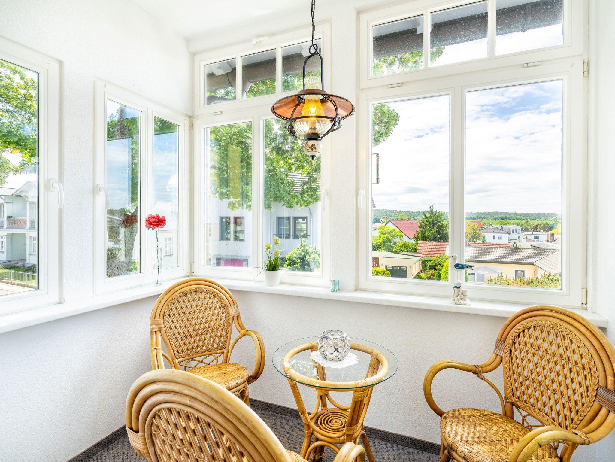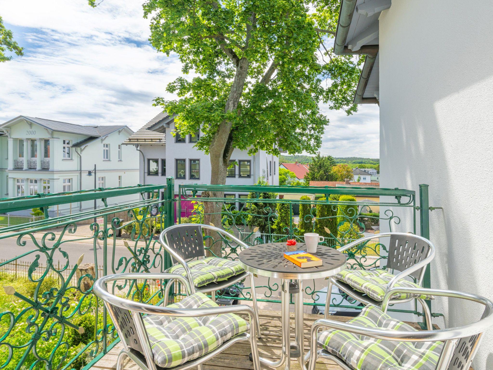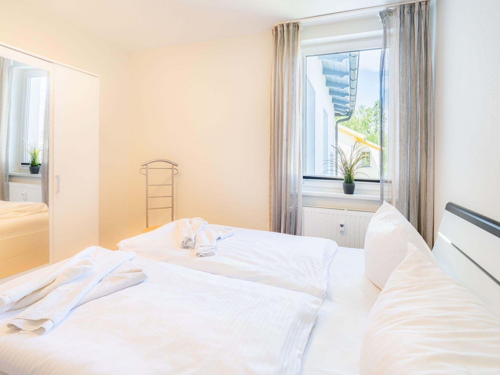 Das 60 qm große Appartement in ersten Obergeschoss verfügt über ein Wohnzimmer mit moderner Couchecke (Schlafsofa) und einen kleinen Sitzbereich. Die separate Küche ist mit Backofen, Ceranherd, Kühlschrank und vielen weiteren Küchenutensilien sowie einem kleinen Essplatz ausgestattet. Eine gemütliche Veranda mit Essplatz schließt sich an. Vom Wohnzimmer haben Sie Zugang zum kleinen Balkon (Südseite). Das Schlafzimmer ist mit Doppelbett ausgestattet, Bad mit Dusche und WC.