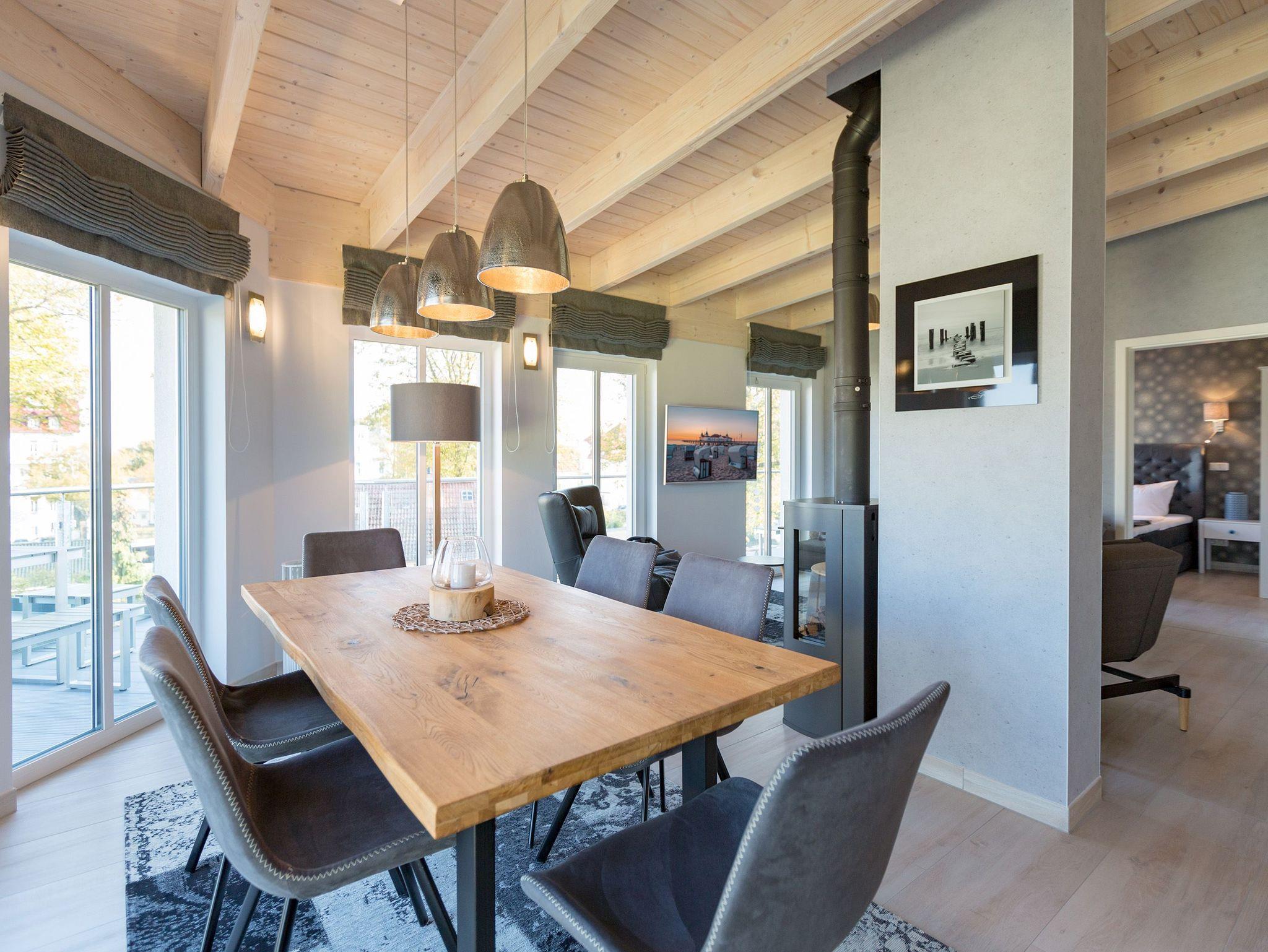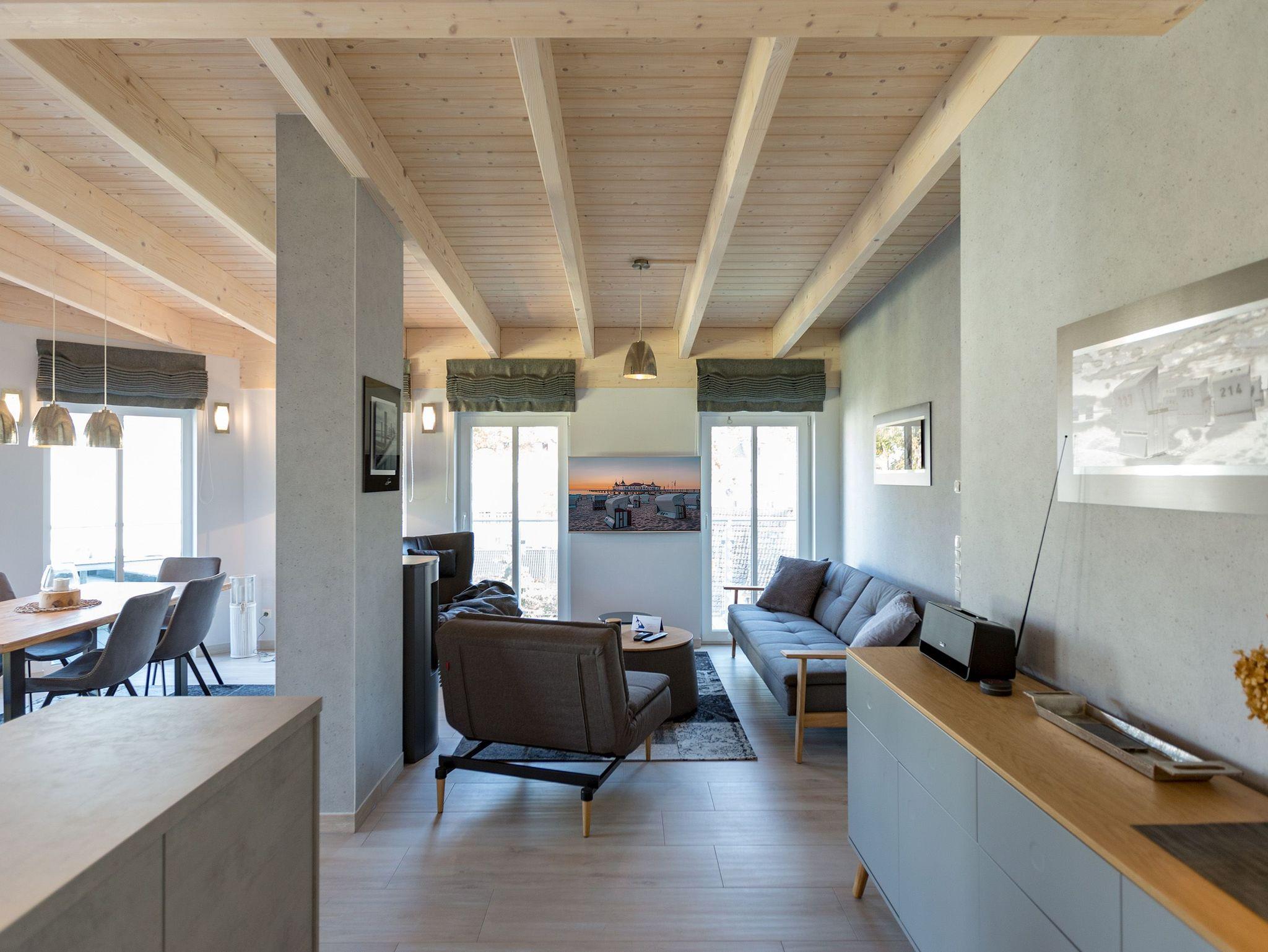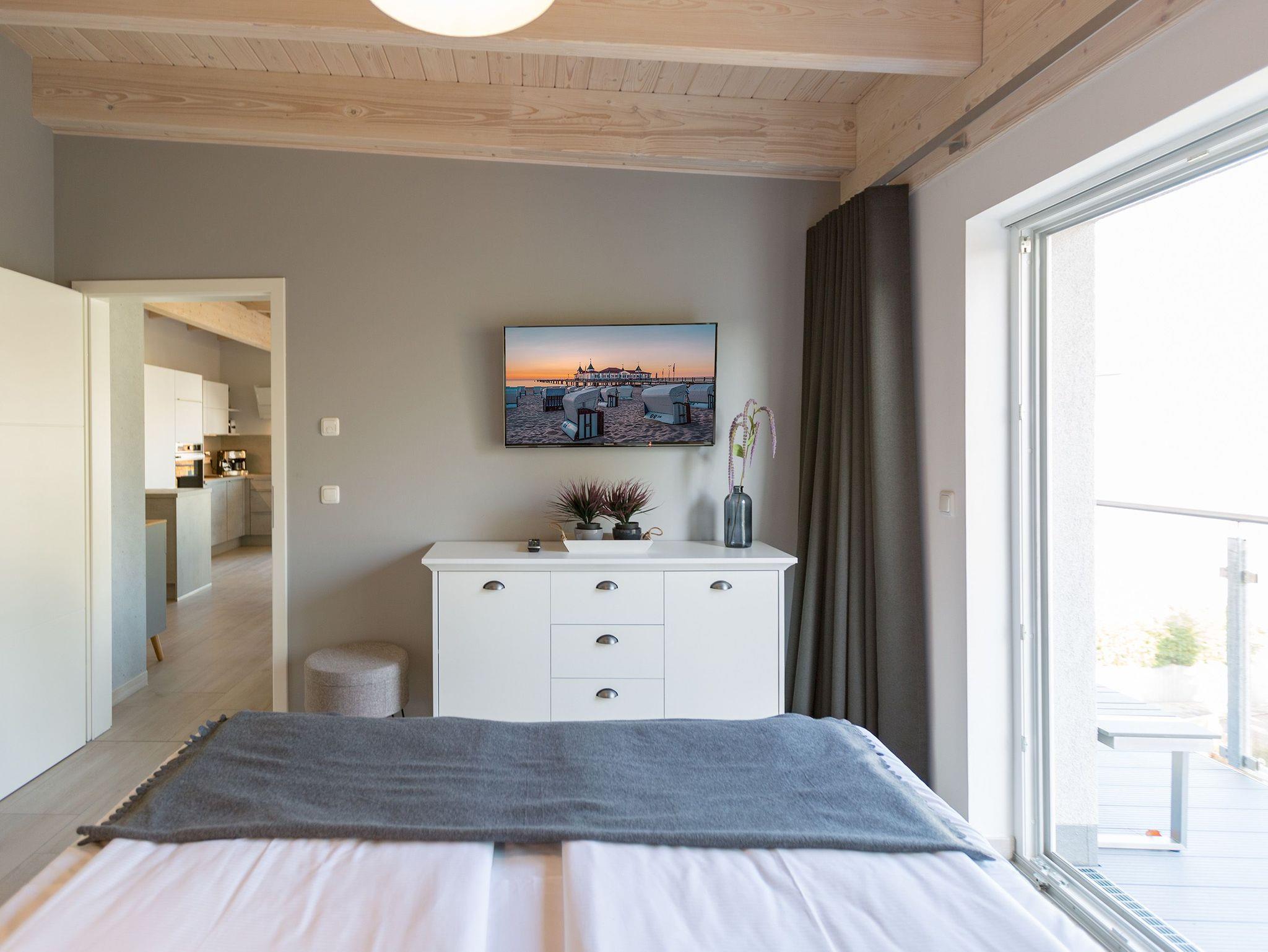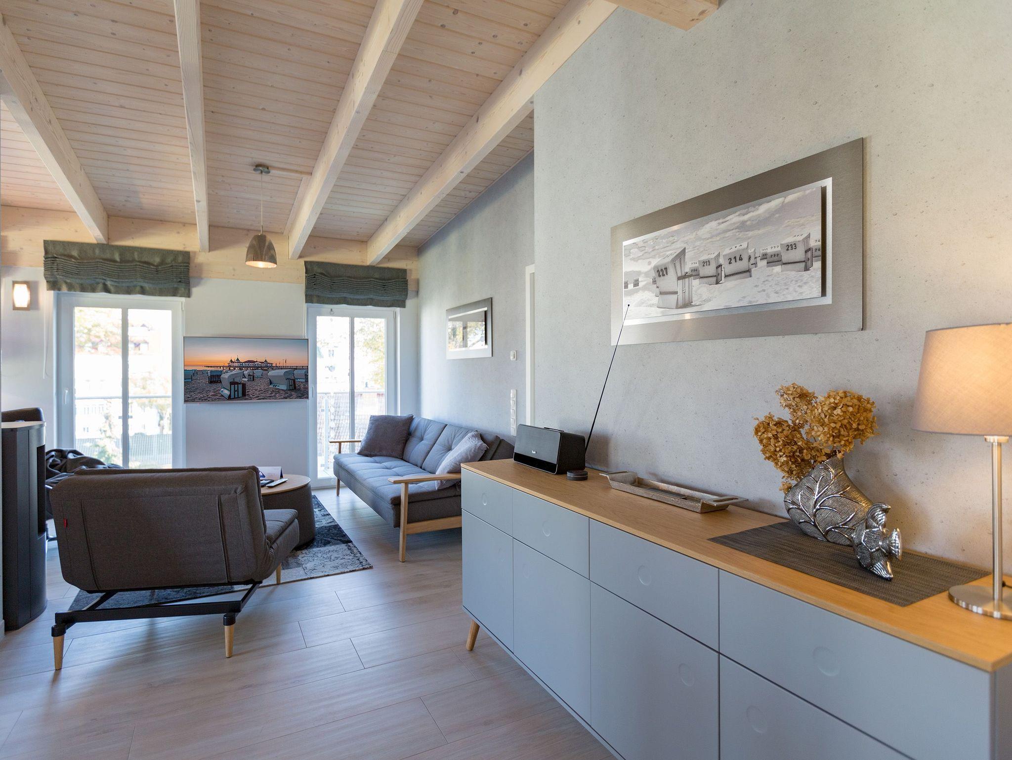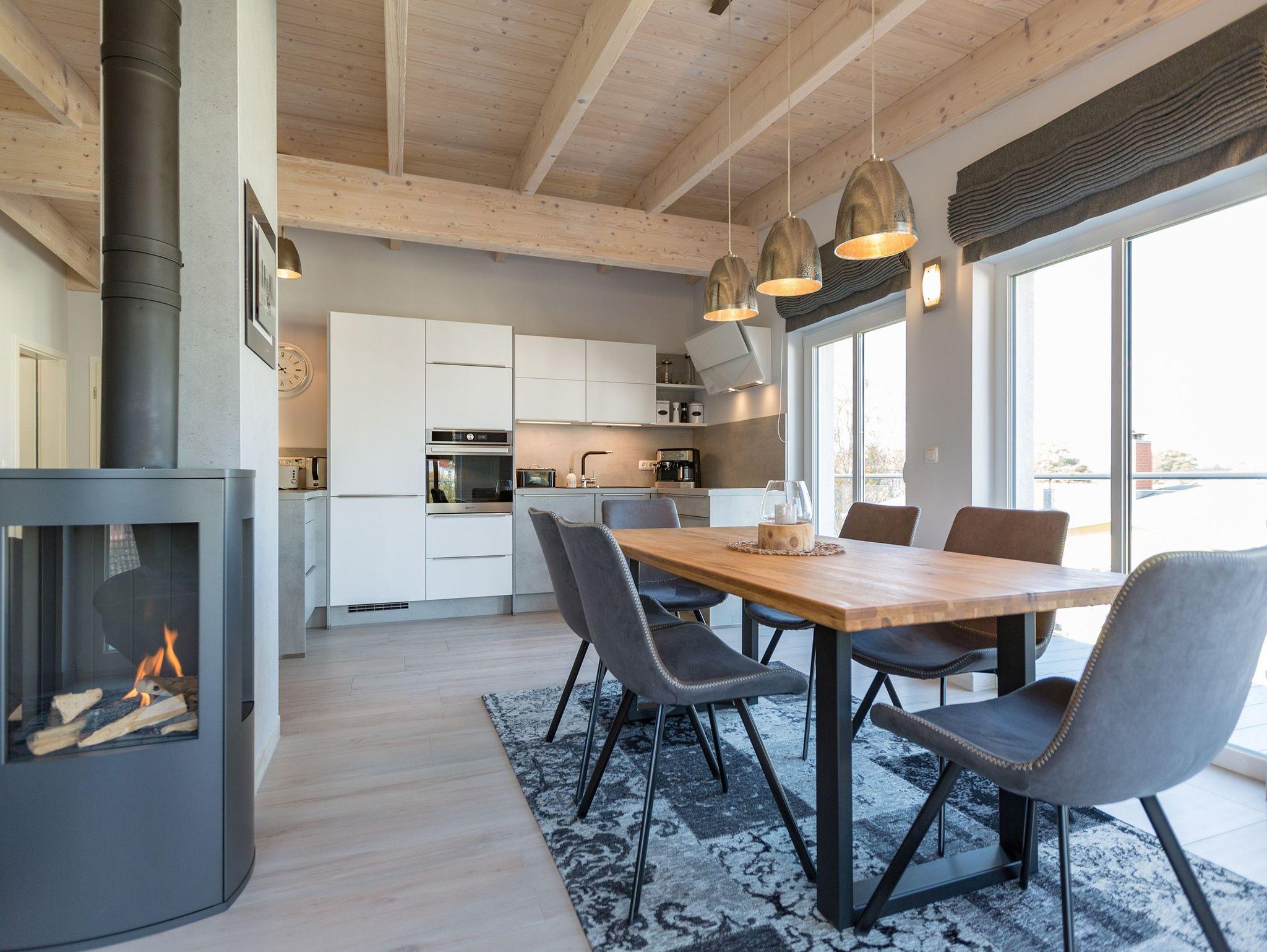 Der Fahrstuhl bringt Sie direkt unters Dach der Düne 8. Ein wunderschönes und großzügiges Penthouse wartet hier auf Sie. Auf 71 Quadratmetern können es sich bis zu vier Personen und ein Kleinkind bis drei Jahre (im Kinderreisebett) richtig gut gehen lassen, gemeinsam entspannen und eine unvergesslich schöne Zeit verbringen. Die Einrichtung der drei Zimmerwohnung besticht durch ihre schlichte und moderne Eleganz. Nordisches Design und urige Accessoires vermitteln Heimeligkeit, die jegliche Stressgedanken vergessen lässt. Die offene und helle Holzbalkendecke ist etwas ganz besonderes. Das große Wohnzimmer hat bodentiefe Fenster, die viel Licht ins Innere lassen. Ein massiver Gas-Kamin sorgt für kuschelige Behaglichkeit und Wärme. Auf der gemütlichen Sofa-Sitzgruppe oder im bequemen Ledersessel haben sie beste Plätze für das Flat-TV-Heimkino. Treten Sie hinaus auf den Balkon und genießen Sie den weiten Ostseeblick, der sich Ihnen in den Blick legt. In diesem Urlaubsdomizil entspannen Sie mit allen Sinnen. Auch der Geschmackssinn darf natürlich nicht zu kurz kommen. In der voll ausgestatteten Küche finden Sie alles, was das Kochherz begehrt. Hochwertige Markengeräte, erlesenes Geschirr ? da wird das Kochen im Urlaub zu einem kleinen Event. Essen können Sie am wunderschönen, großen Holztisch auf komfortablen Lederstühlen. Beide Schlafzimmer versprechen erholsame und entspannende Nächte. In den großen Boxspringdoppelbetten wird das Schlafen zum Vergnügen. Beide Schlafzimmer haben Zugang zu einem Balkon und jeweils einen Flat-TV. Auch Ablagemöglichkeiten gibt es in den Zimmern reichlich. Das Appartement verfügt über zwei Bäder mit geräumigen Regenduschen, Waschtisch und WC. Im Masterbad wartet zudem eine kleine Wellness-Oase darauf, Ihnen noch mehr Entspannung zu verschaffen. Eine Finnische Sauna ist der ideale Ort, sich an ungemütlichen Tagen die Zeit zu verschönern. Die Handtücher liegen bereit und auch die Betten sind bei der Anreise bereits bezogen. Das WLAN ist kostenfrei und im Keller gibt es einen abschließbaren Fahrradraum. Außerdem ist für Ihr Auto ein Stellplatz reserviert.